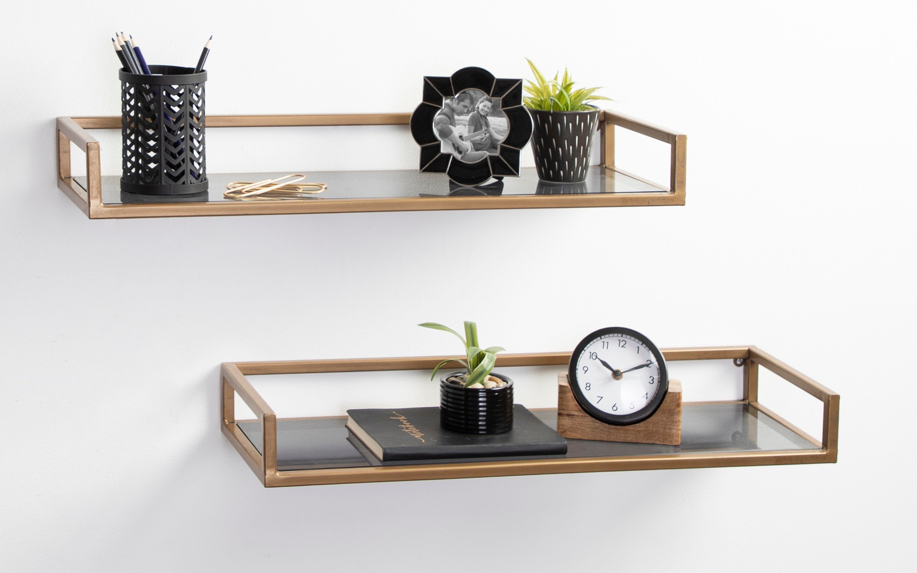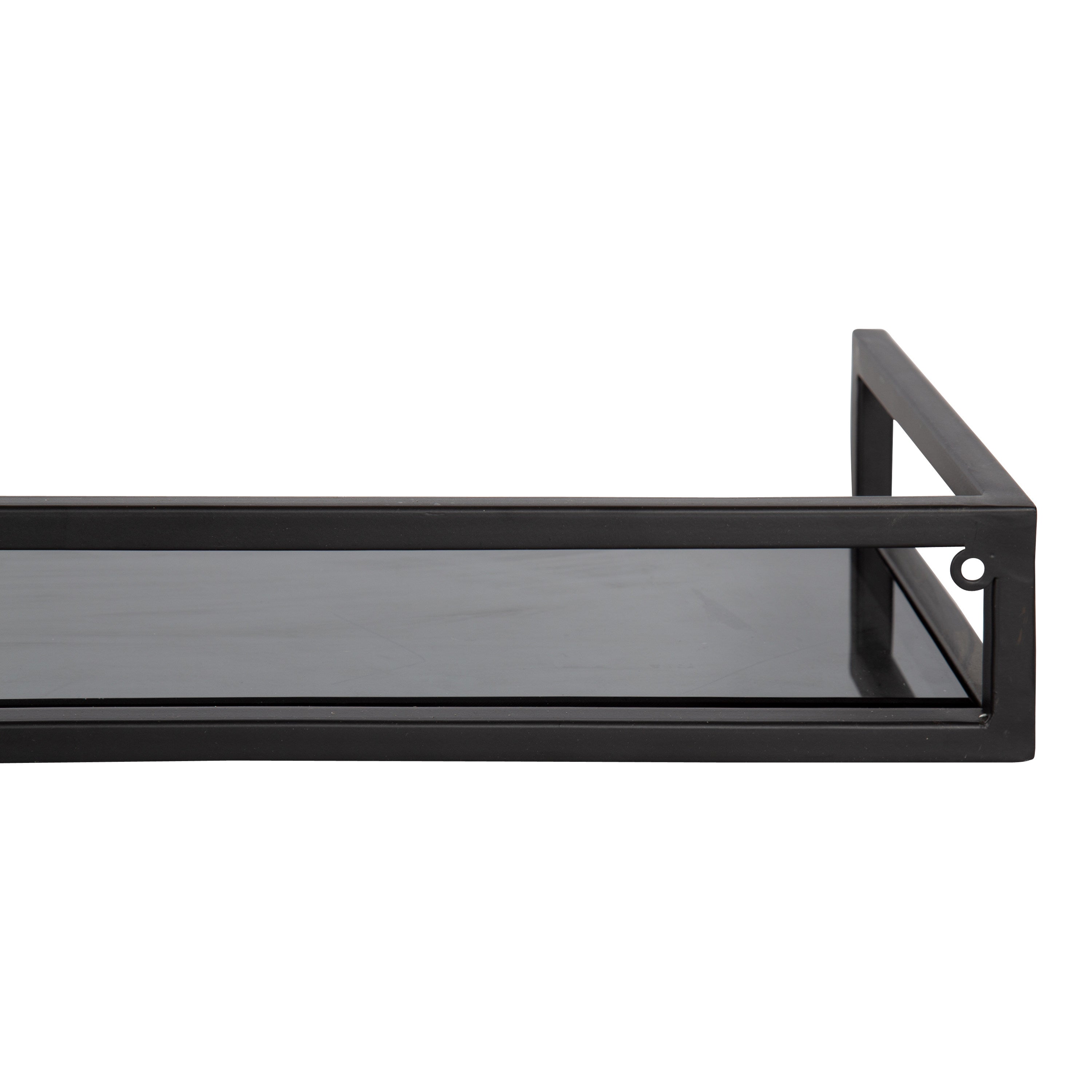 Design your beautiful, modern home with space-saving storage that also functions as a decorative accent with the Blex shelf. This contemporary-styled shelf allows you to store and display your small keepsakes and household necessities safely in its wide profile. The inset glass gives it its intriguing, unique look, while the sleek finish on the metal frame allows this shelf to blend into any modern decor aesthetic.