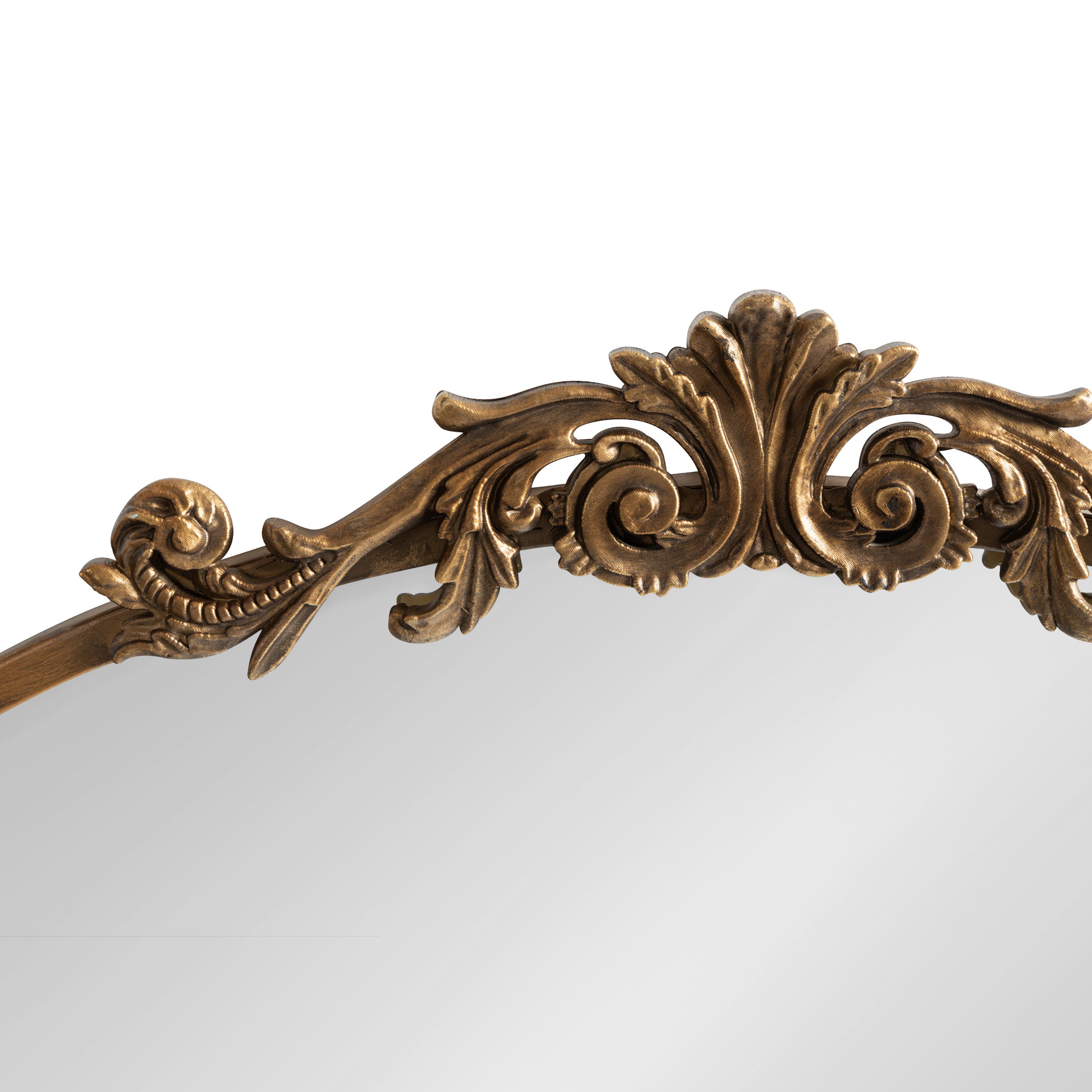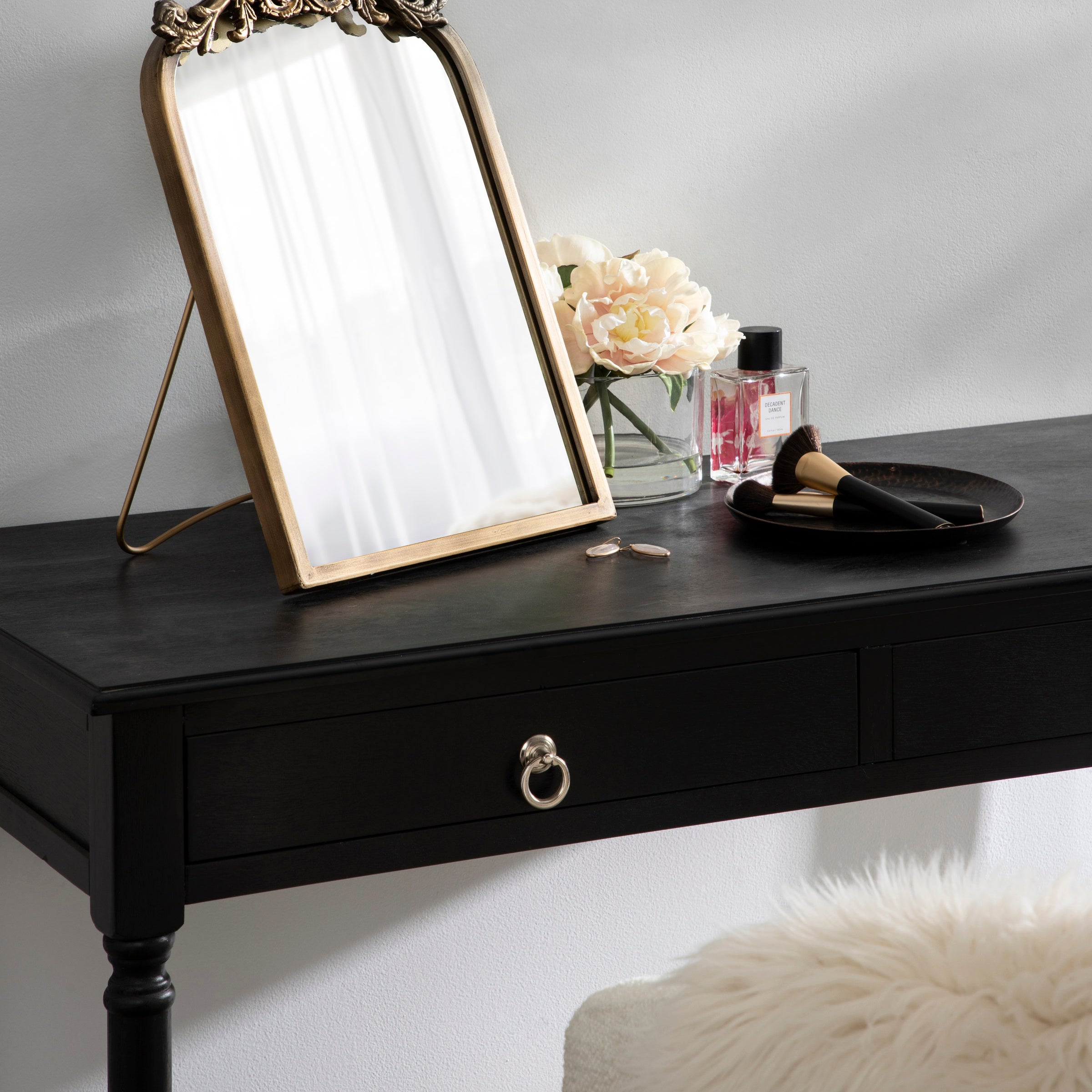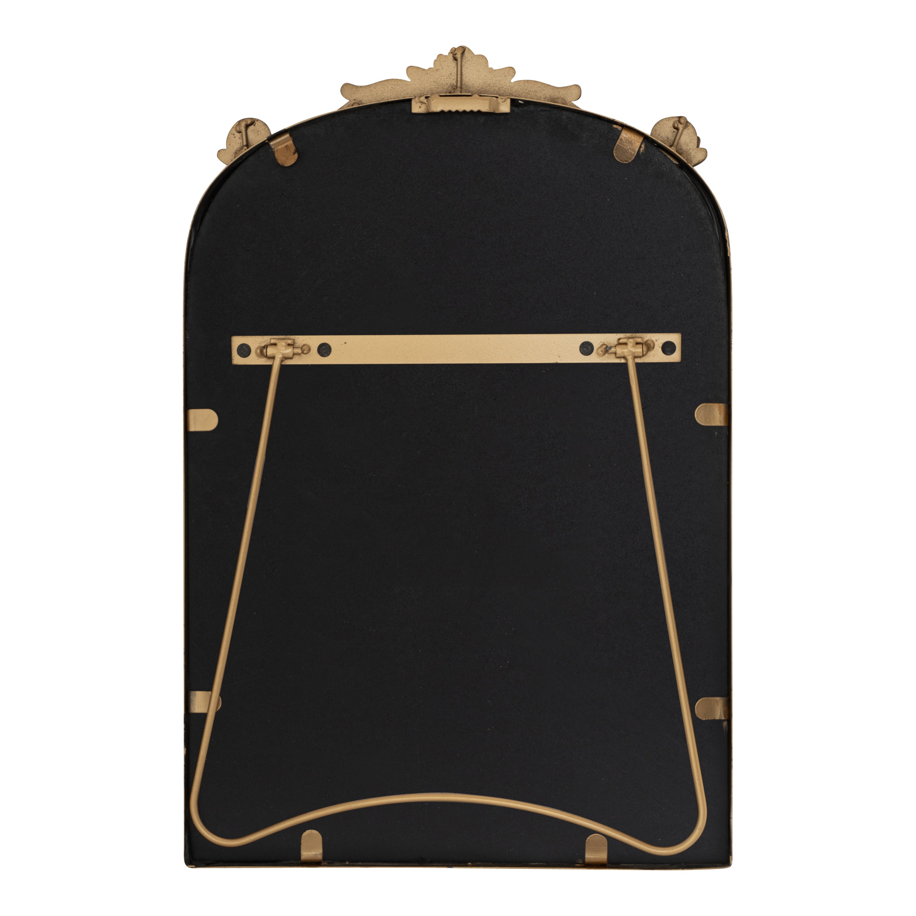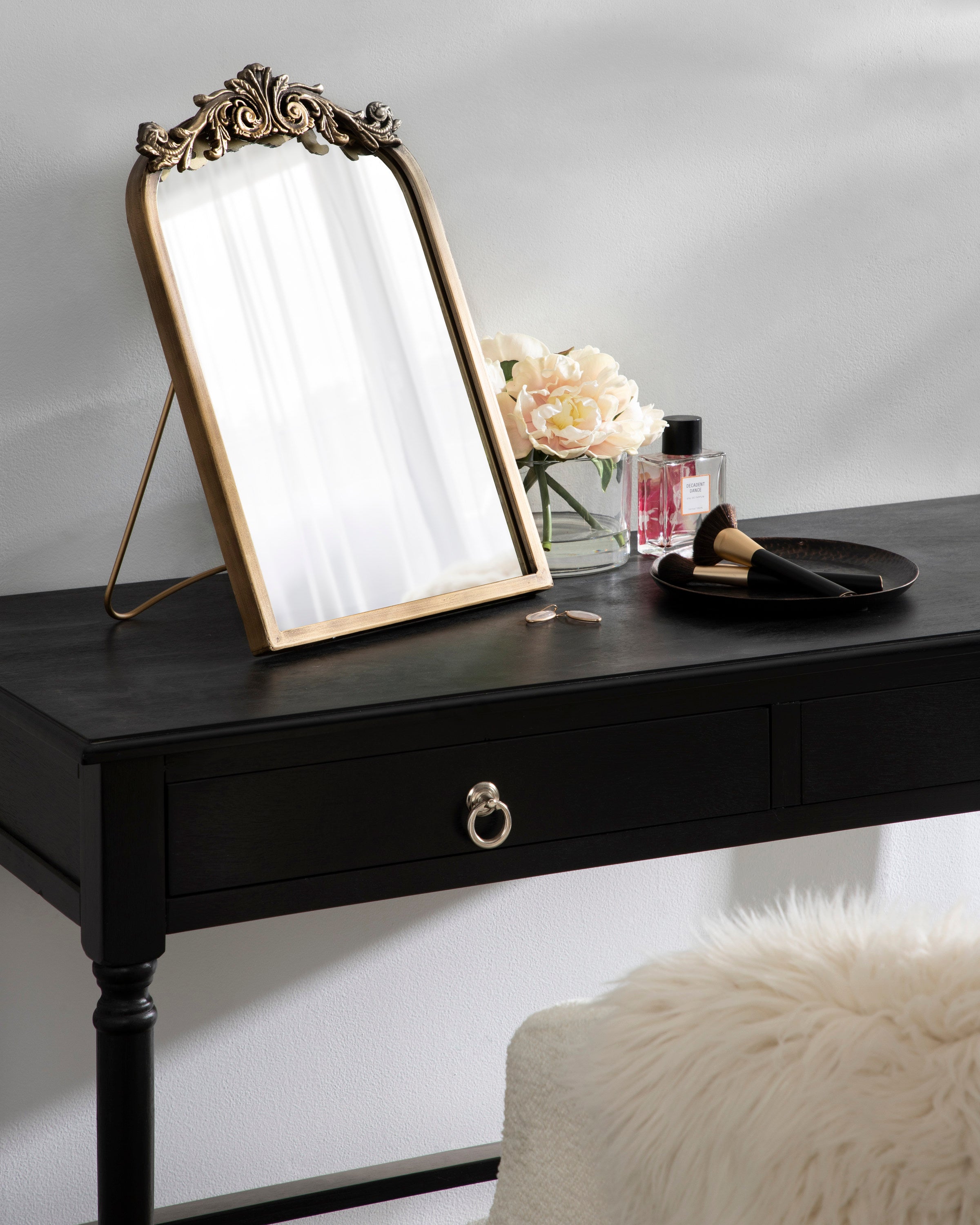 Give your console, vanity, or side table a dazzling centerpiece inspired by traditional aesthetics with the Arendahl tabletop mirror. Inspired by Baroque design, the Arendahl mirror features an ornate garland crown that flows into a resilient and dazzling iron frame. Bring your gorgeous and glamorous aesthetic to life with its eye-catching antique finish, bringing an element of sophistication to your table. Due to its hand-finished craftsmanship, each piece may vary in appearance. It's fantastic as a conversation piece in any living room, dining room, entryway, or bedroom.