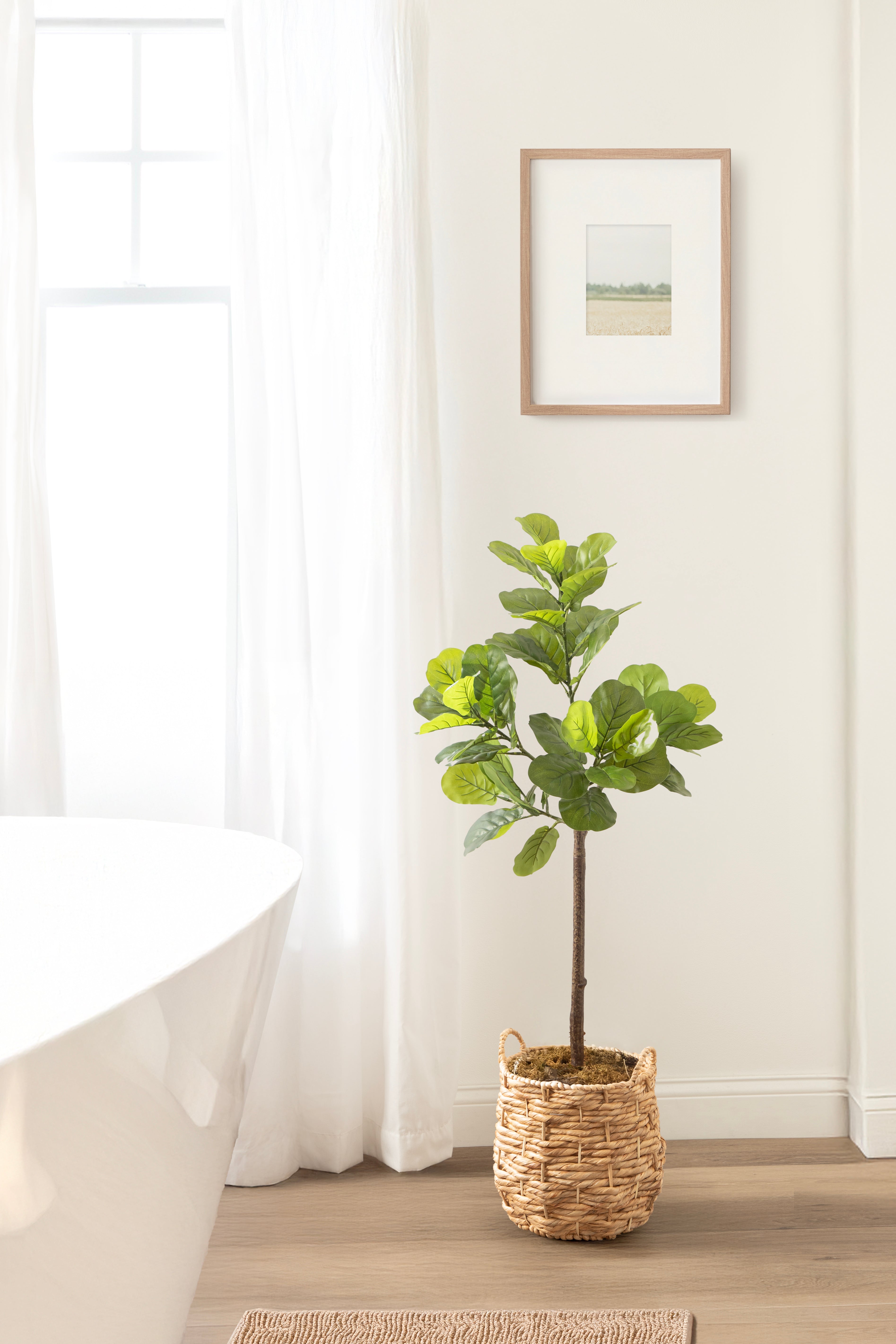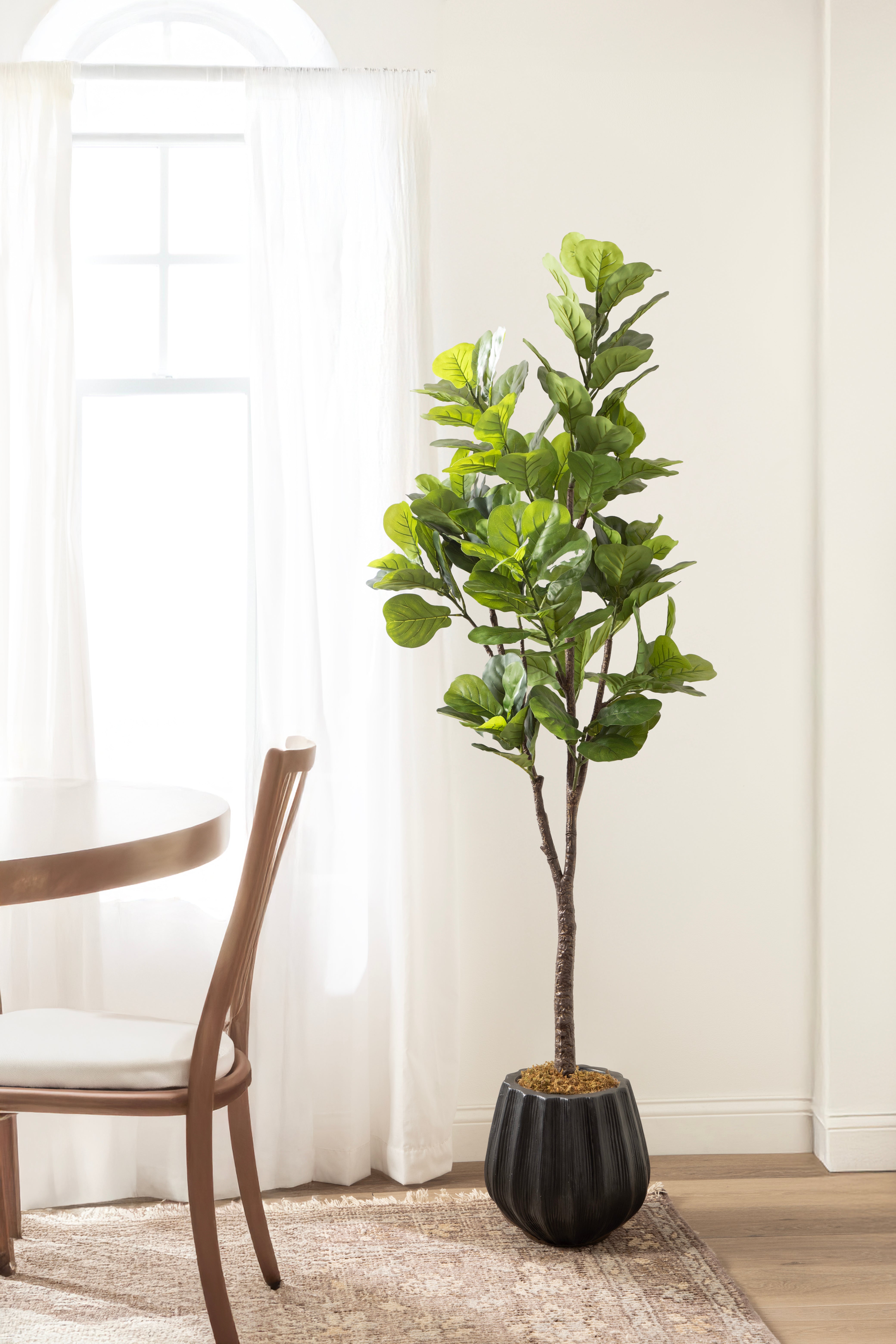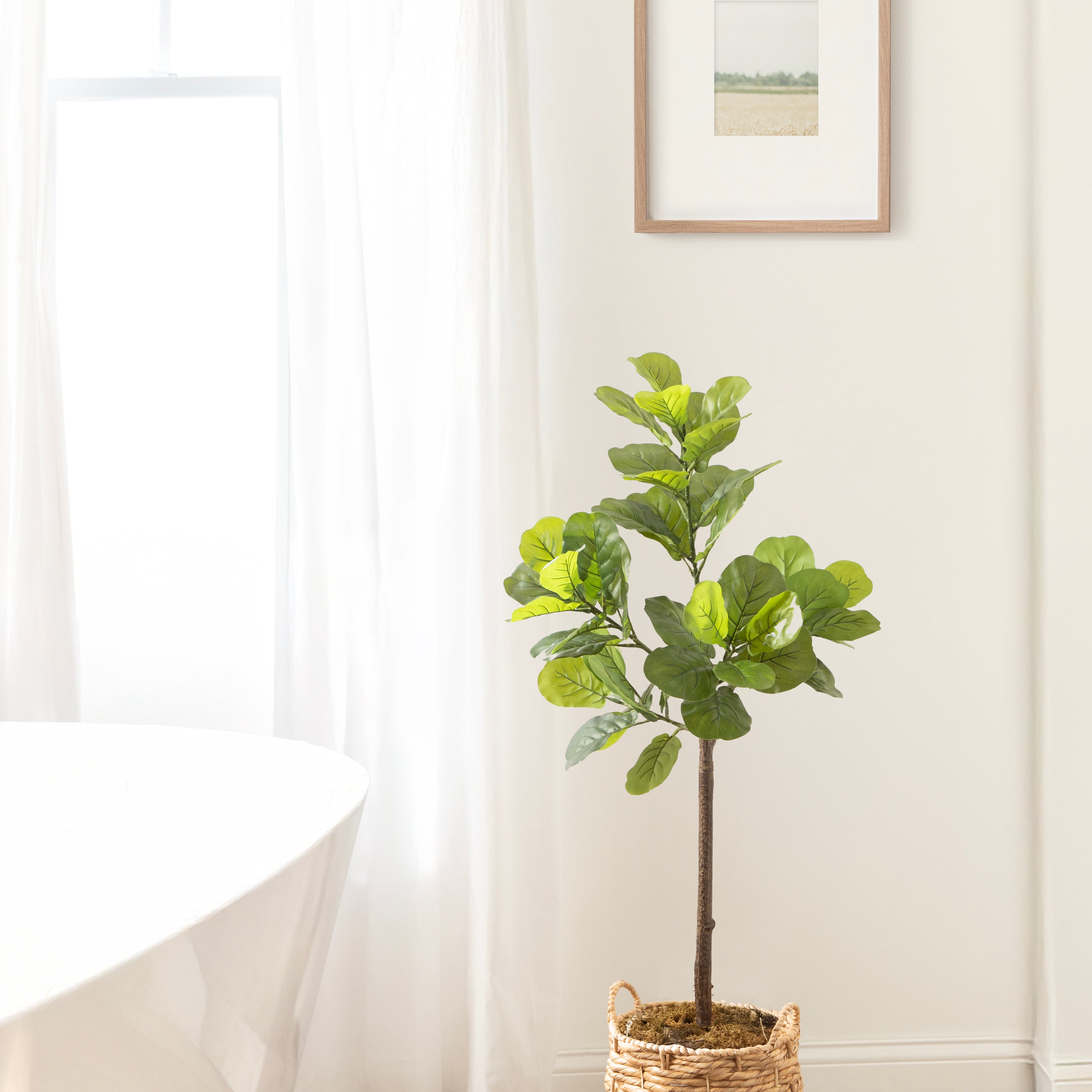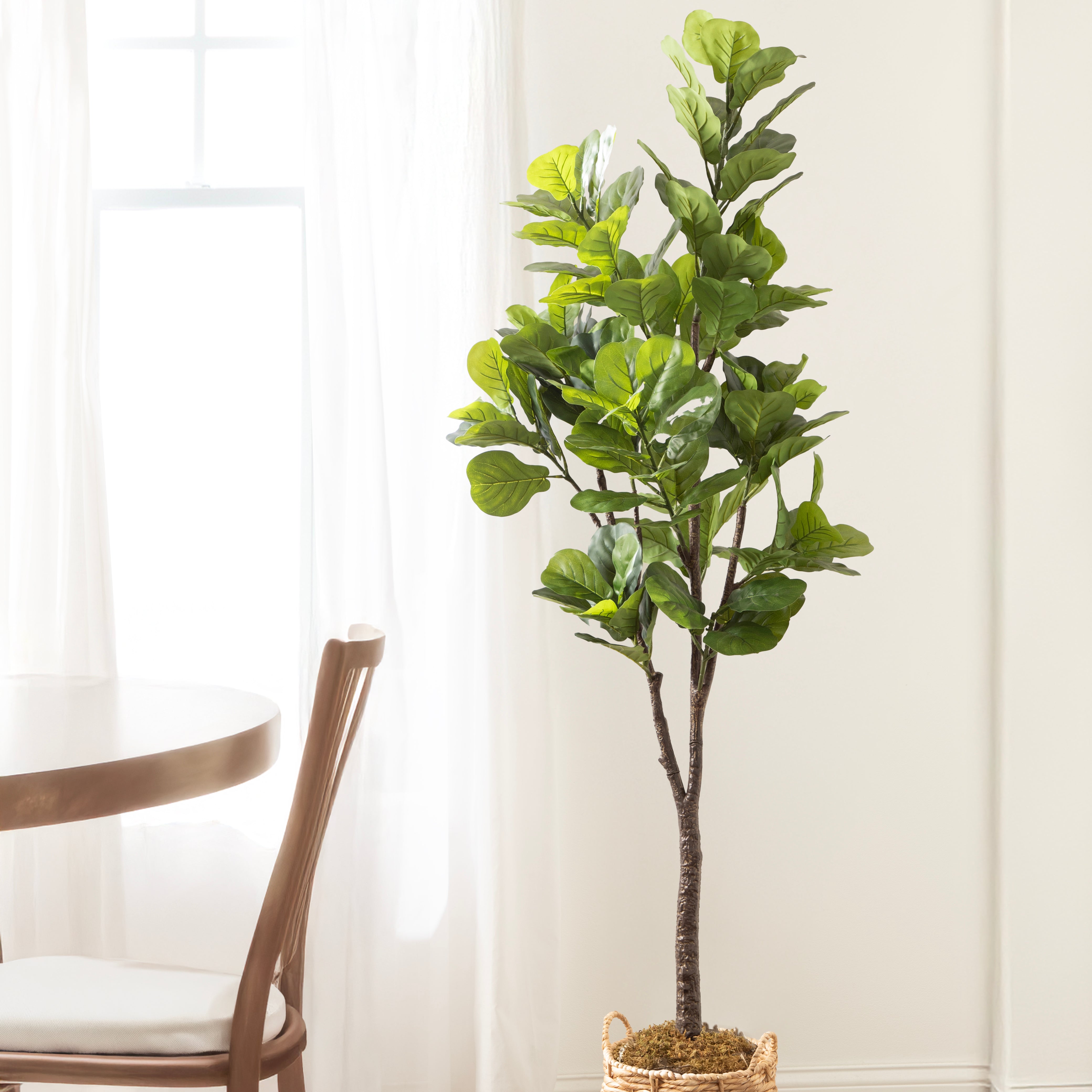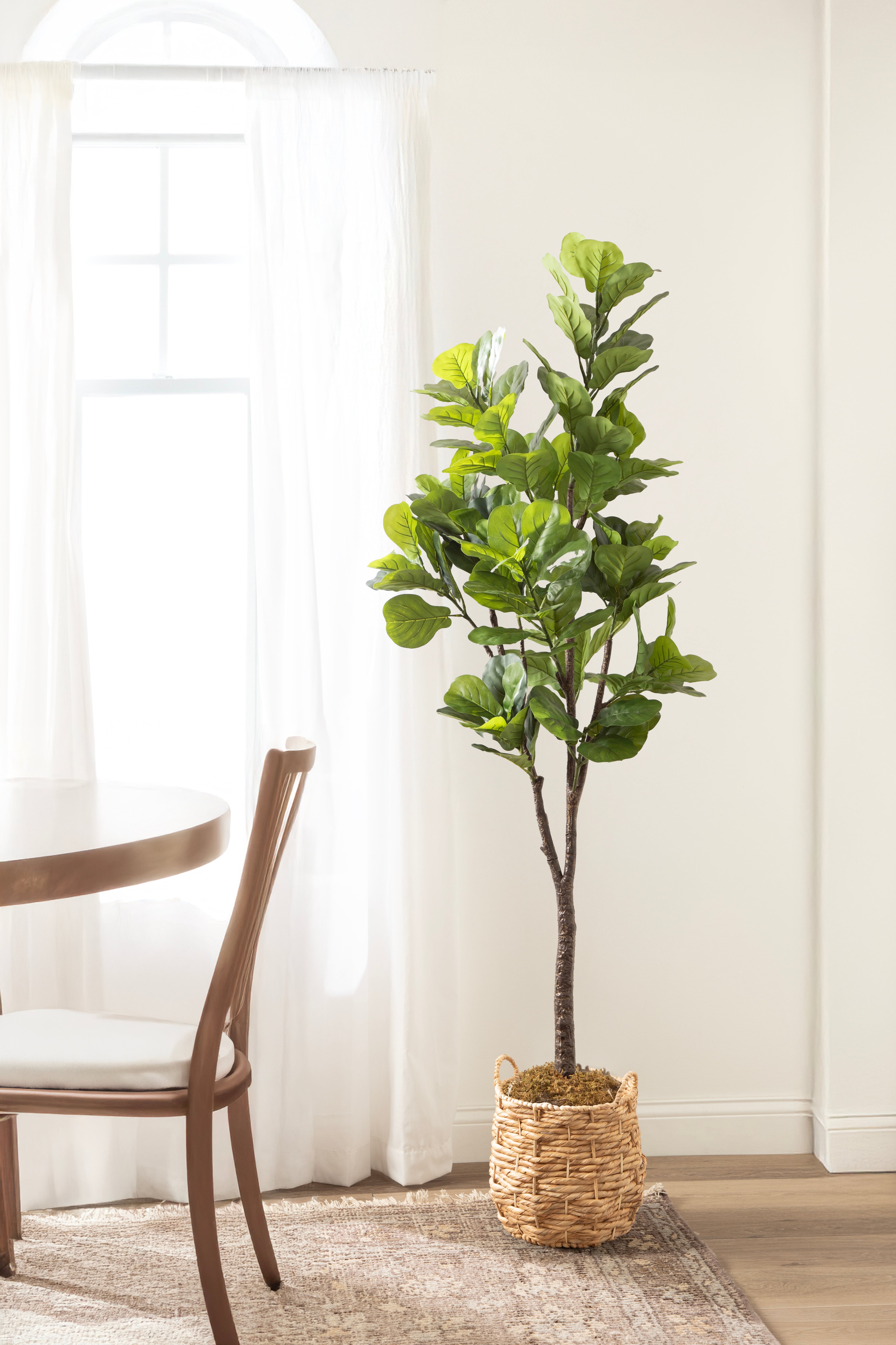 Bring natural beauty into your home—without the upkeep—with the Kate and Laurel Fidmont faux fiddle fig tree. Its broad, leathery green fiddle fig leaves are carefully crafted for a detailed, realistic tree appearance, arranged along slender, flexible branches to mimic the real thing. Whether you're looking to add texture to your living room, brighten up an office corner, or introduce a calming touch to your bedroom, this faux tree delivers elevated style without demanding sunlight or watering. Housed in a black nursery pot, the Fidmont faux tree comes pre-potted and ready to display after easily and quickly inserting the branches into the base. The sturdy nursery pot ensures stability while offering the flexibility to place it in a decorative basket or planter of your choice for a personalized touch. To enhance its realistic look, the tree comes with a bag of decorative moss to help fill your planter pot of choice. Unlike live plants, the Fidmont requires zero maintenance. Perfect for plant lovers who lack a green thumb or anyone who appreciates the serene beauty of indoor foliage.