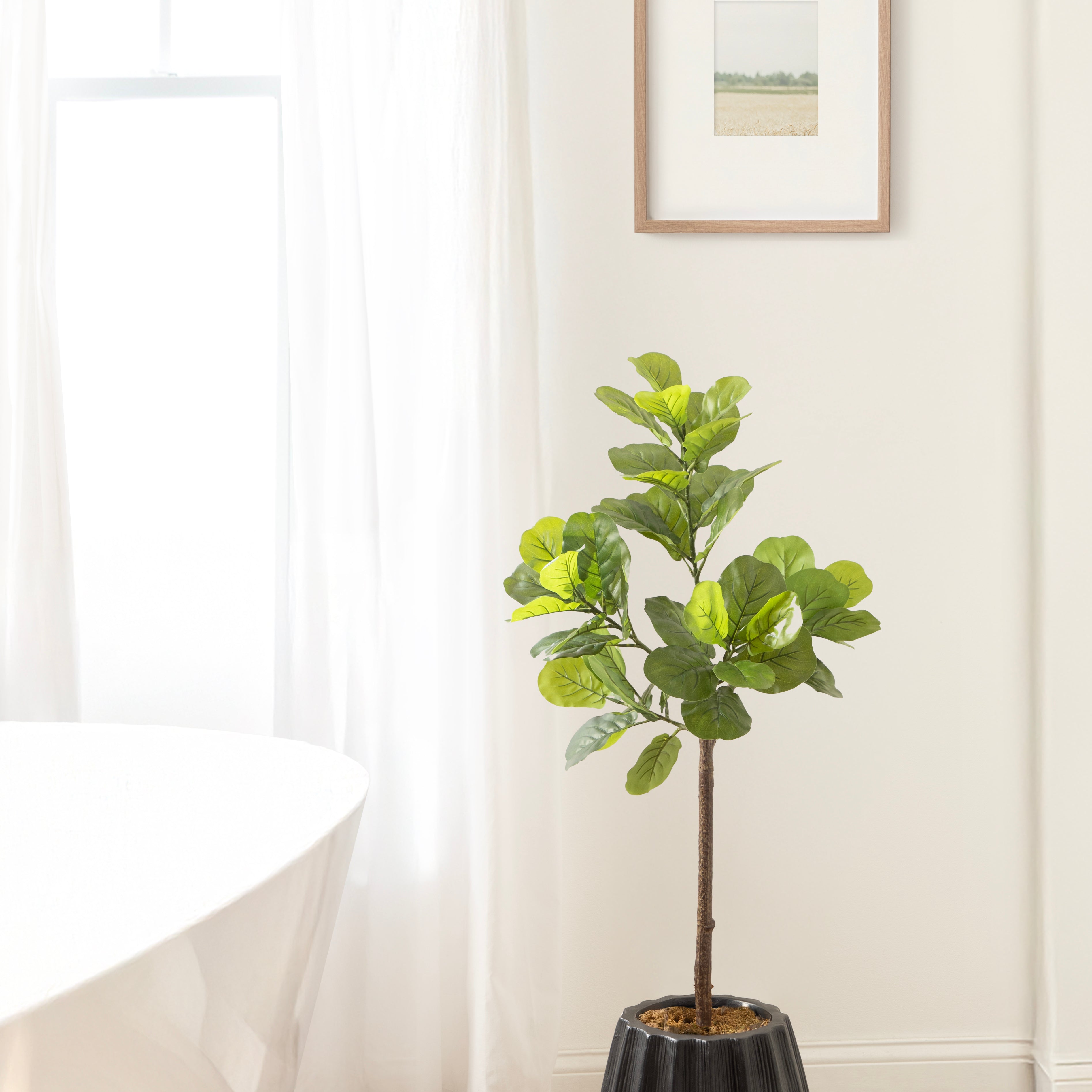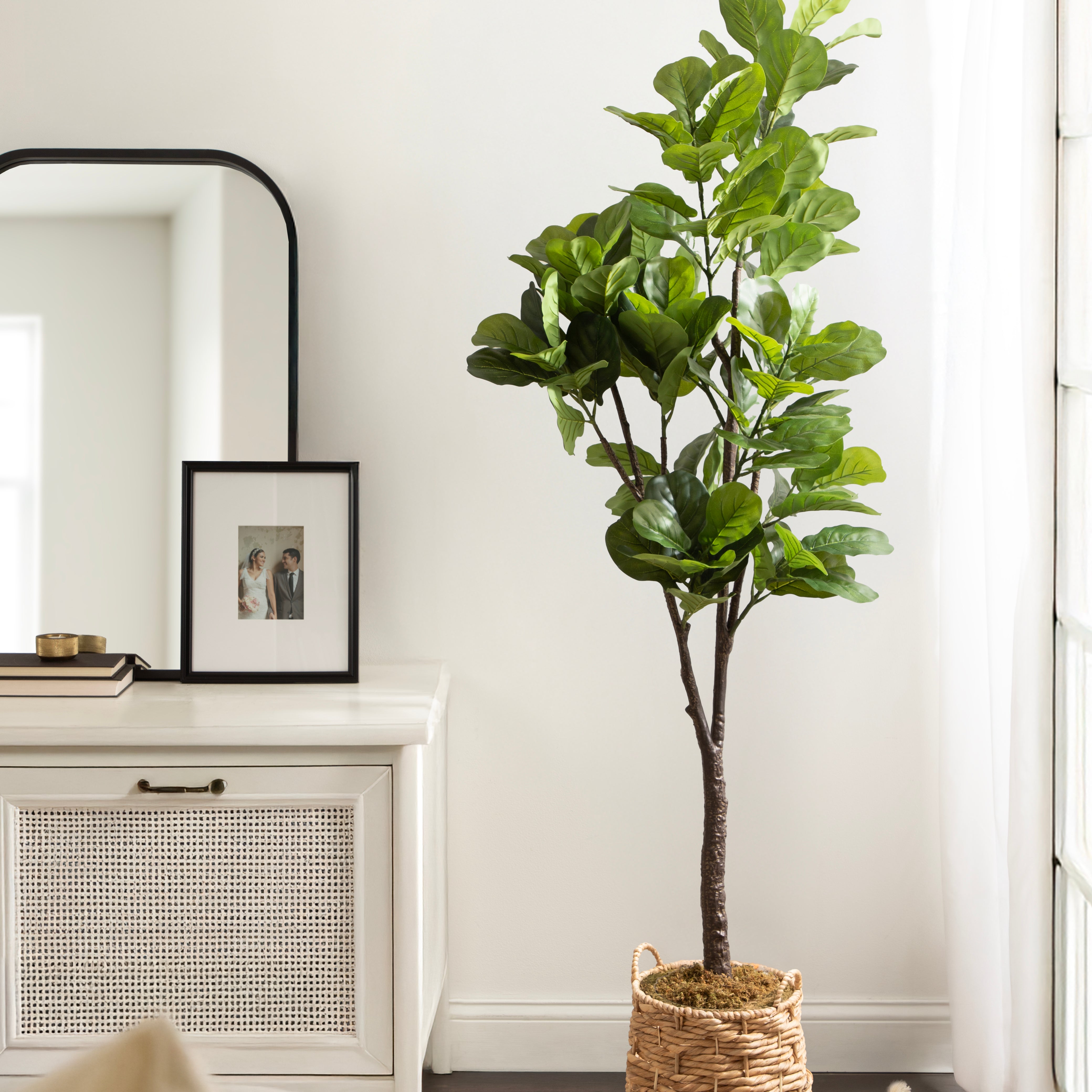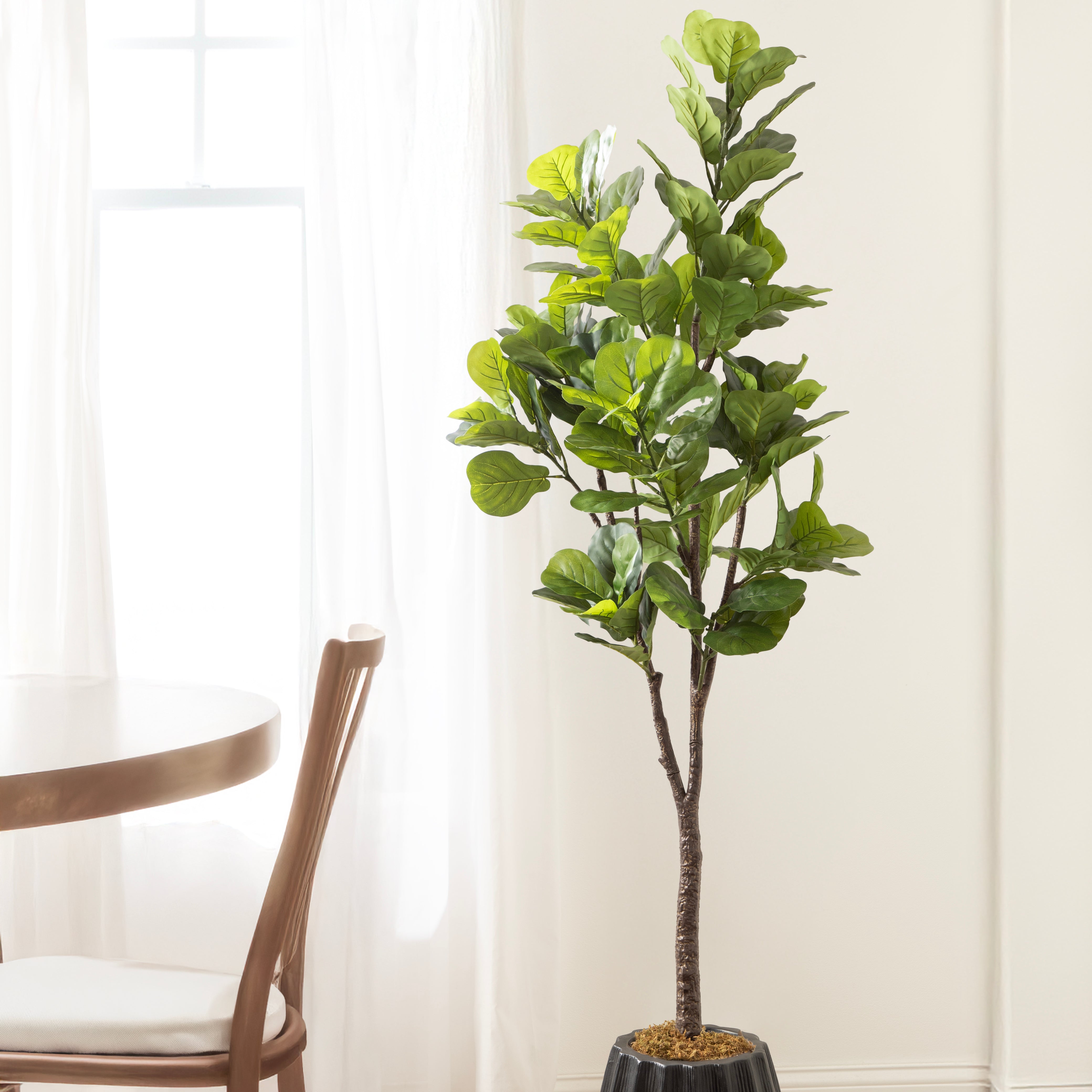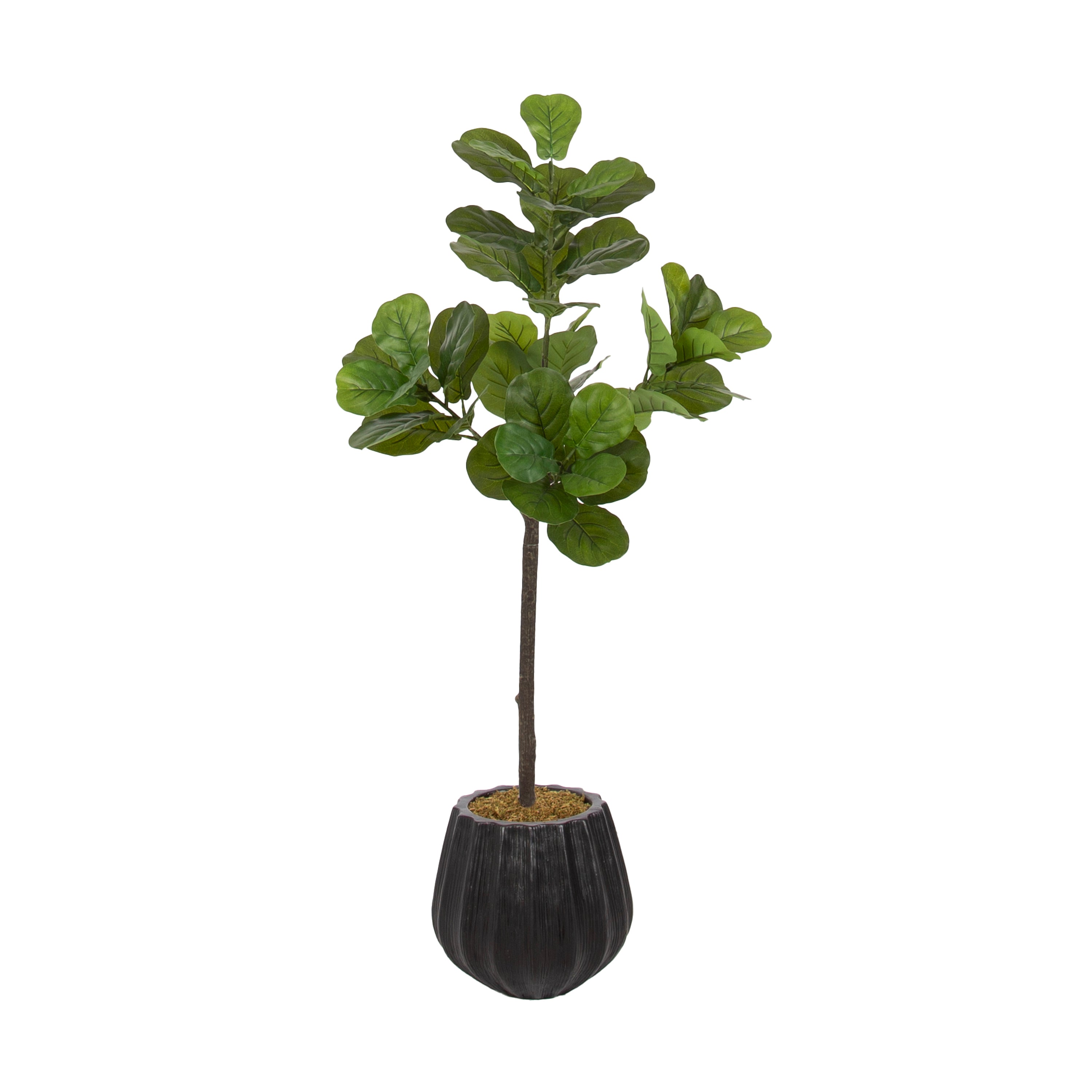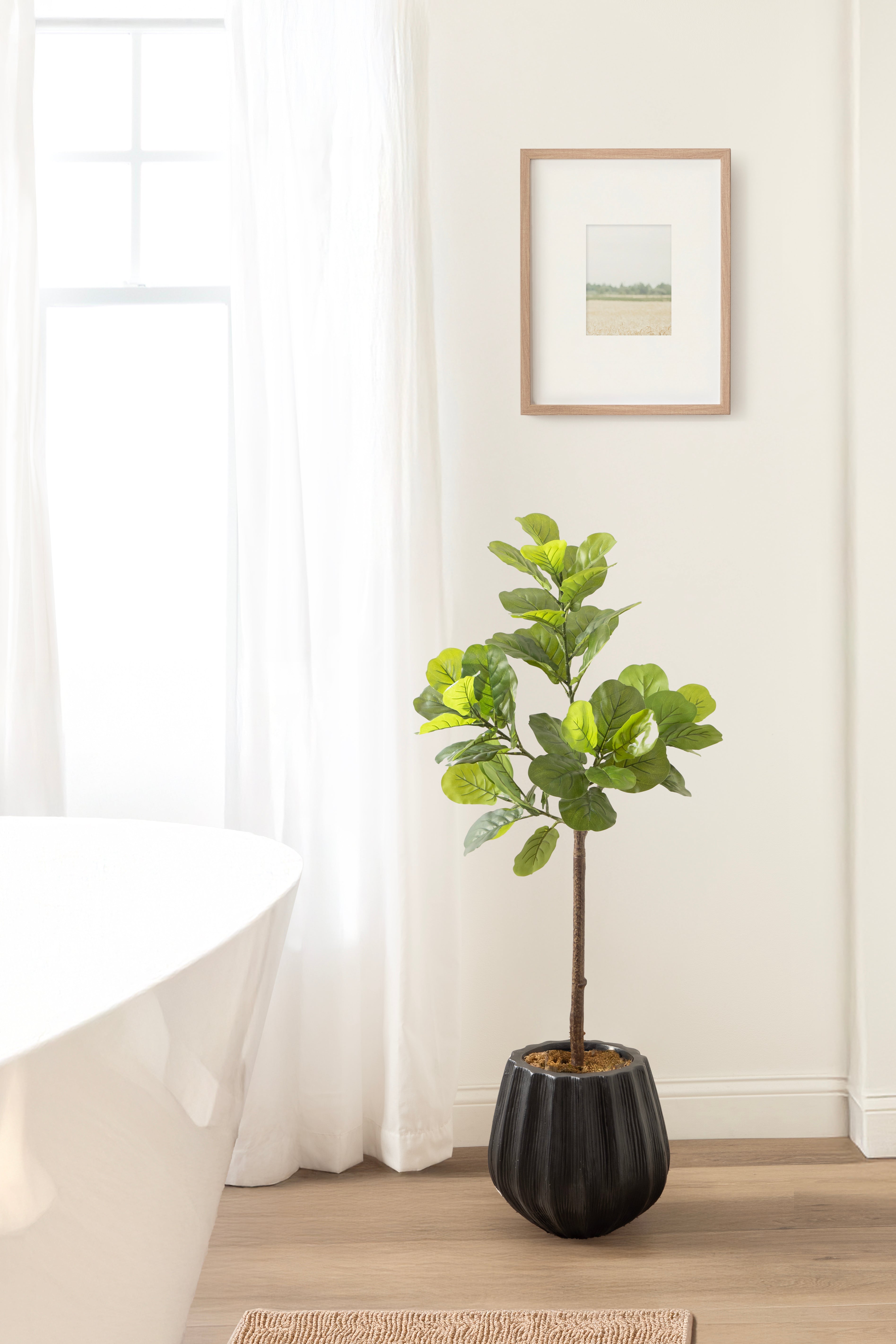 Bring natural beauty into your home—without the upkeep—with the Kate and Laurel Fidmont faux fiddle fig tree. Its broad, leathery green fiddle fig leaves are carefully crafted for a detailed, realistic tree appearance, arranged along slender, flexible branches to mimic the real thing. Whether you're looking to add texture to your living room, brighten up an office corner, or introduce a calming touch to your bedroom, this faux tree delivers elevated style without demanding sunlight or watering. Housed in a black nursery pot, the Fidmont faux tree comes pre-potted and ready to display after easily and quickly inserting the branches into the base. The sturdy nursery pot ensures stability while offering the flexibility to place it in a decorative basket or planter of your choice for a personalized touch. To enhance its realistic look, the tree comes with a bag of decorative moss to help fill your planter pot of choice. Unlike live plants, the Fidmont requires zero maintenance. Perfect for plant lovers who lack a green thumb or anyone who appreciates the serene beauty of indoor foliage.