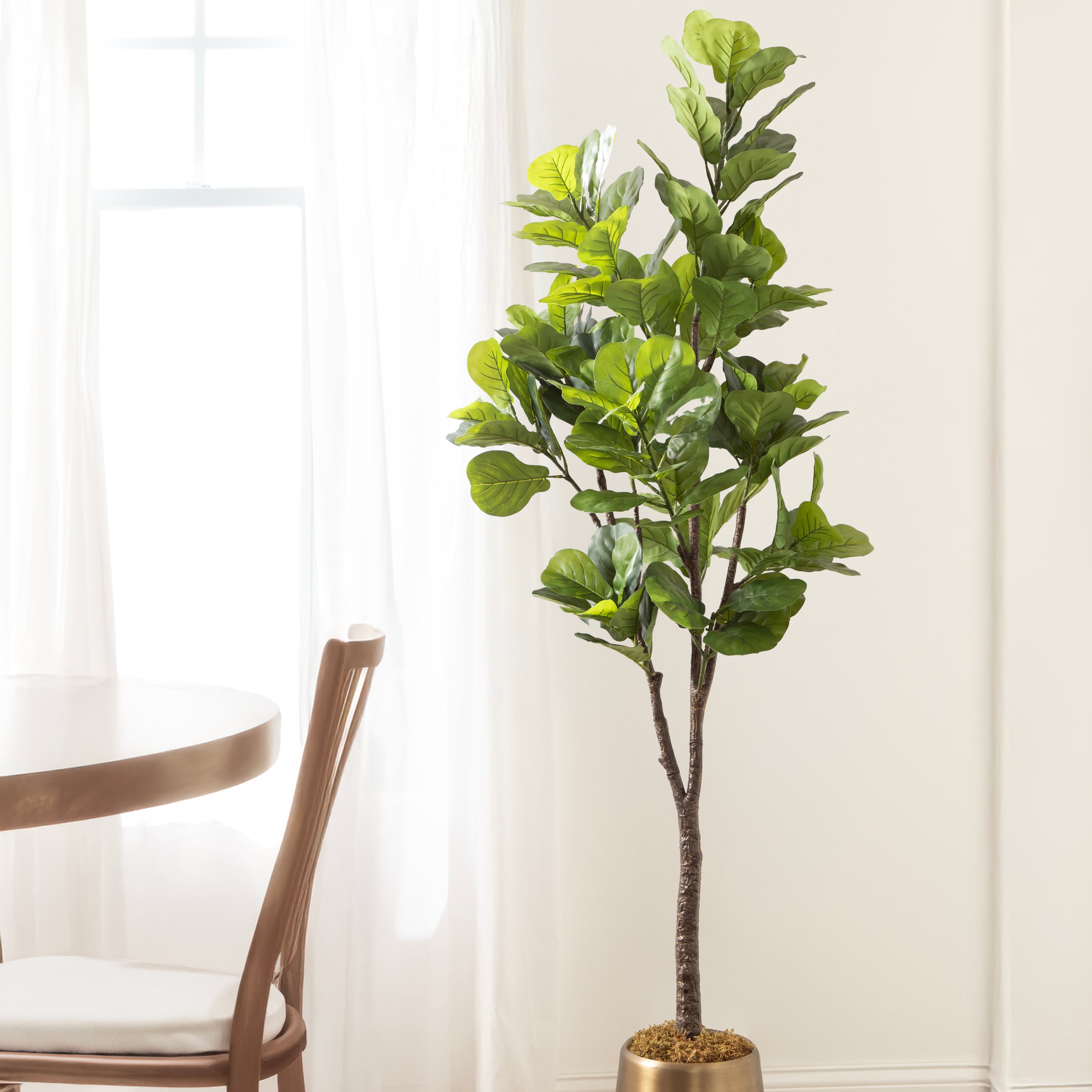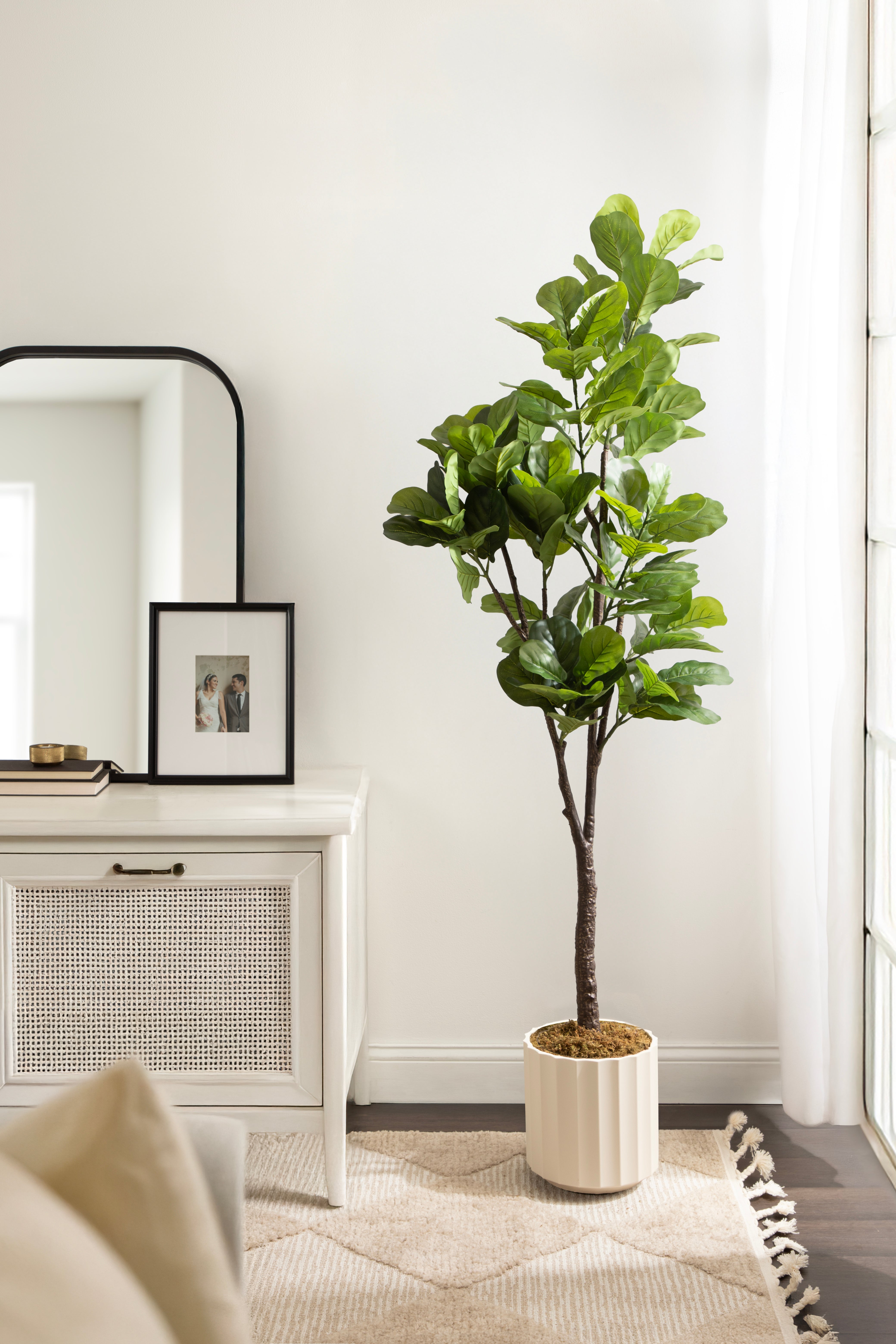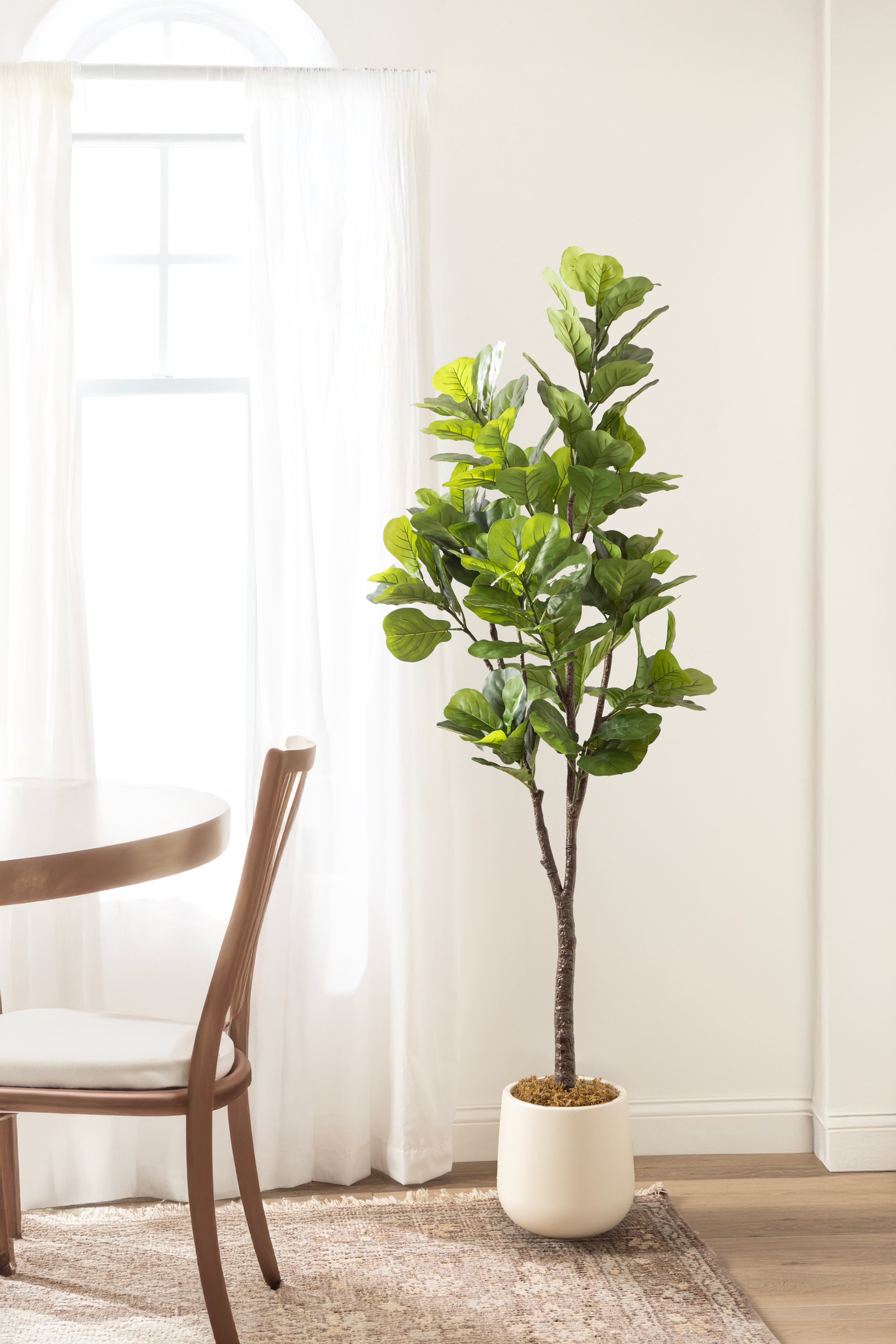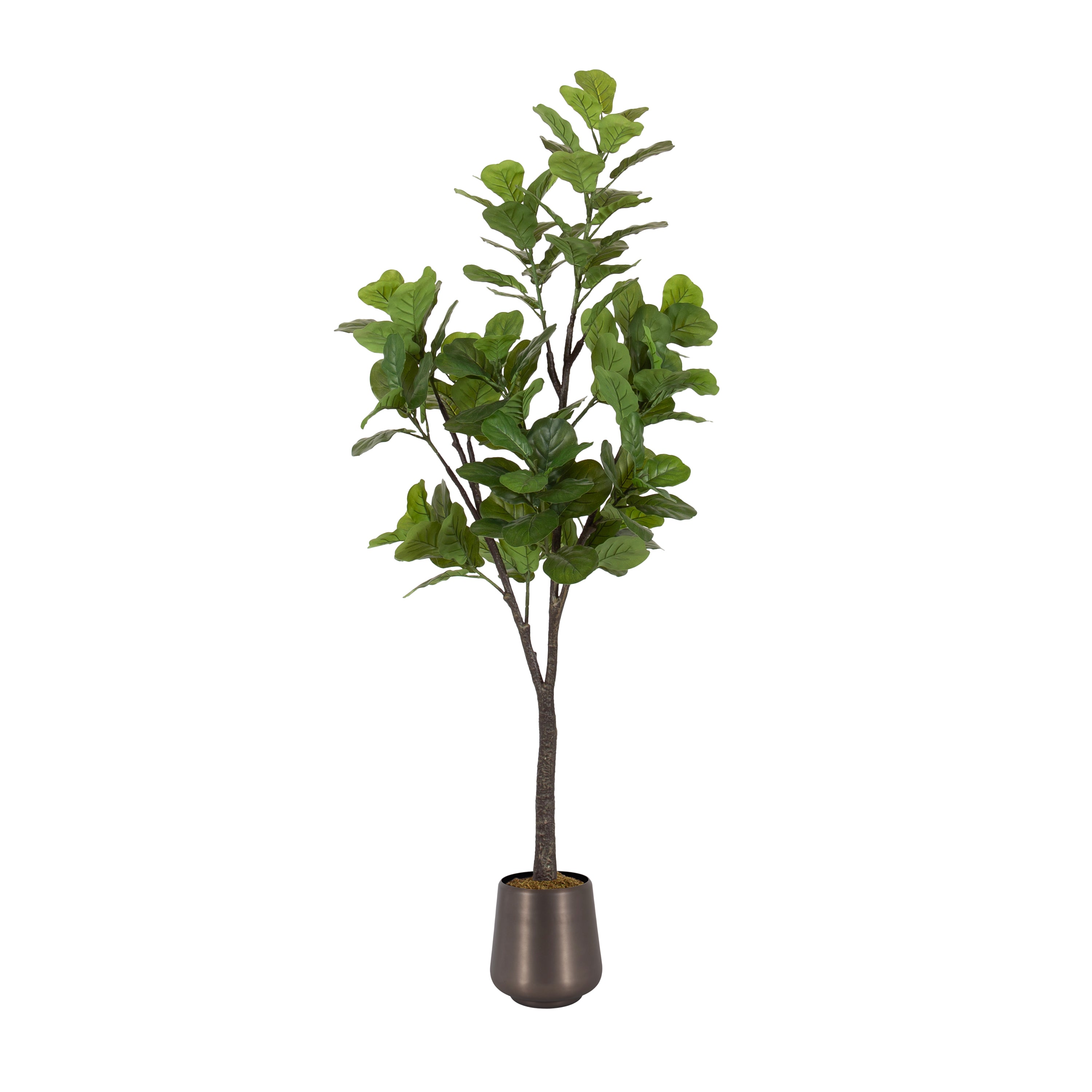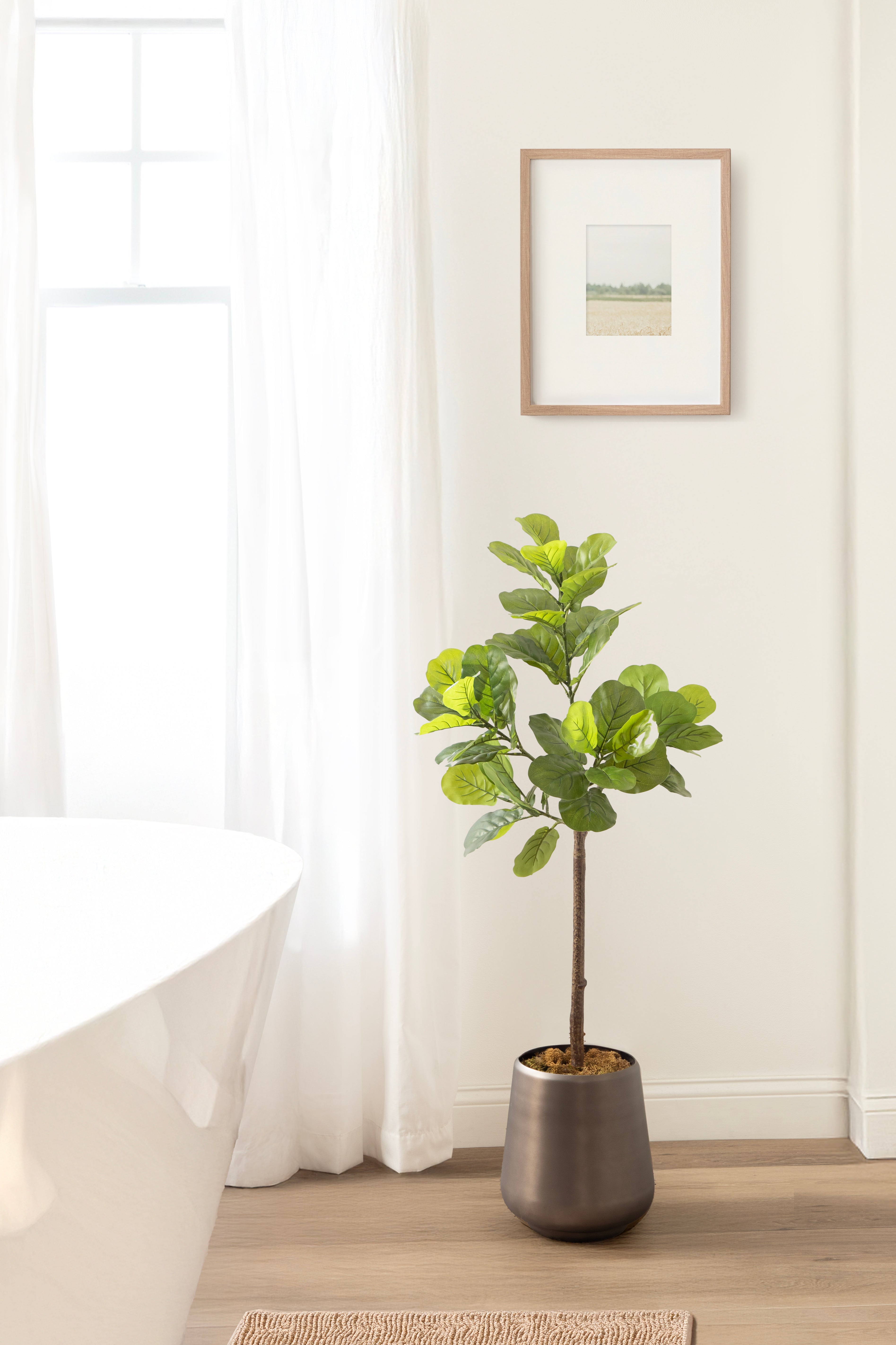 Bring natural beauty into your home—without the upkeep—with the Kate and Laurel Fidmont faux fiddle fig tree. Its broad, leathery green fiddle fig leaves are carefully crafted for a detailed, realistic tree appearance, arranged along slender, flexible branches to mimic the real thing. Whether you're looking to add texture to your living room, brighten up an office corner, or introduce a calming touch to your bedroom, this faux tree delivers elevated style without demanding sunlight or watering. Housed in a black nursery pot, the Fidmont faux tree comes pre-potted and ready to display after easily and quickly inserting the branches into the base. The sturdy nursery pot ensures stability while offering the flexibility to place it in a decorative basket or planter of your choice for a personalized touch. To enhance its realistic look, the tree comes with a bag of decorative moss to help fill your planter pot of choice. Unlike live plants, the Fidmont requires zero maintenance. Perfect for plant lovers who lack a green thumb or anyone who appreciates the serene beauty of indoor foliage.