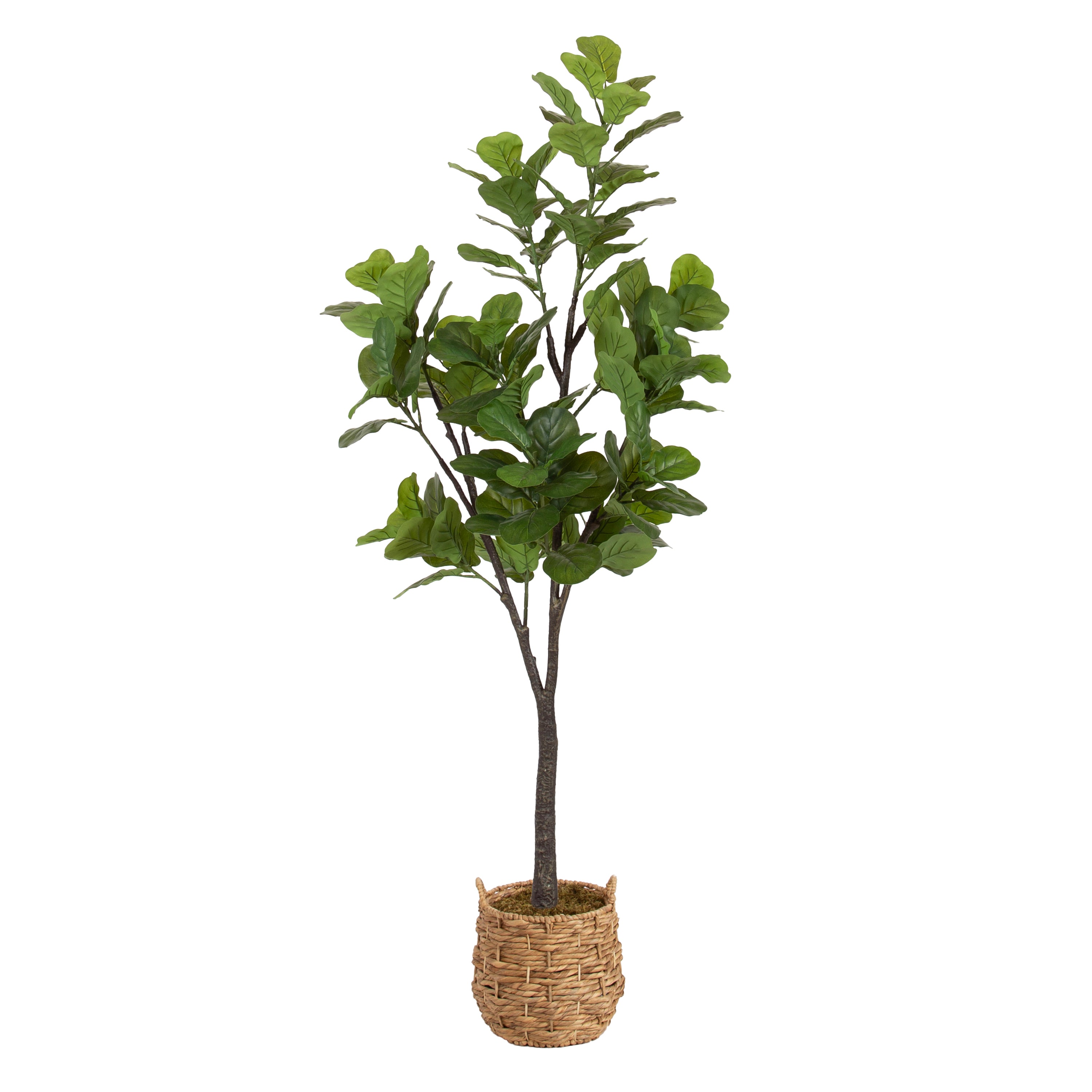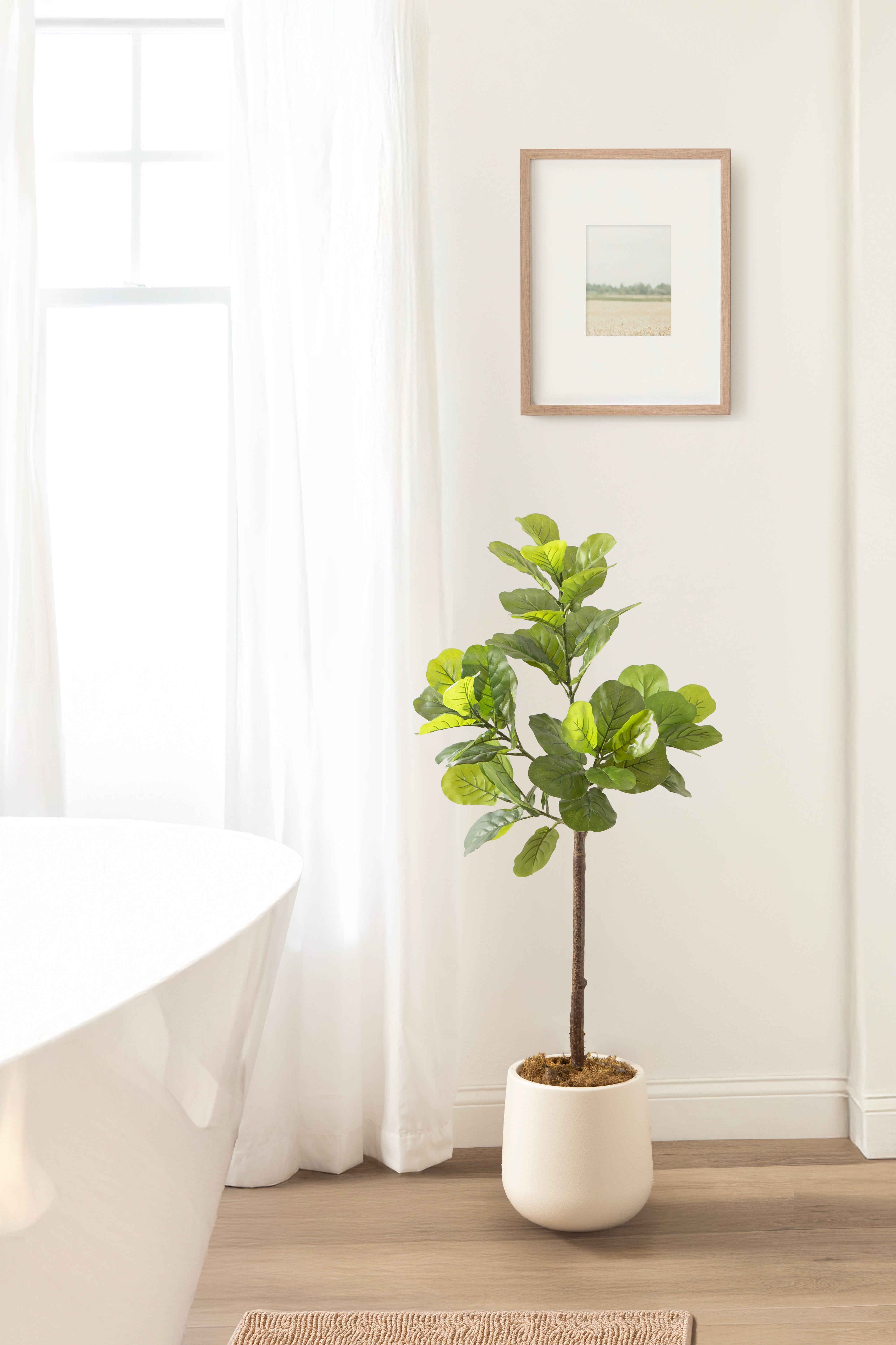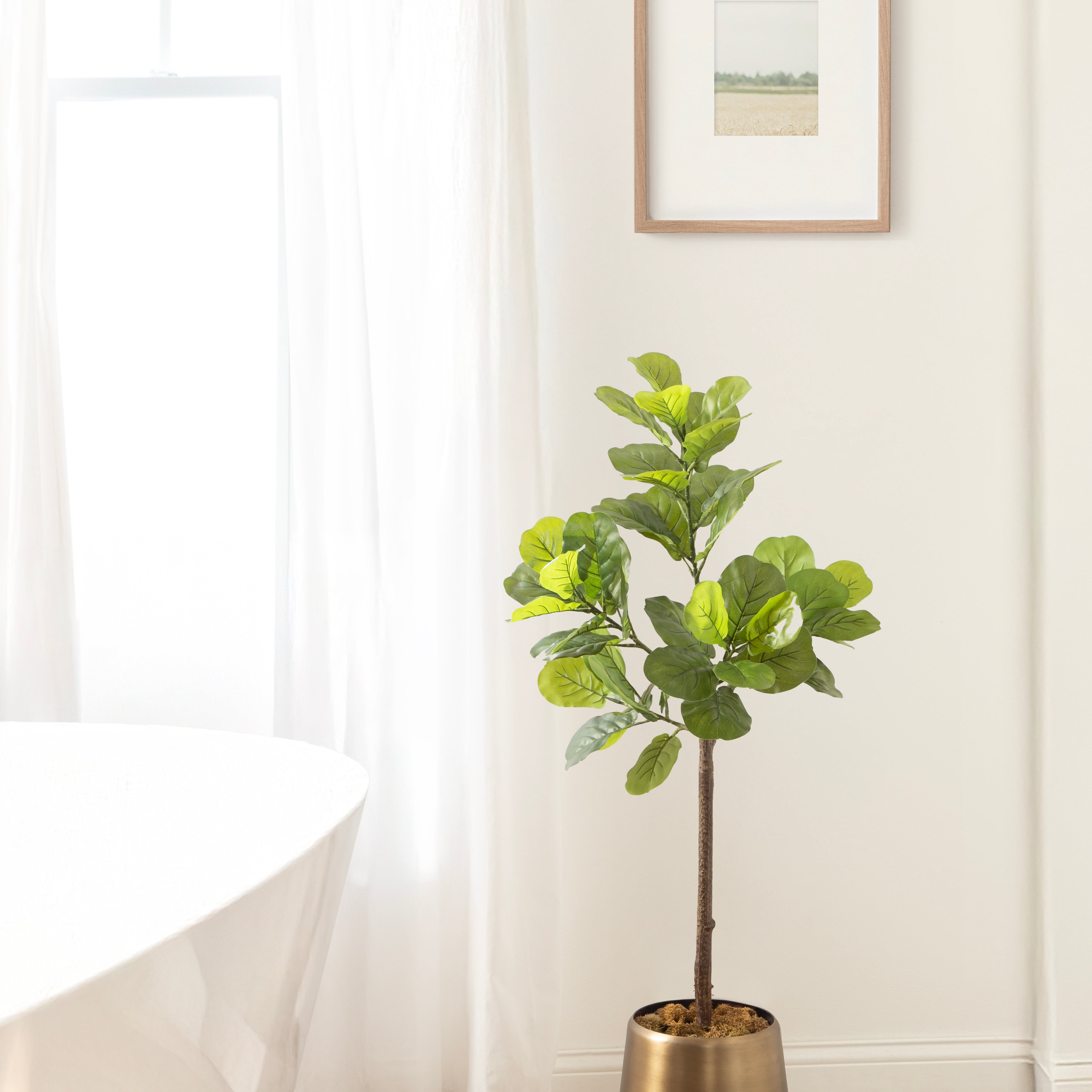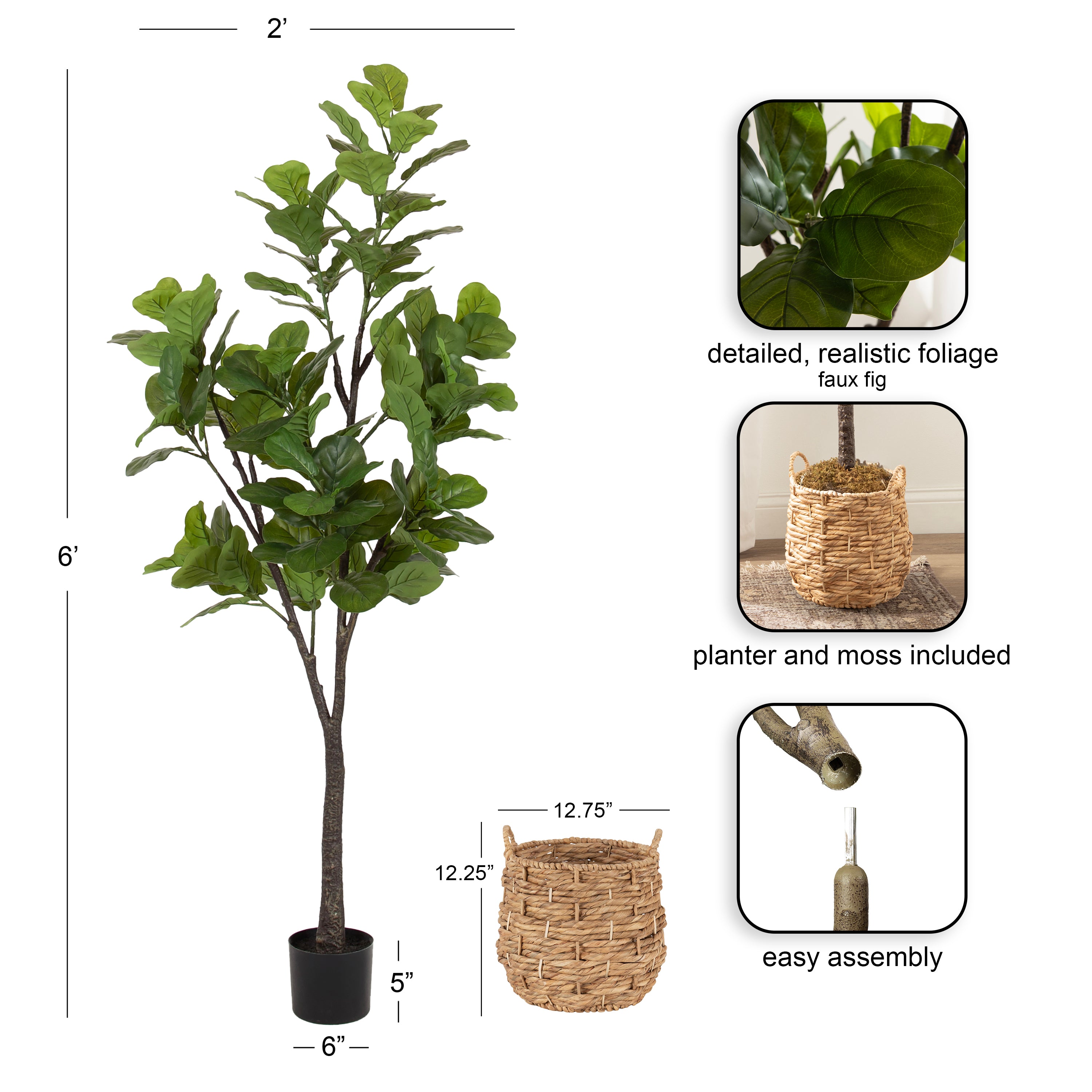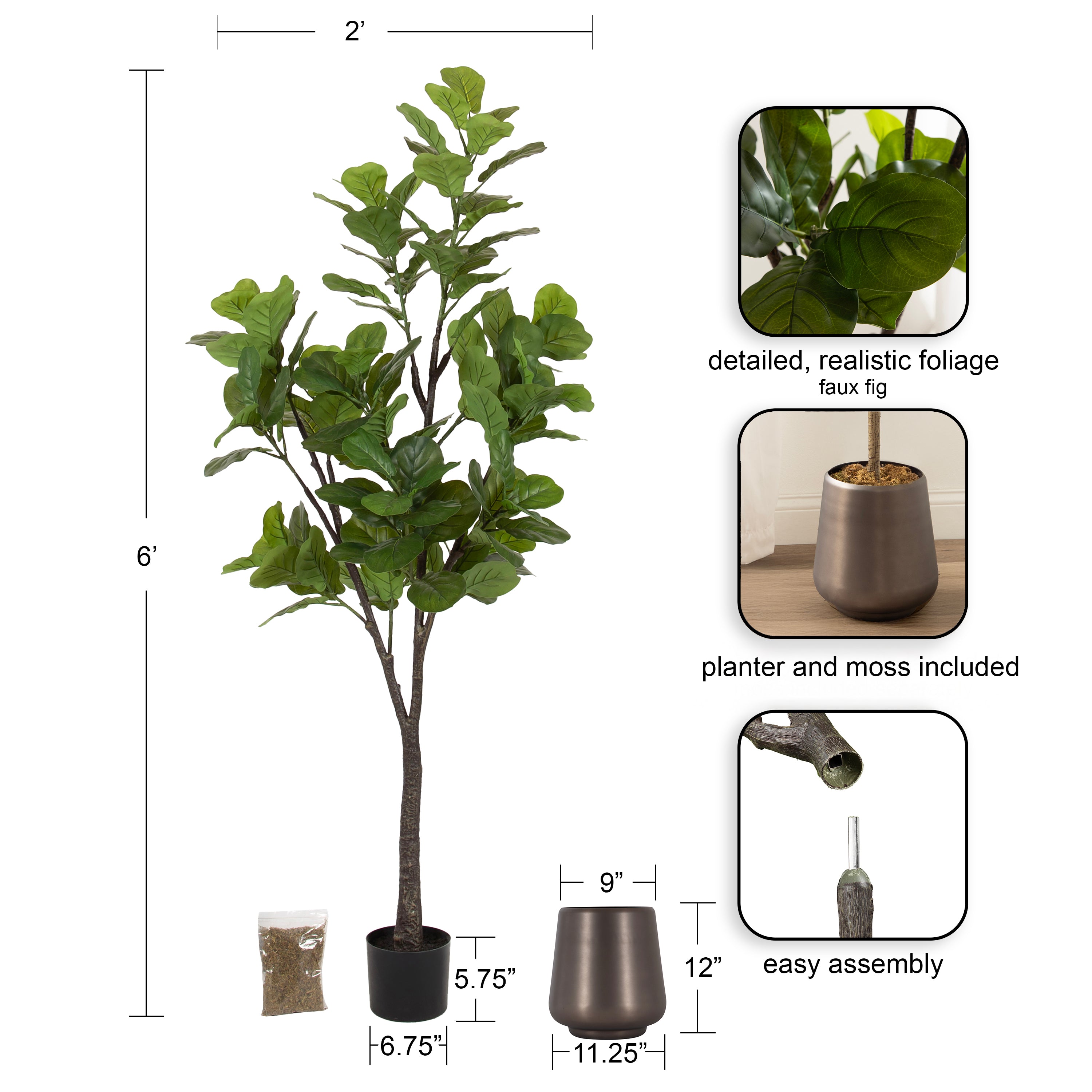 Bring natural beauty into your home—without the upkeep—with the Kate and Laurel Fidmont faux fiddle fig tree. Its broad, leathery green fiddle fig leaves are carefully crafted for a detailed, realistic tree appearance, arranged along slender, flexible branches to mimic the real thing. Whether you're looking to add texture to your living room, brighten up an office corner, or introduce a calming touch to your bedroom, this faux tree delivers elevated style without demanding sunlight or watering. Housed in a black nursery pot, the Fidmont faux tree comes pre-potted and ready to display after easily and quickly inserting the branches into the base. The sturdy nursery pot ensures stability while offering the flexibility to place it in a decorative basket or planter of your choice for a personalized touch. To enhance its realistic look, the tree comes with a bag of decorative moss to help fill your planter pot of choice. Unlike live plants, the Fidmont requires zero maintenance. Perfect for plant lovers who lack a green thumb or anyone who appreciates the serene beauty of indoor foliage.