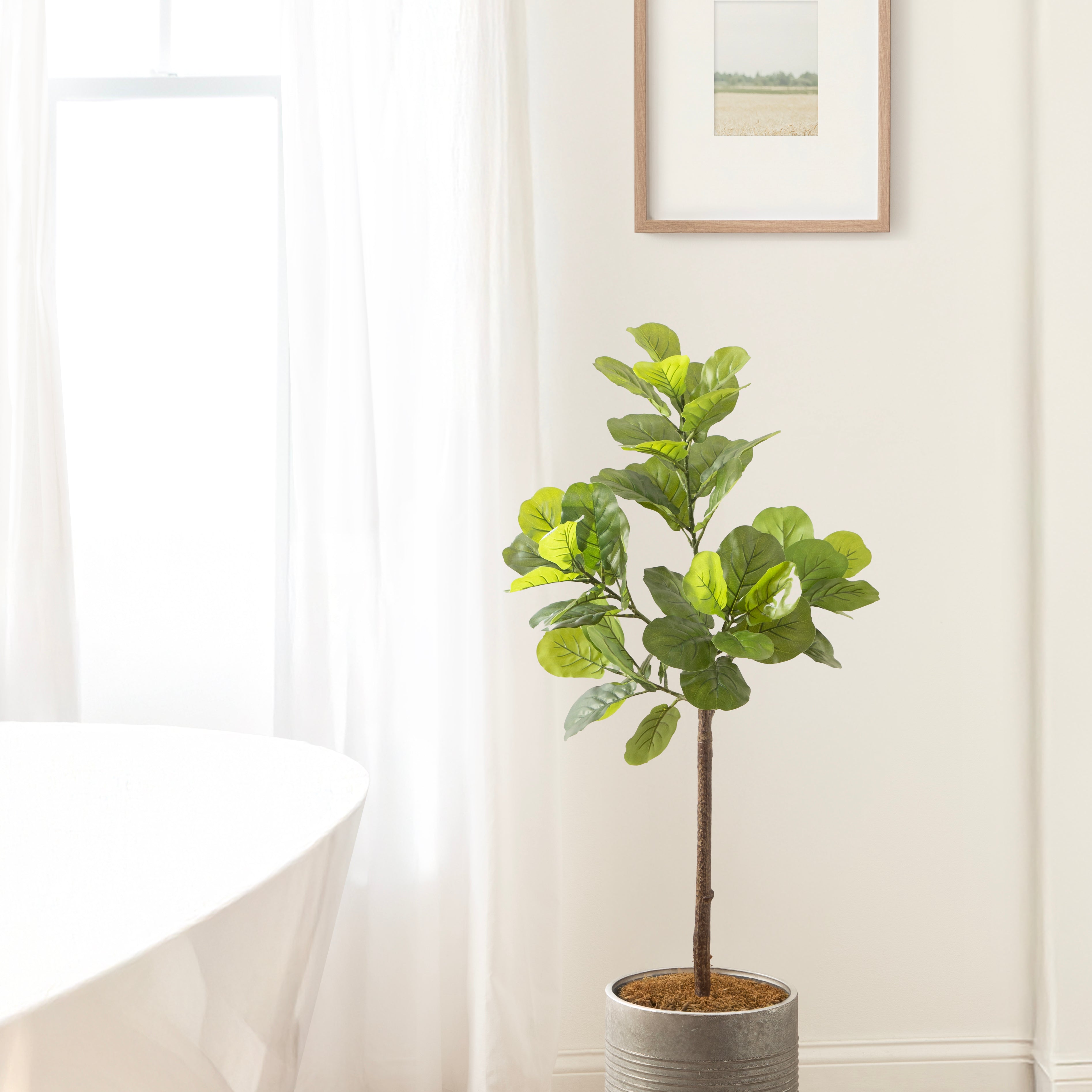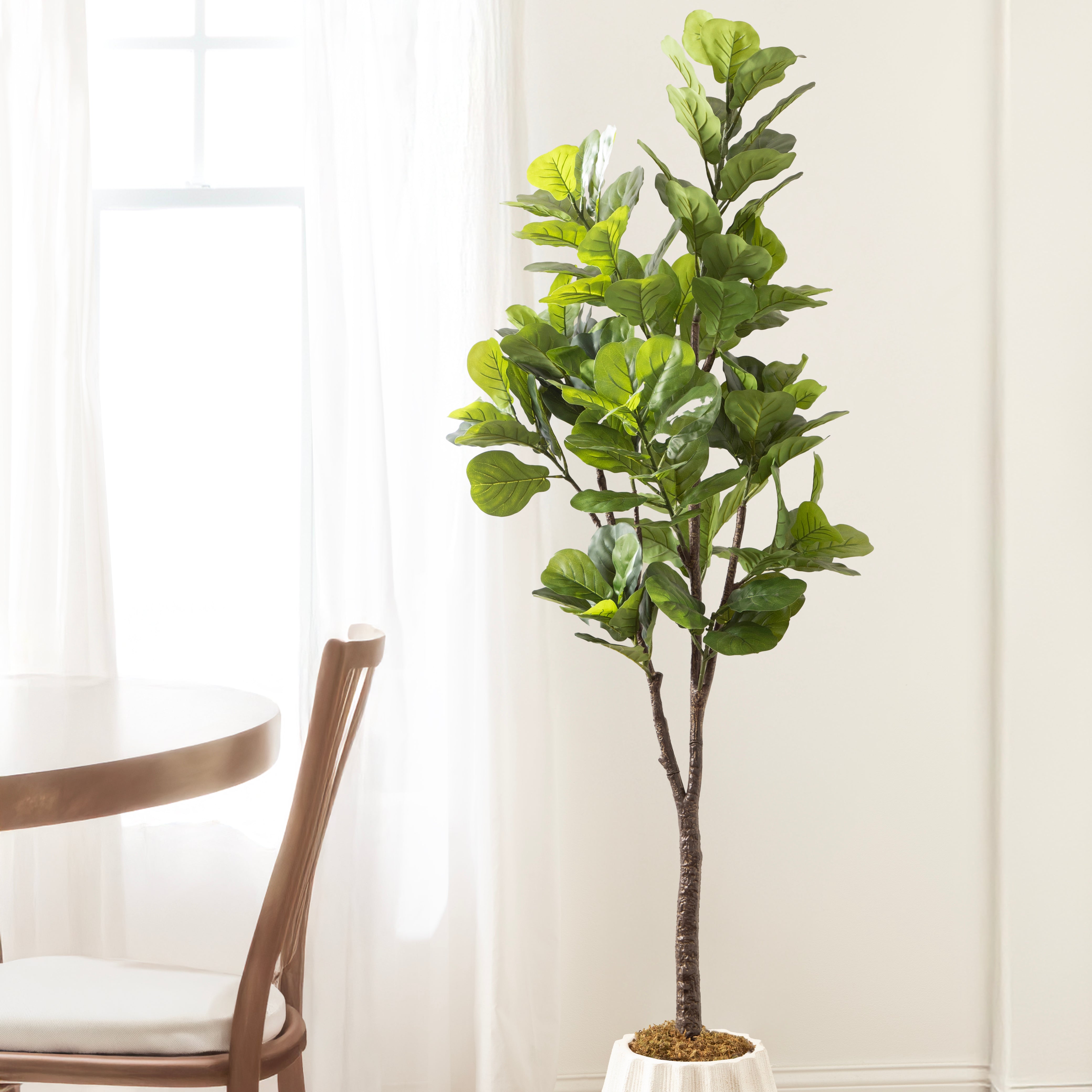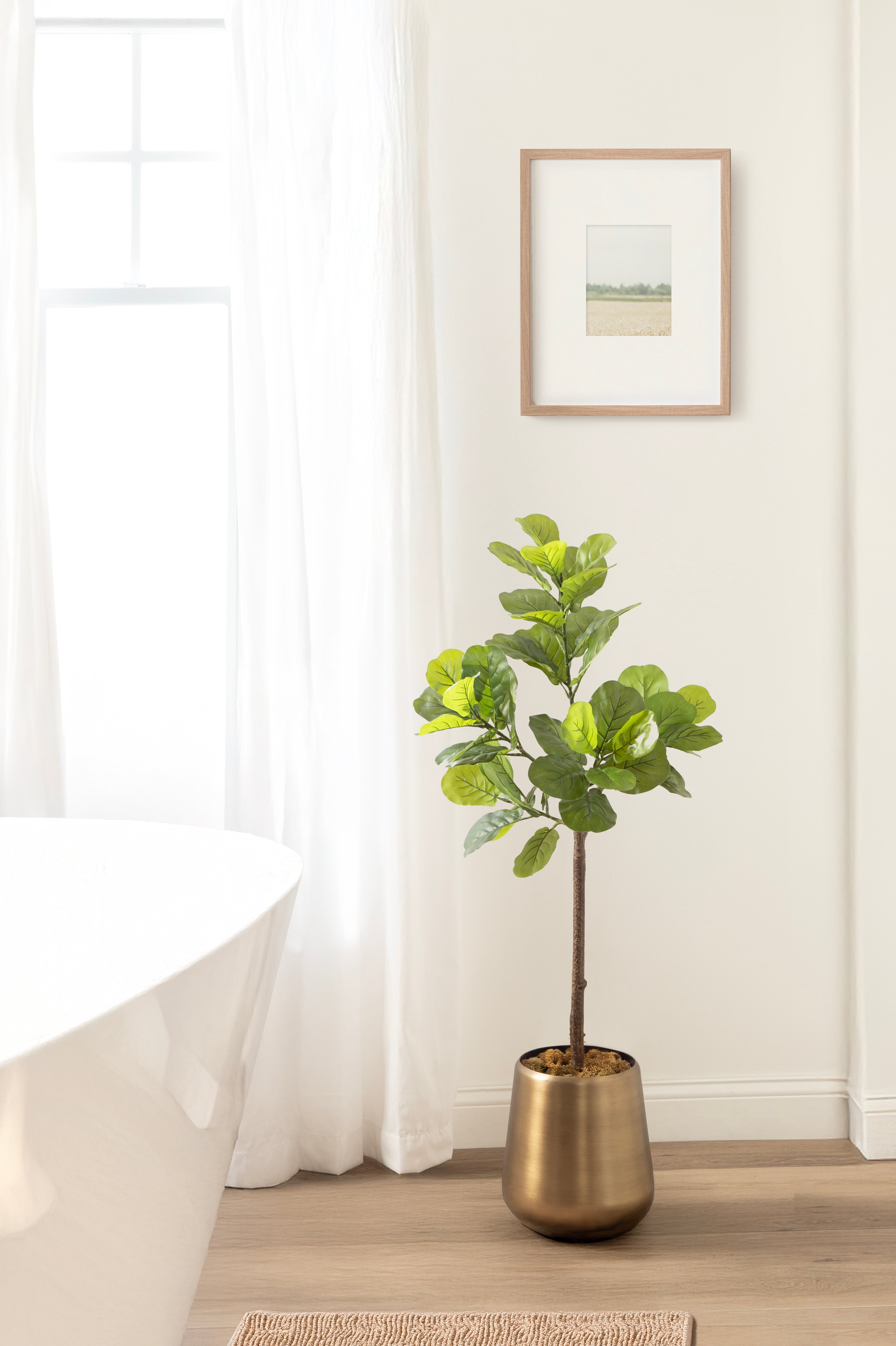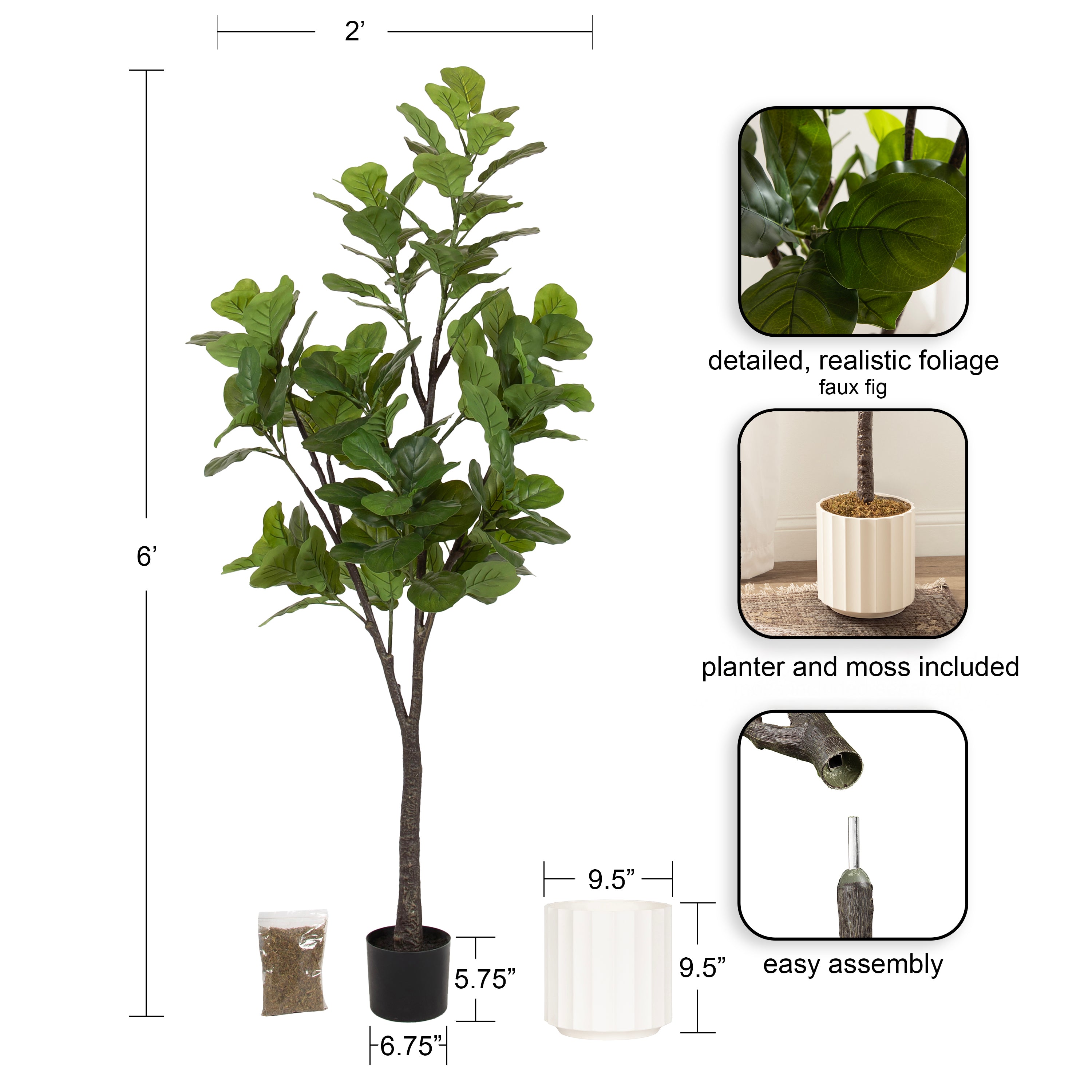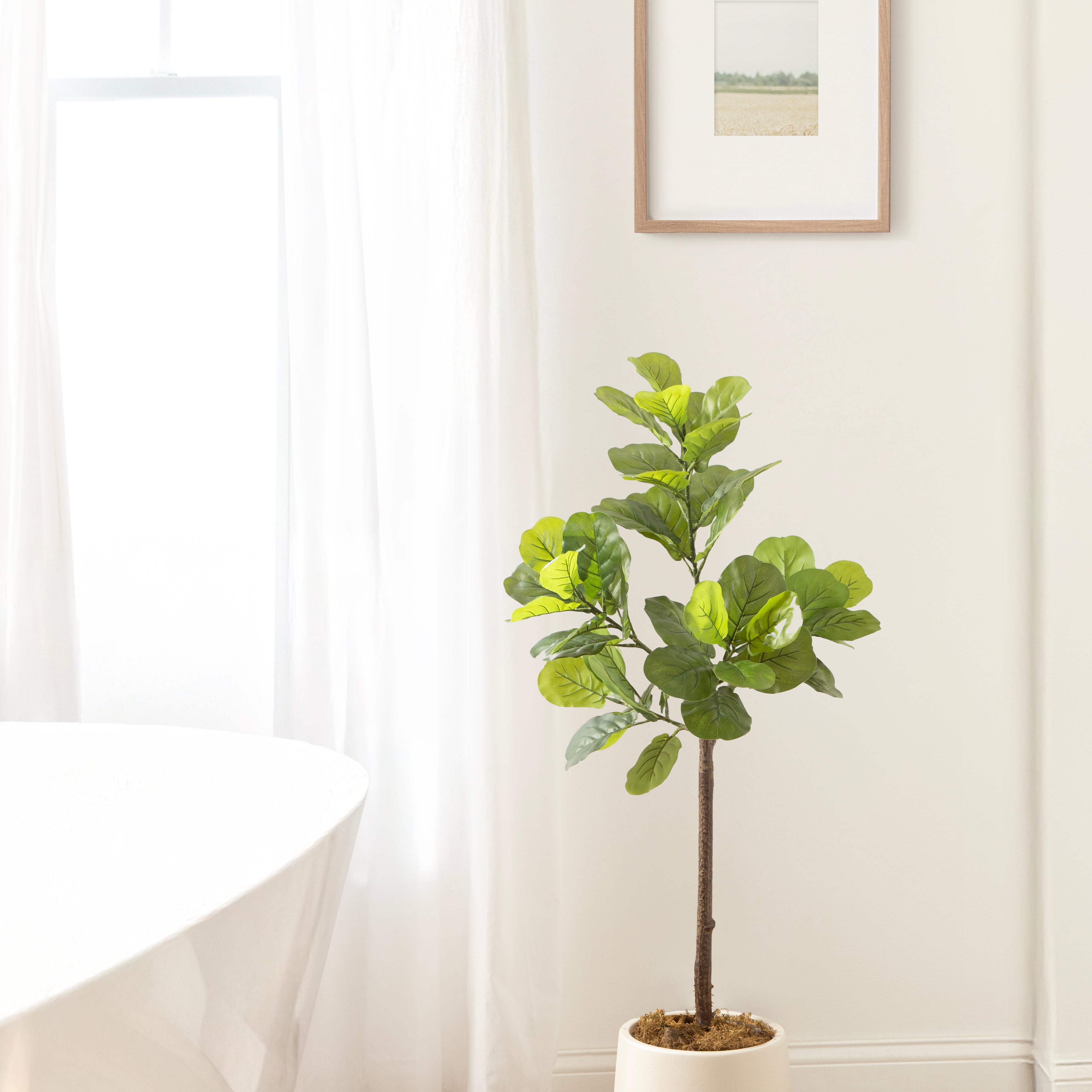 Bring natural beauty into your home—without the upkeep—with the Kate and Laurel Fidmont faux fiddle fig tree. Its broad, leathery green fiddle fig leaves are carefully crafted for a detailed, realistic tree appearance, arranged along slender, flexible branches to mimic the real thing. Whether you're looking to add texture to your living room, brighten up an office corner, or introduce a calming touch to your bedroom, this faux tree delivers elevated style without demanding sunlight or watering. Housed in a black nursery pot, the Fidmont faux tree comes pre-potted and ready to display after easily and quickly inserting the branches into the base. The sturdy nursery pot ensures stability while offering the flexibility to place it in a decorative basket or planter of your choice for a personalized touch. To enhance its realistic look, the tree comes with a bag of decorative moss to help fill your planter pot of choice. Unlike live plants, the Fidmont requires zero maintenance. Perfect for plant lovers who lack a green thumb or anyone who appreciates the serene beauty of indoor foliage.