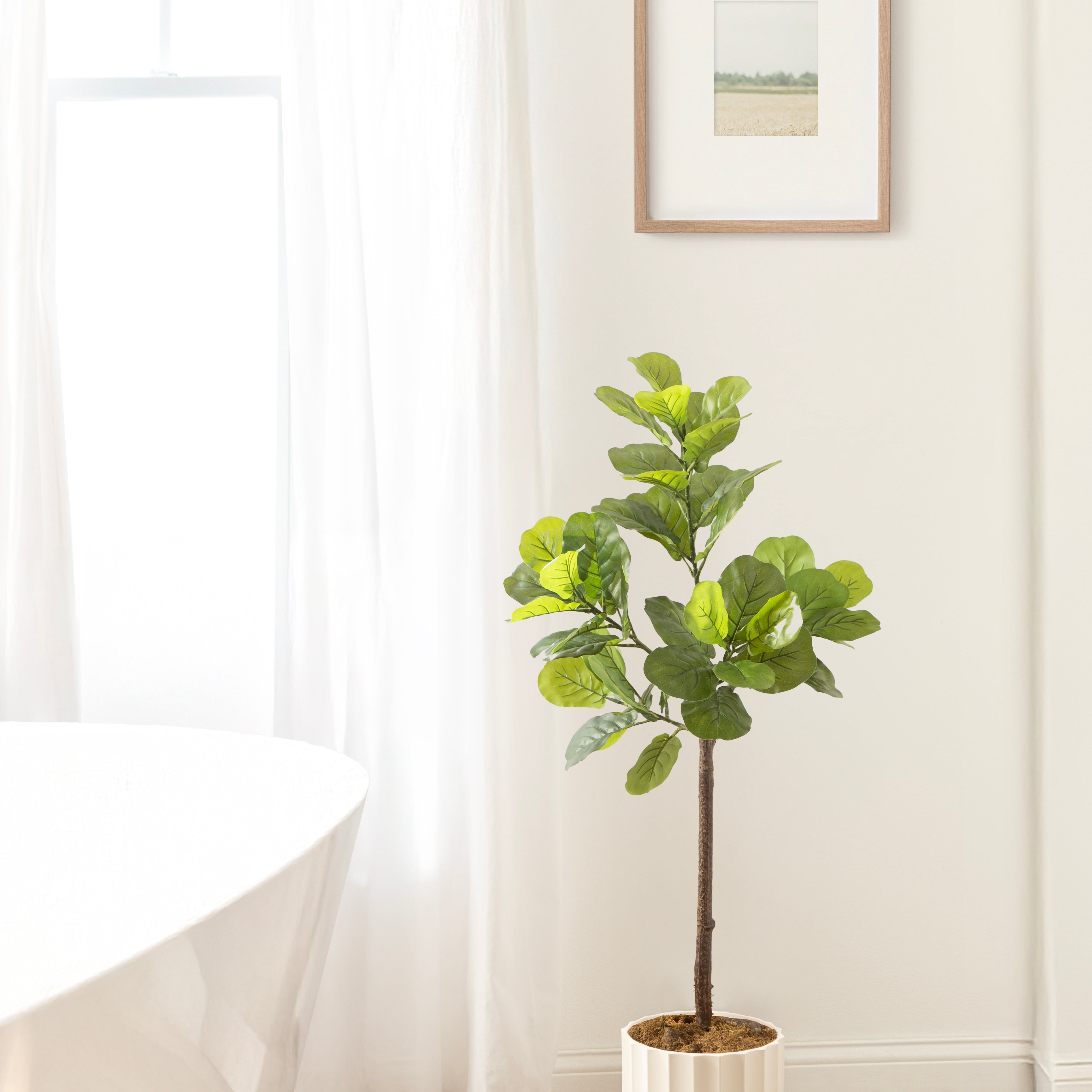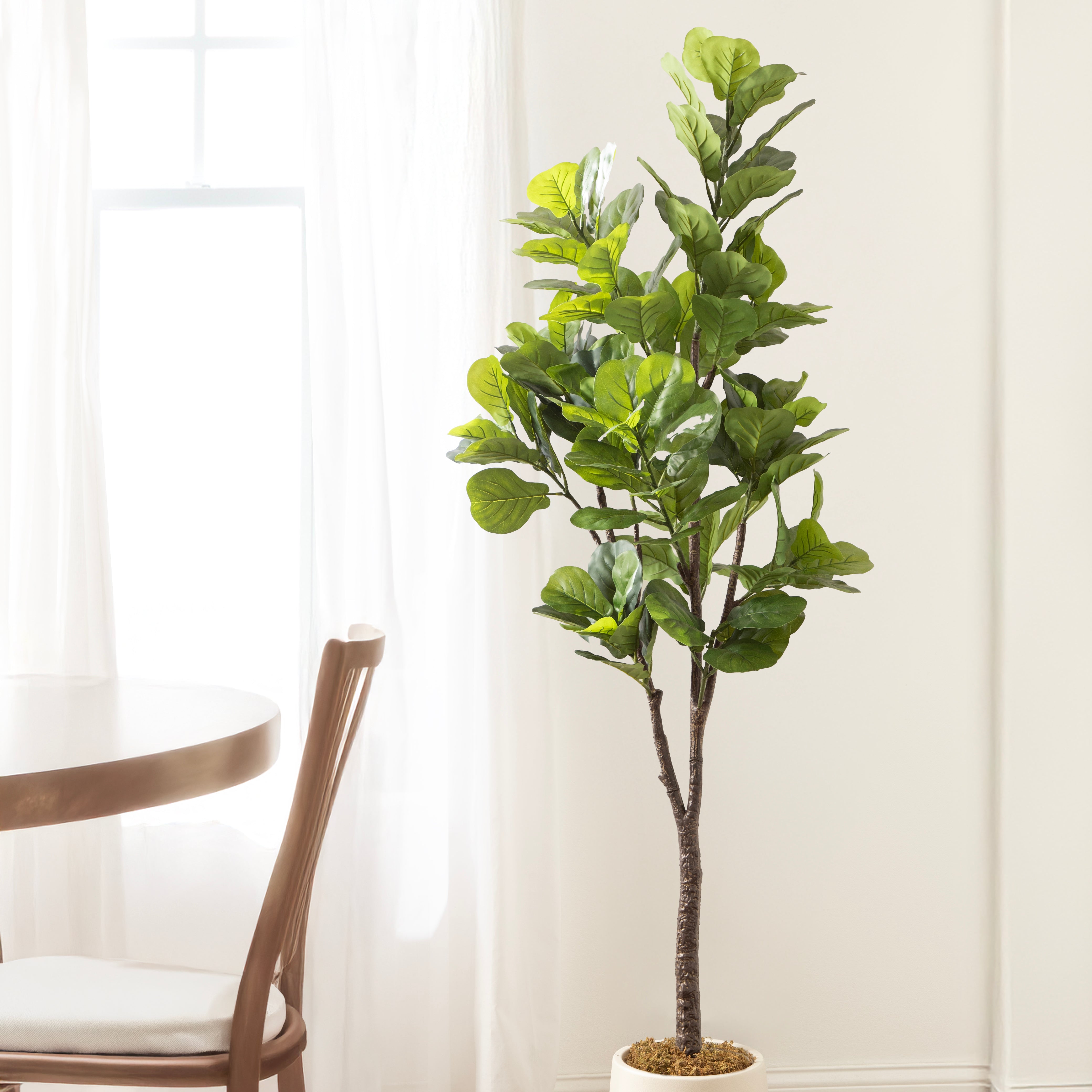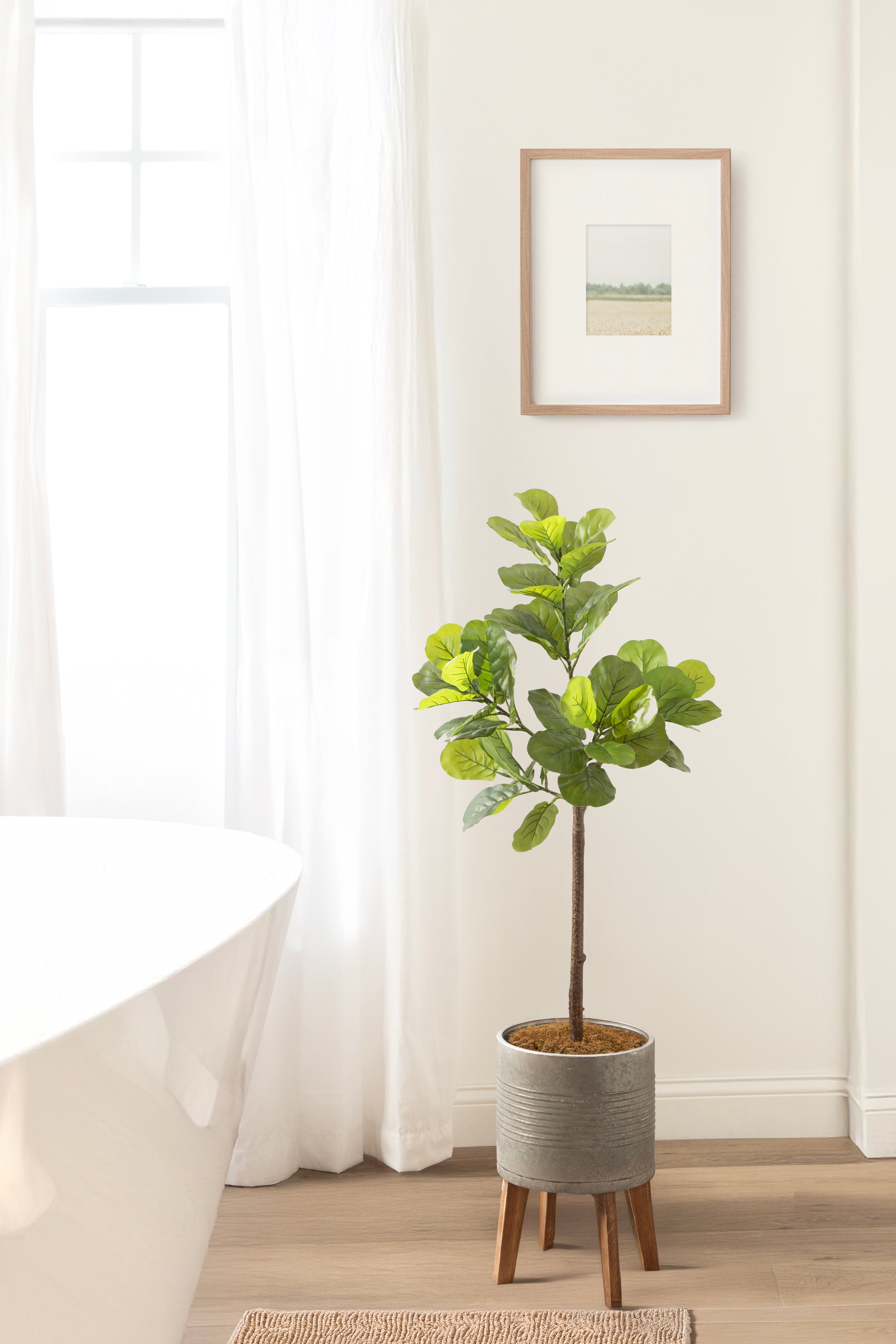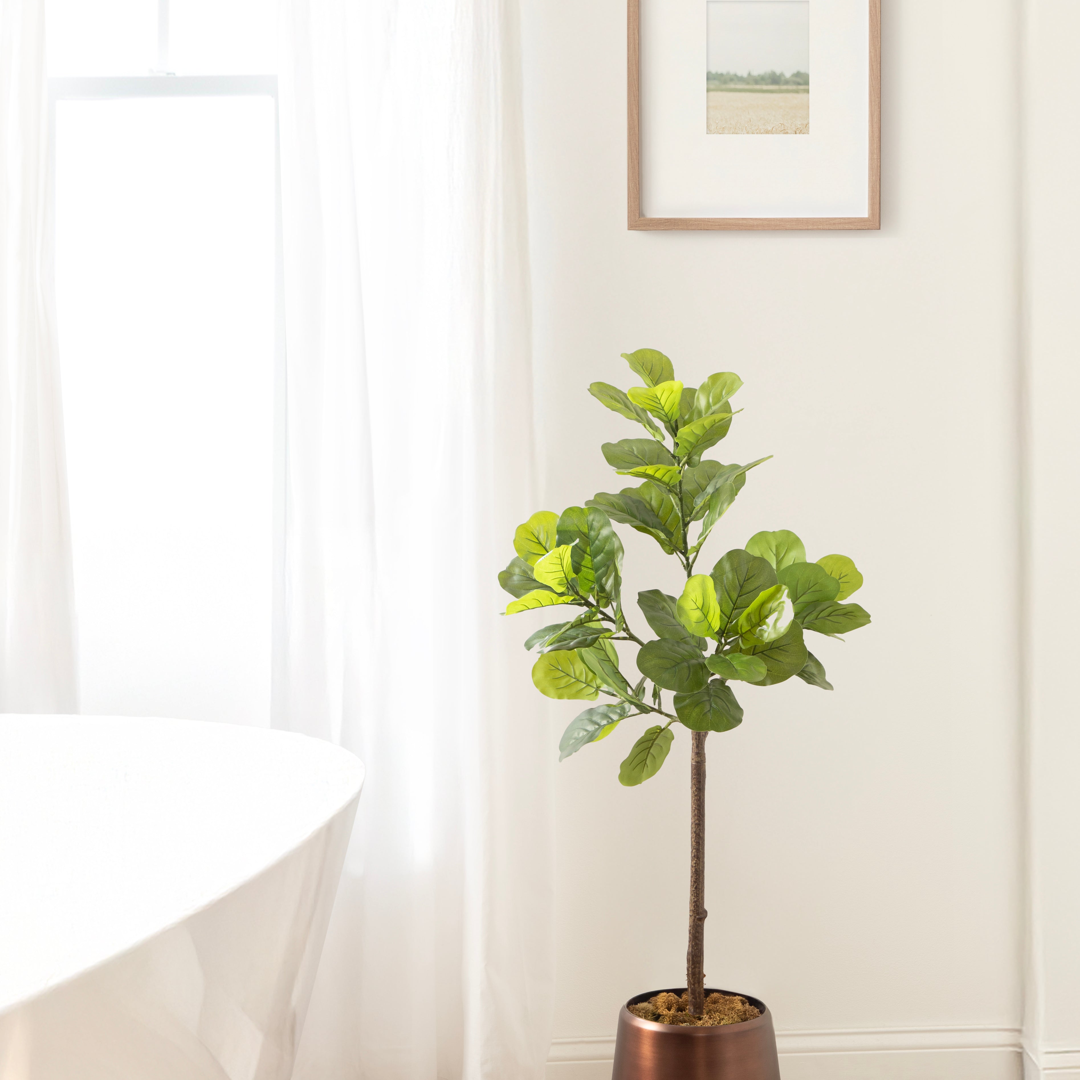 Bring natural beauty into your home—without the upkeep—with the Kate and Laurel Fidmont faux fiddle fig tree. Its broad, leathery green fiddle fig leaves are carefully crafted for a detailed, realistic tree appearance, arranged along slender, flexible branches to mimic the real thing. Whether you're looking to add texture to your living room, brighten up an office corner, or introduce a calming touch to your bedroom, this faux tree delivers elevated style without demanding sunlight or watering. Housed in a black nursery pot, the Fidmont faux tree comes pre-potted and ready to display after easily and quickly inserting the branches into the base. The sturdy nursery pot ensures stability while offering the flexibility to place it in a decorative basket or planter of your choice for a personalized touch. To enhance its realistic look, the tree comes with a bag of decorative moss to help fill your planter pot of choice. Unlike live plants, the Fidmont requires zero maintenance. Perfect for plant lovers who lack a green thumb or anyone who appreciates the serene beauty of indoor foliage.