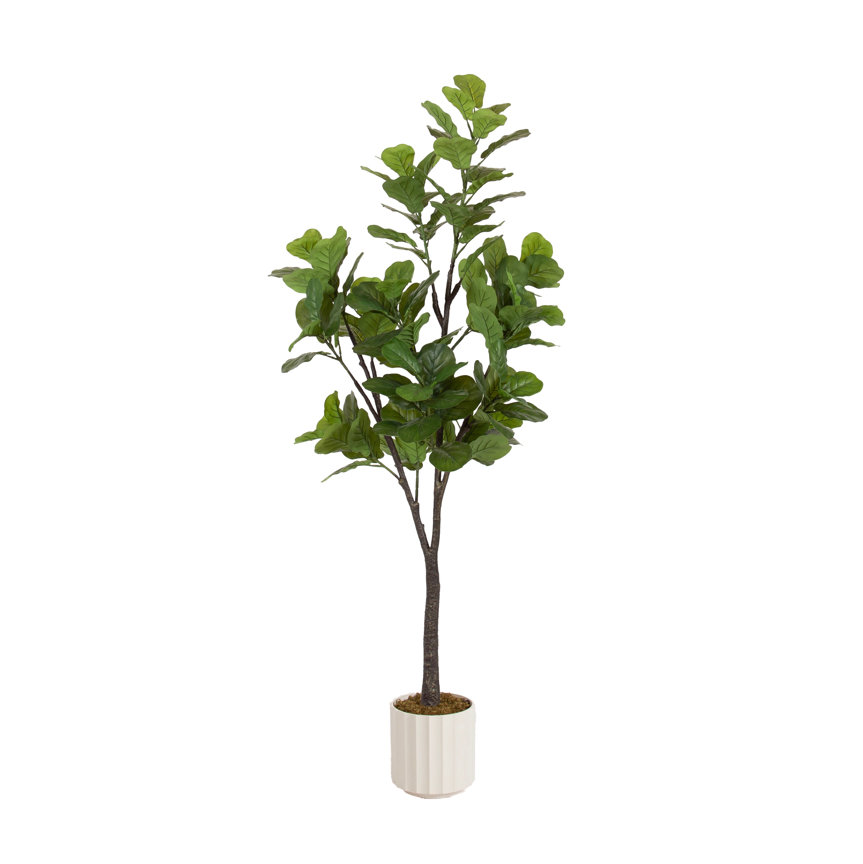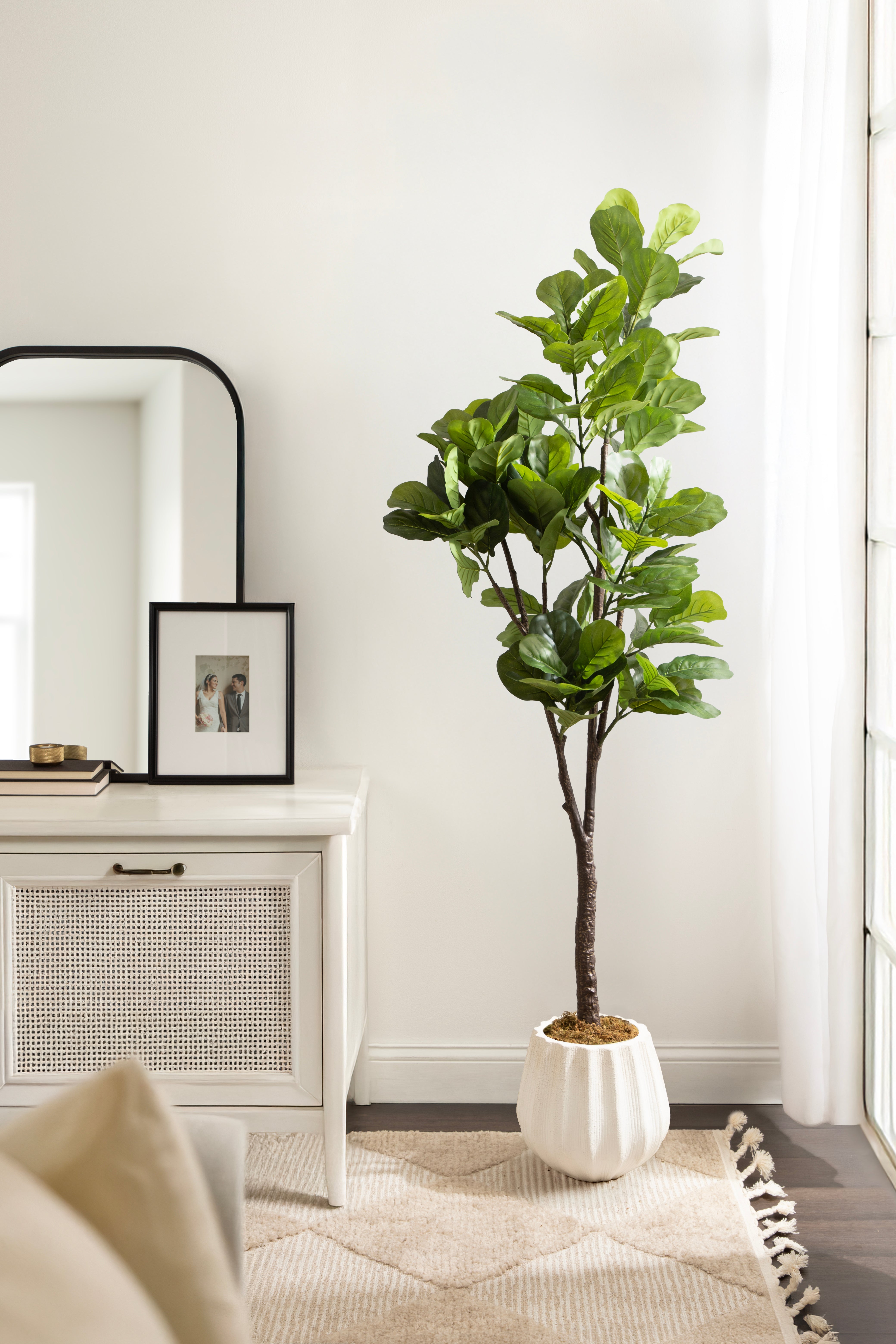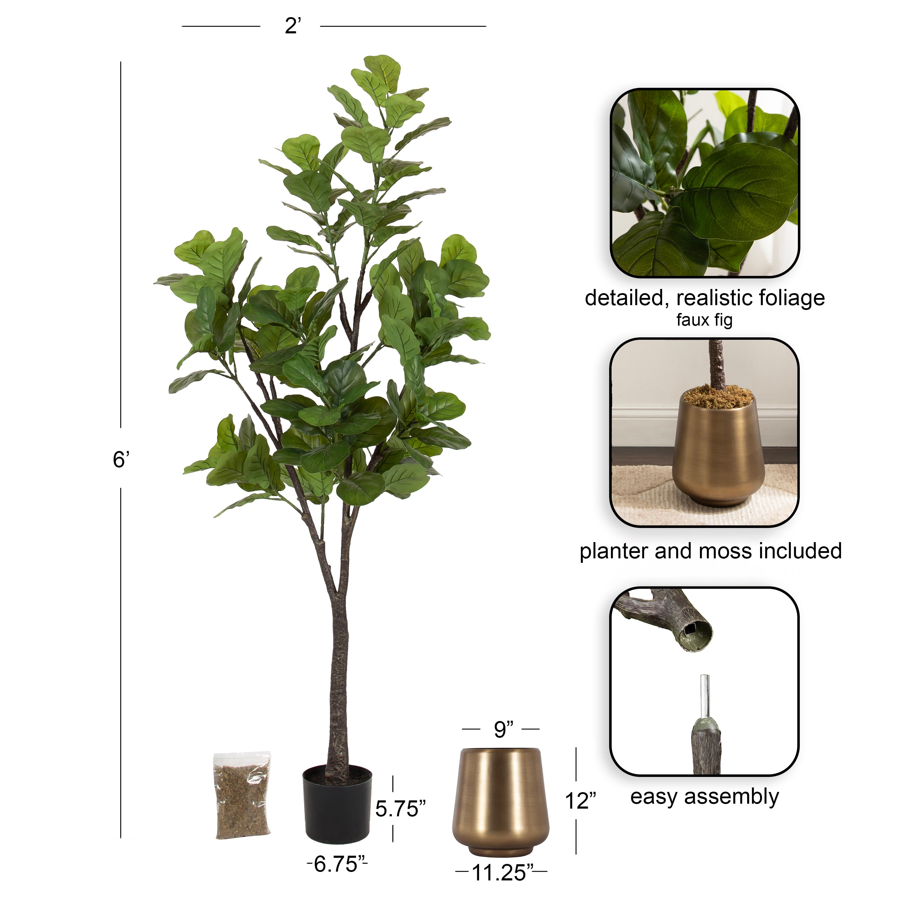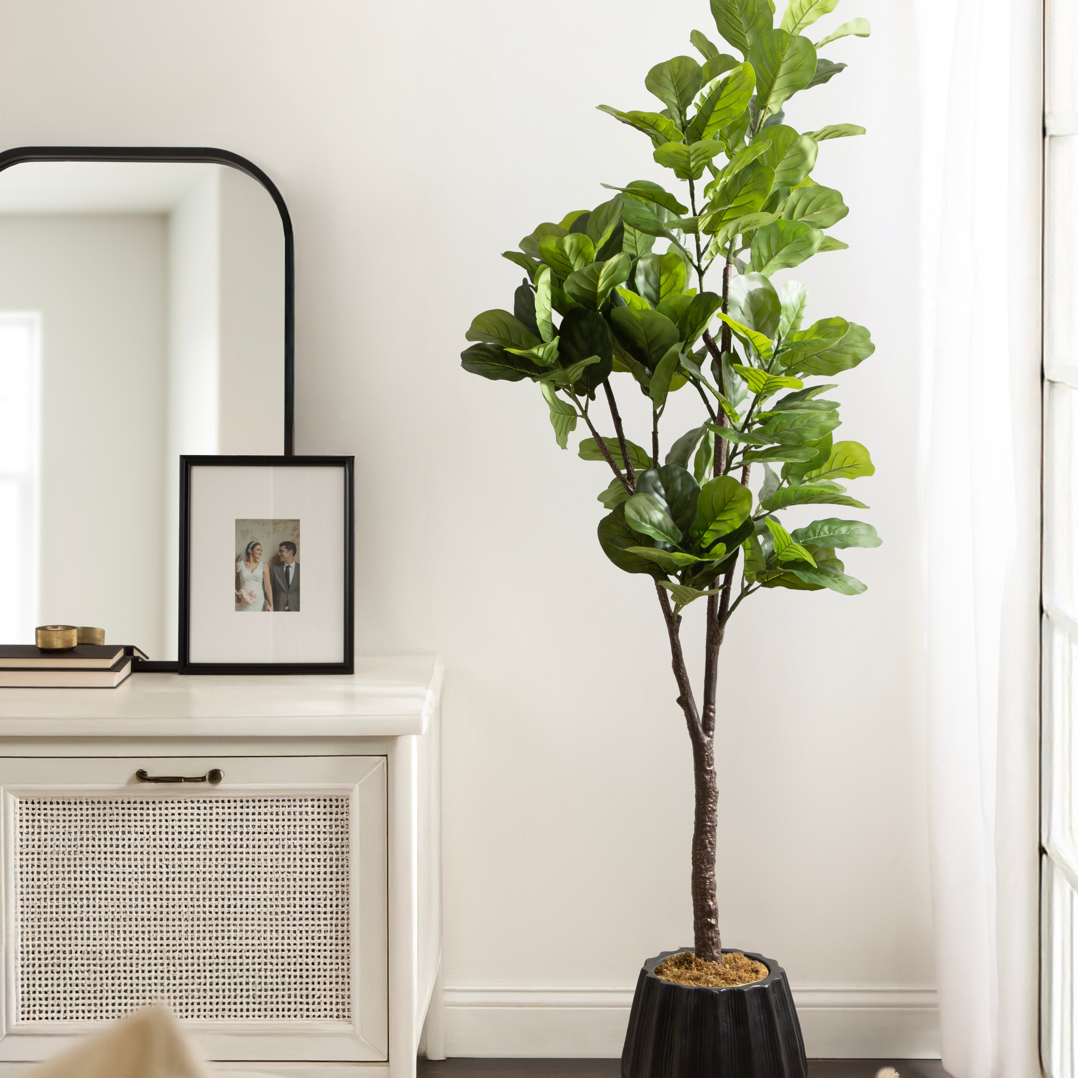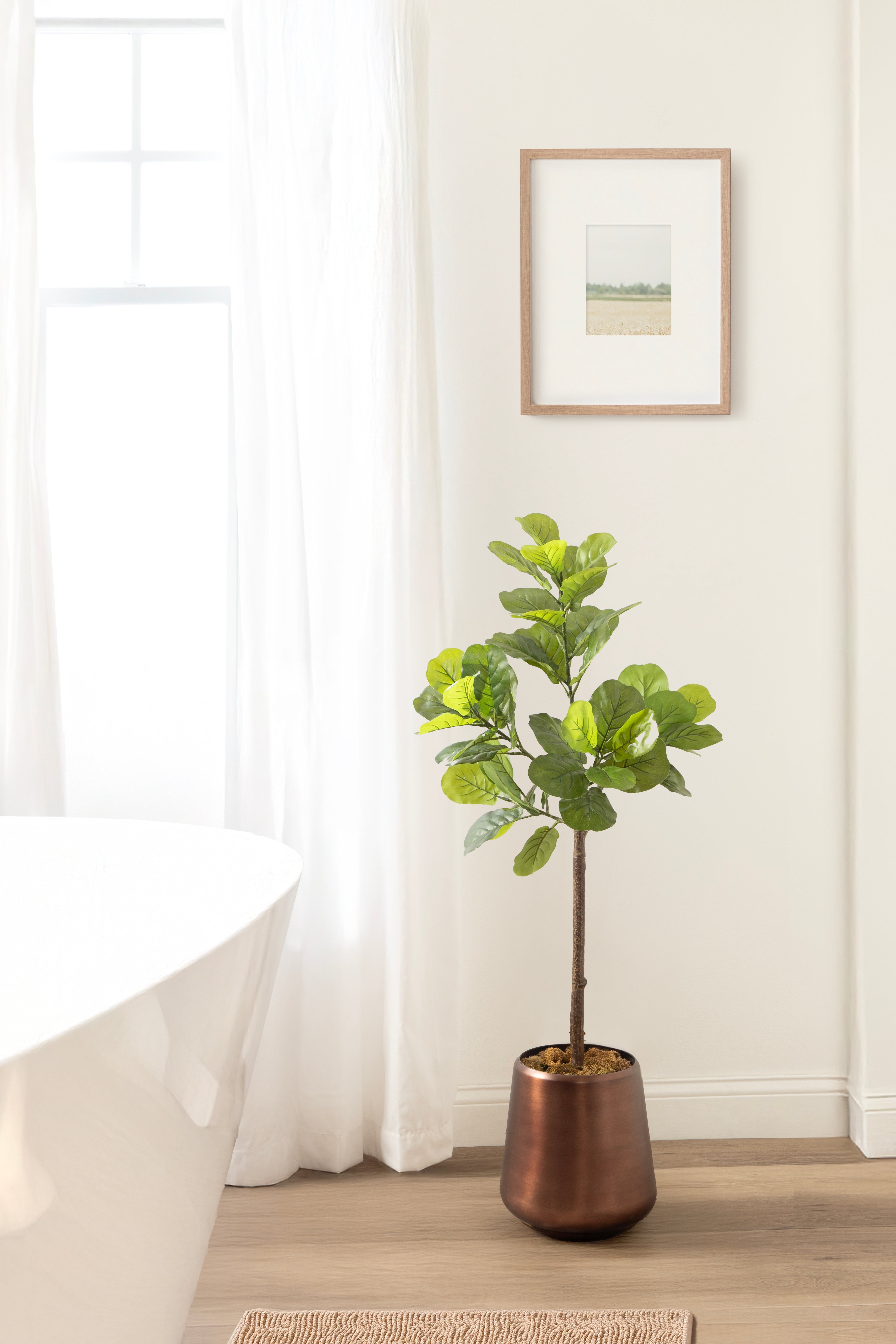 Bring natural beauty into your home—without the upkeep—with the Kate and Laurel Fidmont faux fiddle fig tree. Its broad, leathery green fiddle fig leaves are carefully crafted for a detailed, realistic tree appearance, arranged along slender, flexible branches to mimic the real thing. Whether you're looking to add texture to your living room, brighten up an office corner, or introduce a calming touch to your bedroom, this faux tree delivers elevated style without demanding sunlight or watering. Housed in a black nursery pot, the Fidmont faux tree comes pre-potted and ready to display after easily and quickly inserting the branches into the base. The sturdy nursery pot ensures stability while offering the flexibility to place it in a decorative basket or planter of your choice for a personalized touch. To enhance its realistic look, the tree comes with a bag of decorative moss to help fill your planter pot of choice. Unlike live plants, the Fidmont requires zero maintenance. Perfect for plant lovers who lack a green thumb or anyone who appreciates the serene beauty of indoor foliage.