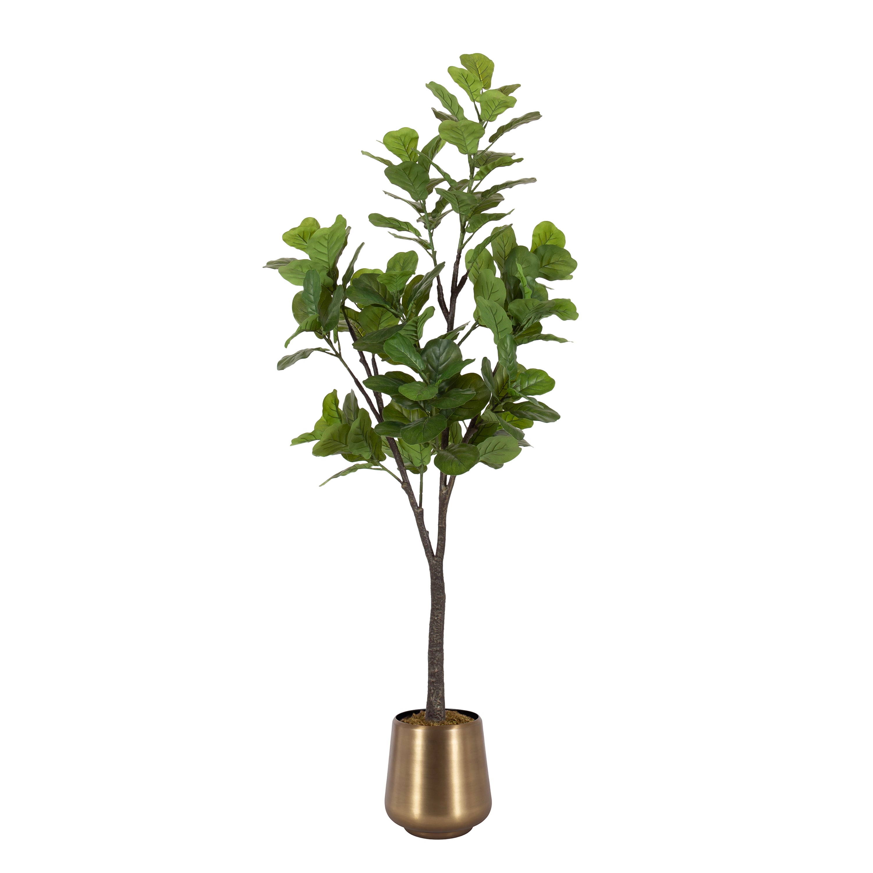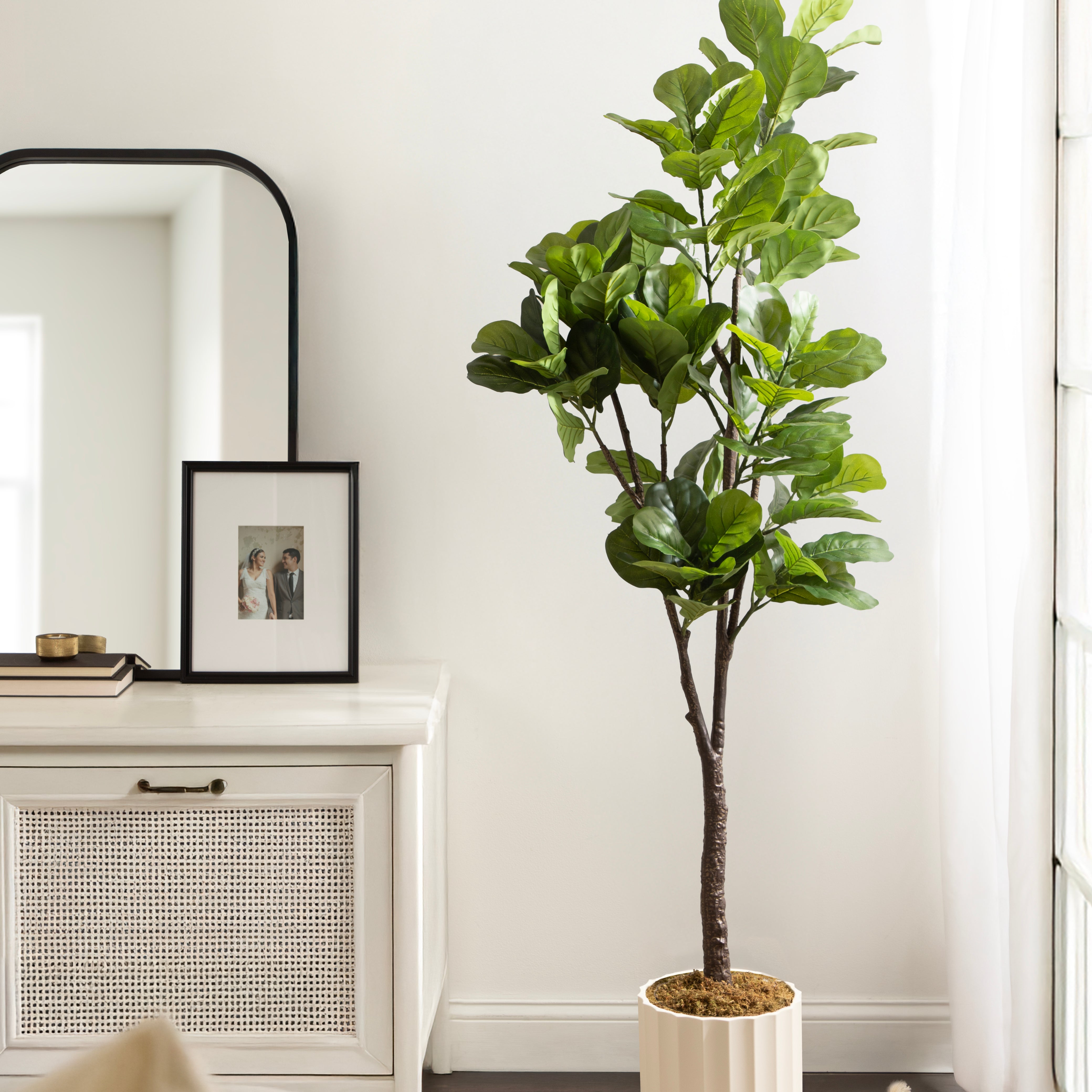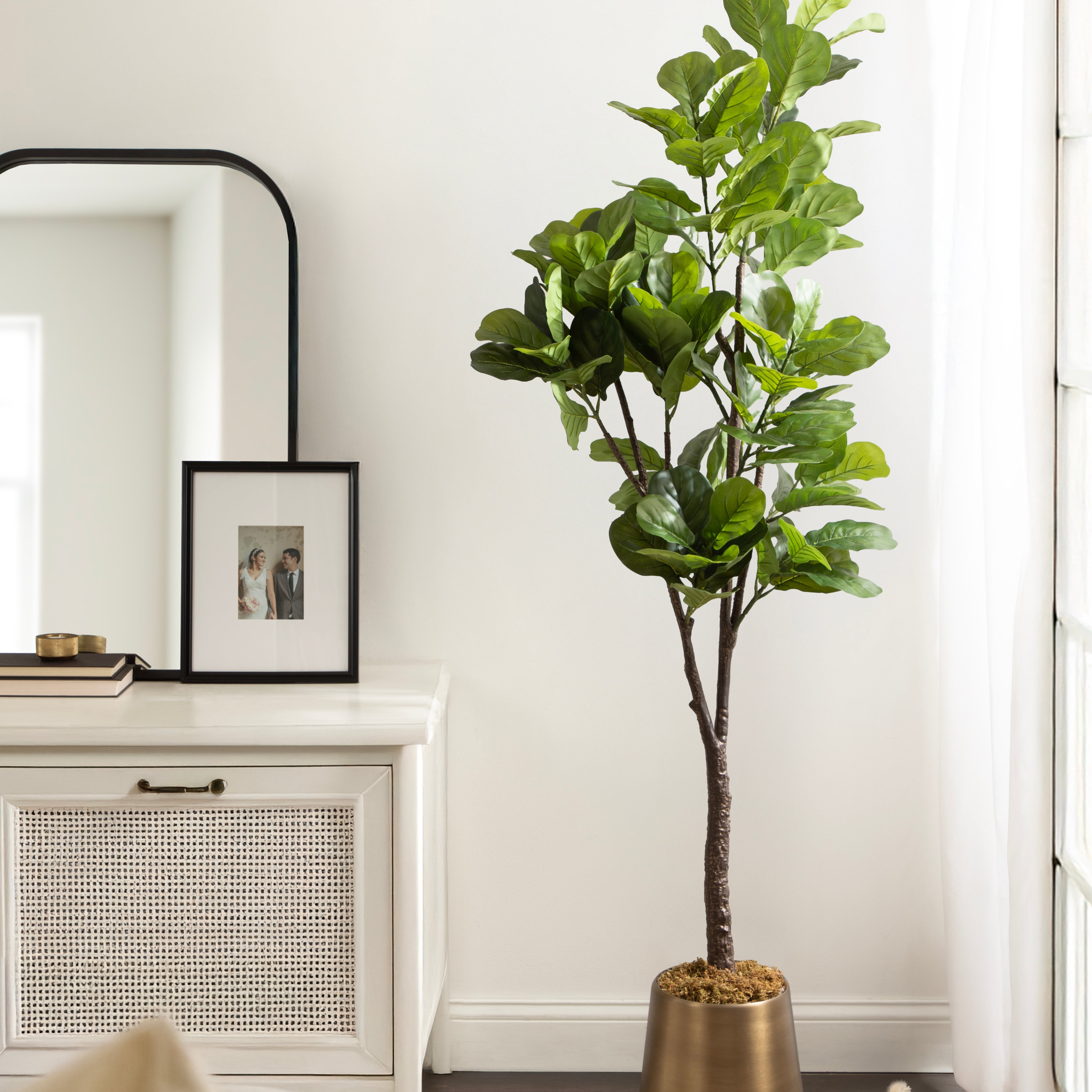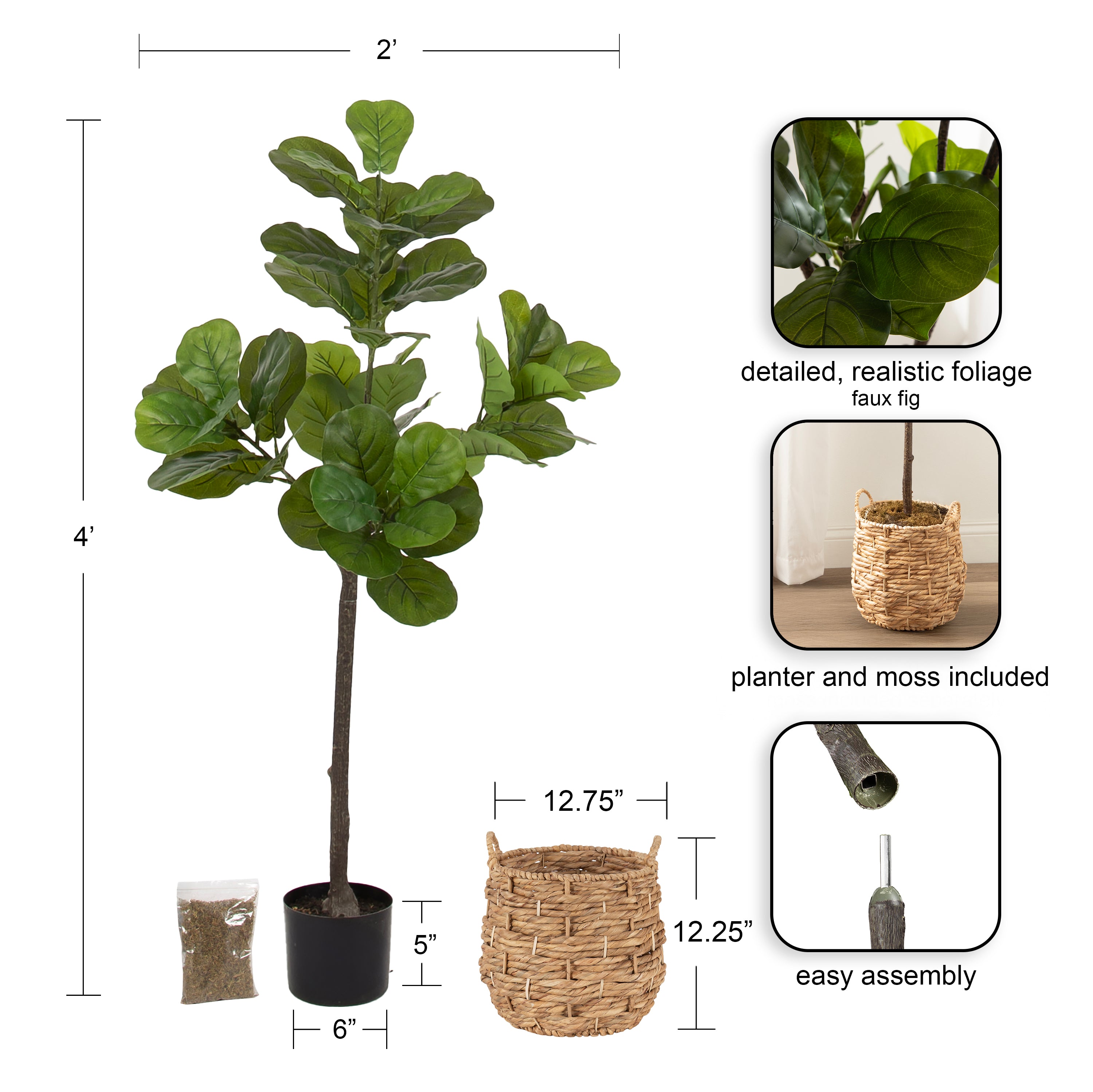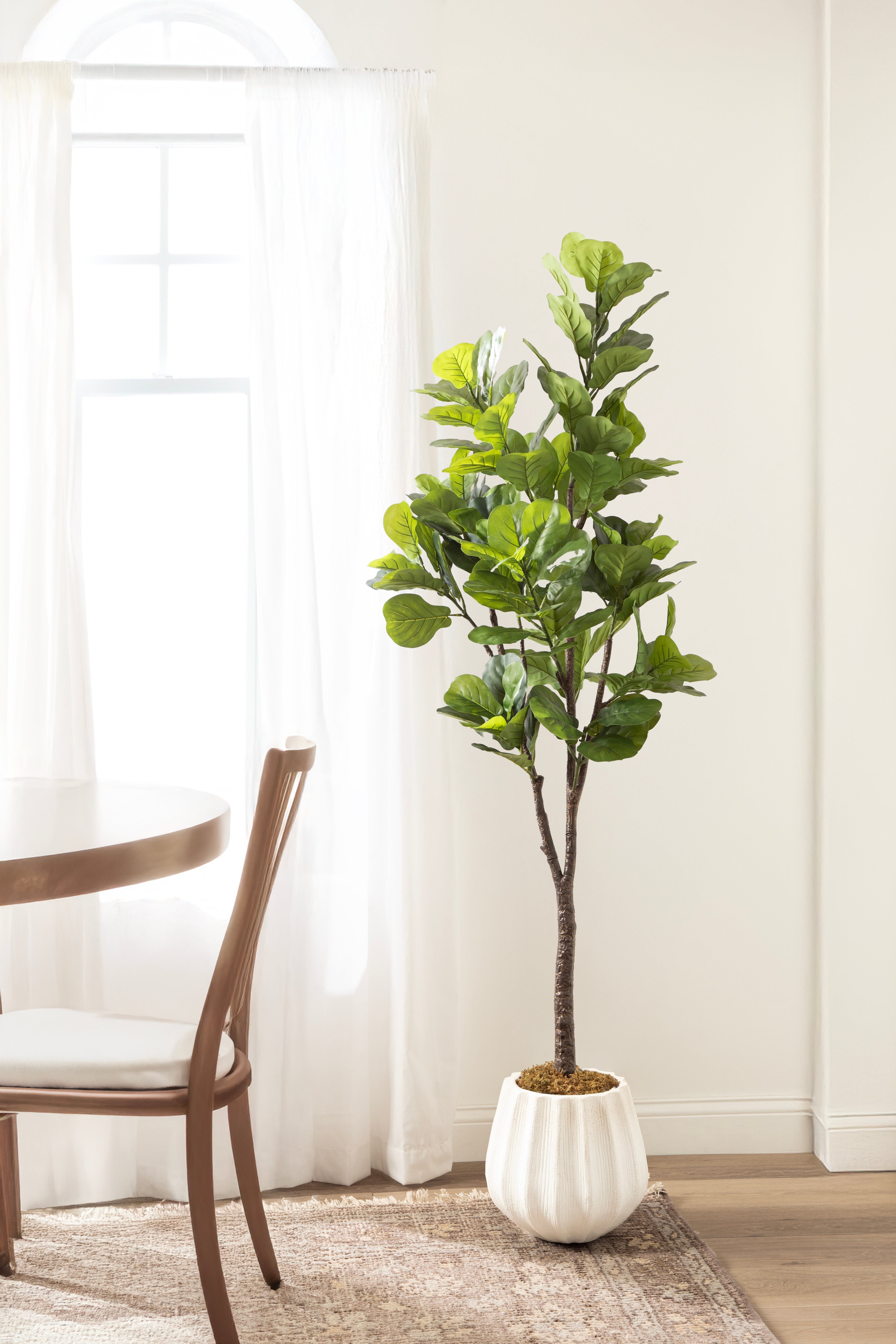 Bring natural beauty into your home—without the upkeep—with the Kate and Laurel Fidmont faux fiddle fig tree. Its broad, leathery green fiddle fig leaves are carefully crafted for a detailed, realistic tree appearance, arranged along slender, flexible branches to mimic the real thing. Whether you're looking to add texture to your living room, brighten up an office corner, or introduce a calming touch to your bedroom, this faux tree delivers elevated style without demanding sunlight or watering. Housed in a black nursery pot, the Fidmont faux tree comes pre-potted and ready to display after easily and quickly inserting the branches into the base. The sturdy nursery pot ensures stability while offering the flexibility to place it in a decorative basket or planter of your choice for a personalized touch. To enhance its realistic look, the tree comes with a bag of decorative moss to help fill your planter pot of choice. Unlike live plants, the Fidmont requires zero maintenance. Perfect for plant lovers who lack a green thumb or anyone who appreciates the serene beauty of indoor foliage.