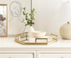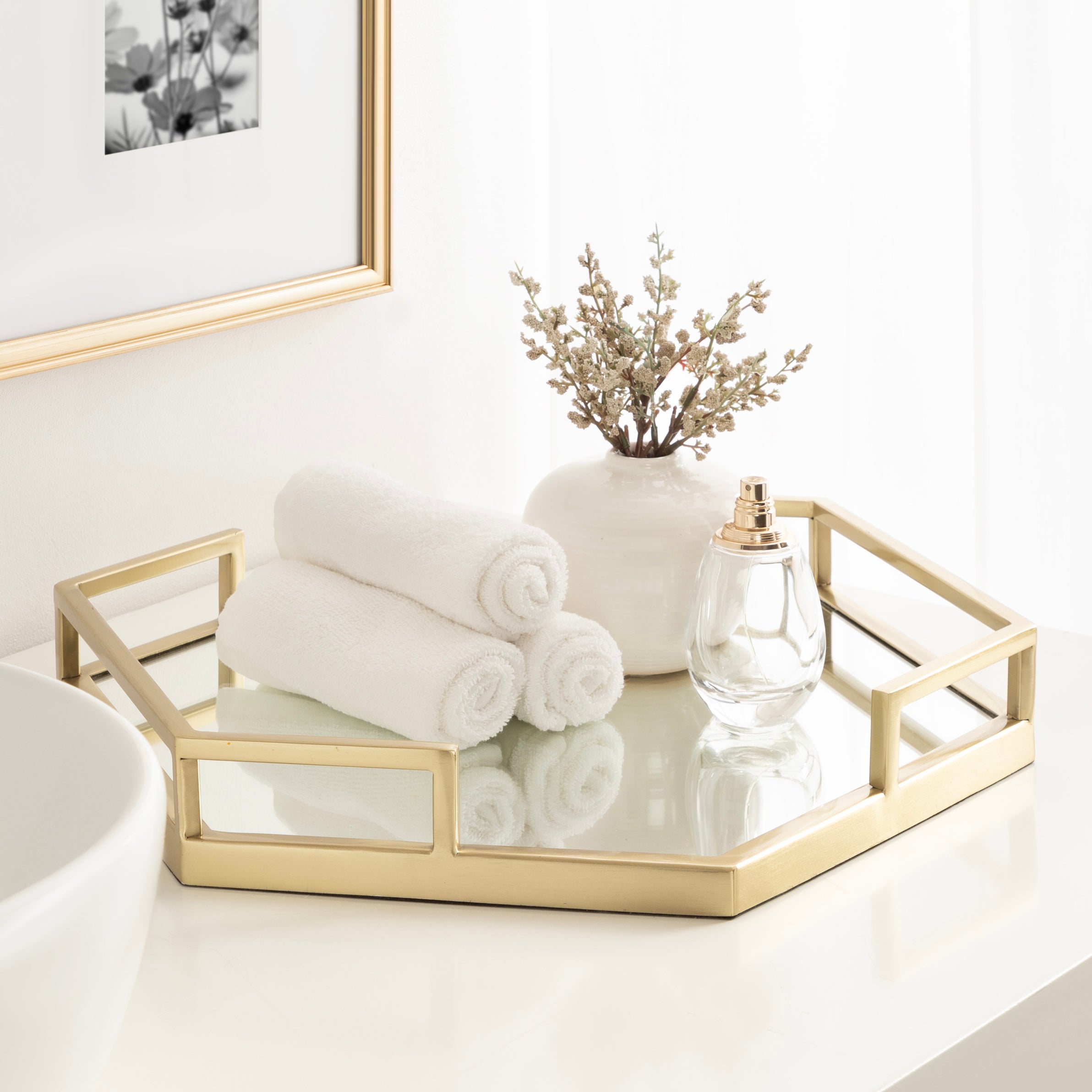 Bring contemporary glam style into your home with this charming hexagon accent tray with metal handles. Place this geometric mirrored tray on your entrance console table as a catchall tray to hold your keys and change as you come and go. This glam tray can also be used as a decorative accent on an ottoman to hold your beverages or on your vanity for makeup organization. The tray has a soft felt bottom to protect your hard surfaces from scuffs. An update to the classic accent tray, the base has substantial handles that help to keep your items more secure when transporting them. From a dining room table to a living room ottoman, this geometric tray brings tremendous versatility anywhere throughout your home. Its skinny size makes it great for serving snacks on little plates or as a decorative display option.