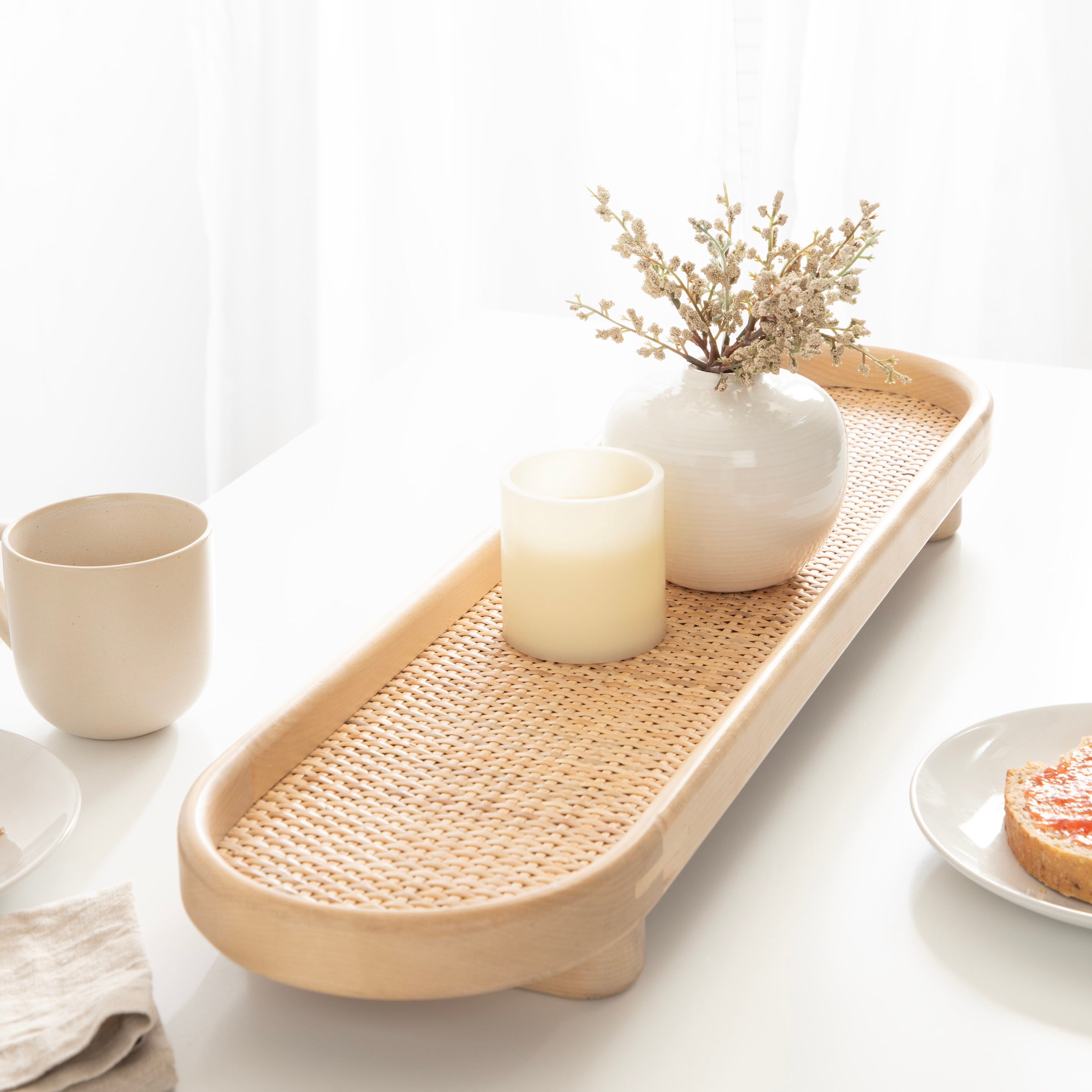 Bring modern transitional style into your home with this charming narrow accent tray with a raised edge. Place this charming tray on your entrance console table as a trinket tray to hold your keys and change as you come and go. This rectangular tray can also be used as a decorative accent on an ottoman to hold your beverages or on your vanity for makeup organization. Constructed of solid birch wood and woven rattan, this tray is dependable to carry your cocktails from room to room! An update to the classic accent tray, the base has a raised edge to keep your items more secure when transporting them.