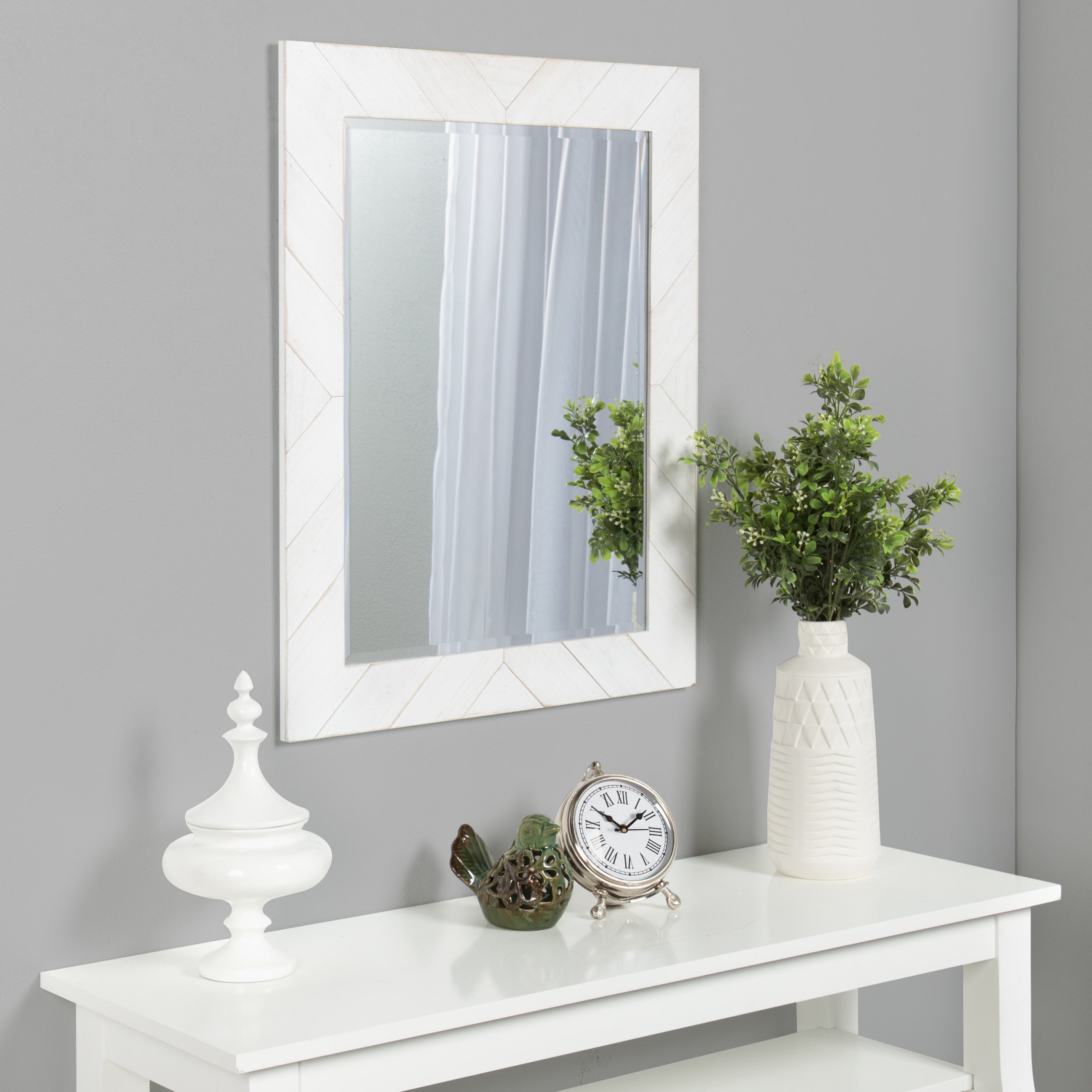 The rustic decorative style of the Rost wall mirror is an update on the traditional wood-framed accent mirror. The robust pieced wood frame surrounds a sizeable beveled mirror that will look fantastic displayed in an entryway, over the sofa, bedroom or as a bathroom vanity.