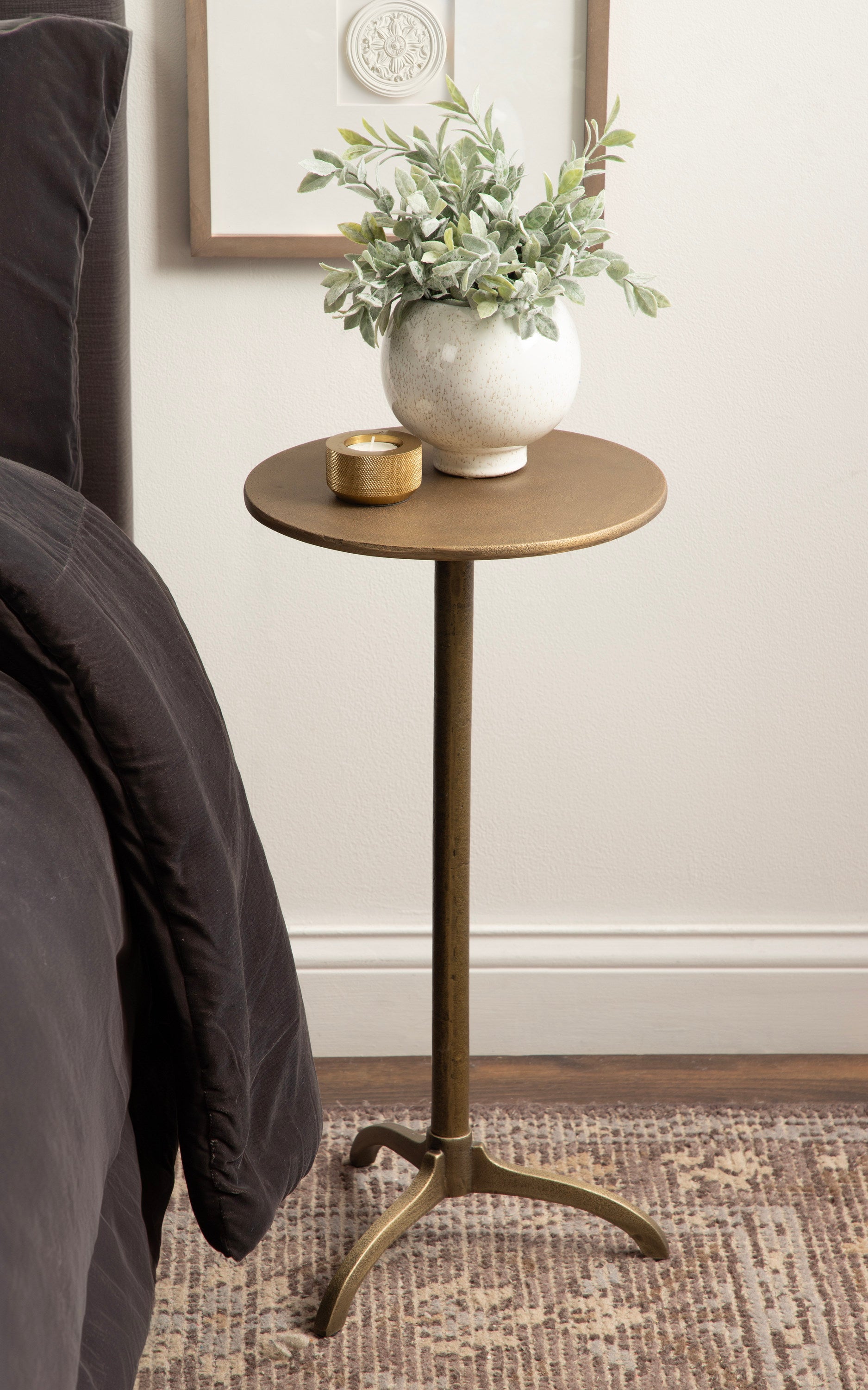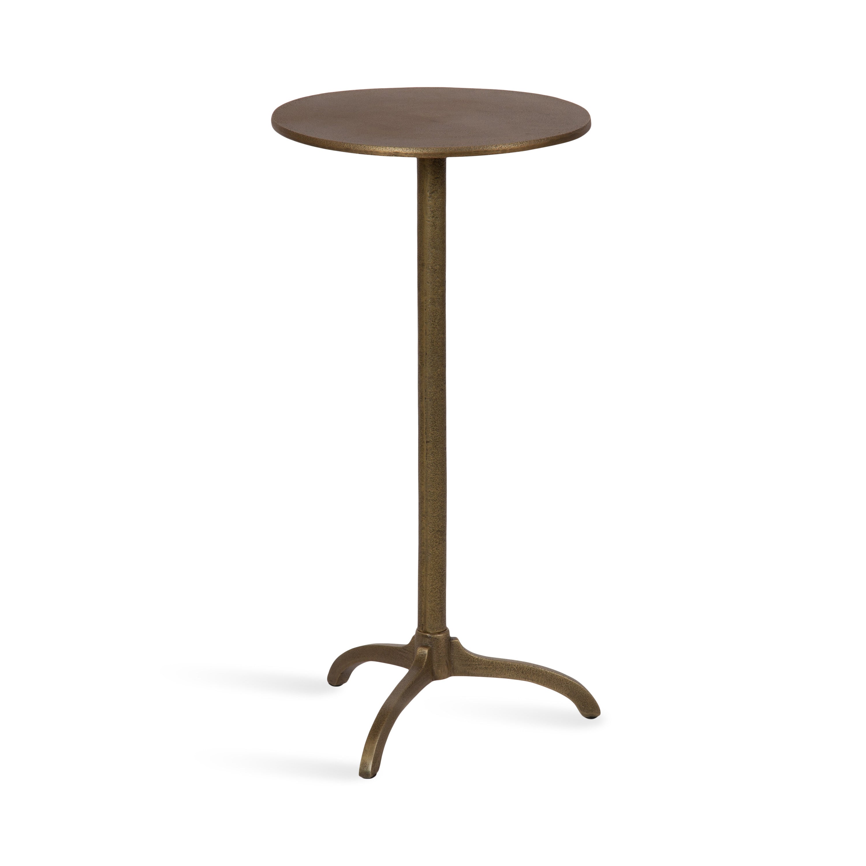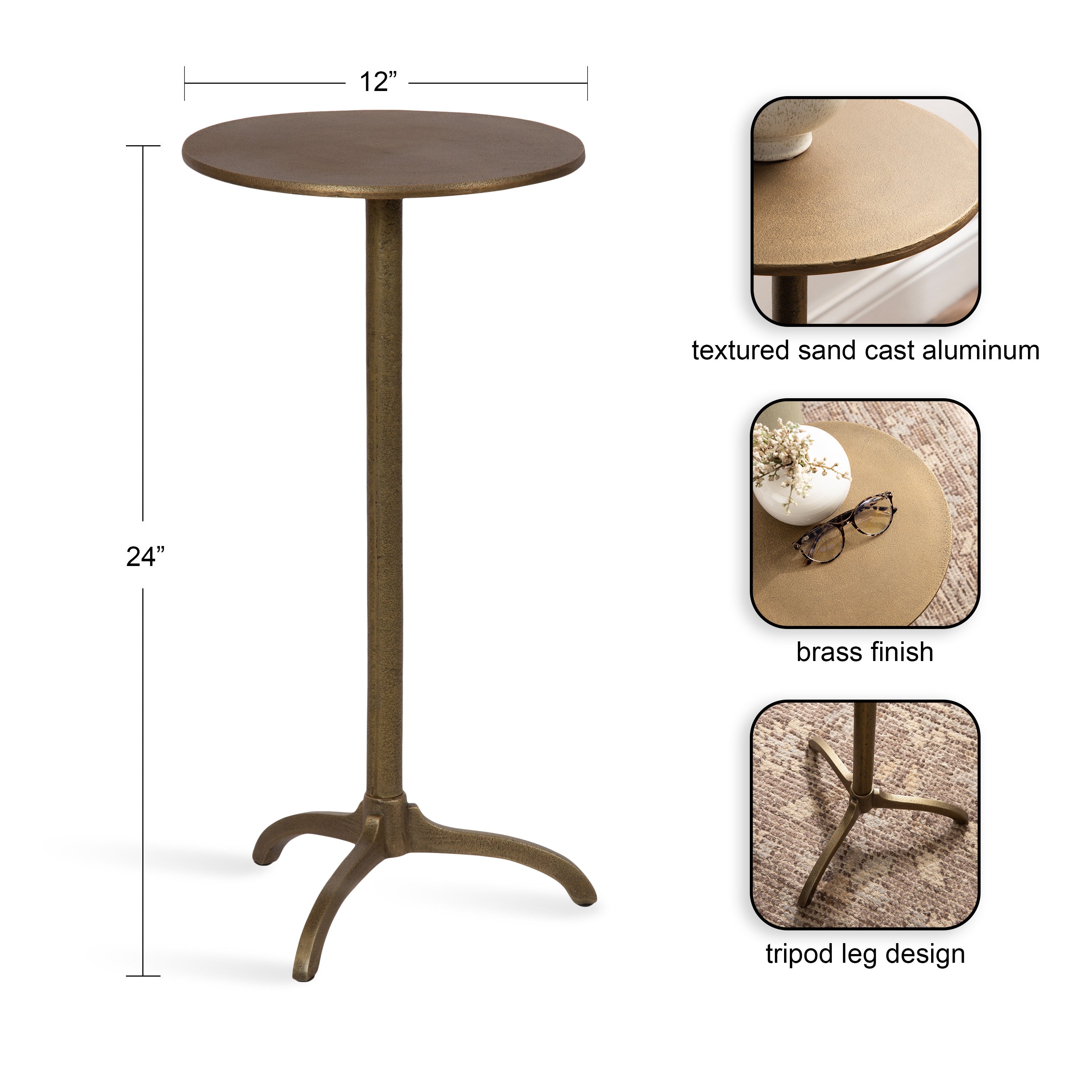 Add a much-needed metallic accent to your living space with the textured simplicity of this Henshall side table. Designed with versatility in mind, this table allows for direct functionality with a coaster and a drink, or use it to display your favorite house plant. Based on unique sculptural table designs, this Henshall end table provides a mid-century aesthetic with smoother, more polished curves along its interesting tripod base. Crafted from authentic sand cast aluminum, this round side table features a distinct texture all throughout its finish. We designed the Henshall to include a tripod base for added stability. The Henshall was crafted as a highly versatile accent table. From a sophisticated drink table option to a lovely plant pedestal table, it is a stunning piece that fits a variety of decor styles.