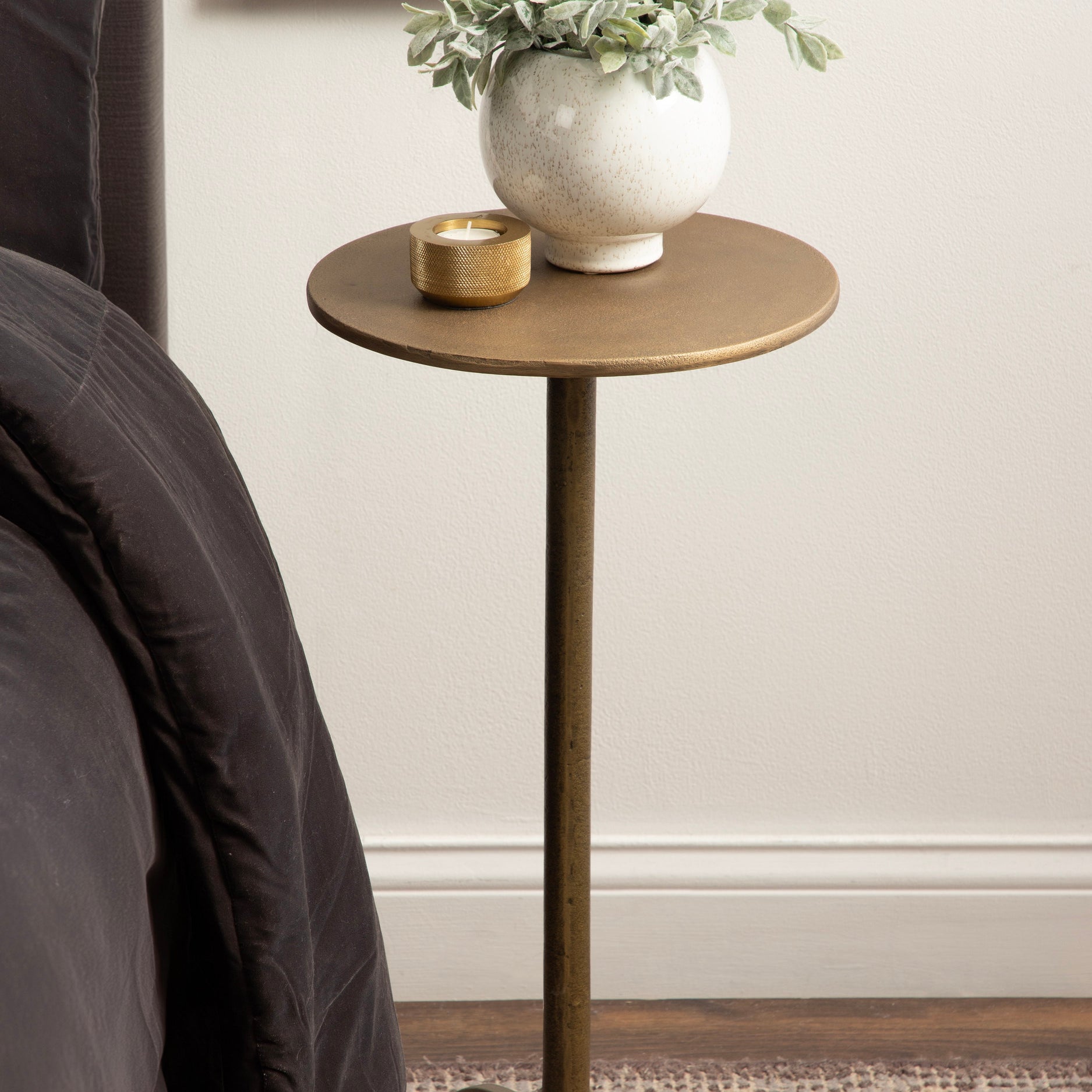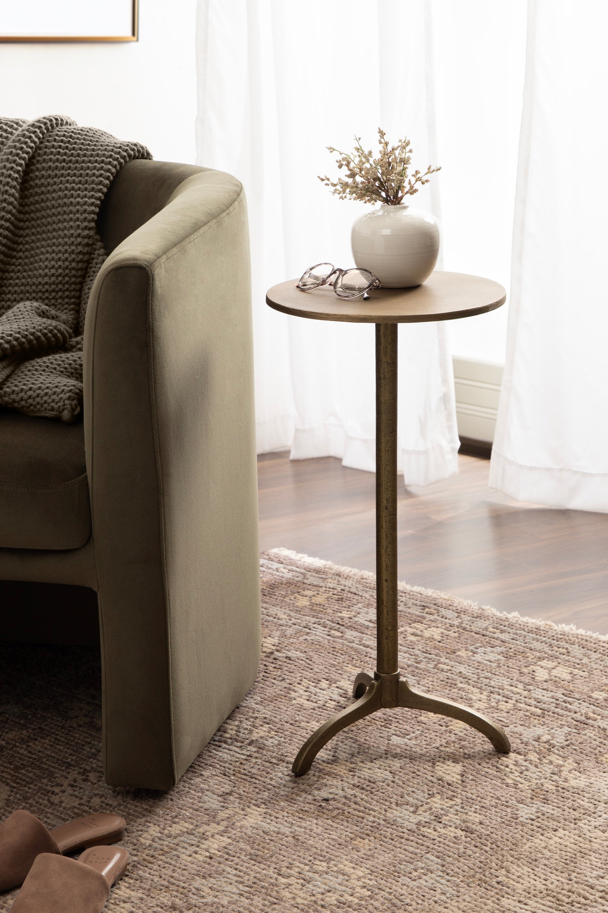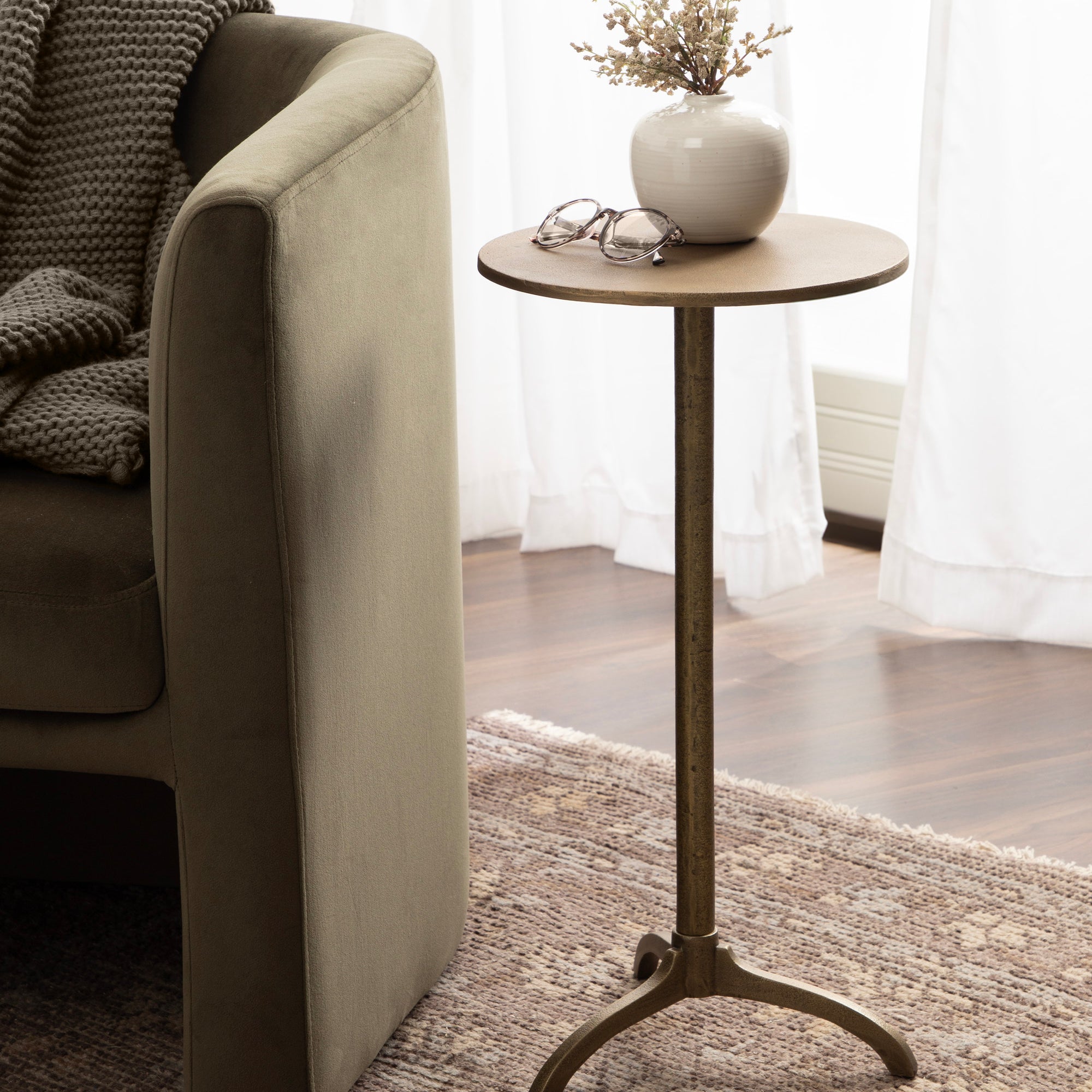 Add a much-needed metallic accent to your living space with the textured simplicity of this Henshall side table. Designed with versatility in mind, this table allows for direct functionality with a coaster and a drink, or use it to display your favorite house plant. Based on unique sculptural table designs, this Henshall end table provides a mid-century aesthetic with smoother, more polished curves along its interesting tripod base. Crafted from authentic sand cast aluminum, this round side table features a distinct texture all throughout its finish. We designed the Henshall to include a tripod base for added stability. The Henshall was crafted as a highly versatile accent table. From a sophisticated drink table option to a lovely plant pedestal table, it is a stunning piece that fits a variety of decor styles.