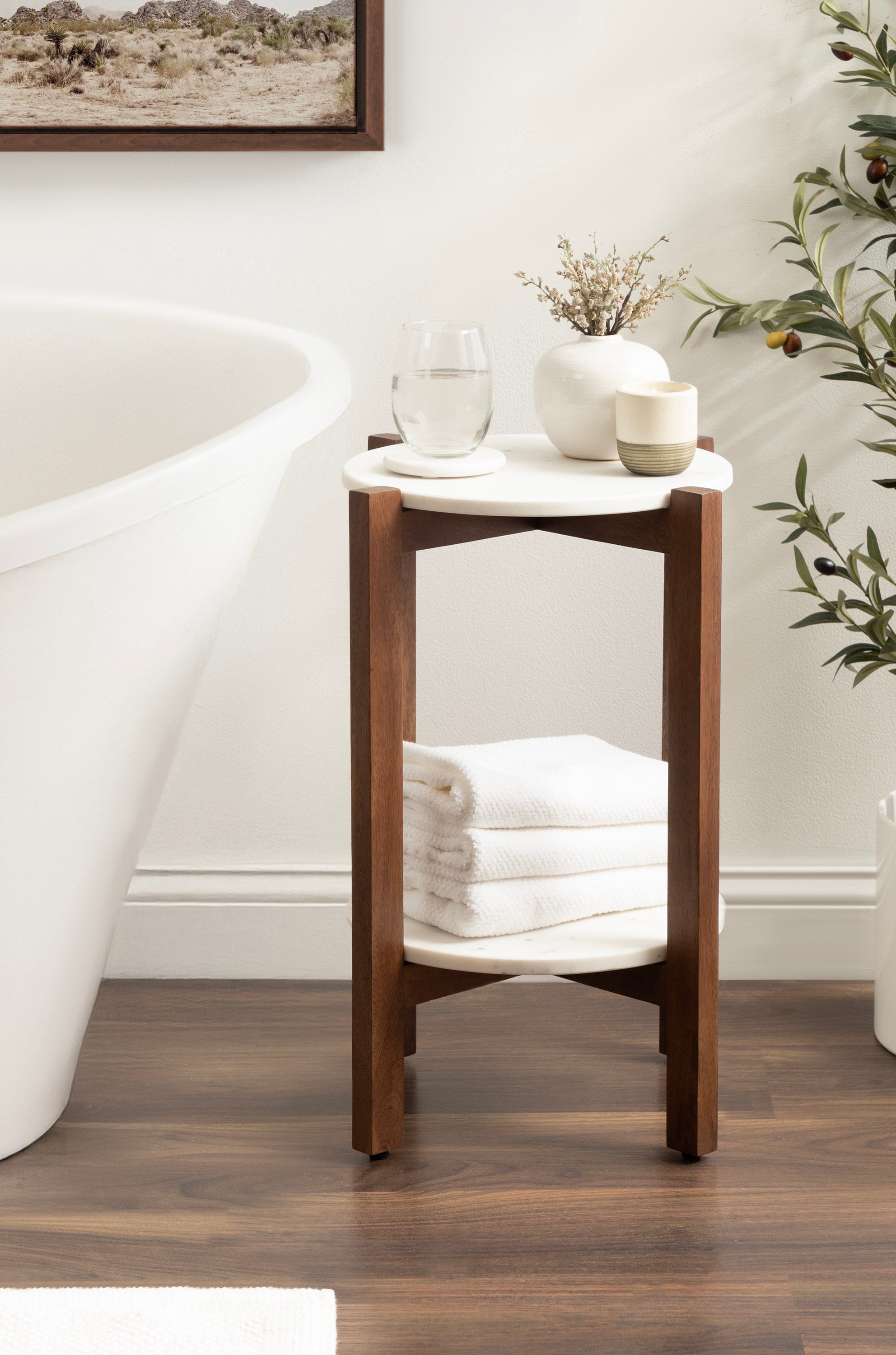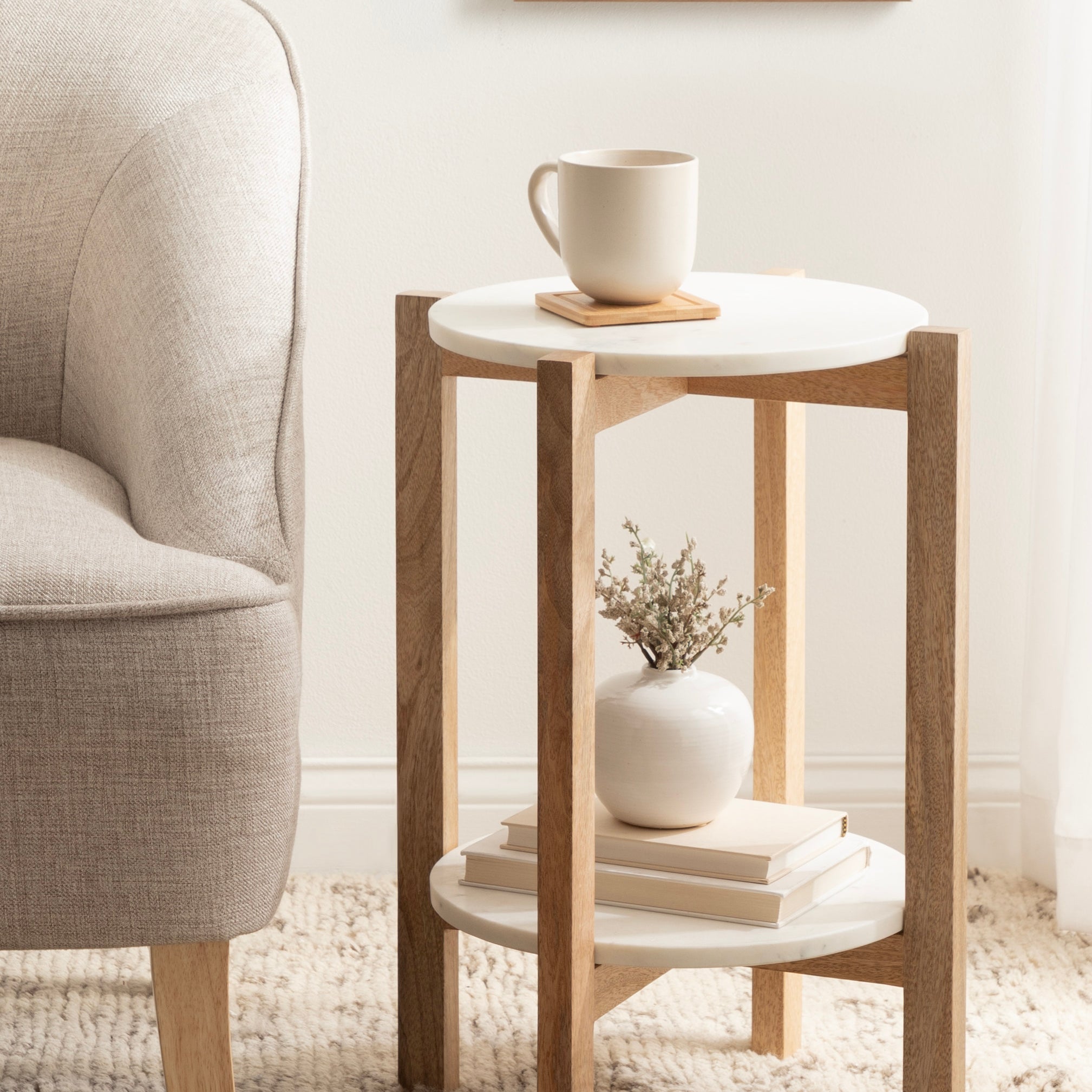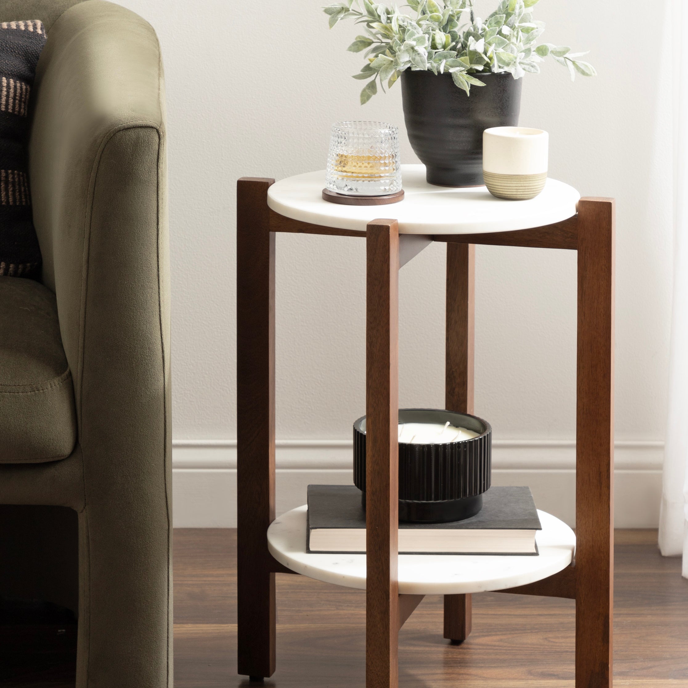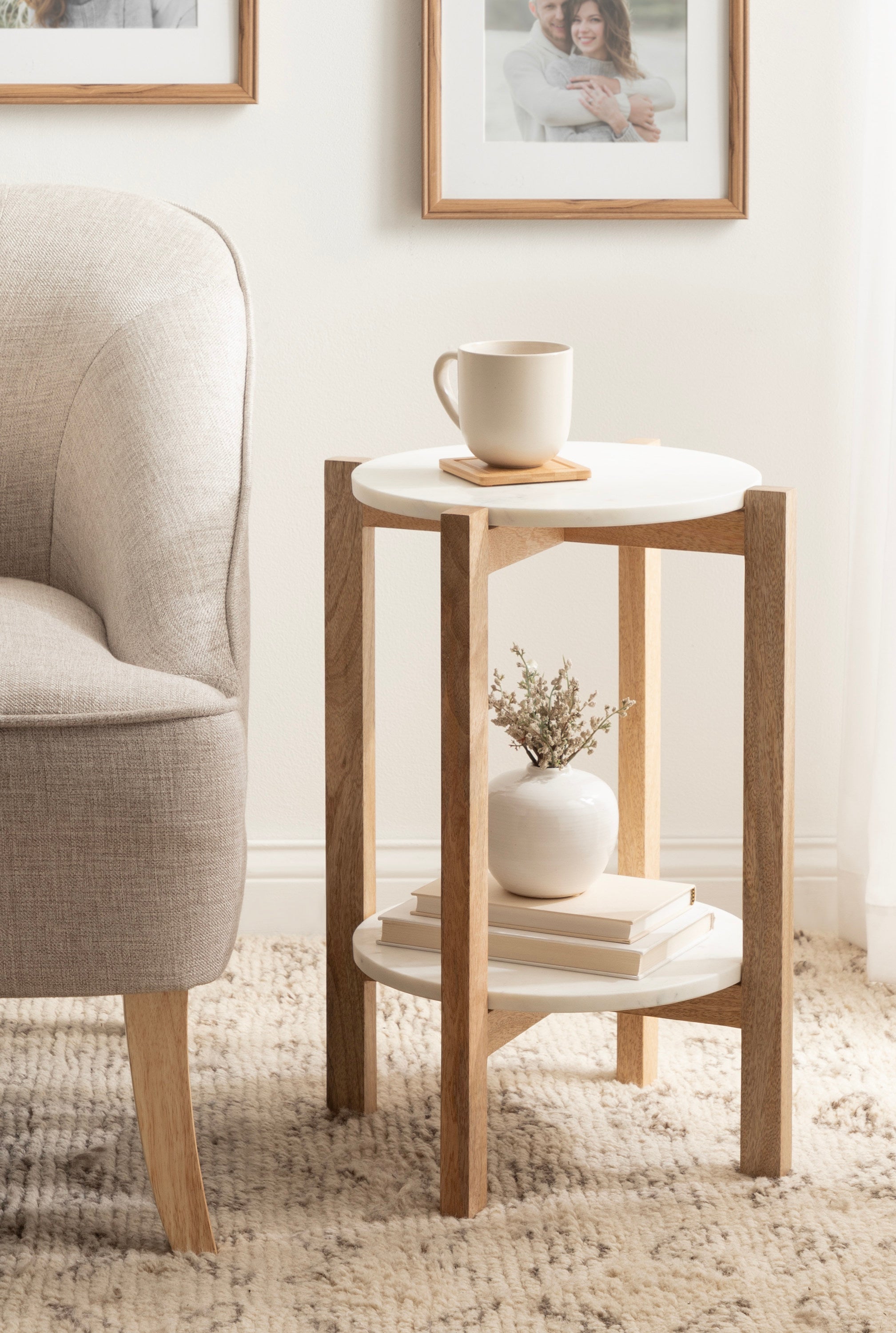 The Moxley is for the transitional modern decorator that craves functionality within their aesthetically-pleasing home. This beautiful side table features two beautiful, authentic marble tabletops for a refined look. Handcrafted in India, each Moxley table contains variations in marble veining, making each piece one-of-a-kind. Use the top tier as a display surface for decorative accents like a drink with coasters, succulents, an alarm clock, or candles while using the lower shelf to store small household items like books and more. Regardless of where and how you use this beautiful side table, you can rest easy knowing your hardwood or tile floors are protected from damage with the rubber pads attached to each foot.