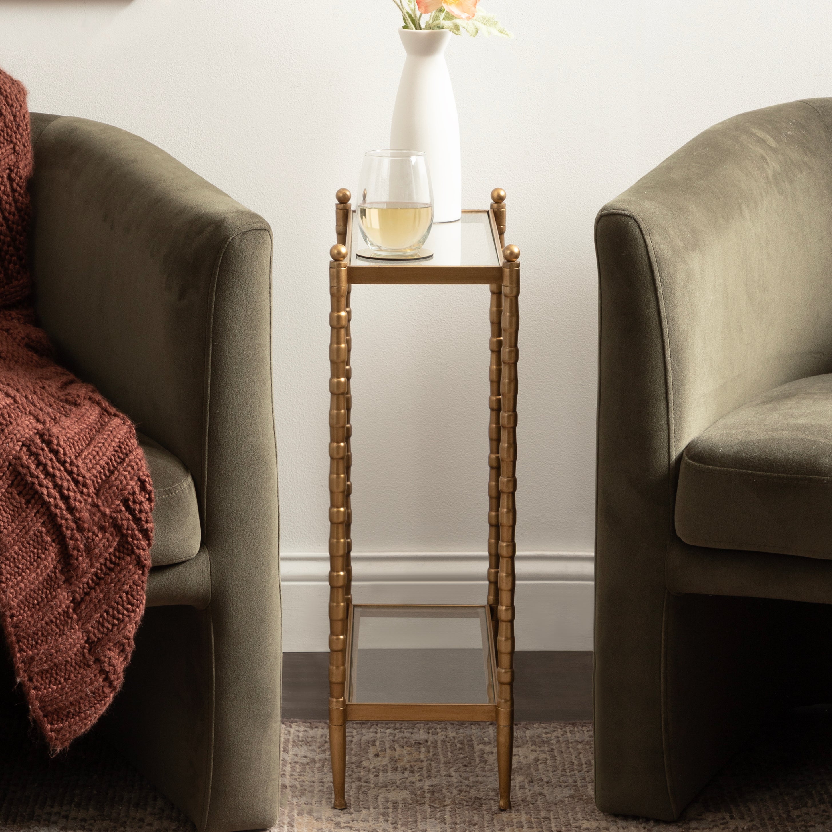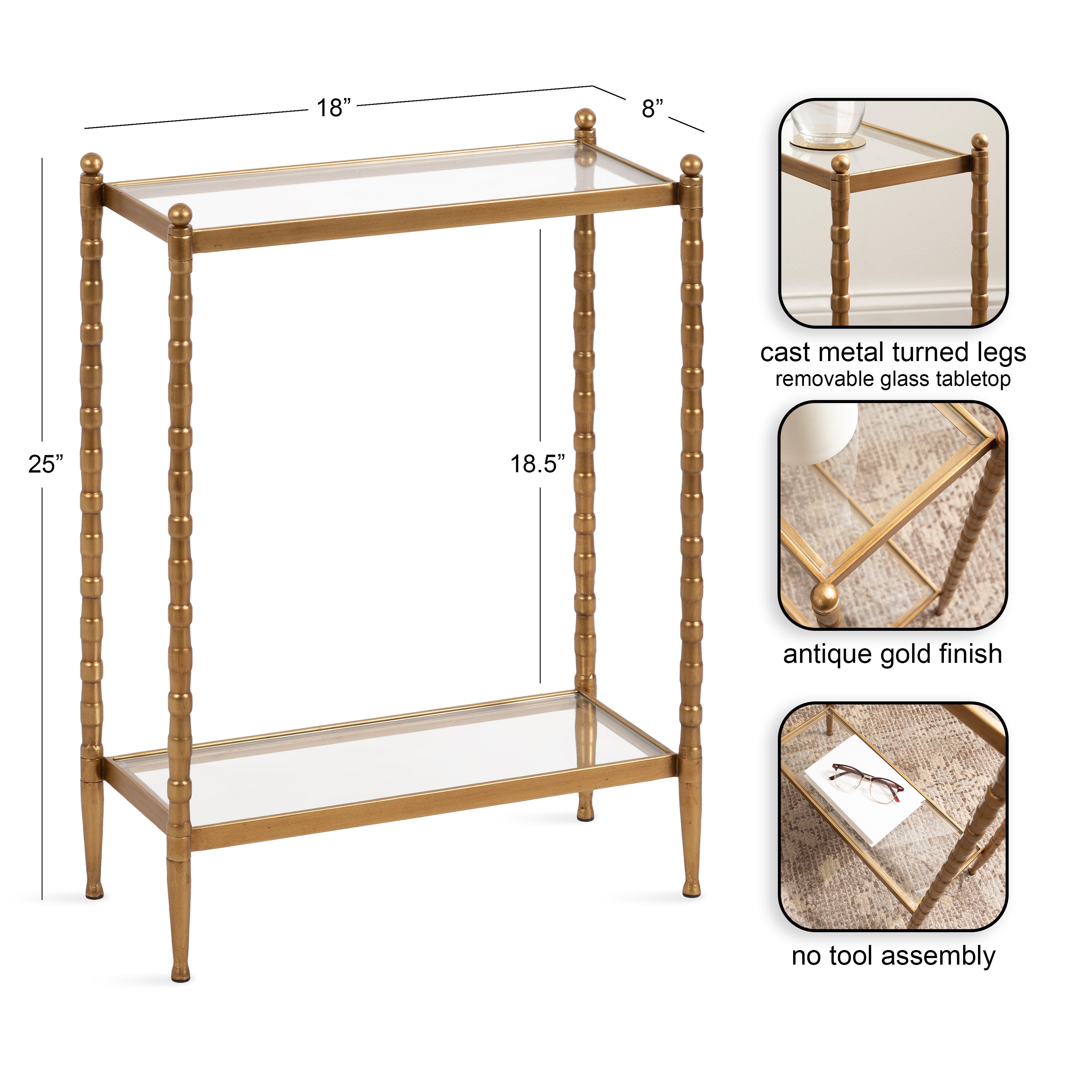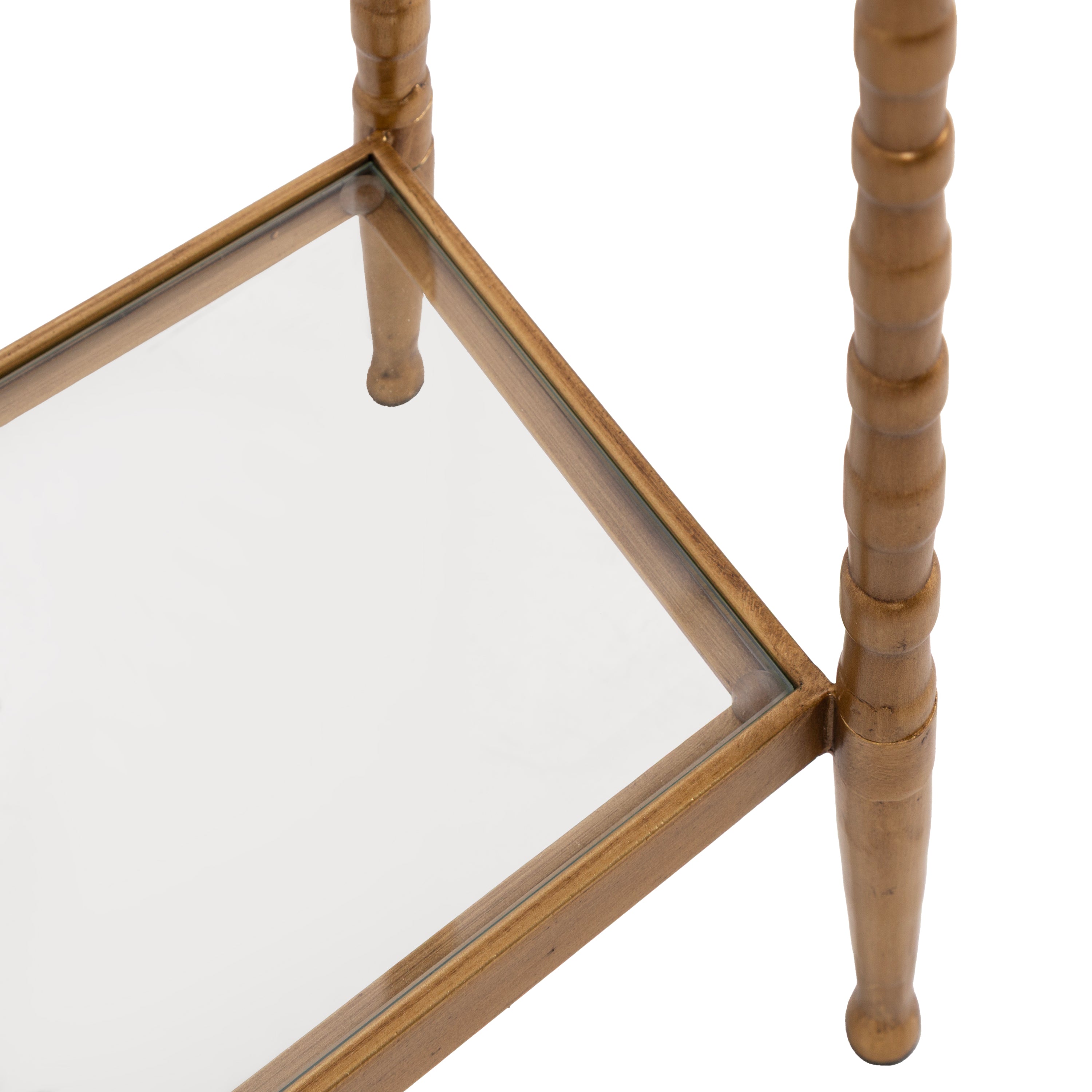 For the interior decorator with a passion for classic design comes our Prisha narrow side table. The Prisha collection features solid iron legs with textured cast metal turnings. The tiered end table boasts tempered glass tabletops, giving the illusion of more space and depth. The tabletops' surface area is a perfect display or storage area for lamps, morning coffee, plants, alarm clocks, or other small items. Use it as a living room table, a slim nightstand in the bedroom, or an accent table near your bathtub. Regardless of where you put it, the Prisha end table makes for a unique statement piece in any area of your modern home. You won't have to work hard to set up this charming table, either; the Prisha side table has a simple, three-step assembly process.