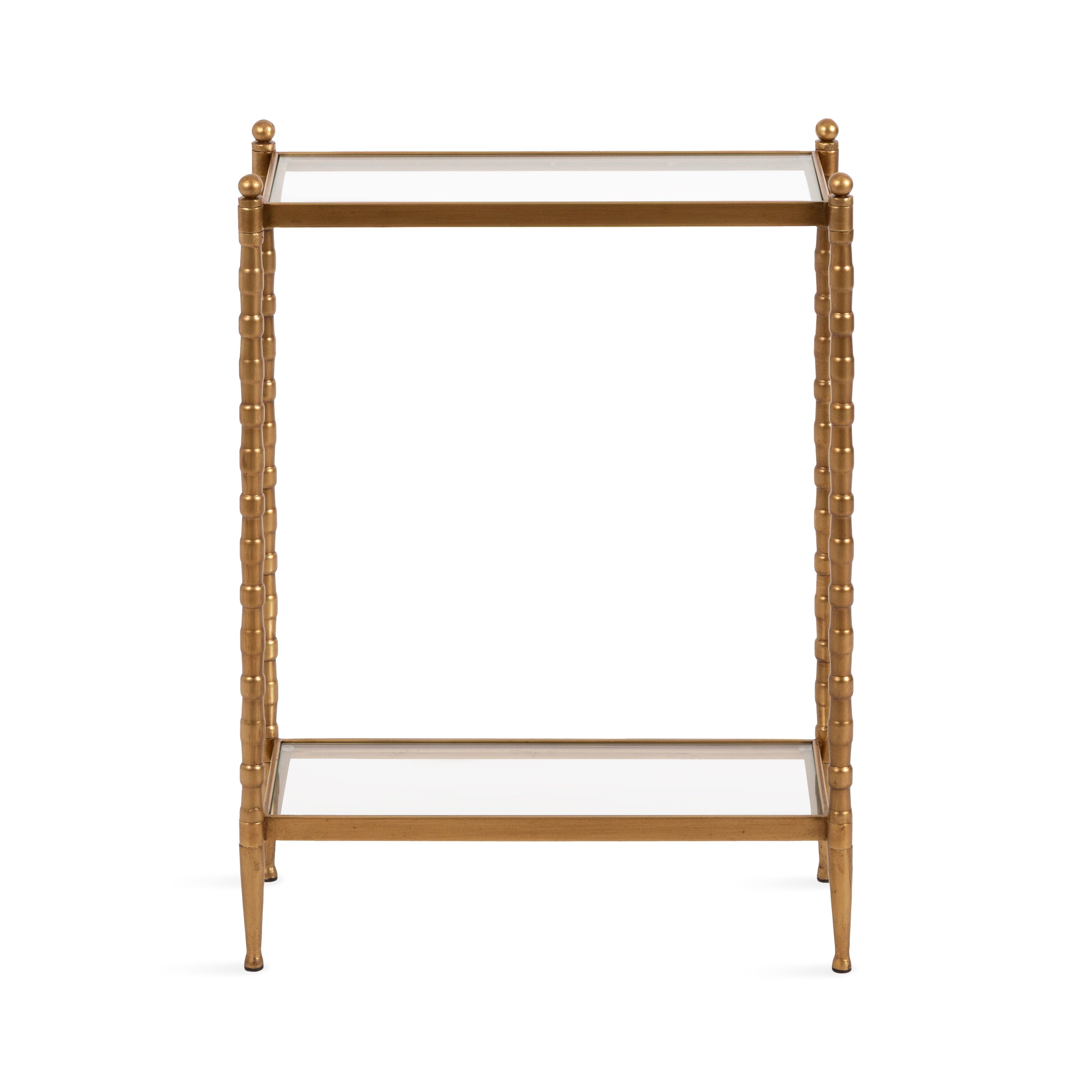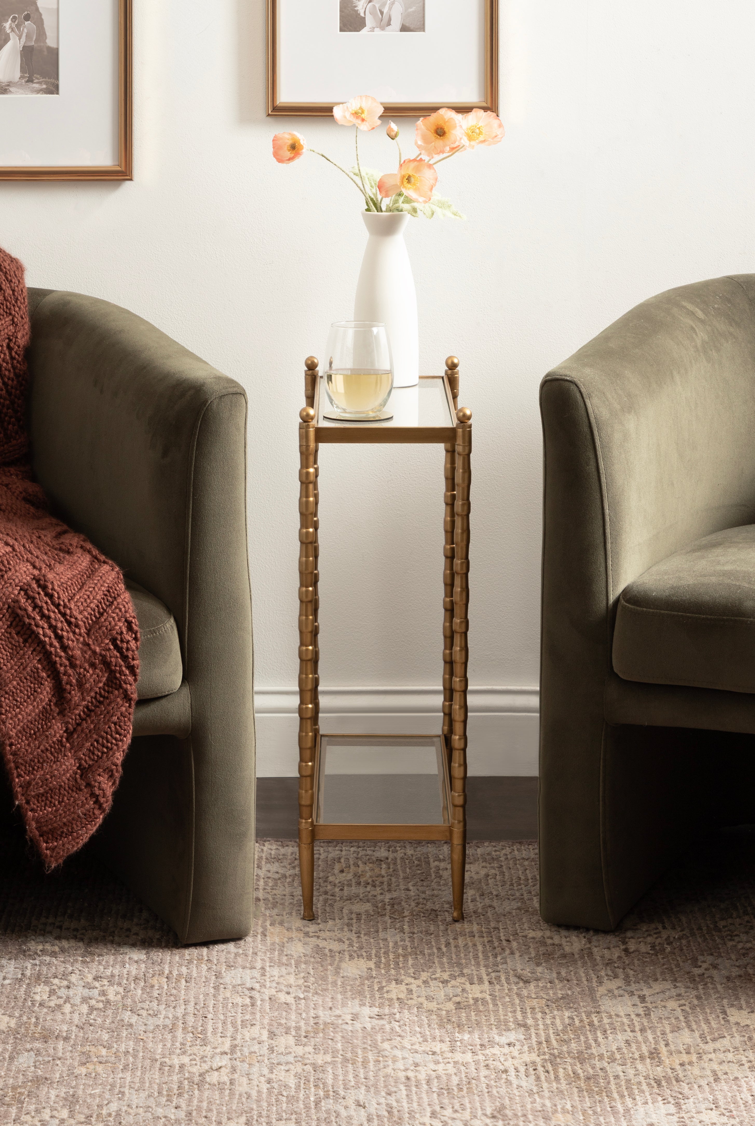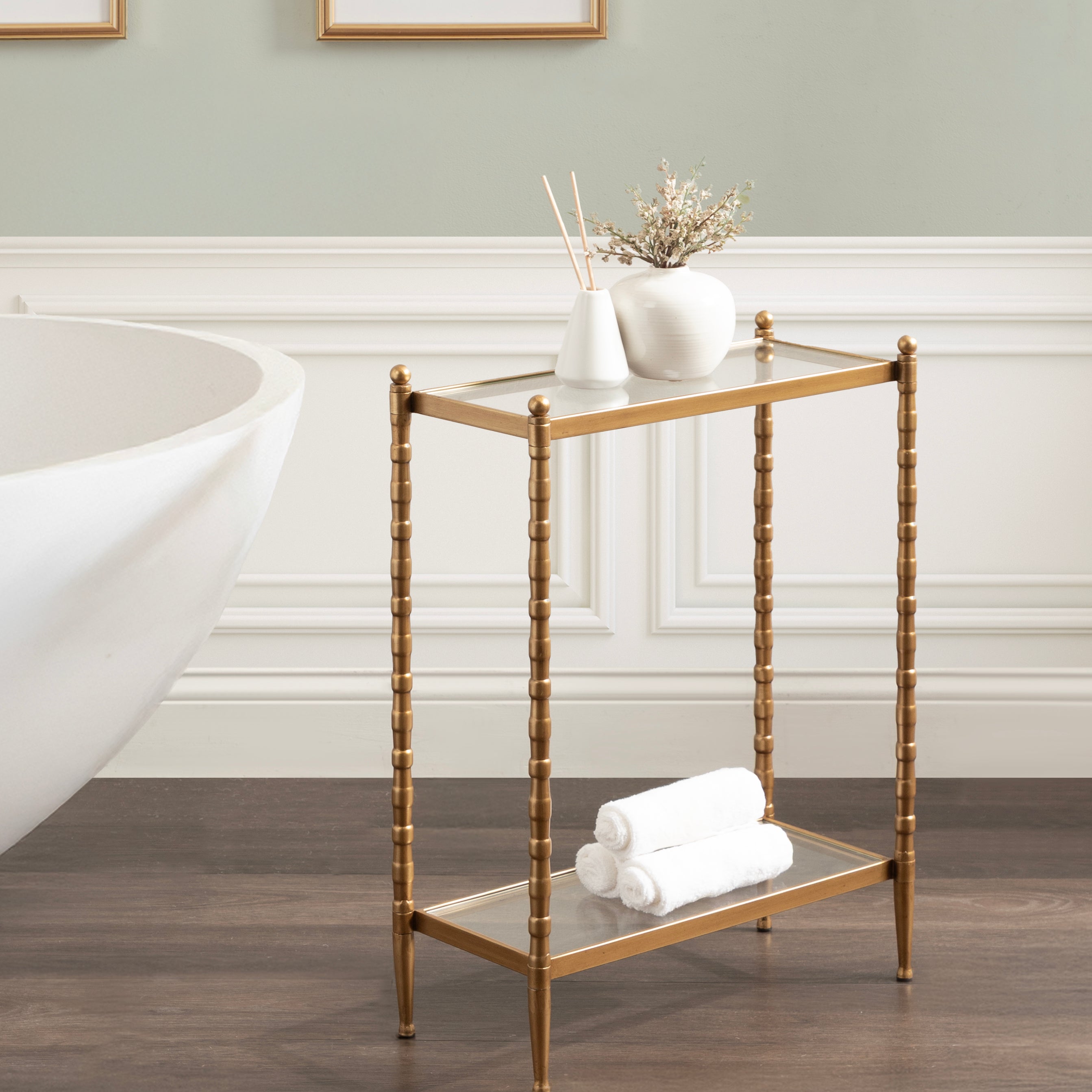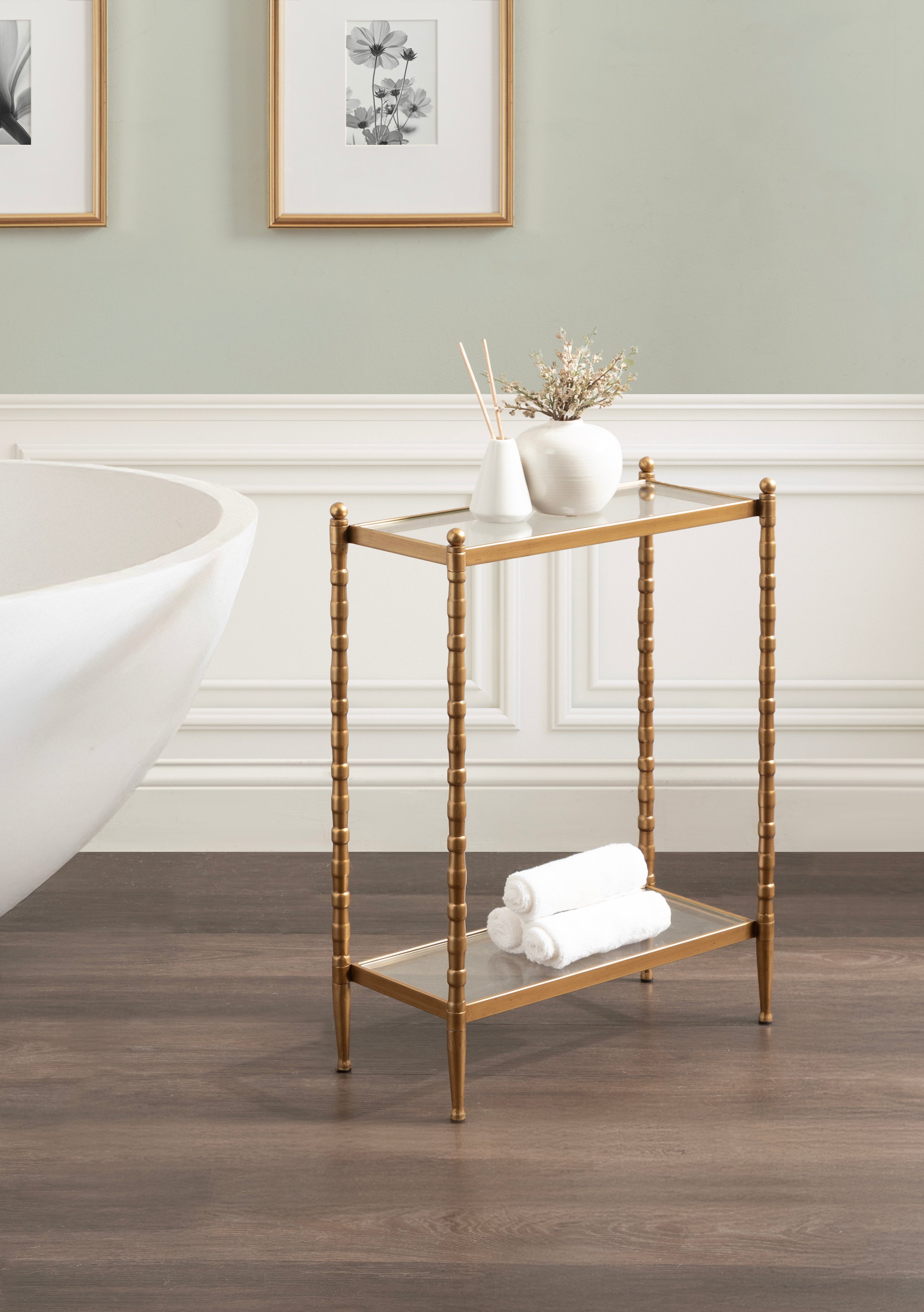 For the interior decorator with a passion for classic design comes our Prisha narrow side table. The Prisha collection features solid iron legs with textured cast metal turnings. The tiered end table boasts tempered glass tabletops, giving the illusion of more space and depth. The tabletops' surface area is a perfect display or storage area for lamps, morning coffee, plants, alarm clocks, or other small items. Use it as a living room table, a slim nightstand in the bedroom, or an accent table near your bathtub. Regardless of where you put it, the Prisha end table makes for a unique statement piece in any area of your modern home. You won't have to work hard to set up this charming table, either; the Prisha side table has a simple, three-step assembly process.
