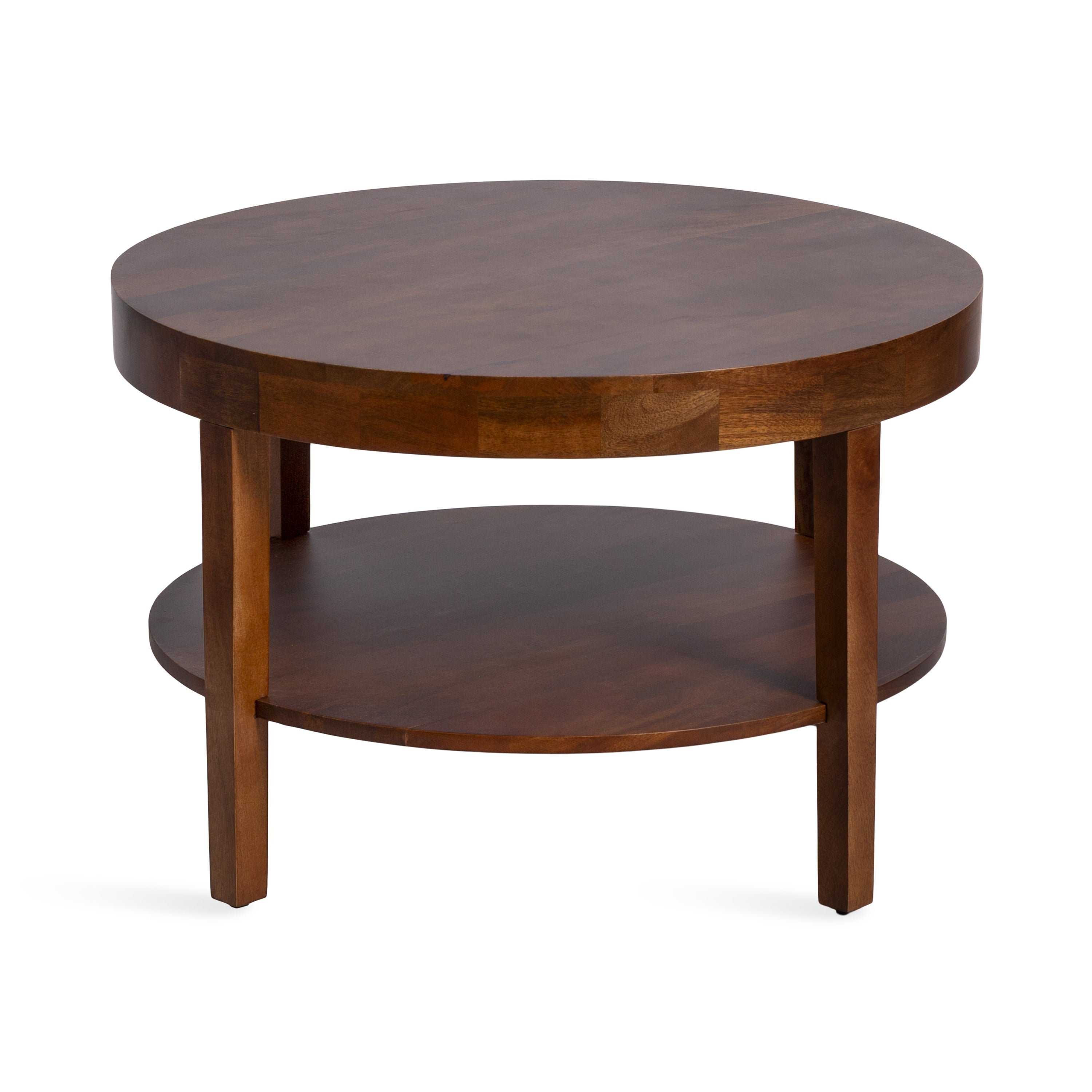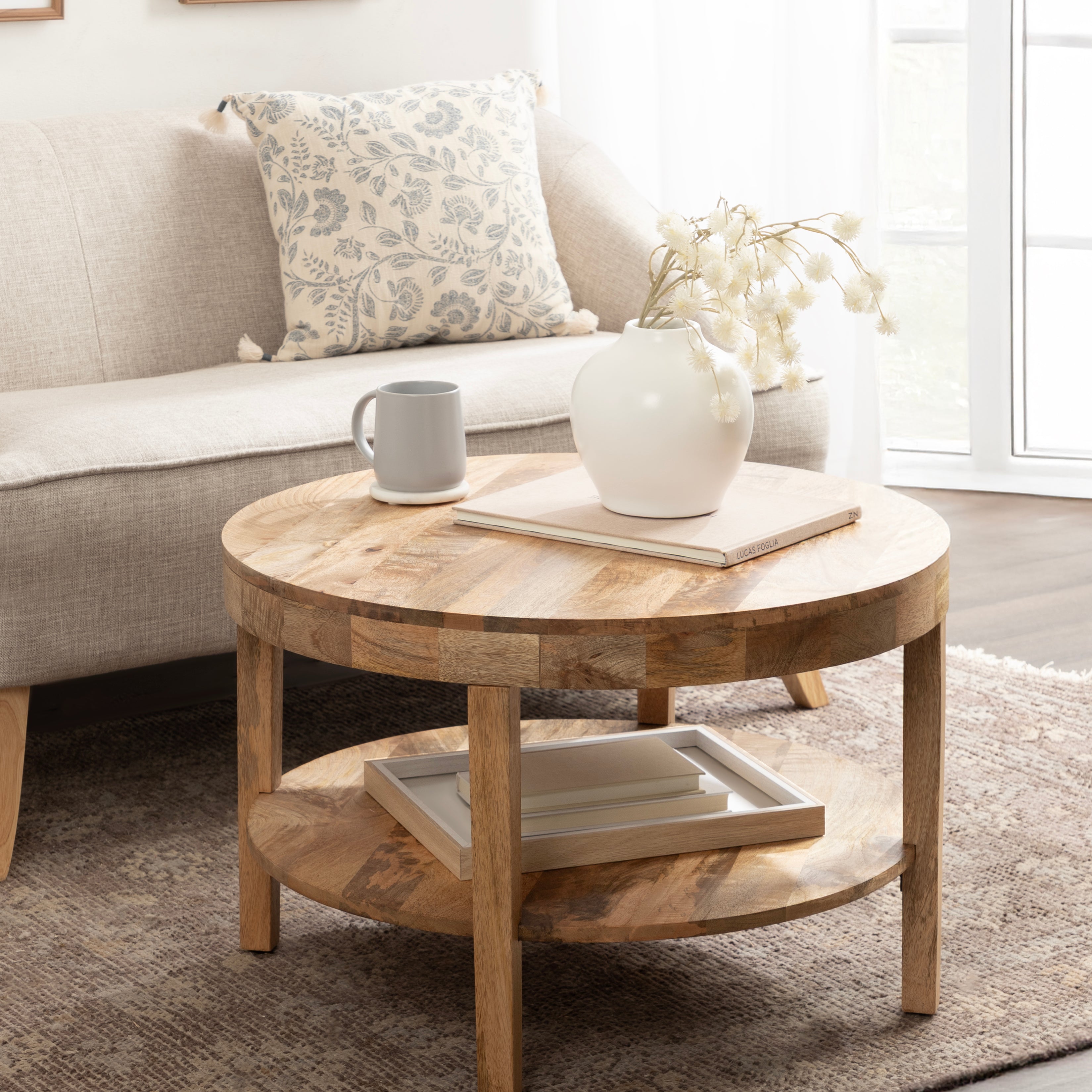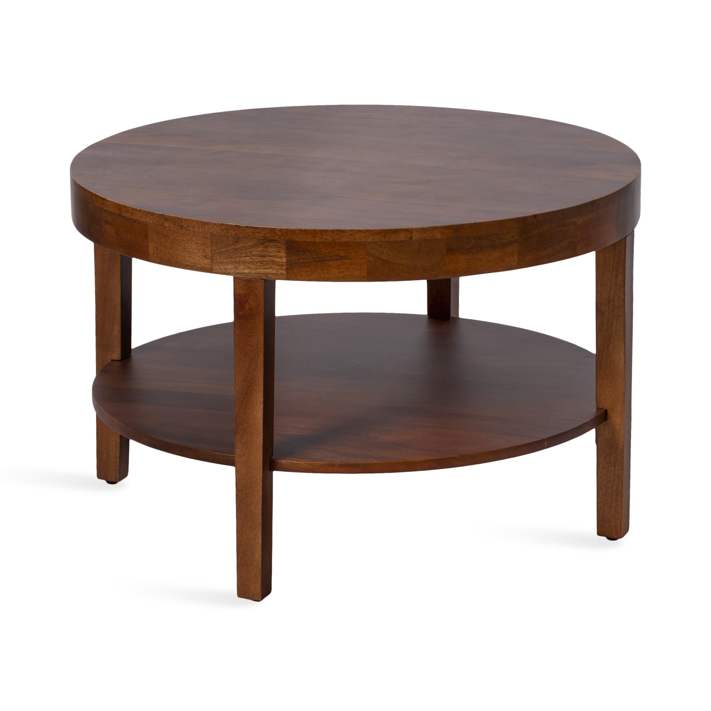 Showcase your transitional-inspired style with the Talcott round coffee table from Kate and Laurel. The rich and elegant finish of the wood adds a touch of sophistication to any space, while the simple and clean lines of the design make it easy to blend seamlessly with any decor style. Gorgeous mango wood was used to create this beautiful coffee table, creating a statement that is as durable as it is beautiful. The top wooden tier is perfect for creating a lovely display area for candles, small lamps, and other accents. The bottom tier of the Talcott is great for storing your favorite household accessories, from blankets and pillows to everyday essentials. Assemble this table in only a matter of minutes with a simple, three-step assembly process.
