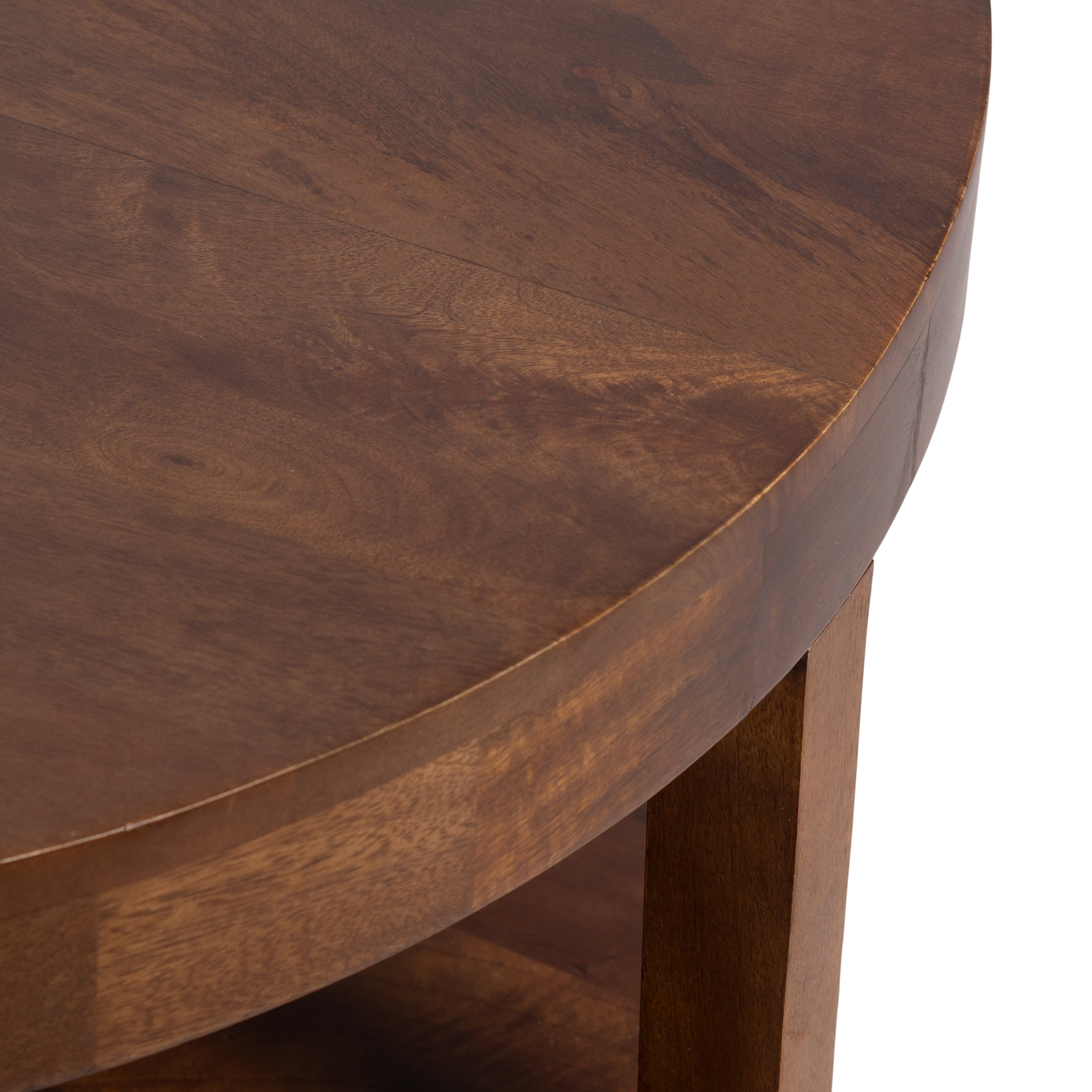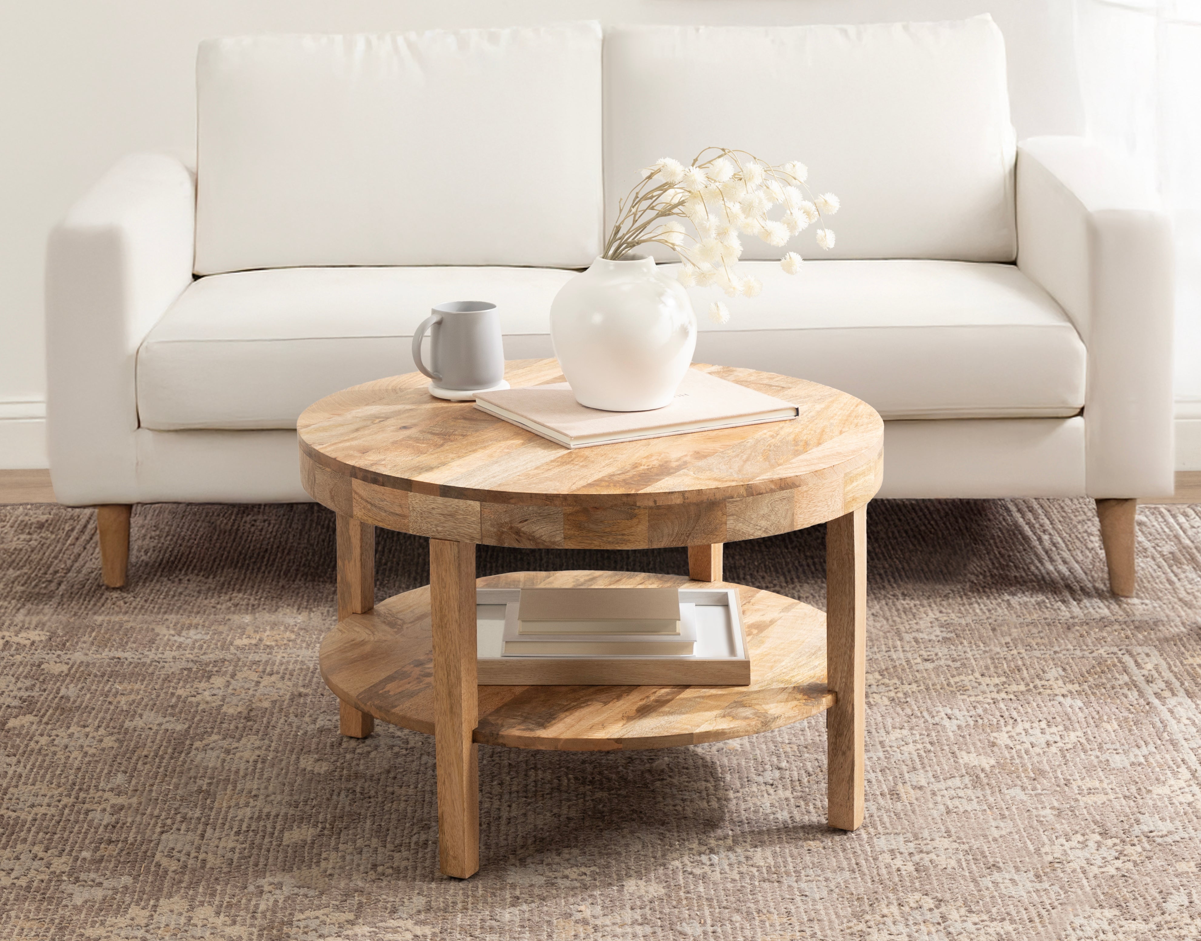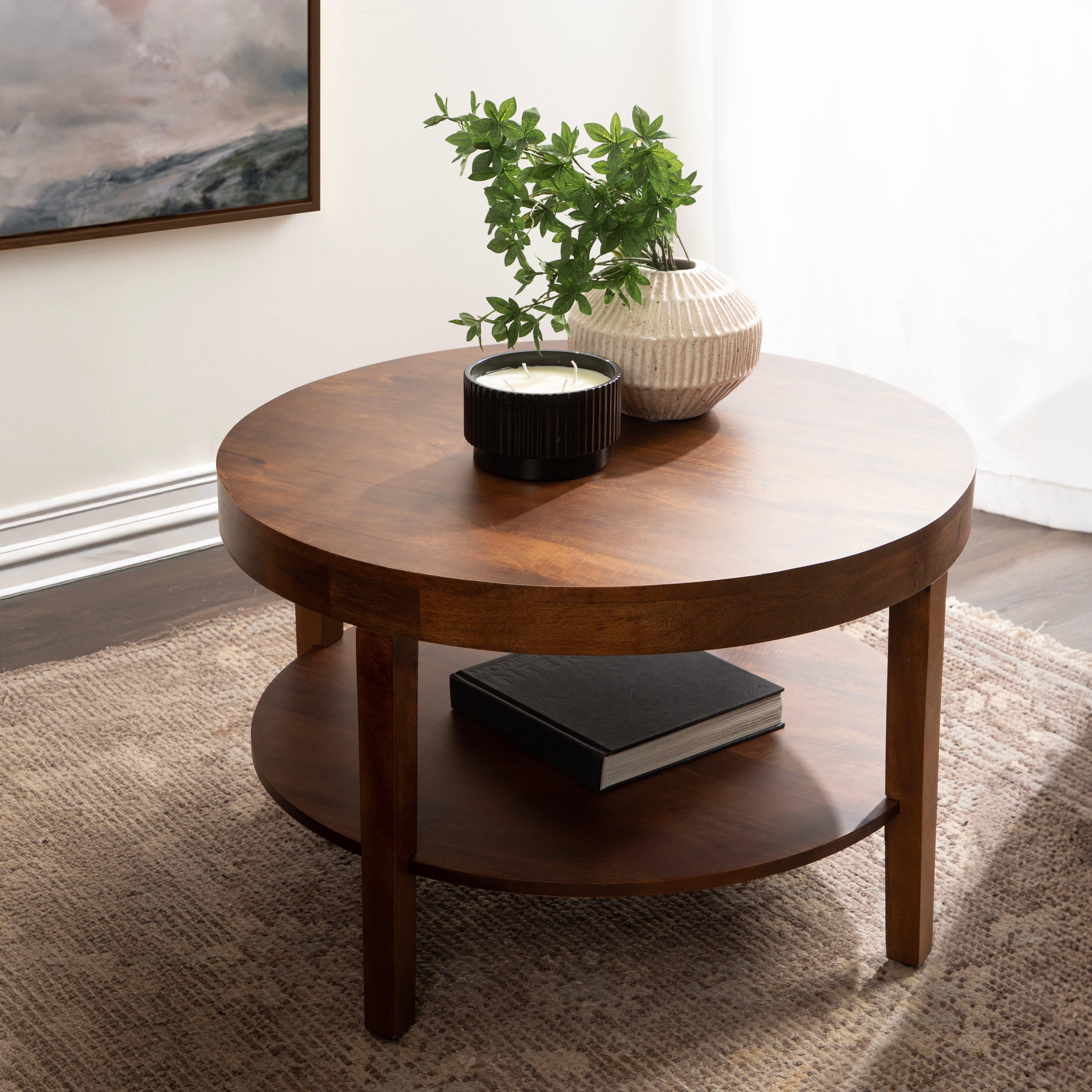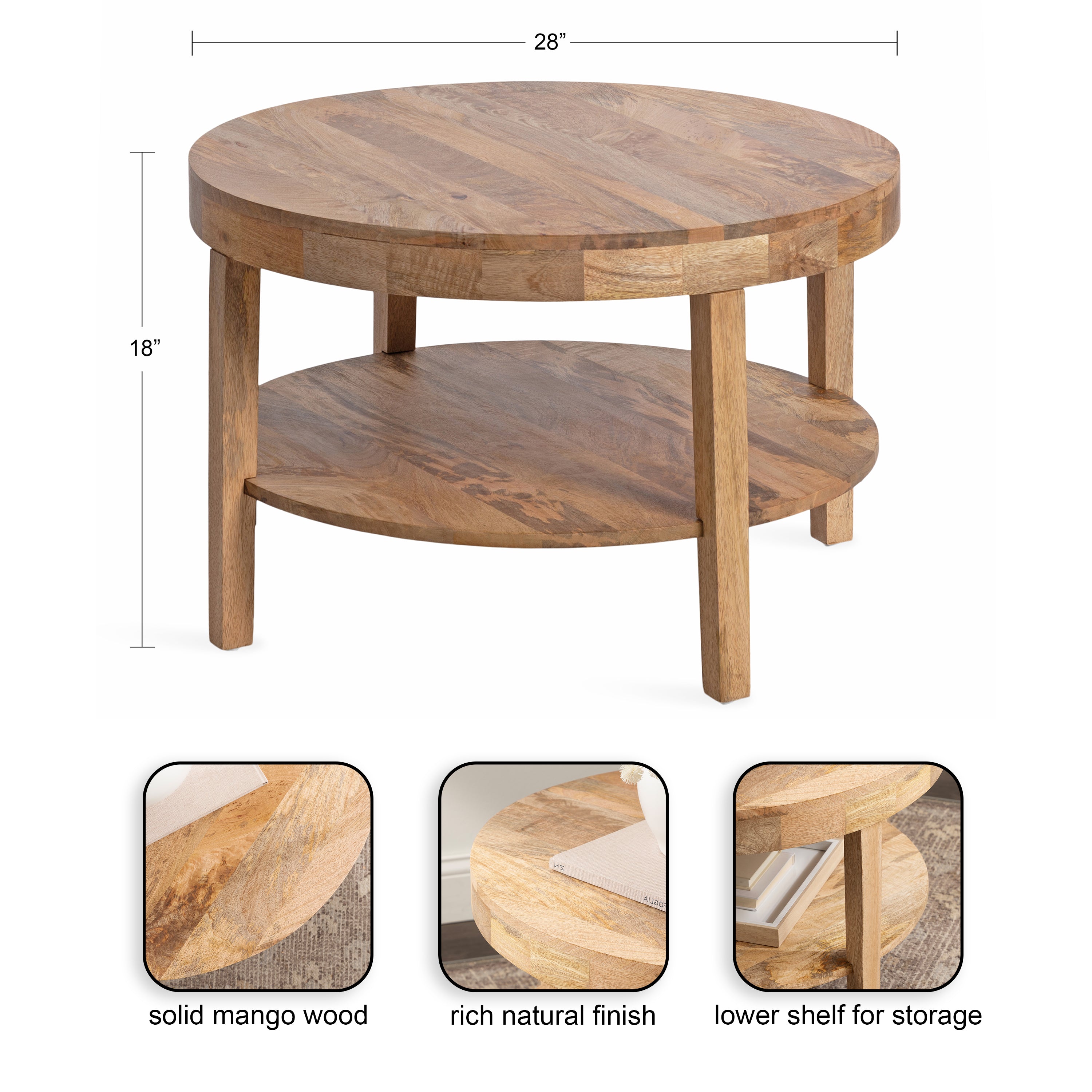 Showcase your transitional-inspired style with the Talcott round coffee table from Kate and Laurel. The rich and elegant finish of the wood adds a touch of sophistication to any space, while the simple and clean lines of the design make it easy to blend seamlessly with any decor style. Gorgeous mango wood was used to create this beautiful coffee table, creating a statement that is as durable as it is beautiful. The top wooden tier is perfect for creating a lovely display area for candles, small lamps, and other accents. The bottom tier of the Talcott is great for storing your favorite household accessories, from blankets and pillows to everyday essentials. Assemble this table in only a matter of minutes with a simple, three-step assembly process.