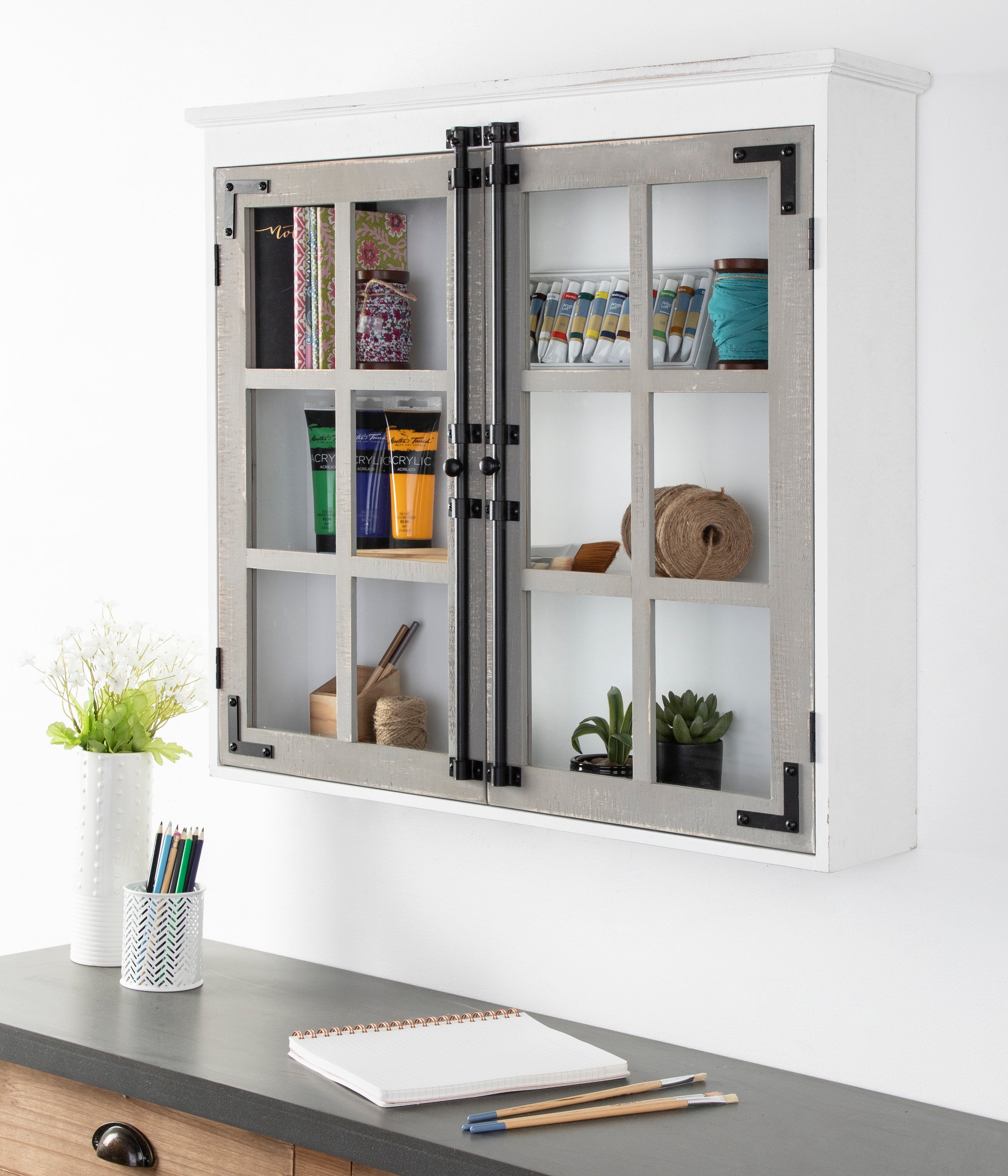 Elevate your storage with a shabby-chic storage cabinet inspired by vintage farmhouse craftsmanship. The Hutchins 2-Door Cabinet features two windowpane-inspired doors with a retro metal-forged decorative piece for a rustic vintage appeal. It also has a distressed finish for a rustic decor piece that stands out without overshadowing your other decor pieces. Store anything from small plants to tiny decorative keepsakes, or you can even use it as a farmhouse medicine cabinet in your master bathroom.