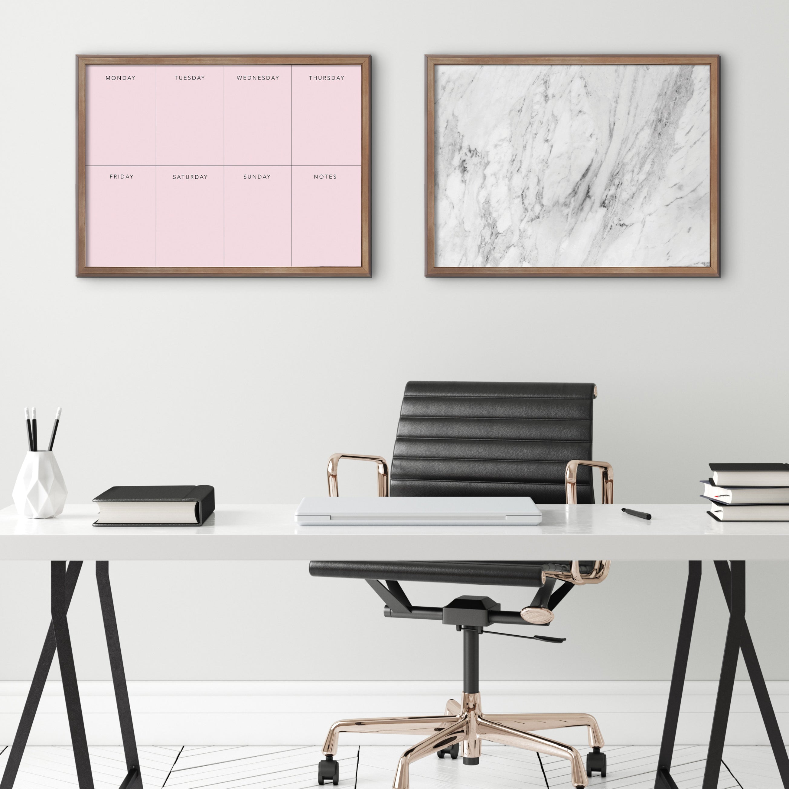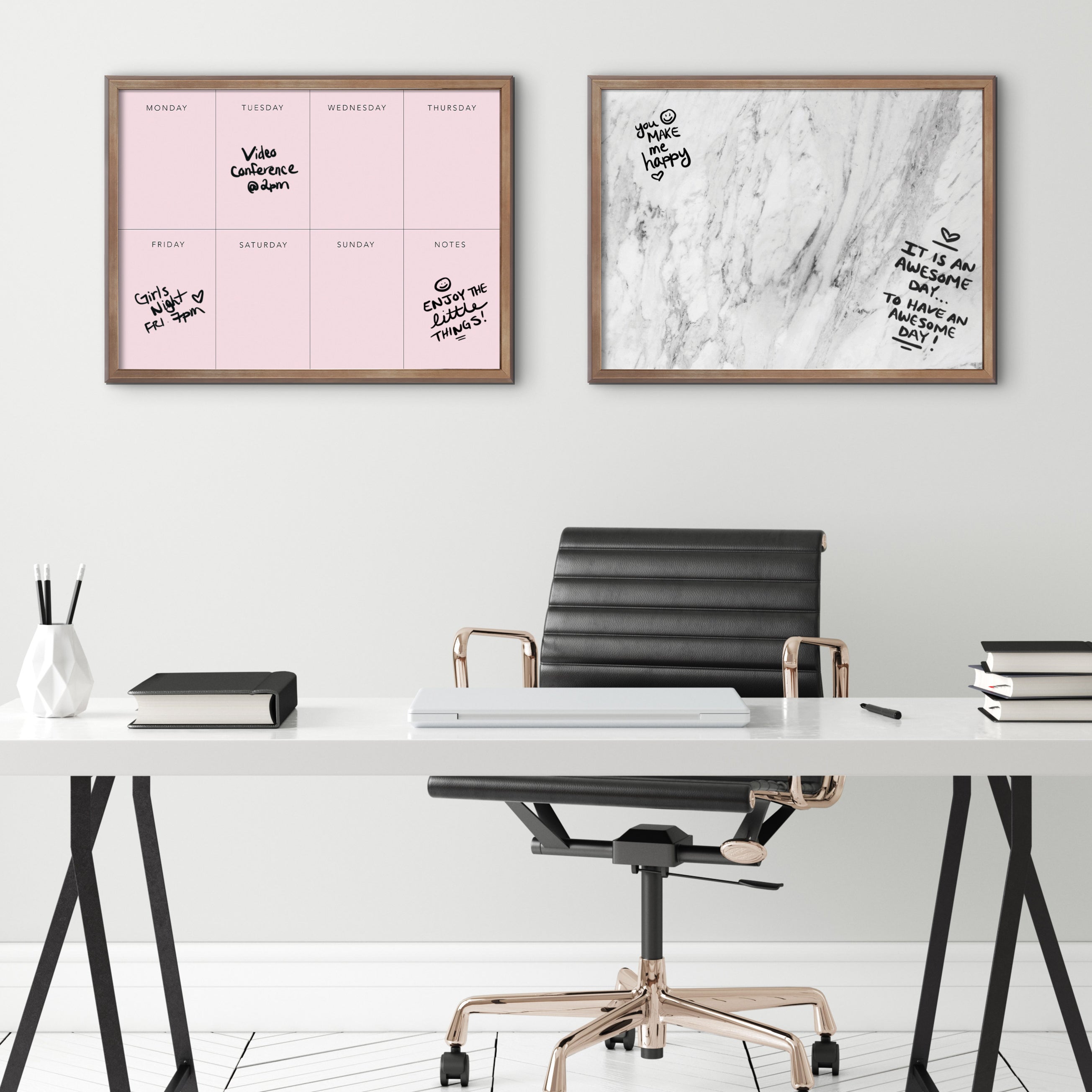 Add a classical elegant touch to any room of your home with this printed glass dry erase weekly calendar. A glass dry erase board doesn't wear out as easily as traditional whiteboards, allowing you to wipe and reuse the surface over and over again. Dry erase markers are not included. Printed on glass and framed with a lightweight polystyrene frame, this neutral wall organizer has hangers already attached for easy wall display.