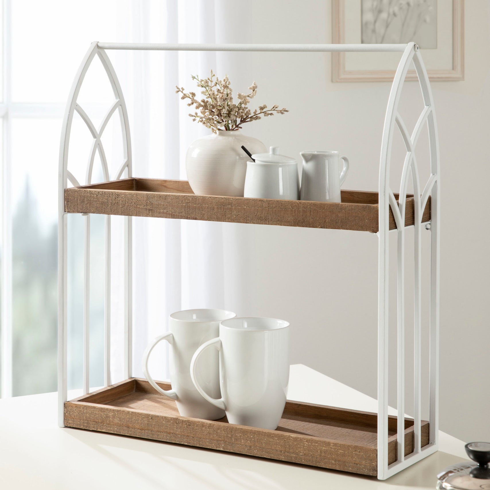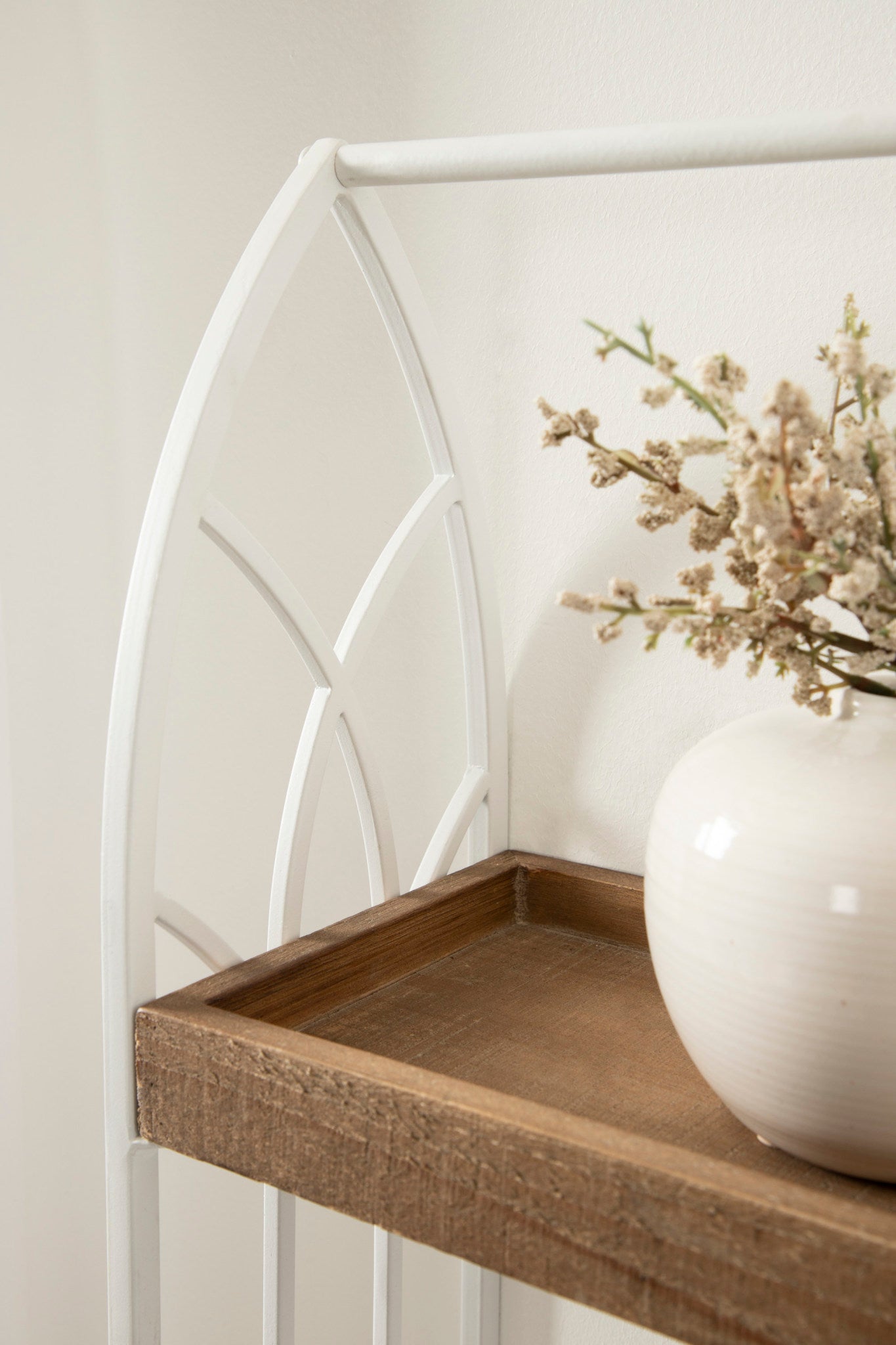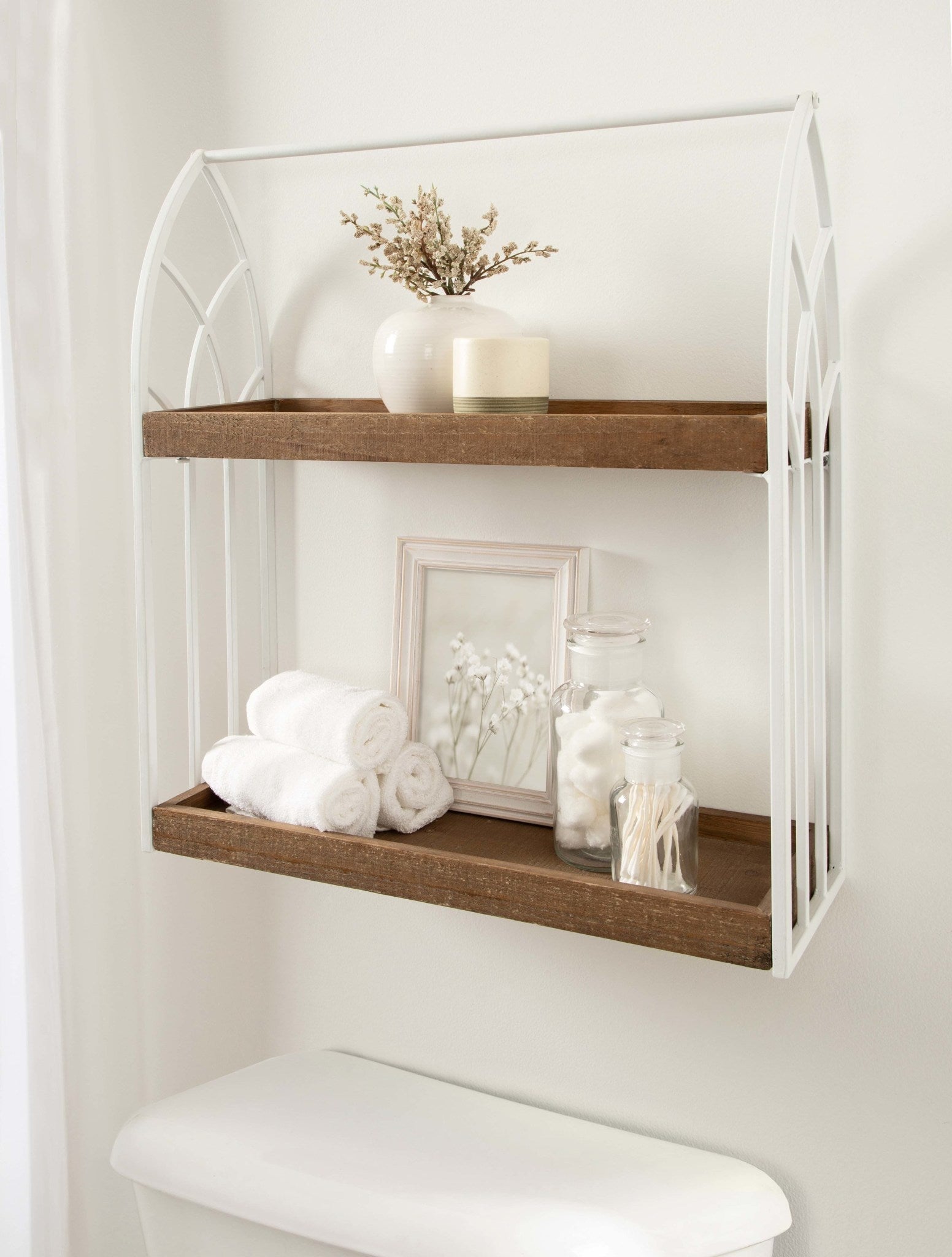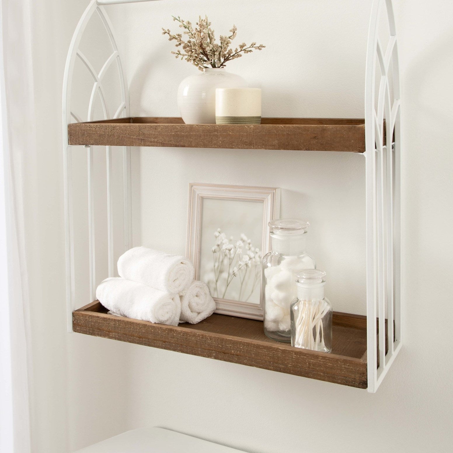 Showcase your home's farmhouse charm while storing your photos, toiletries, or household items with the Castille shelf. The Castille features two tiers of shelving within metal brackets with cathedral-like fretwork to provide your home with chic vintage storage. It hangs on the wall to save space and provide you with an eye-catching statement in any living room, bedroom, bathroom, entryway, kitchen, or dining room. Whether you're storing household necessities or displaying cherished keepsakes and photos, the Monroe elevates your wall decor with its stylish and antique-inspired design.