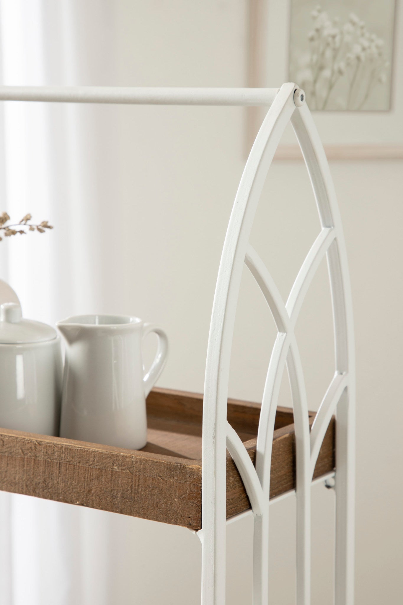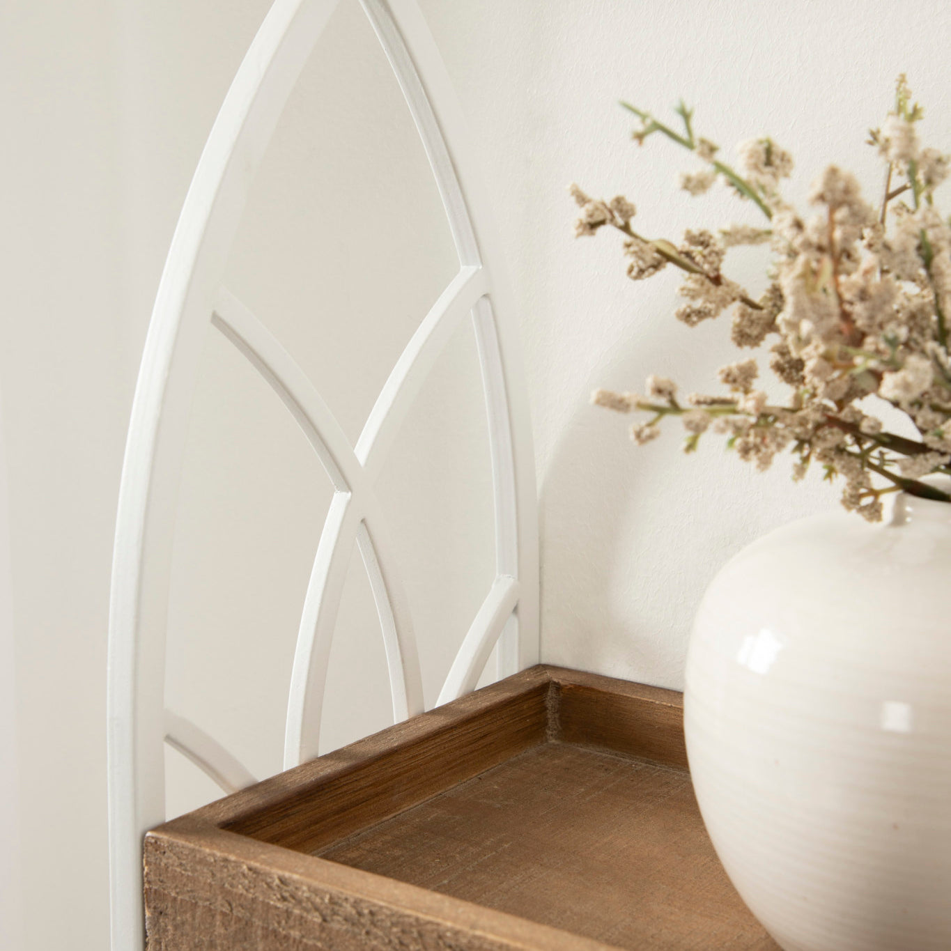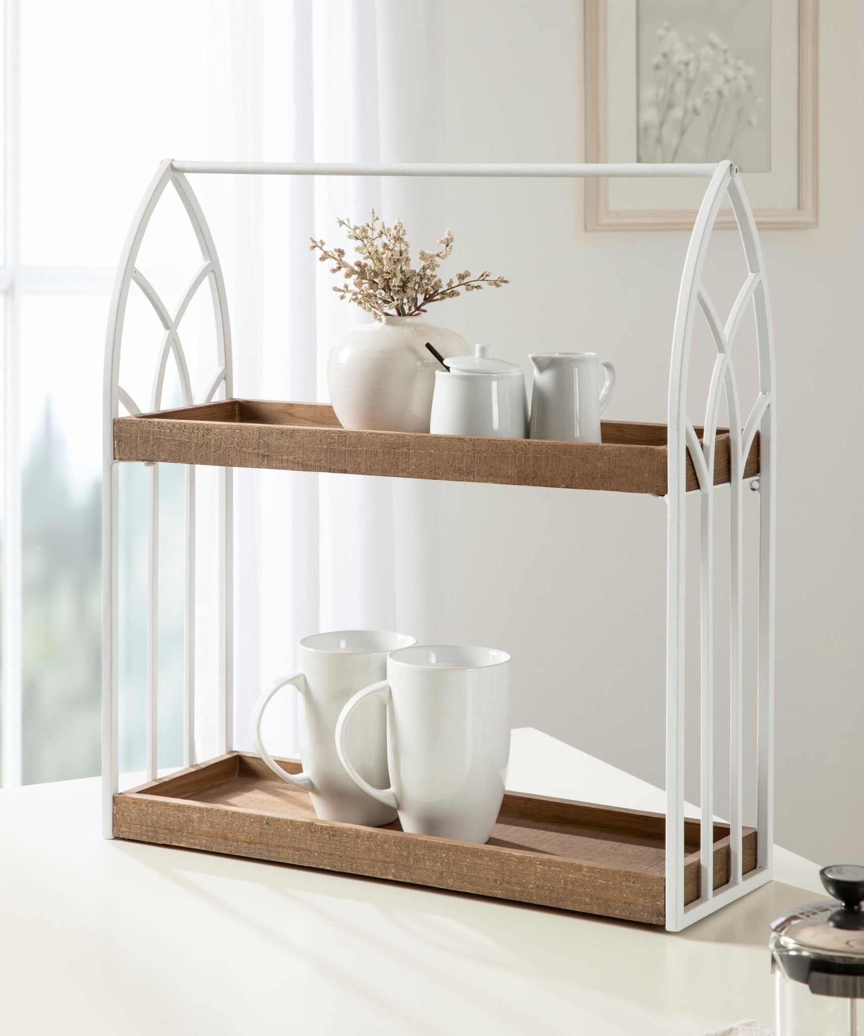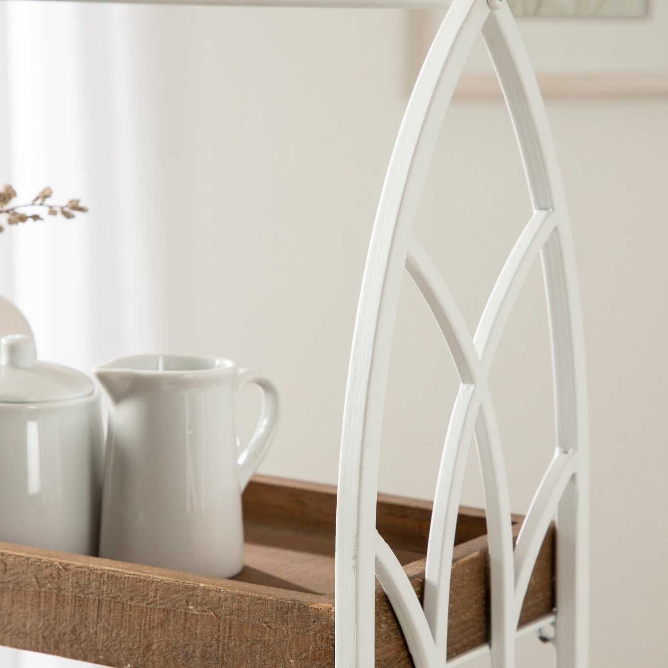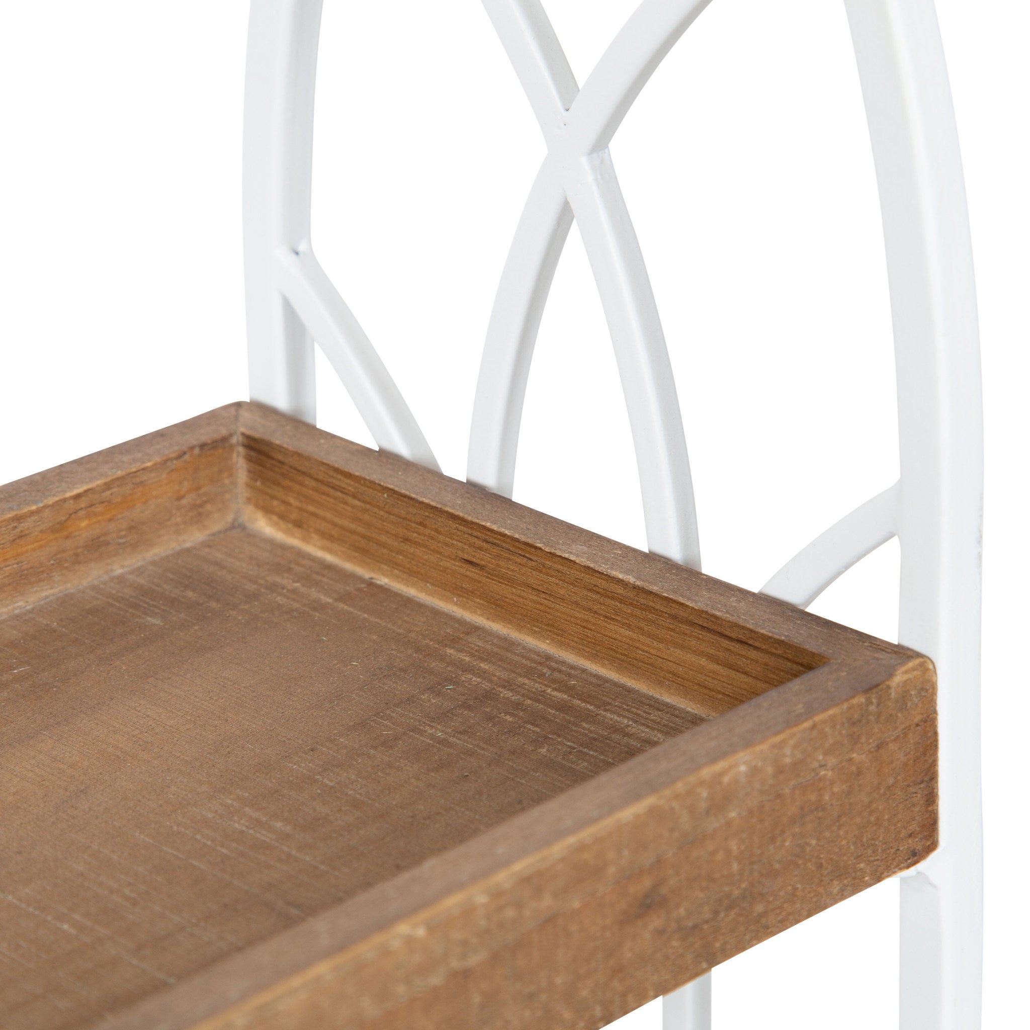 Showcase your home's farmhouse charm while storing your photos, toiletries, or household items with the Castille shelf. The Castille features two tiers of shelving within metal brackets with cathedral-like fretwork to provide your home with chic vintage storage. It hangs on the wall to save space and provide you with an eye-catching statement in any living room, bedroom, bathroom, entryway, kitchen, or dining room. Whether you're storing household necessities or displaying cherished keepsakes and photos, the Monroe elevates your wall decor with its stylish and antique-inspired design.