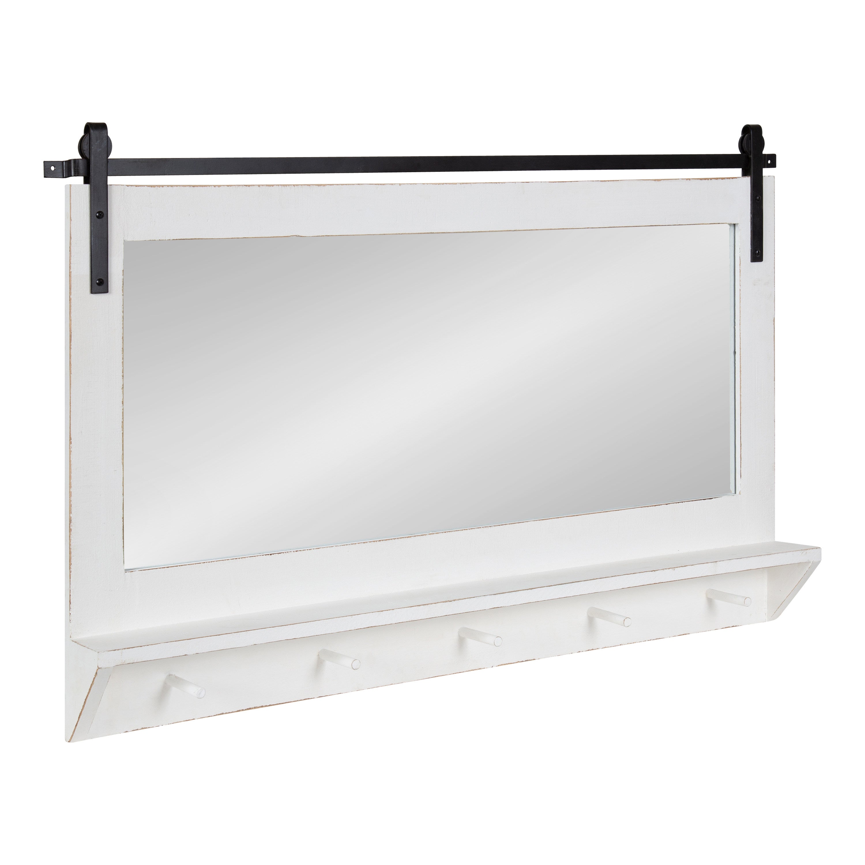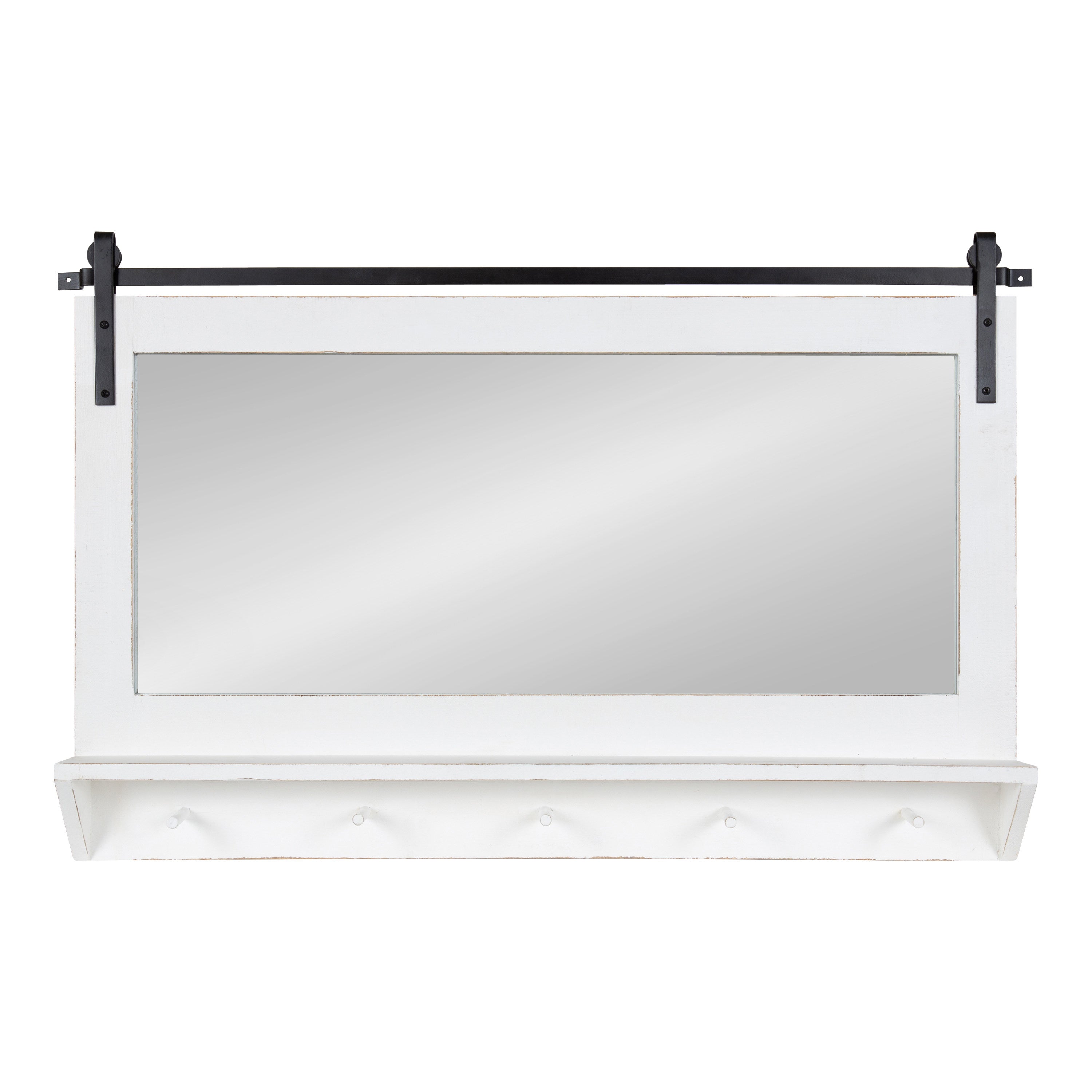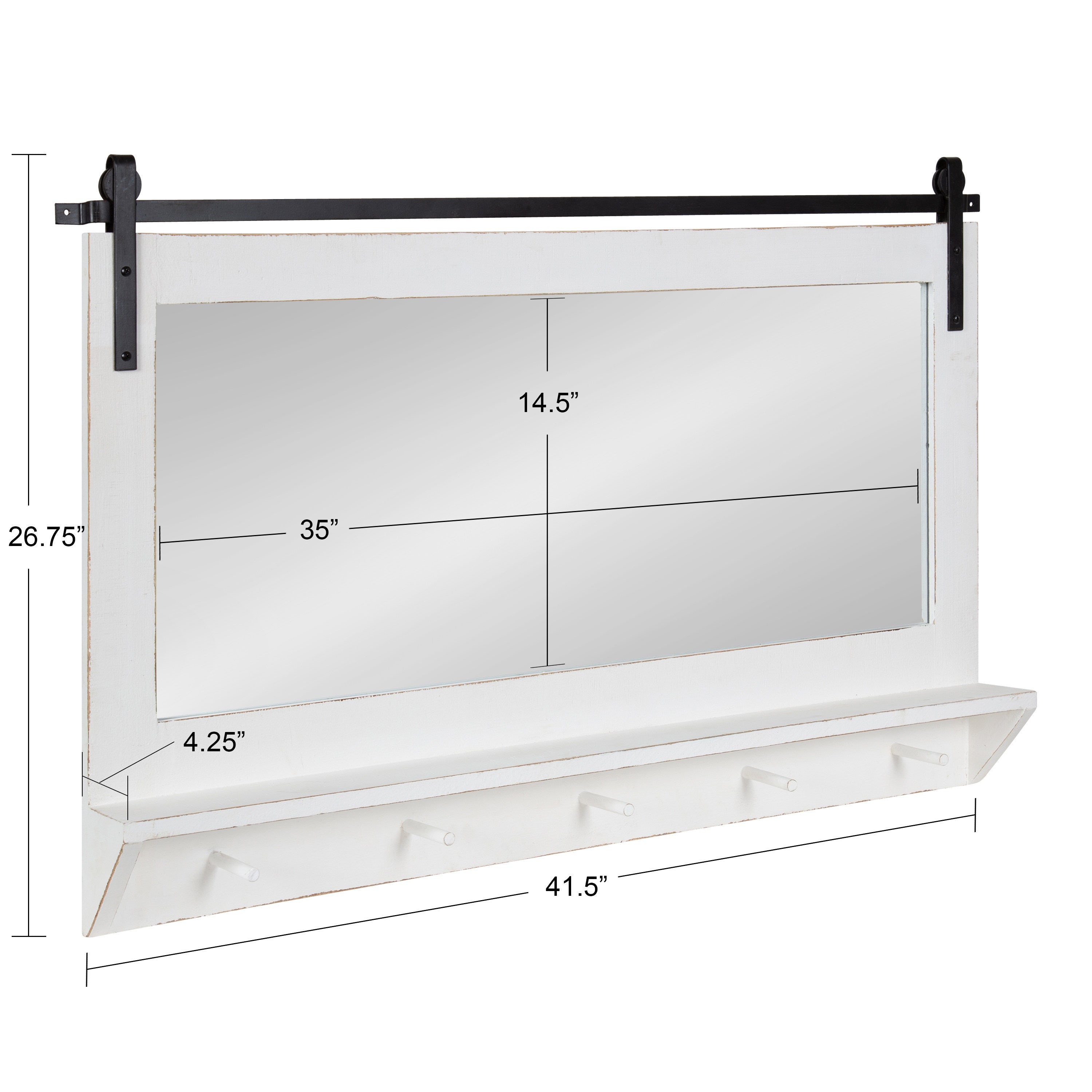 Decorate your home with farmhouse functionality by choosing the Cates pub mirror. This lovely wall mirror showcases rustic style with a distressed frame and barn door-inspired design. That's not all it offers, however: this beautiful mirror also incorporates a small shelf and five hanging pegs, making it perfect for both storage and display in the living room, entryway, bedroom, bathroom, or kitchen.
