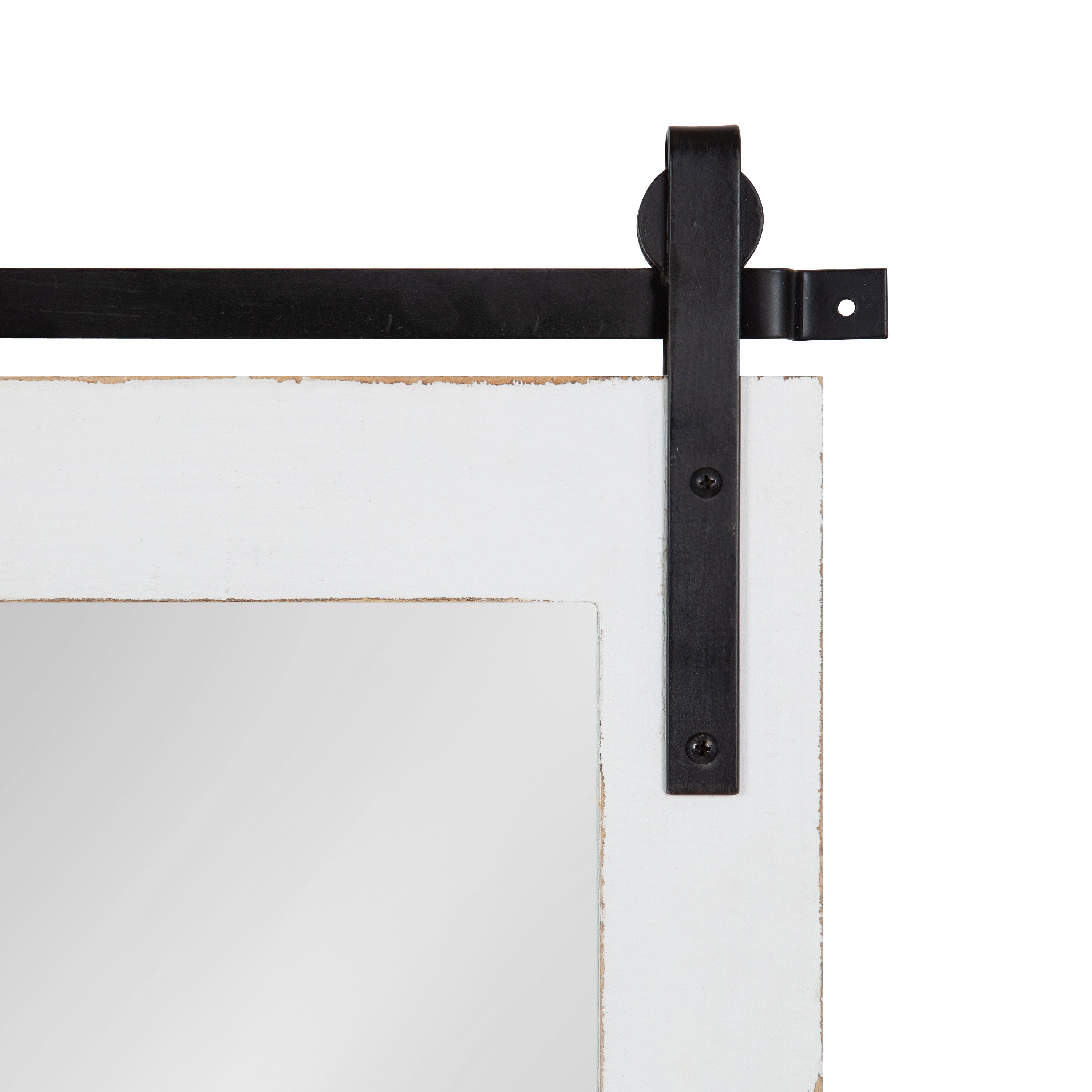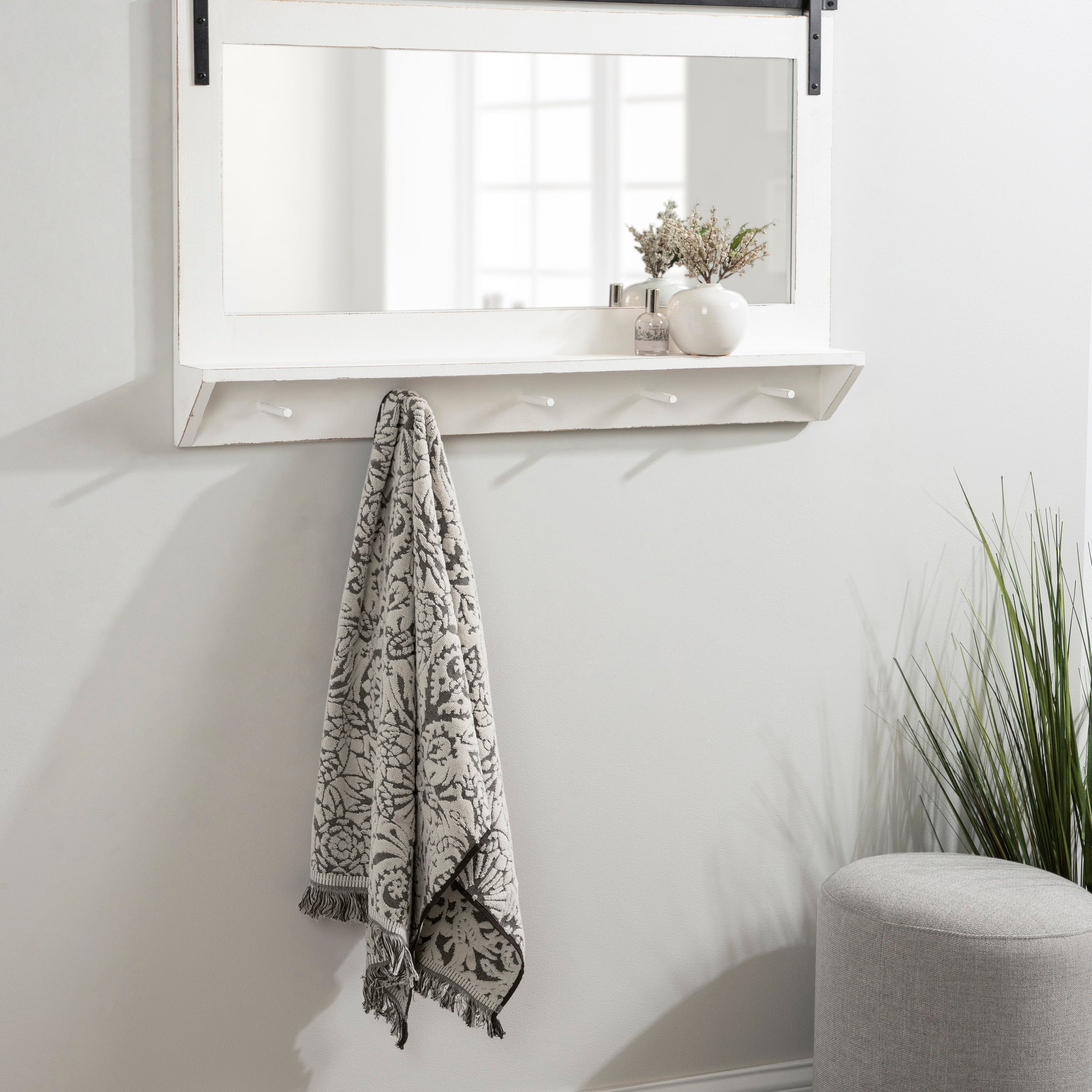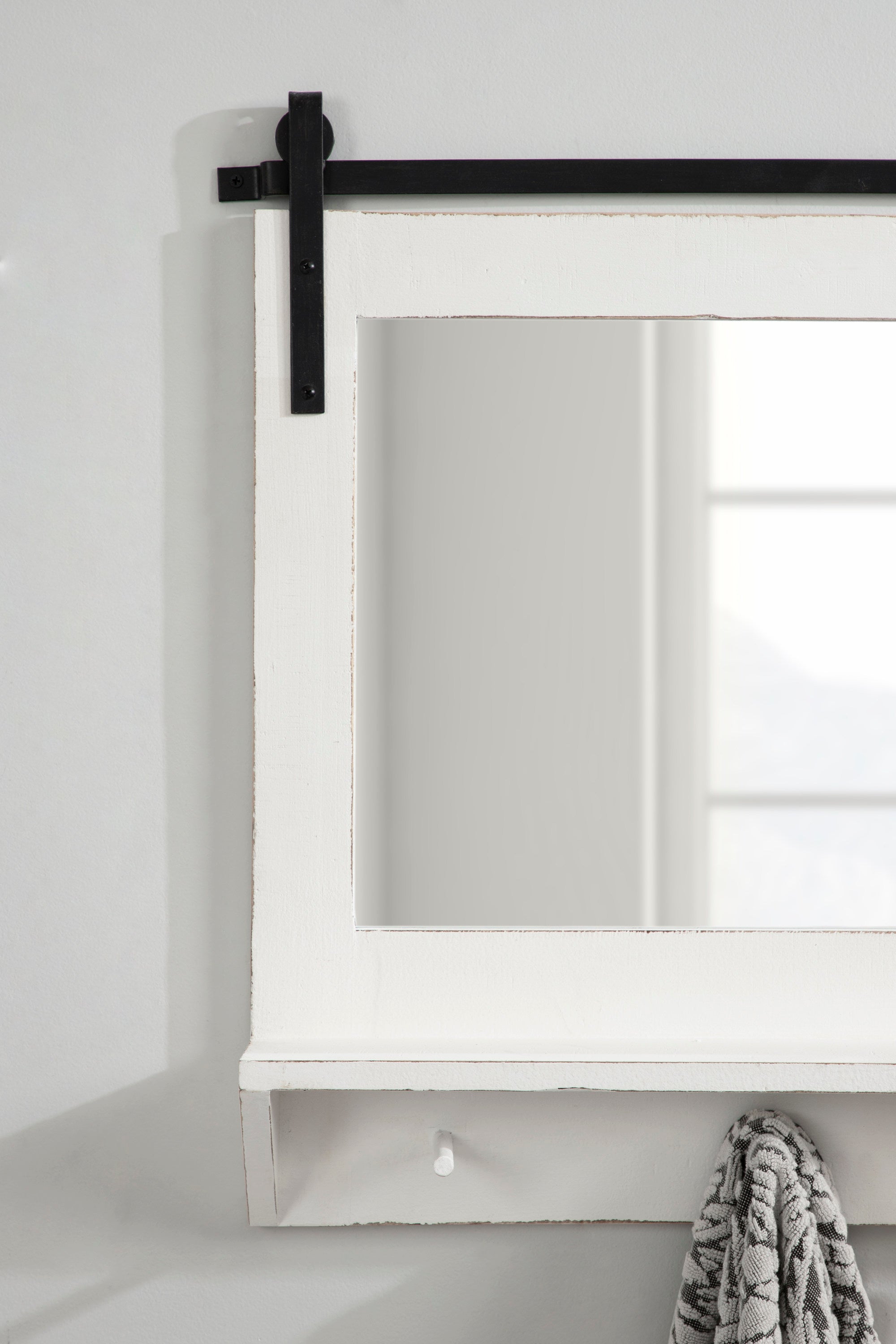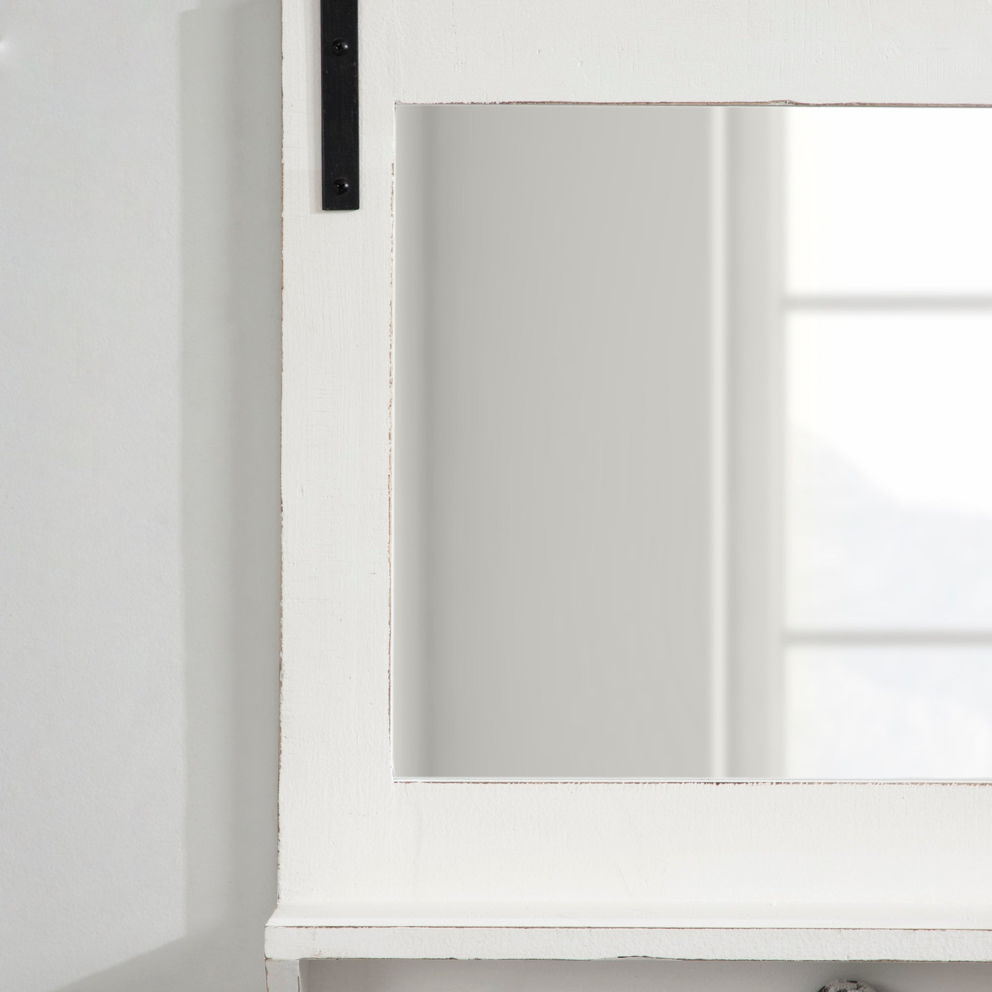 Decorate your home with farmhouse functionality by choosing the Cates pub mirror. This lovely wall mirror showcases rustic style with a distressed frame and barn door-inspired design. That's not all it offers, however: this beautiful mirror also incorporates a small shelf and five hanging pegs, making it perfect for both storage and display in the living room, entryway, bedroom, bathroom, or kitchen.
