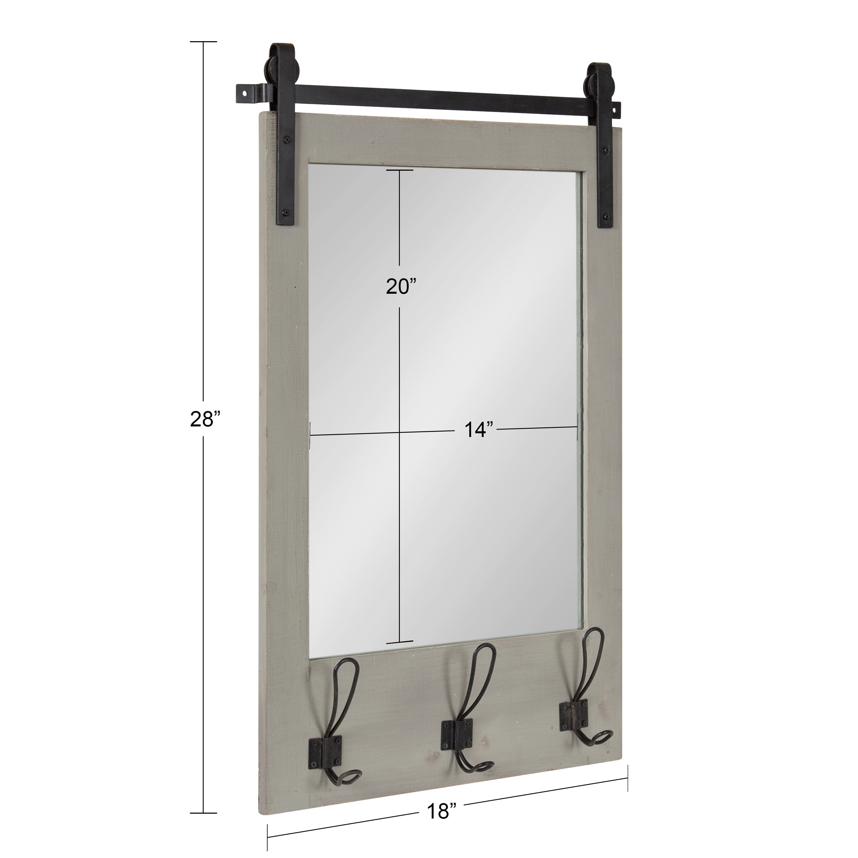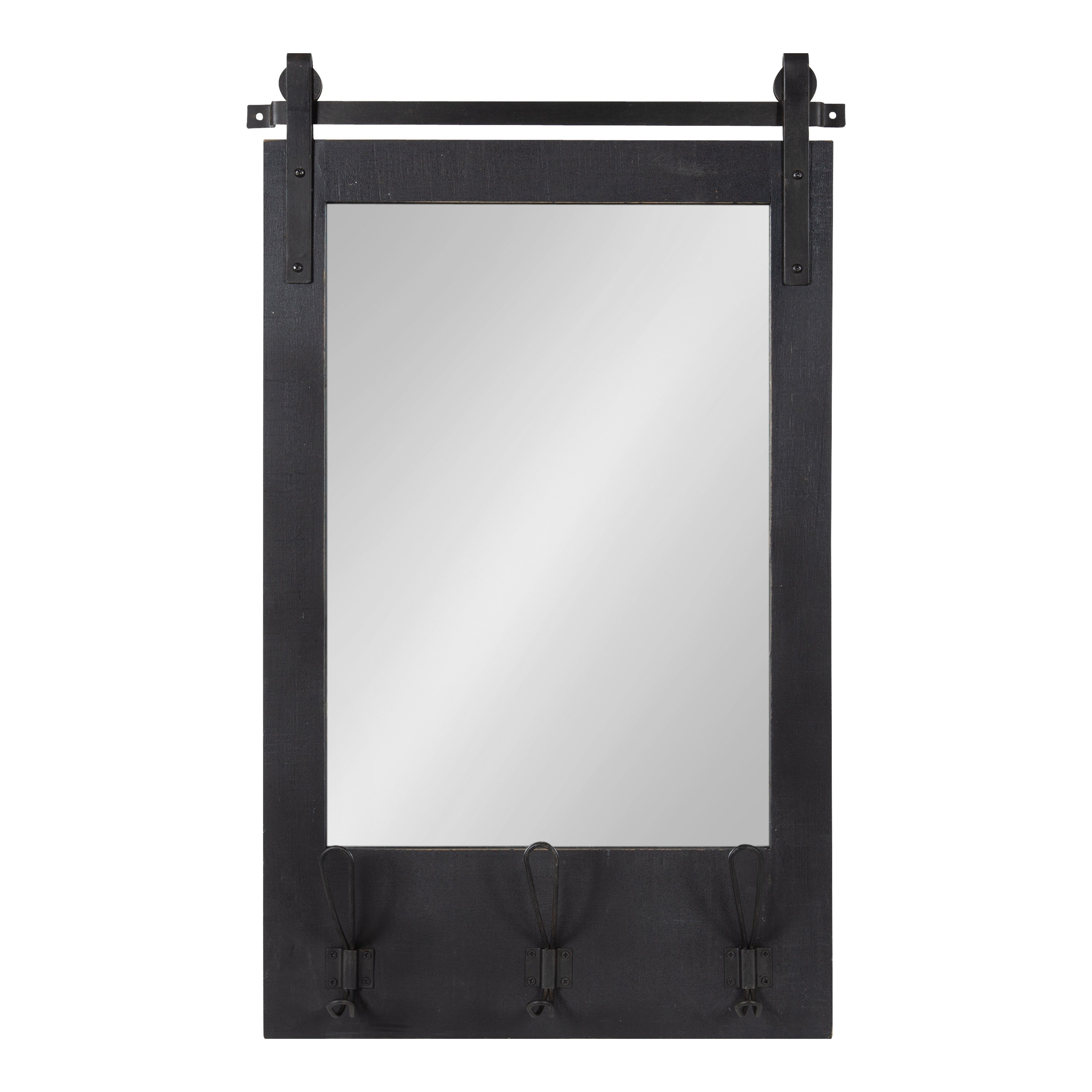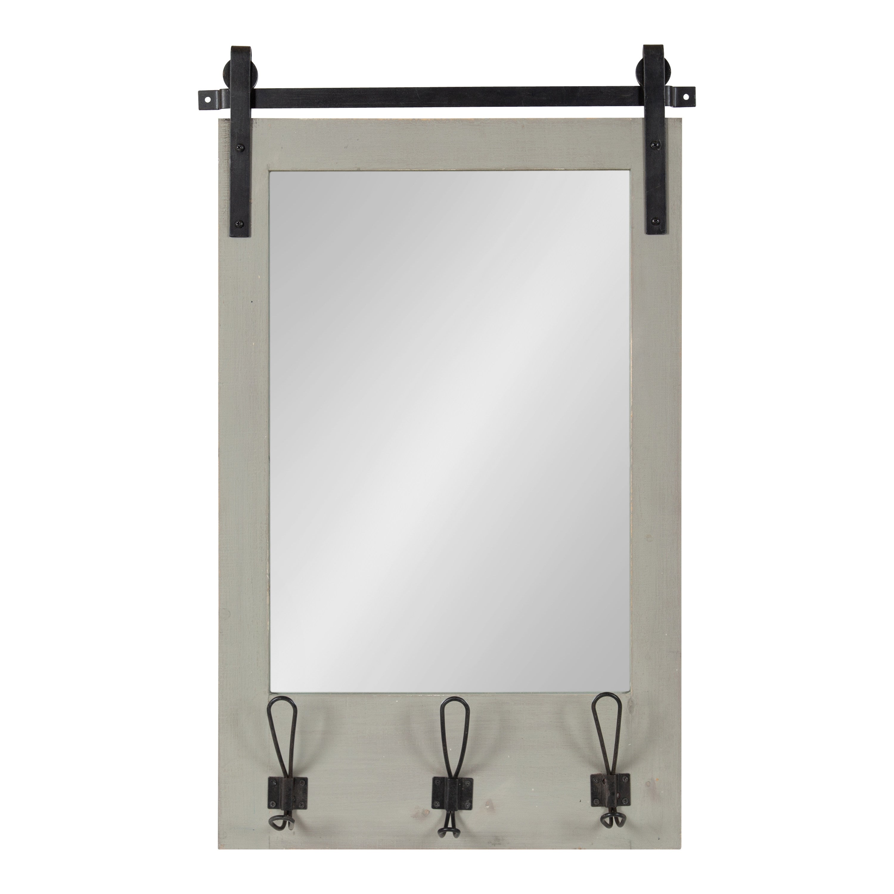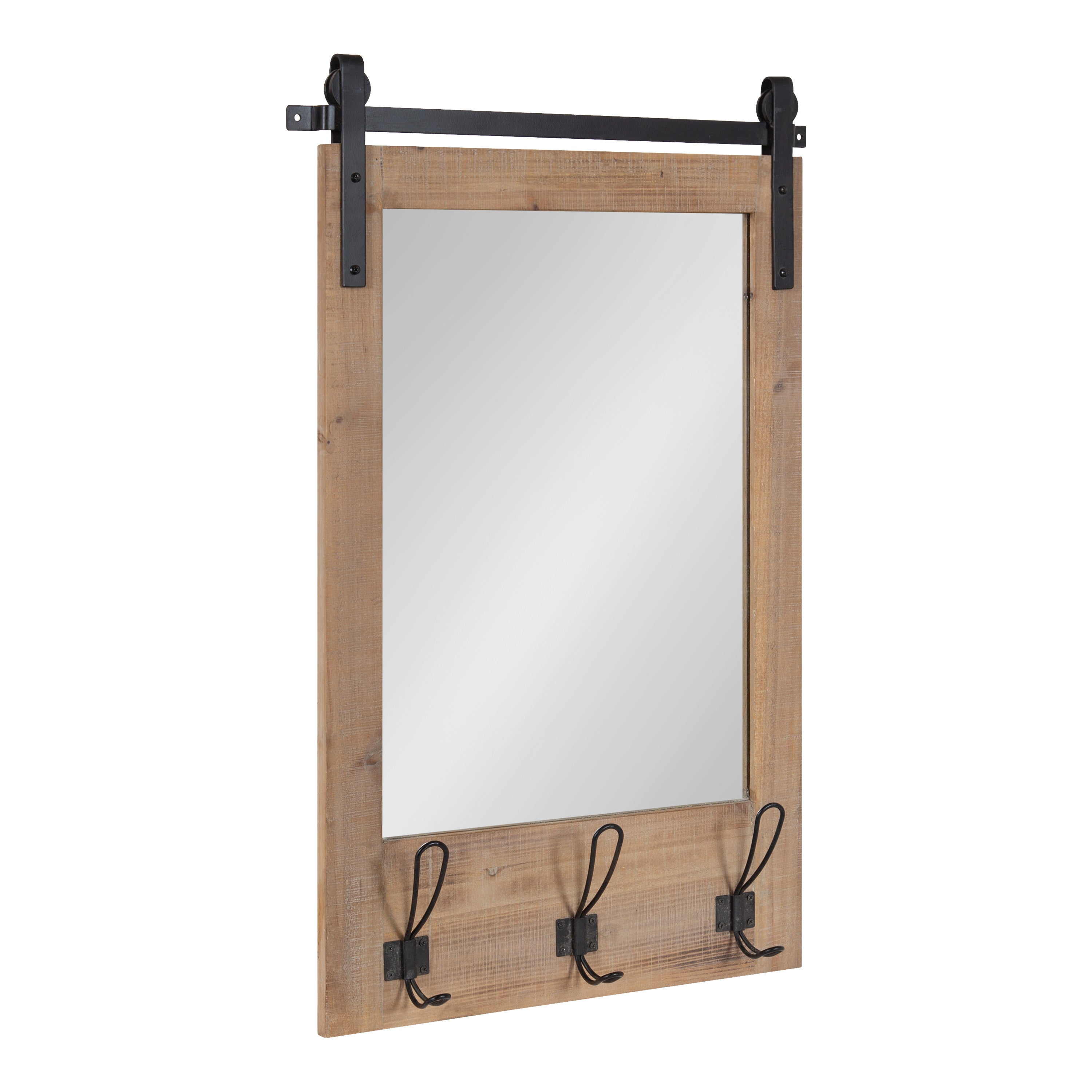 Expand upon your farmhouse style with the lovely and functional Cates wall mirror. Featuring our classic barn door styling and three hanging hooks, it's the perfect addition to any entryway, kitchen, bedroom, closet, or living room. It's great for adding your rustic sensibilities to your home while providing a functional storage area.