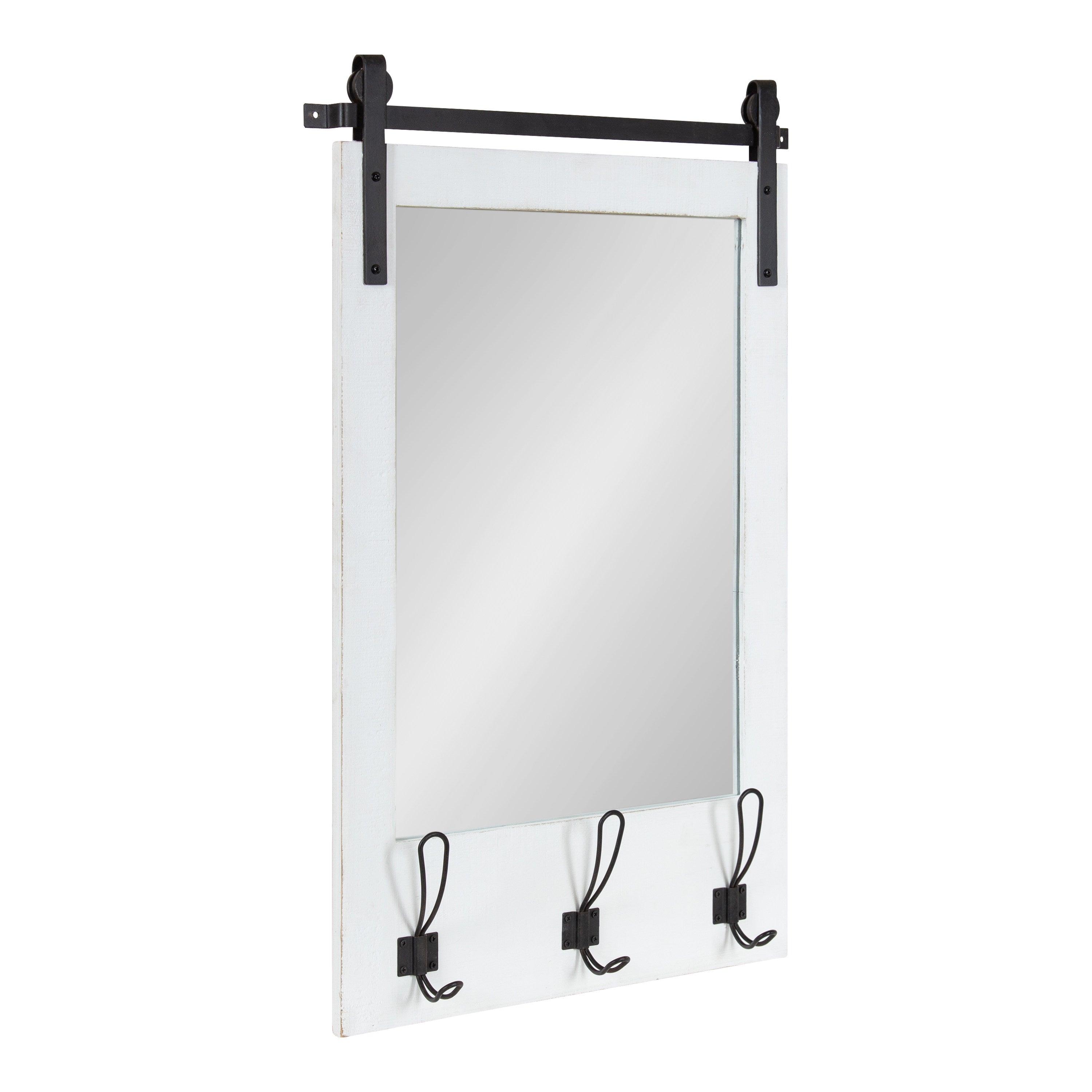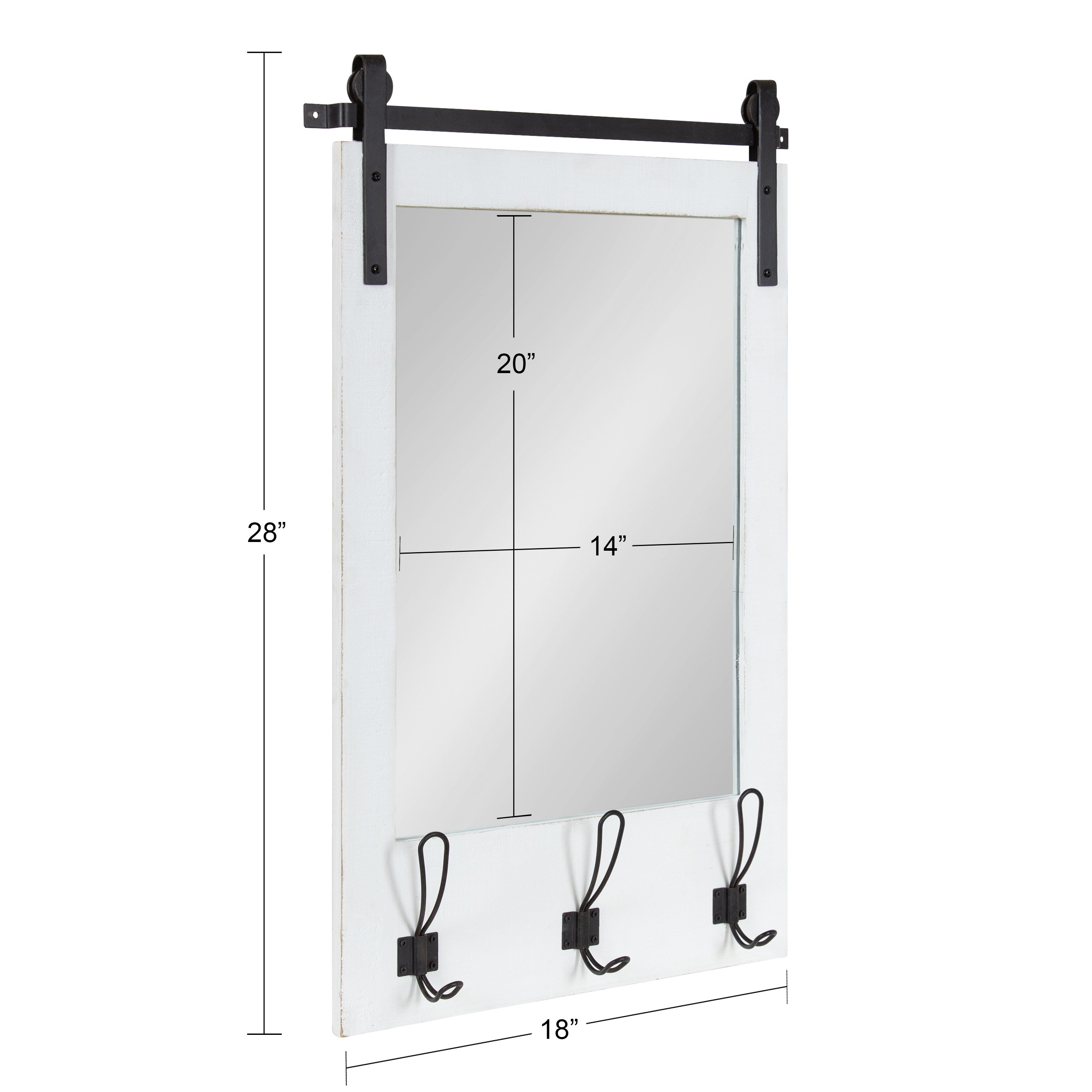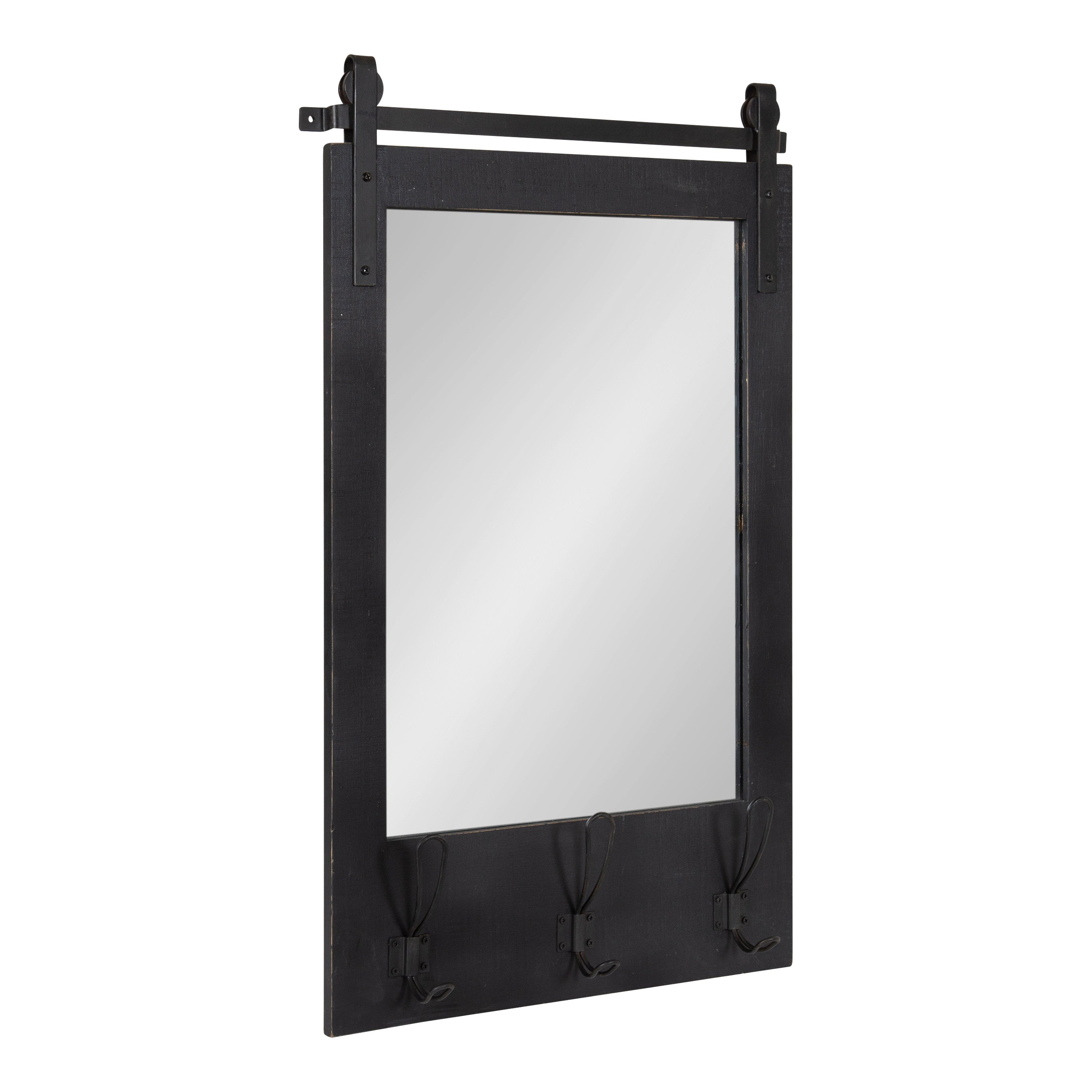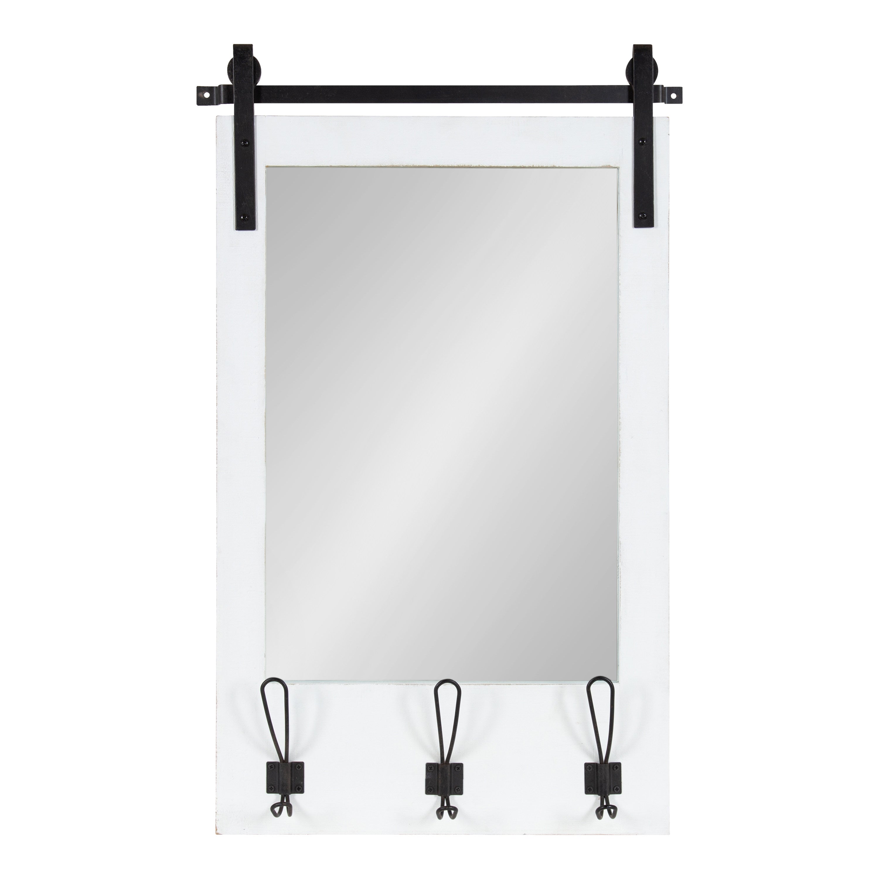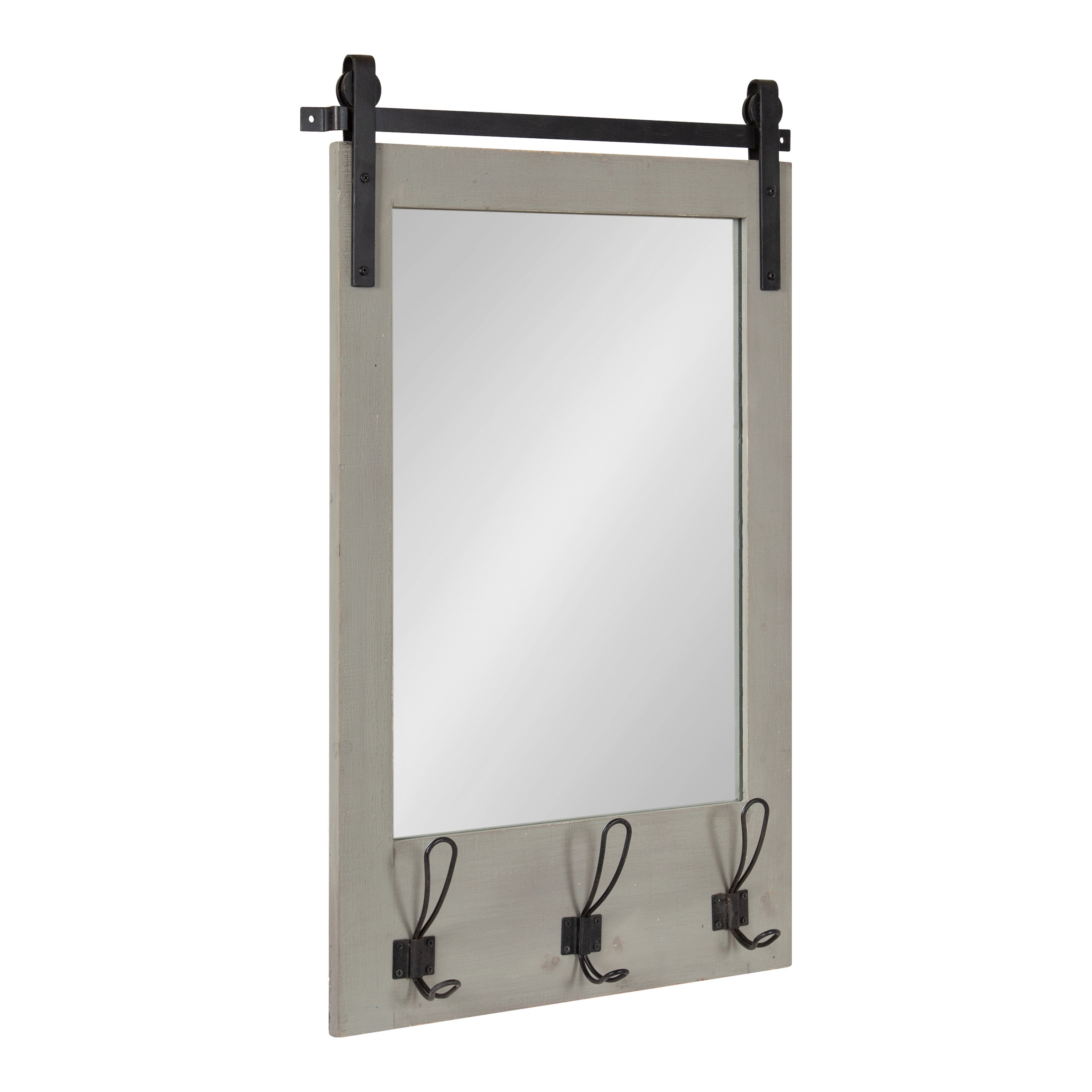 Expand upon your farmhouse style with the lovely and functional Cates wall mirror. Featuring our classic barn door styling and three hanging hooks, it's the perfect addition to any entryway, kitchen, bedroom, closet, or living room. It's great for adding your rustic sensibilities to your home while providing a functional storage area.