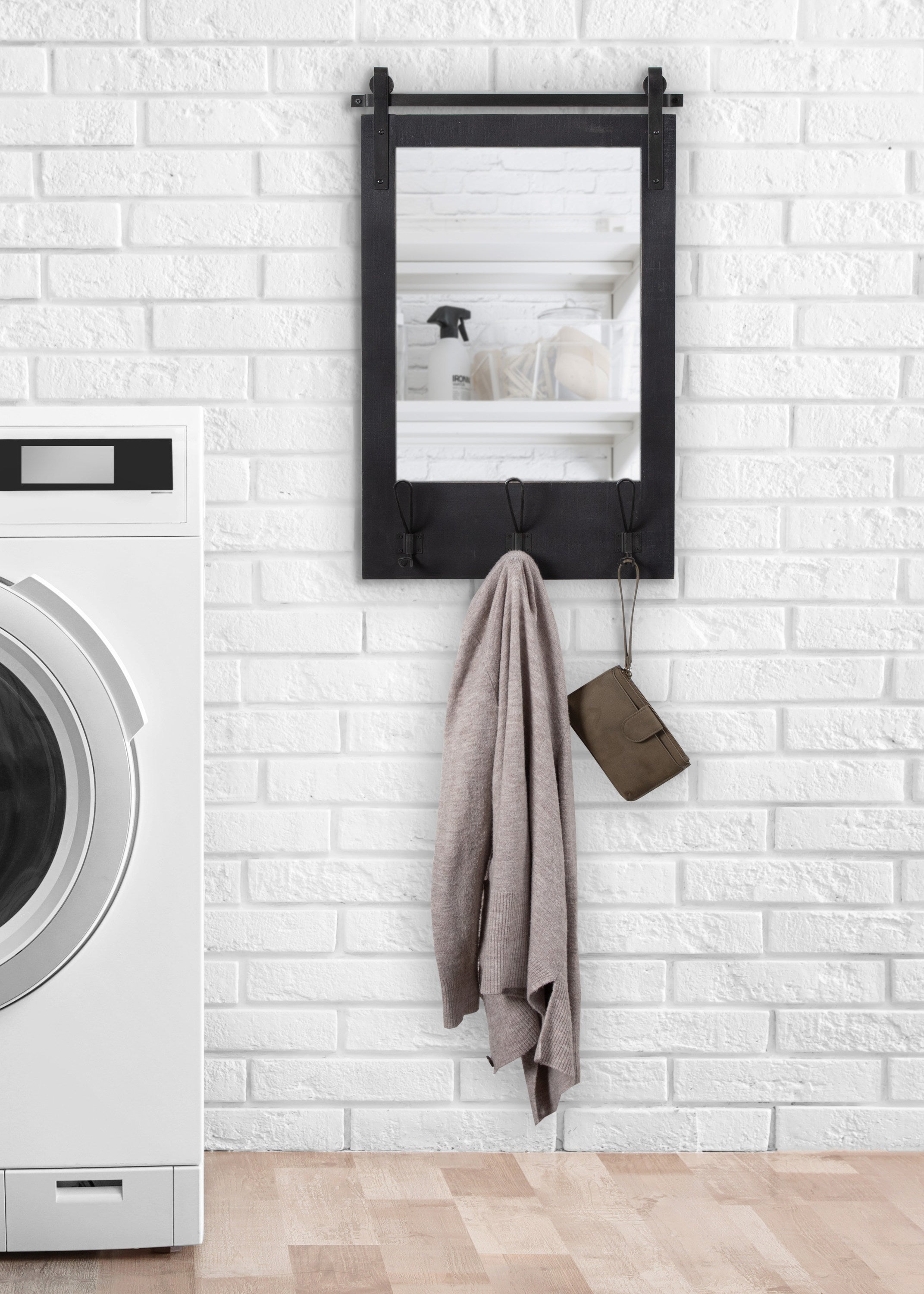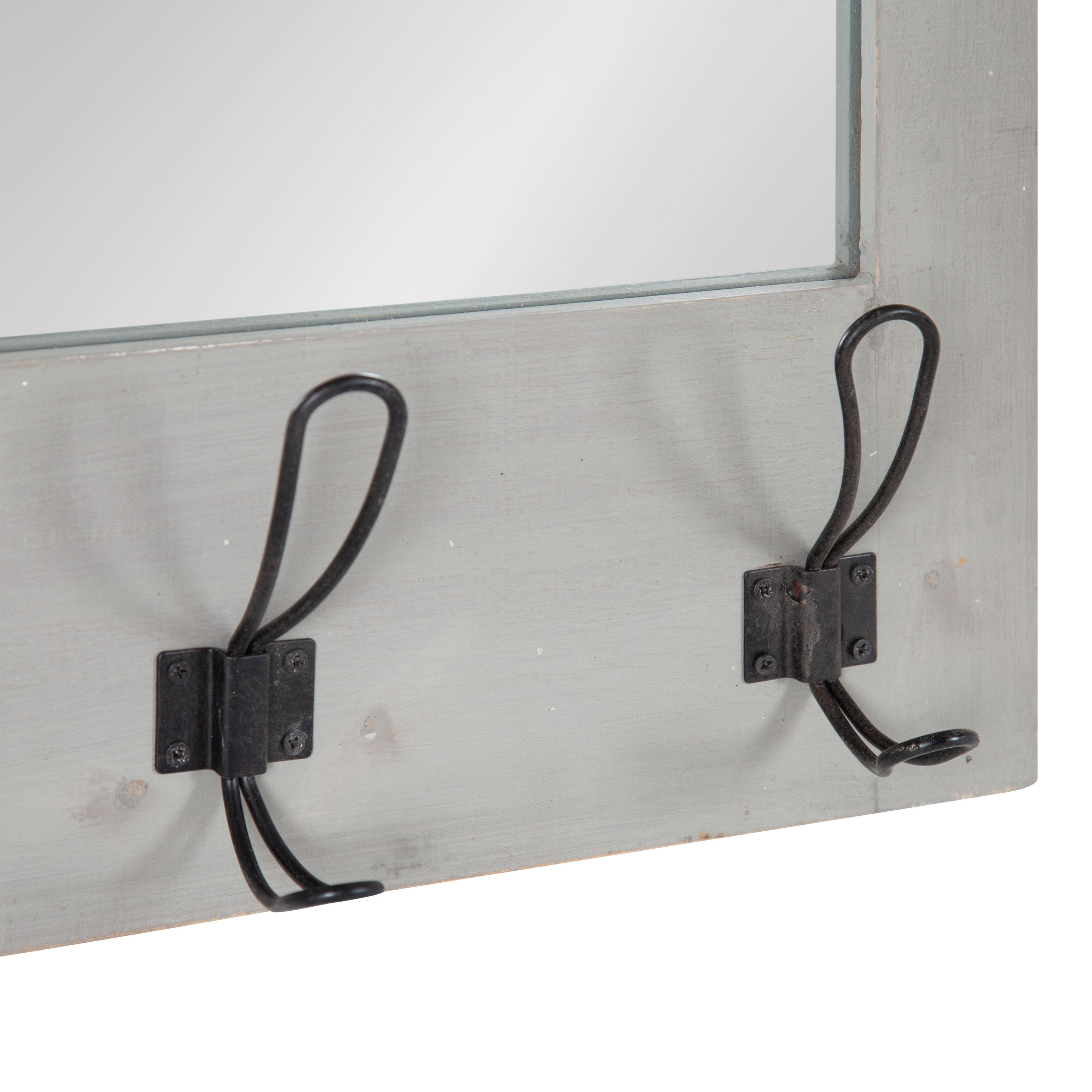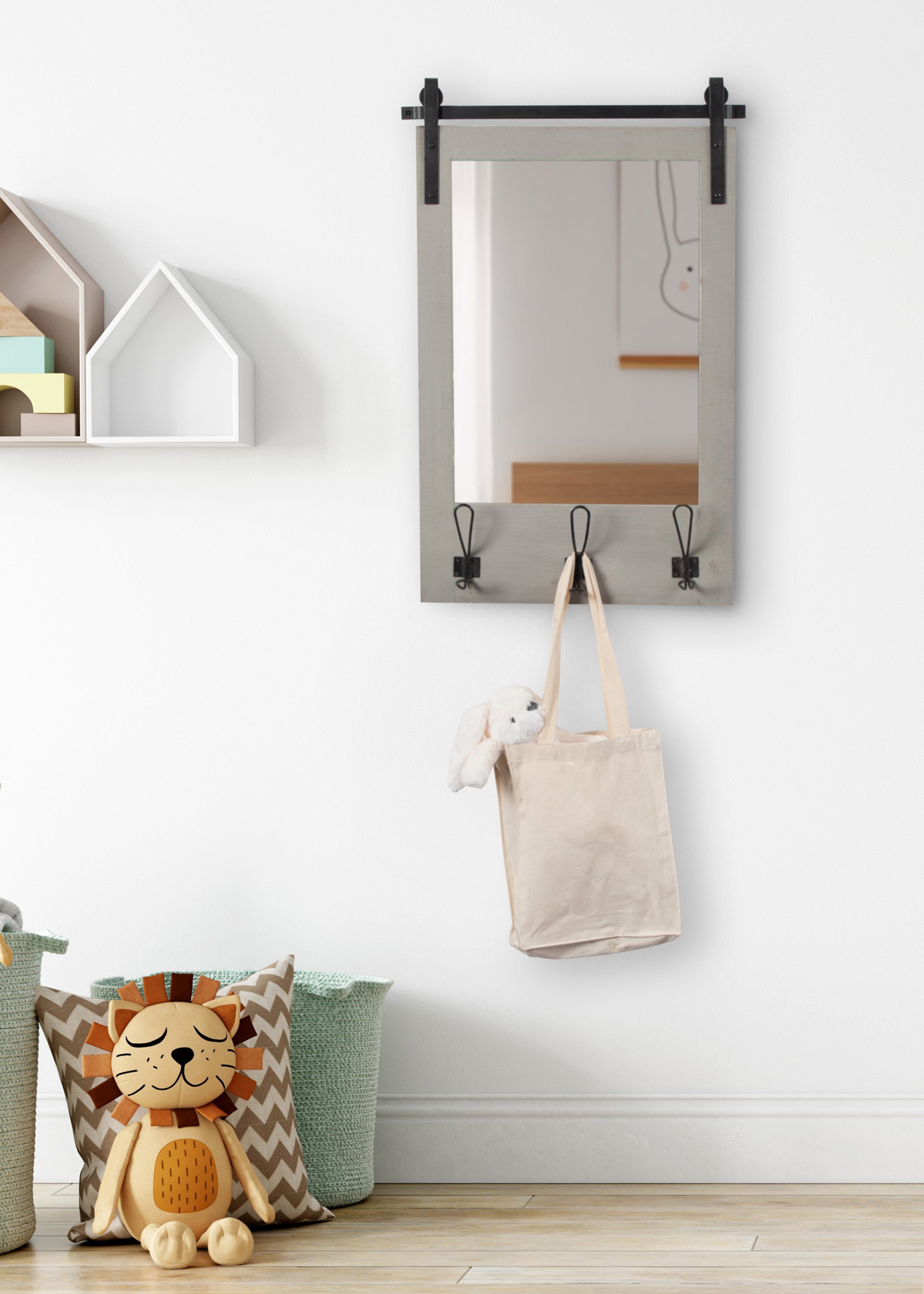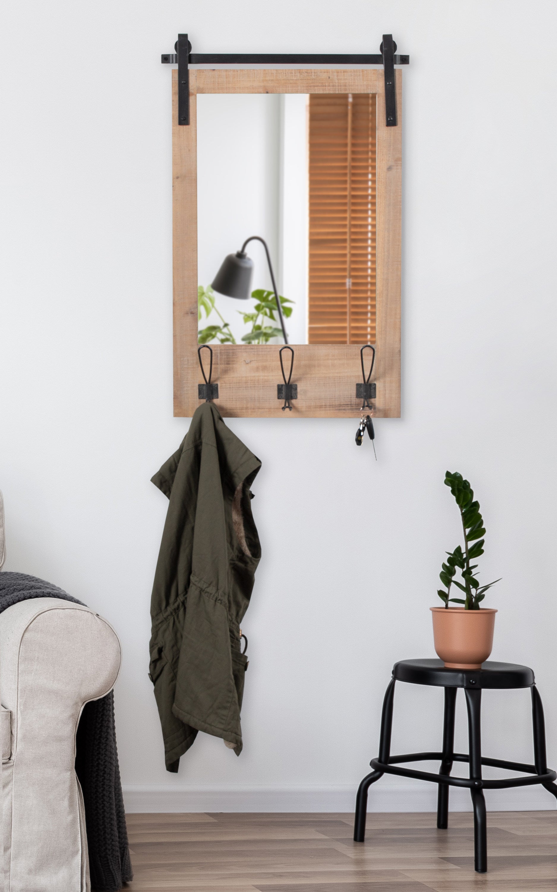Expand upon your farmhouse style with the lovely and functional Cates wall mirror. Featuring our classic barn door styling and three hanging hooks, it's the perfect addition to any entryway, kitchen, bedroom, closet, or living room. It's great for adding your rustic sensibilities to your home while providing a functional storage area.