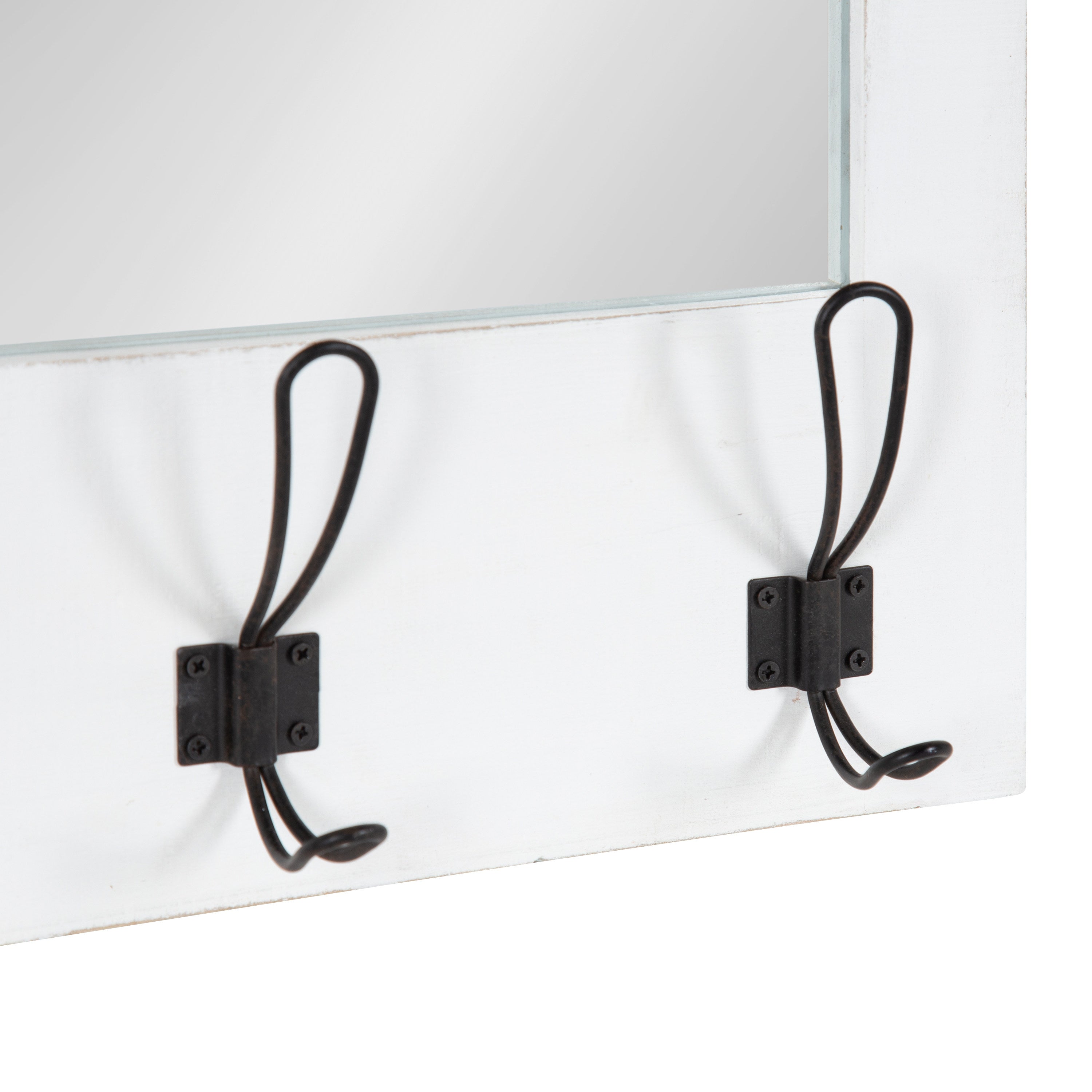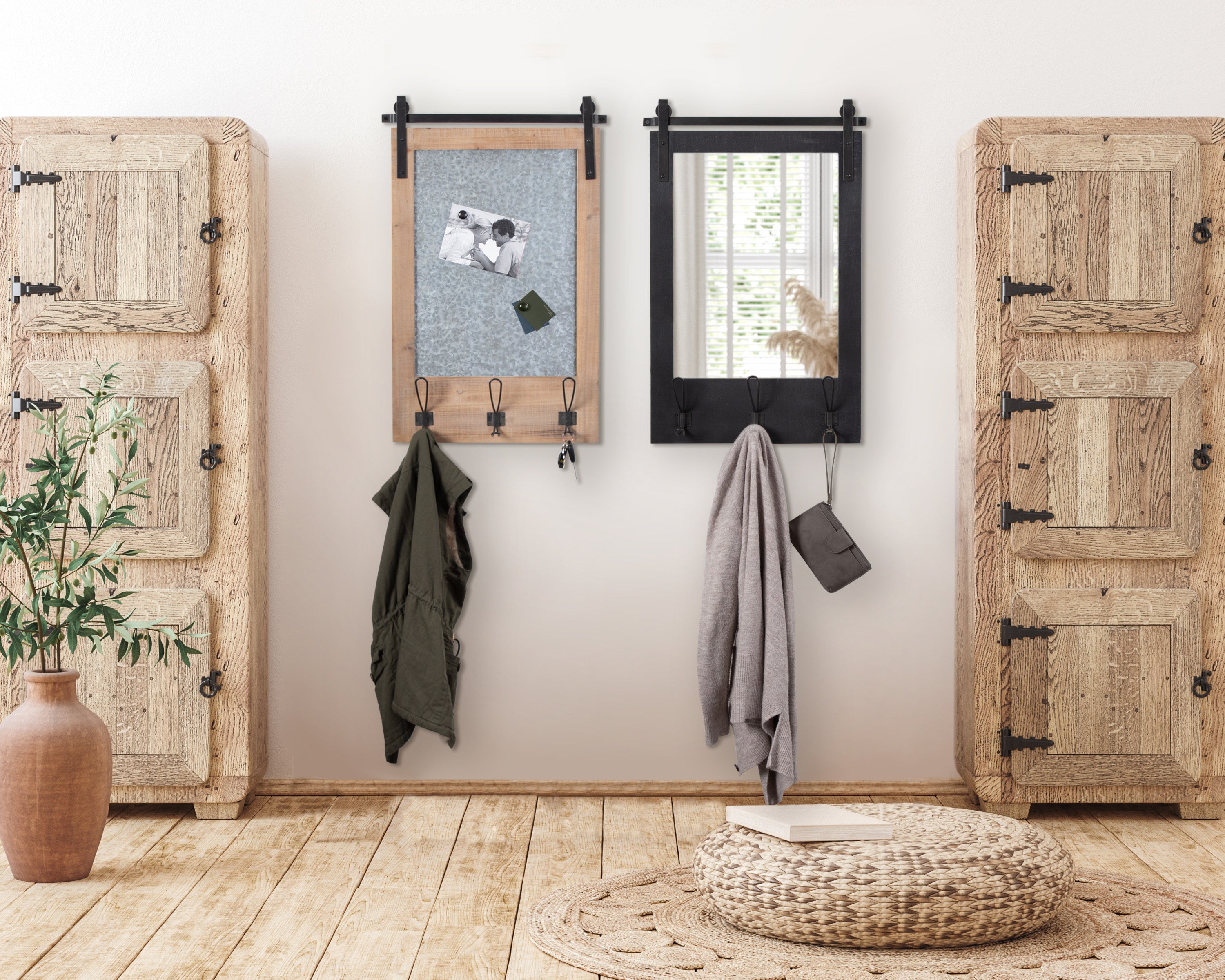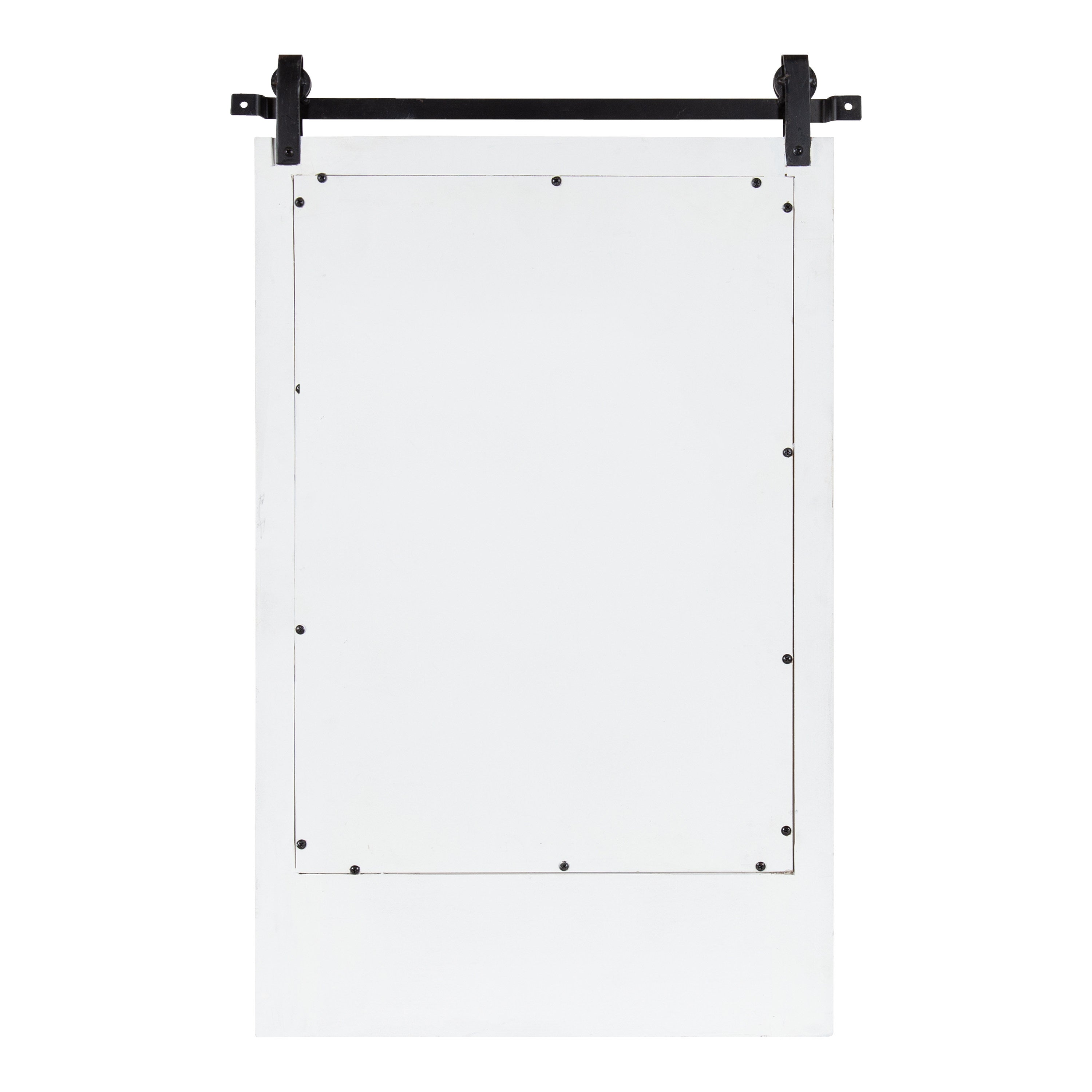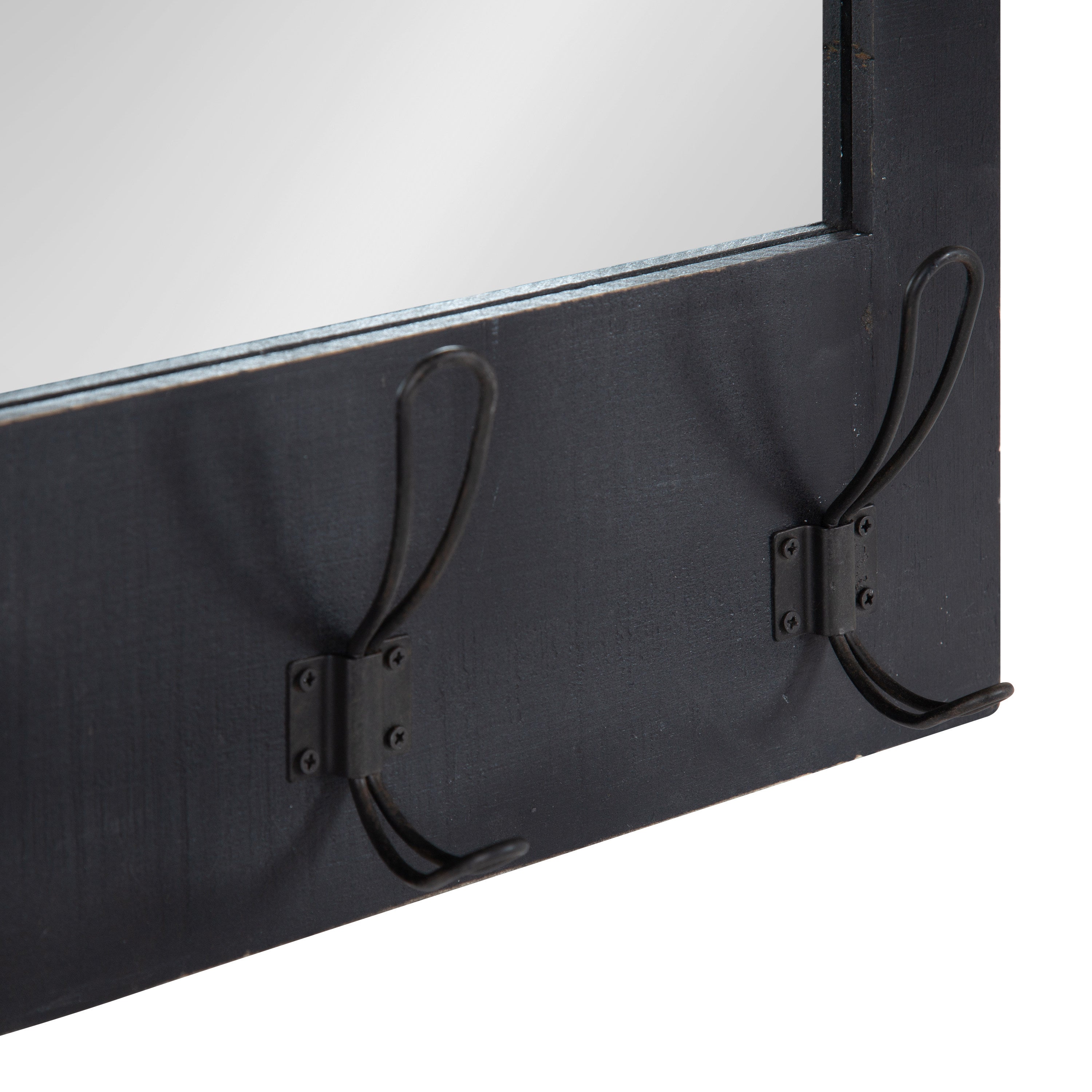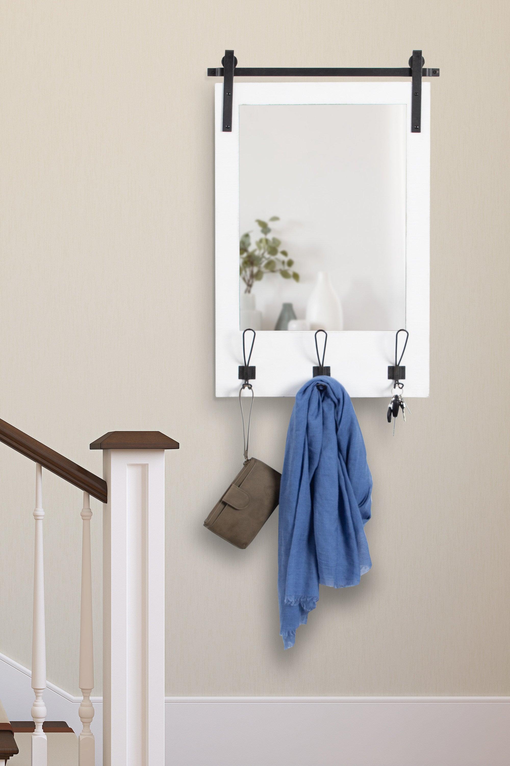 Expand upon your farmhouse style with the lovely and functional Cates wall mirror. Featuring our classic barn door styling and three hanging hooks, it's the perfect addition to any entryway, kitchen, bedroom, closet, or living room. It's great for adding your rustic sensibilities to your home while providing a functional storage area.