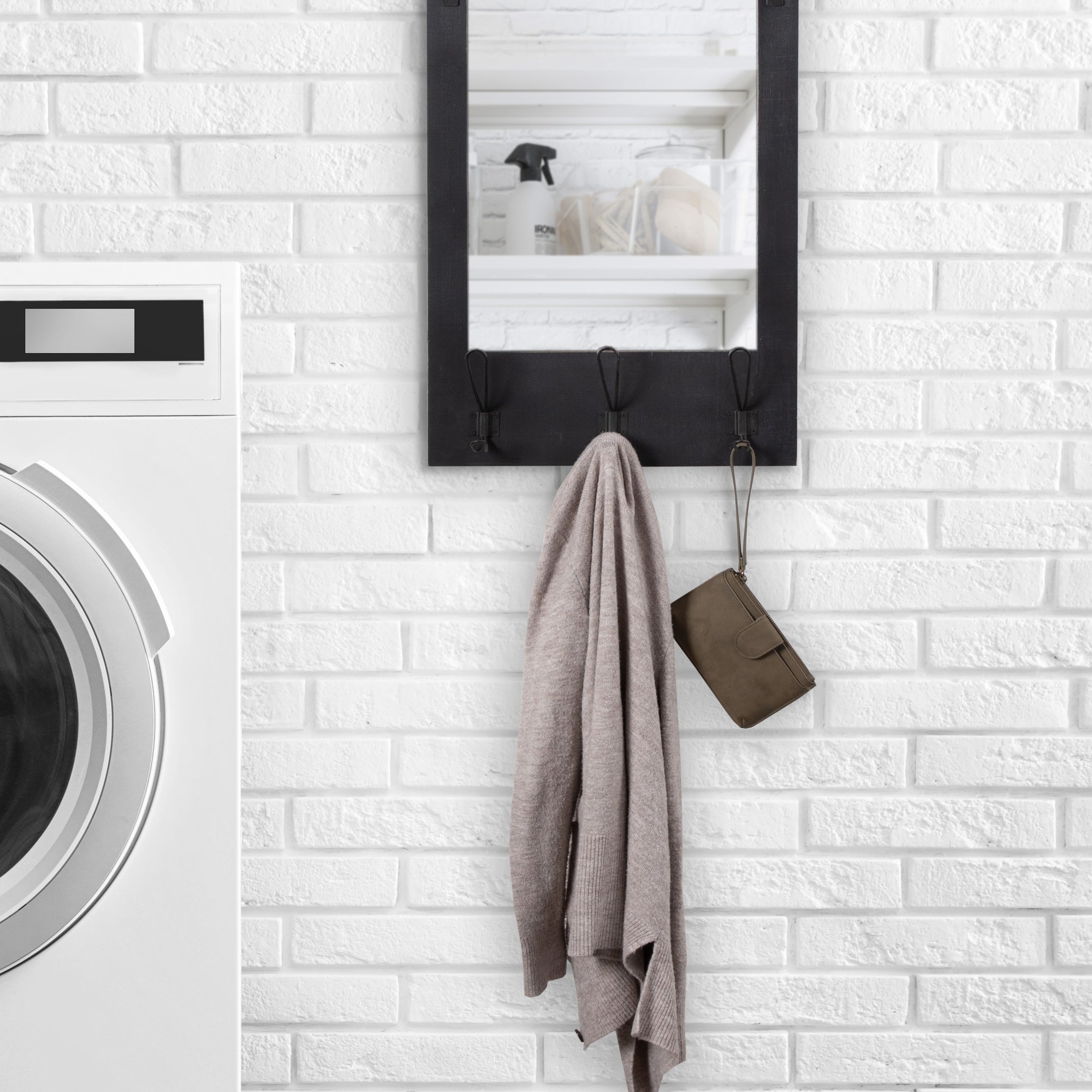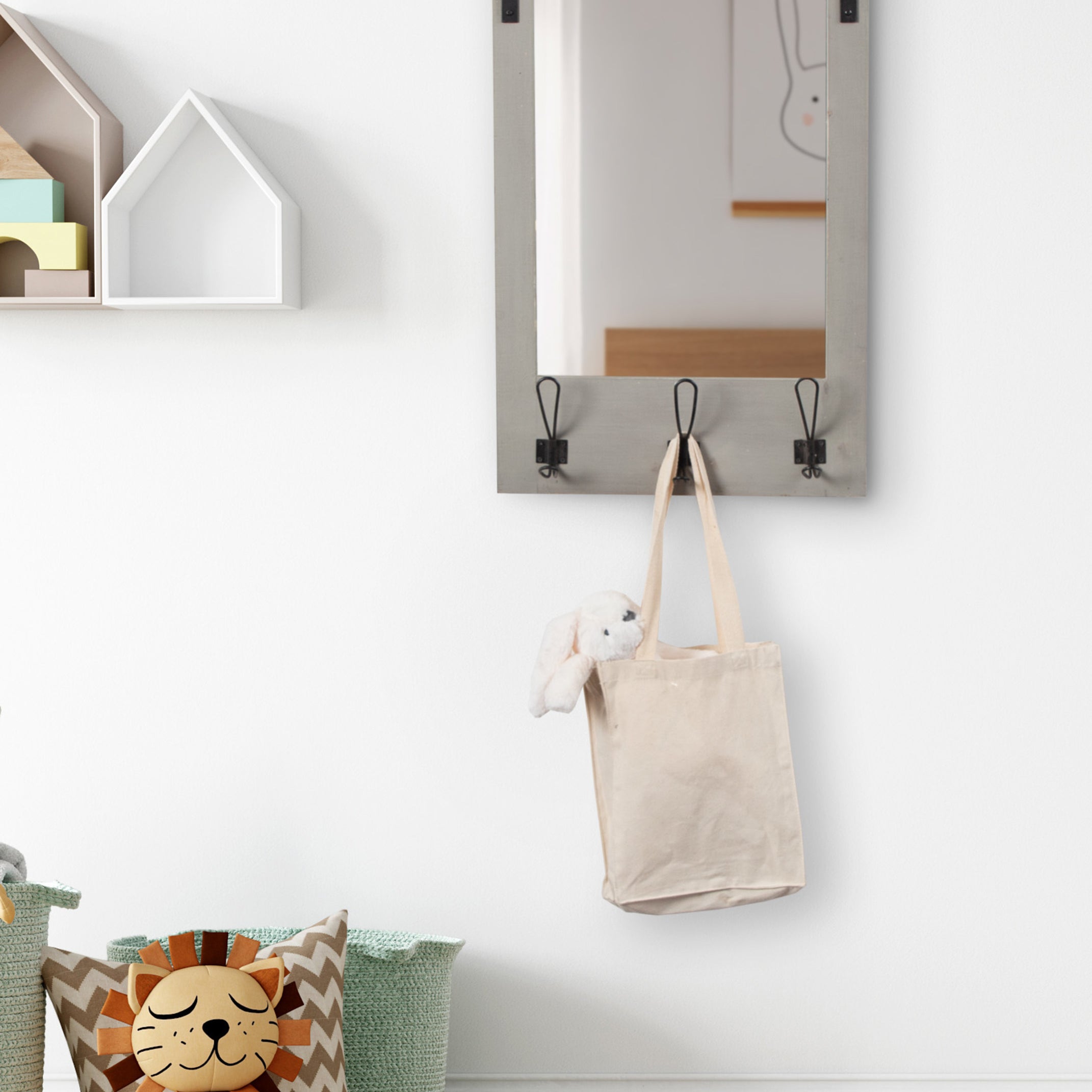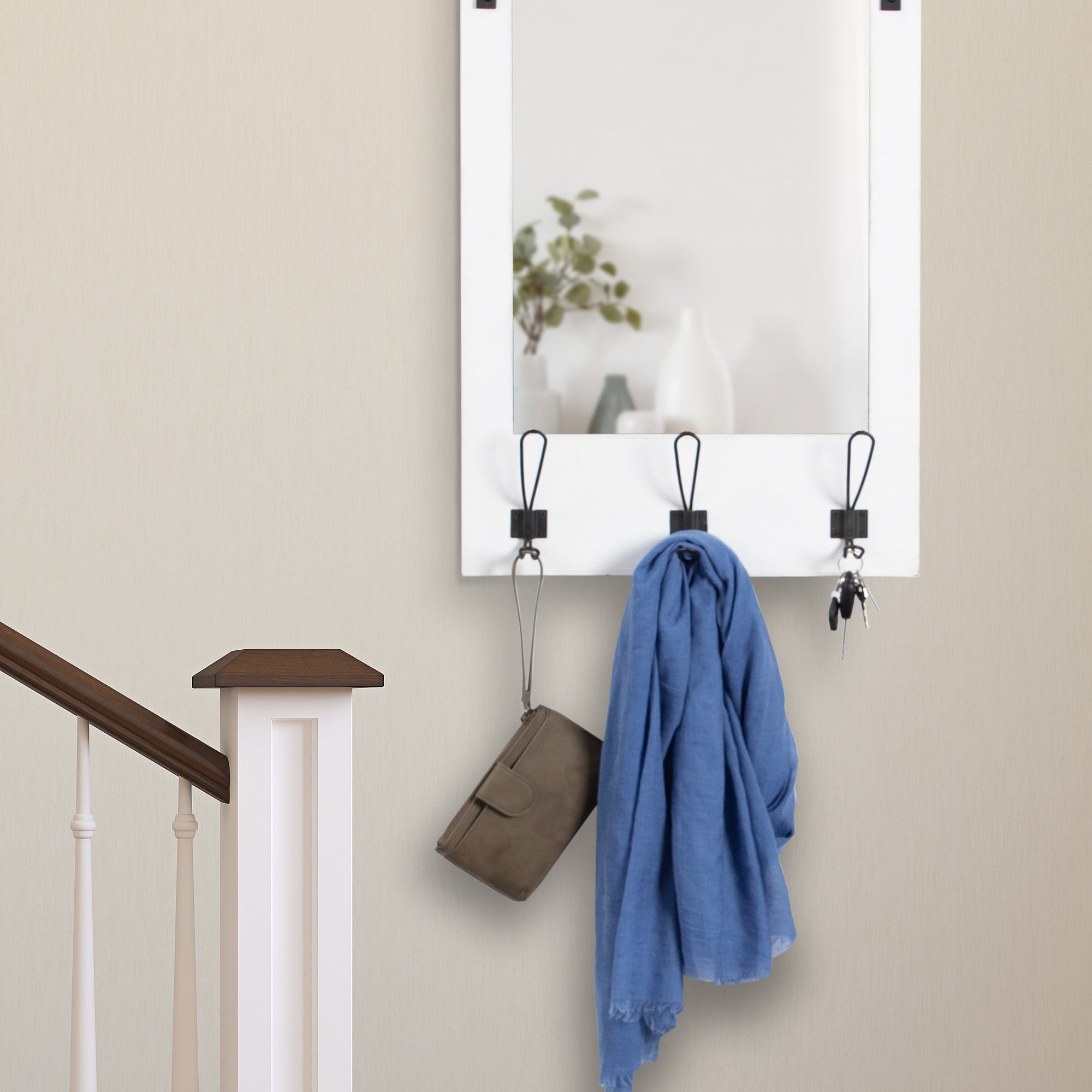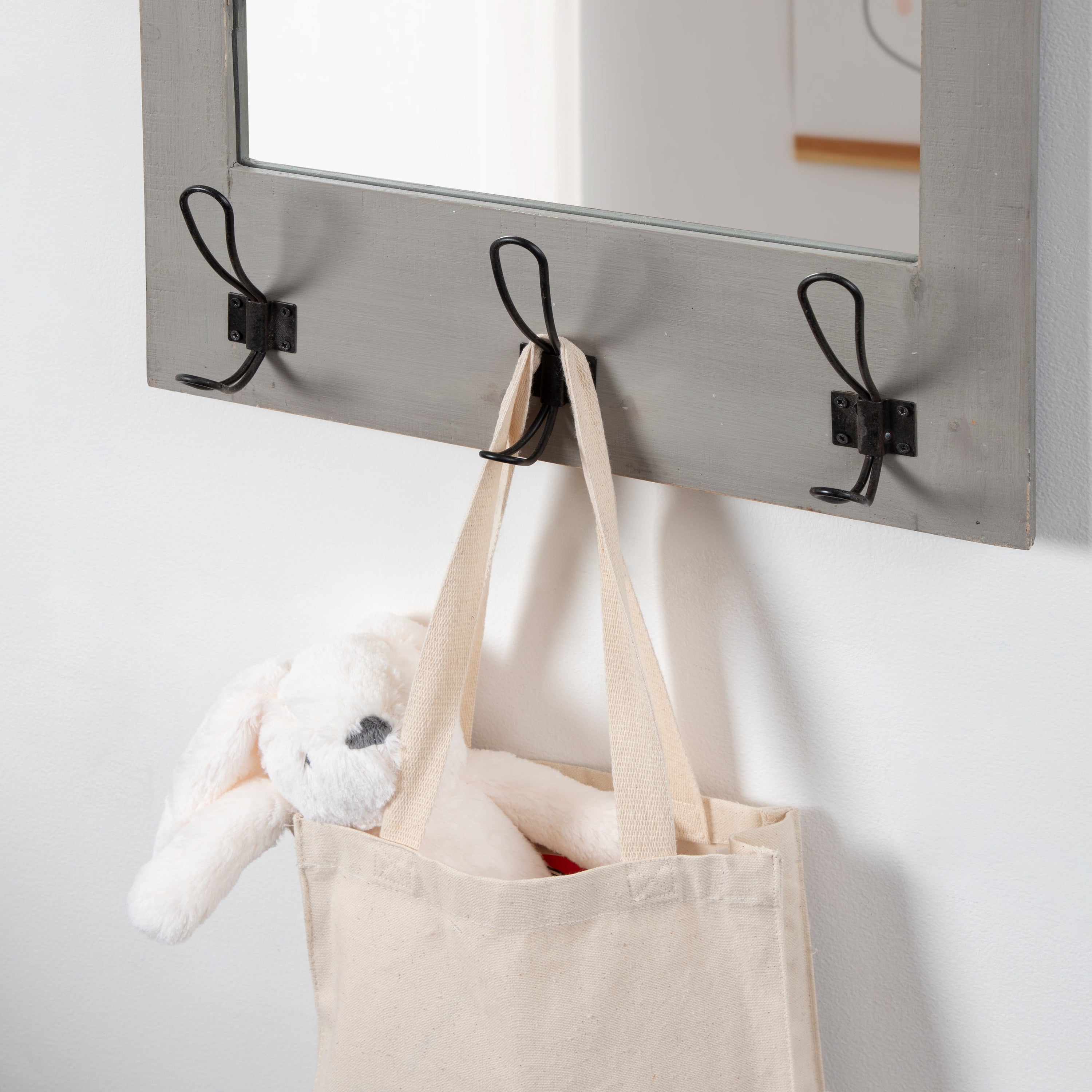 Expand upon your farmhouse style with the lovely and functional Cates wall mirror. Featuring our classic barn door styling and three hanging hooks, it's the perfect addition to any entryway, kitchen, bedroom, closet, or living room. It's great for adding your rustic sensibilities to your home while providing a functional storage area.