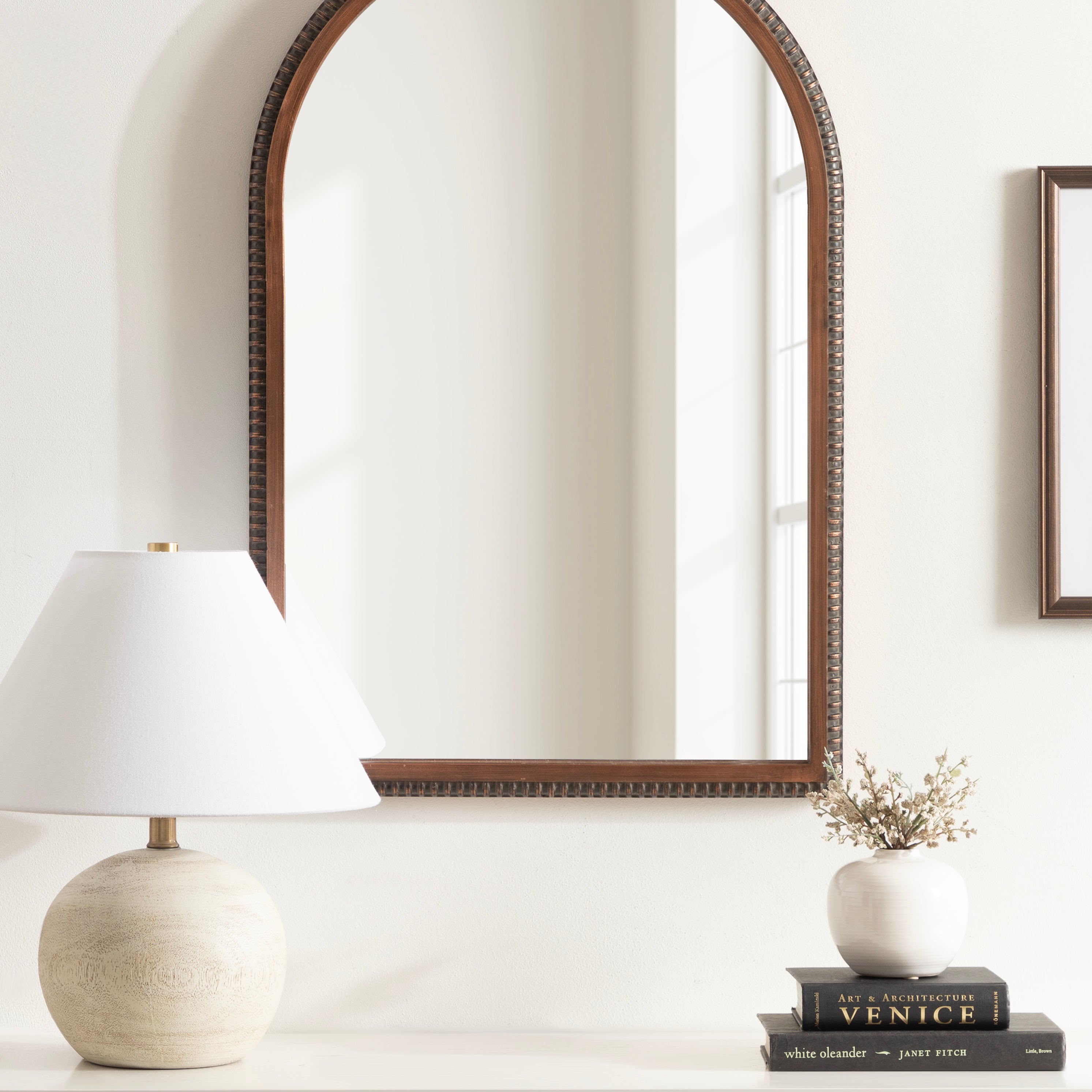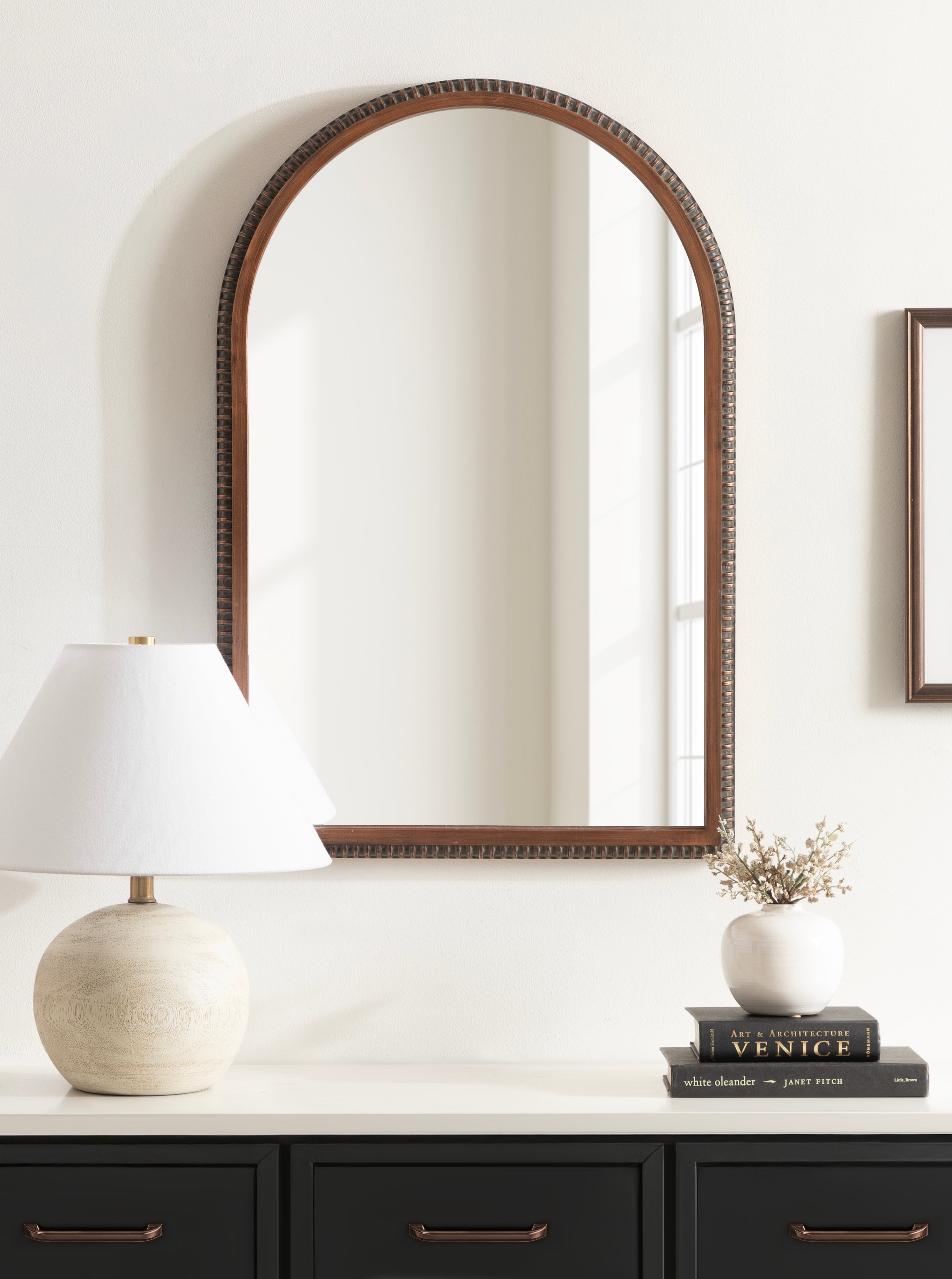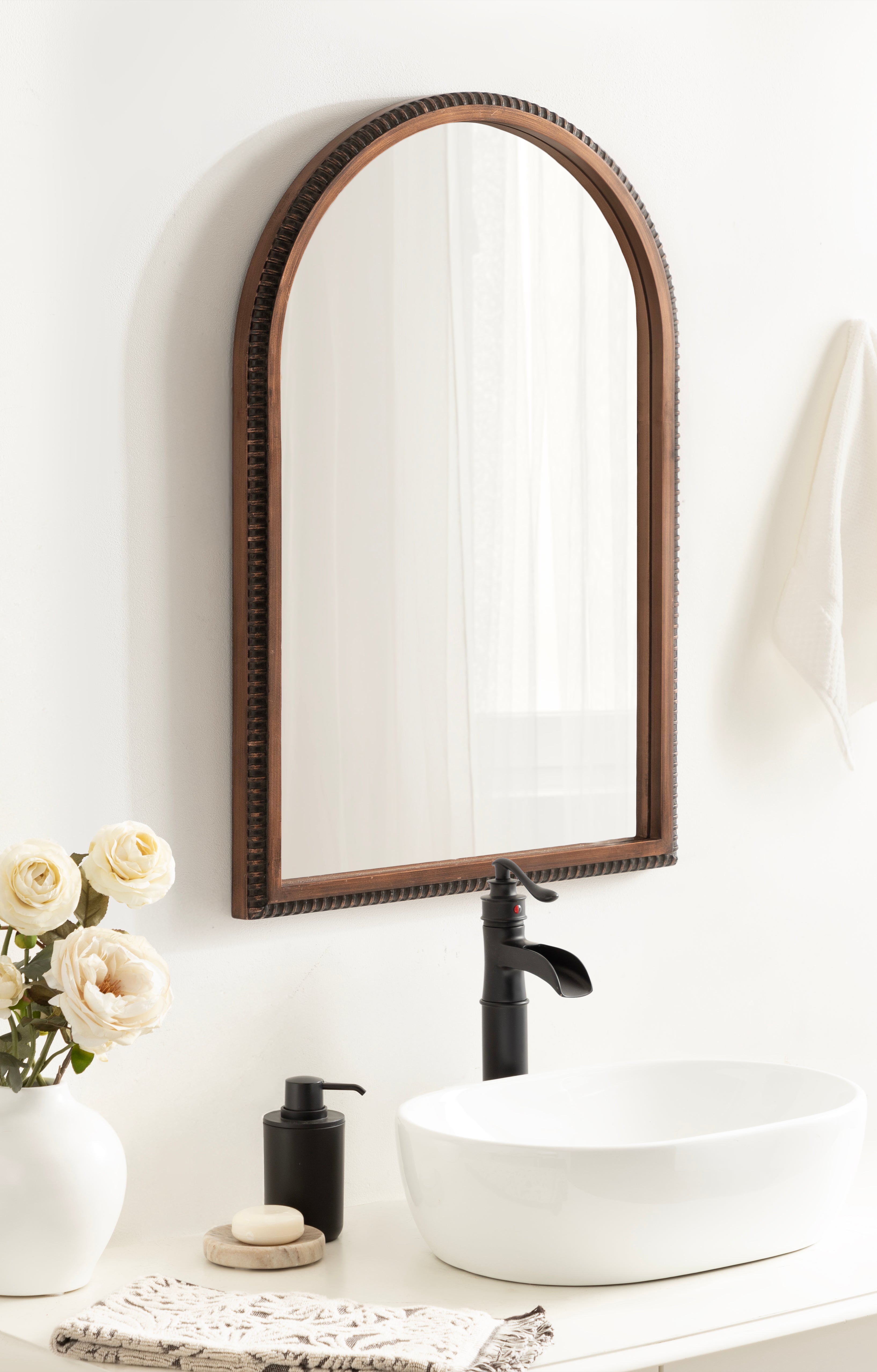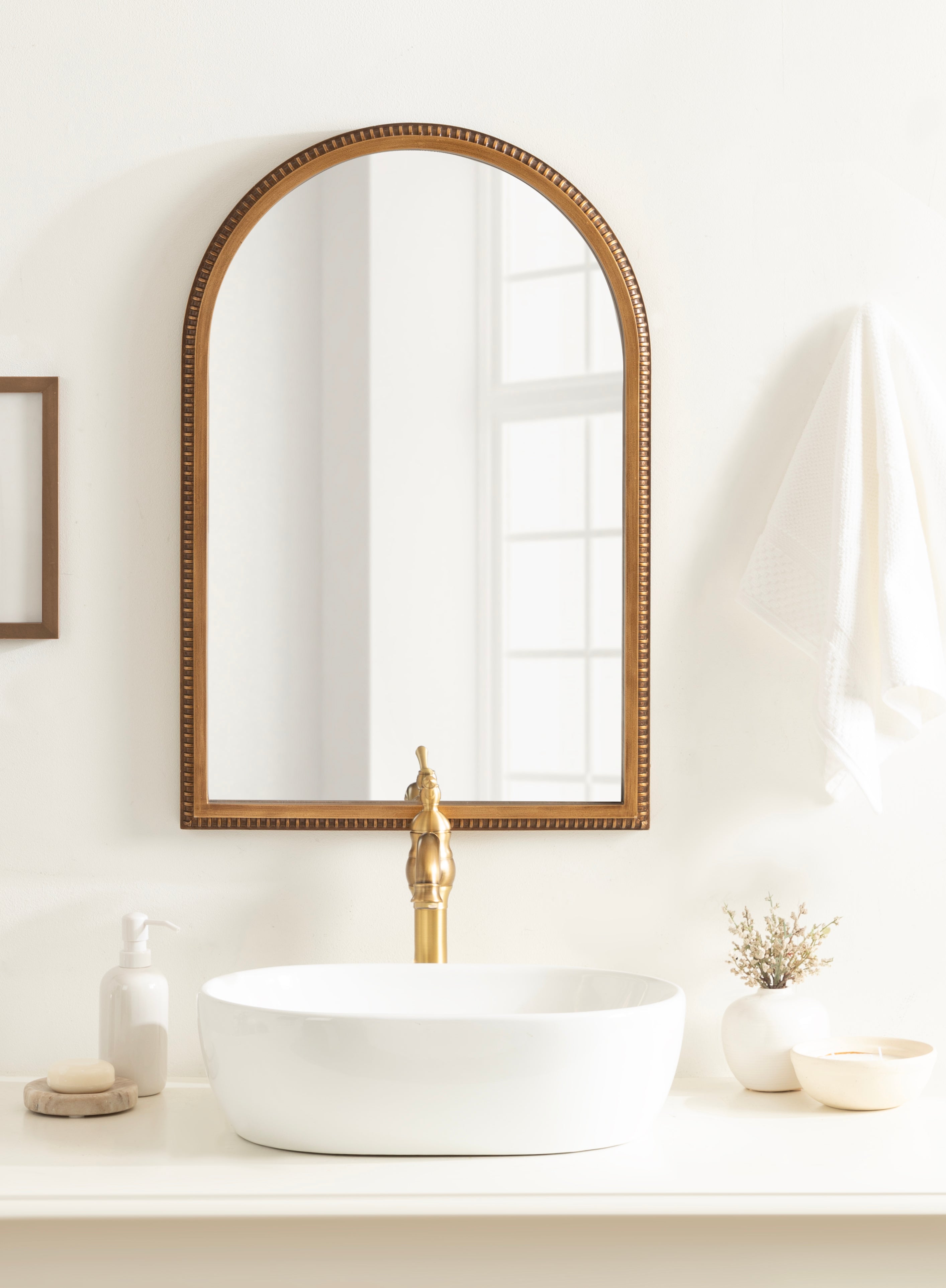 Create a vibrant and sophisticated wall display in your home with the Chaston wall mirror. Created for the modern designer with a flair for hints of antique decor, the Chaston mirror features a trendy yet simple arched shape with an intricate beaded design on the frame that emanates a bold and contemporary style. Create a bold focal point with this arched mirror and its versatile size, enhancing the dimension and vibrancy of your space by highlighting light sources and brightening darker corners. It's also a fantastic accent piece to showcase over your fireplace, console, bed, or couch to add that extra piece your decor needs to stand out. The Chaston's surface area makes it an excellent vanity mirror in your powder room or master bathroom above an elegant sink. Its arched shape and bold look are fabulous for introducing a glamorous decor theme to your home.