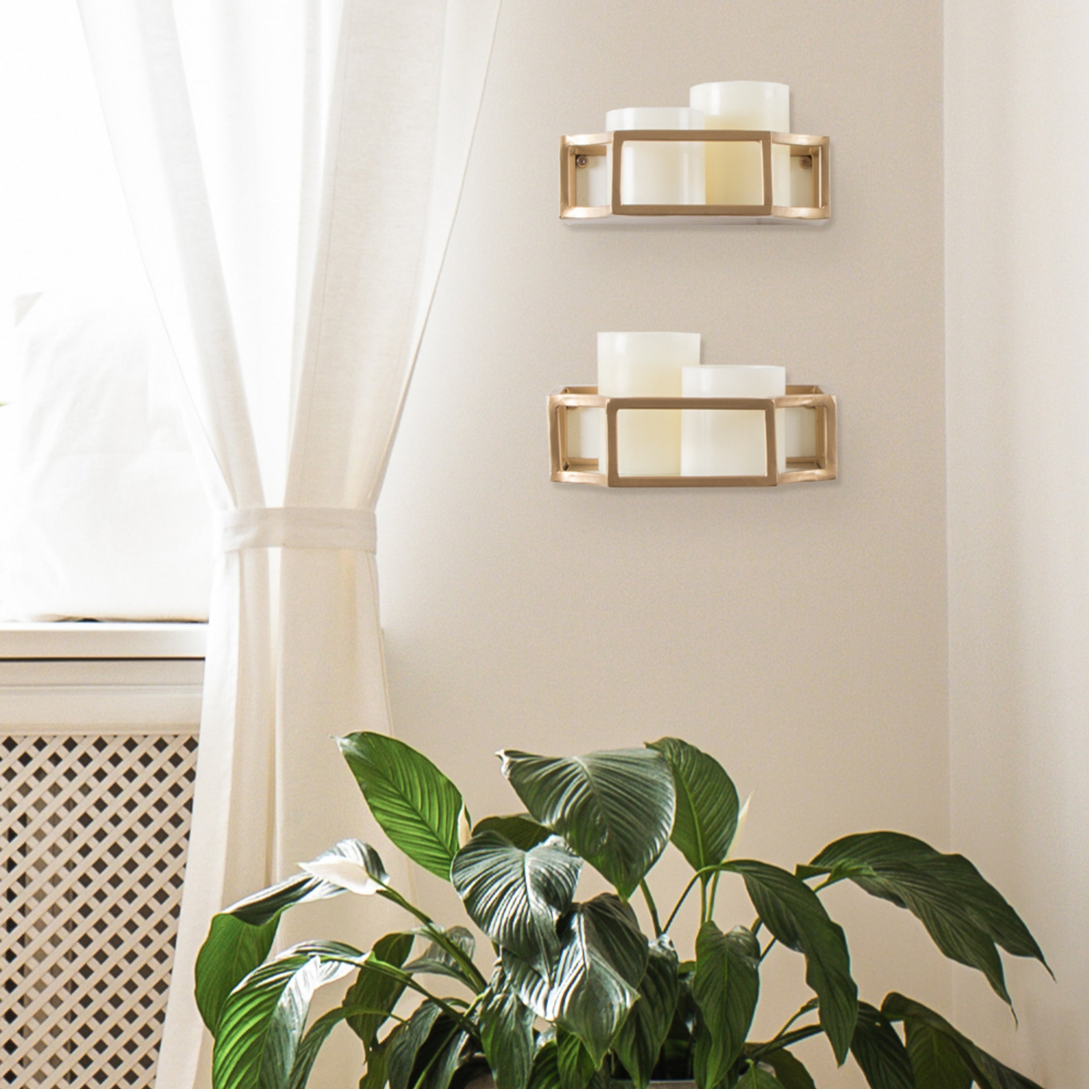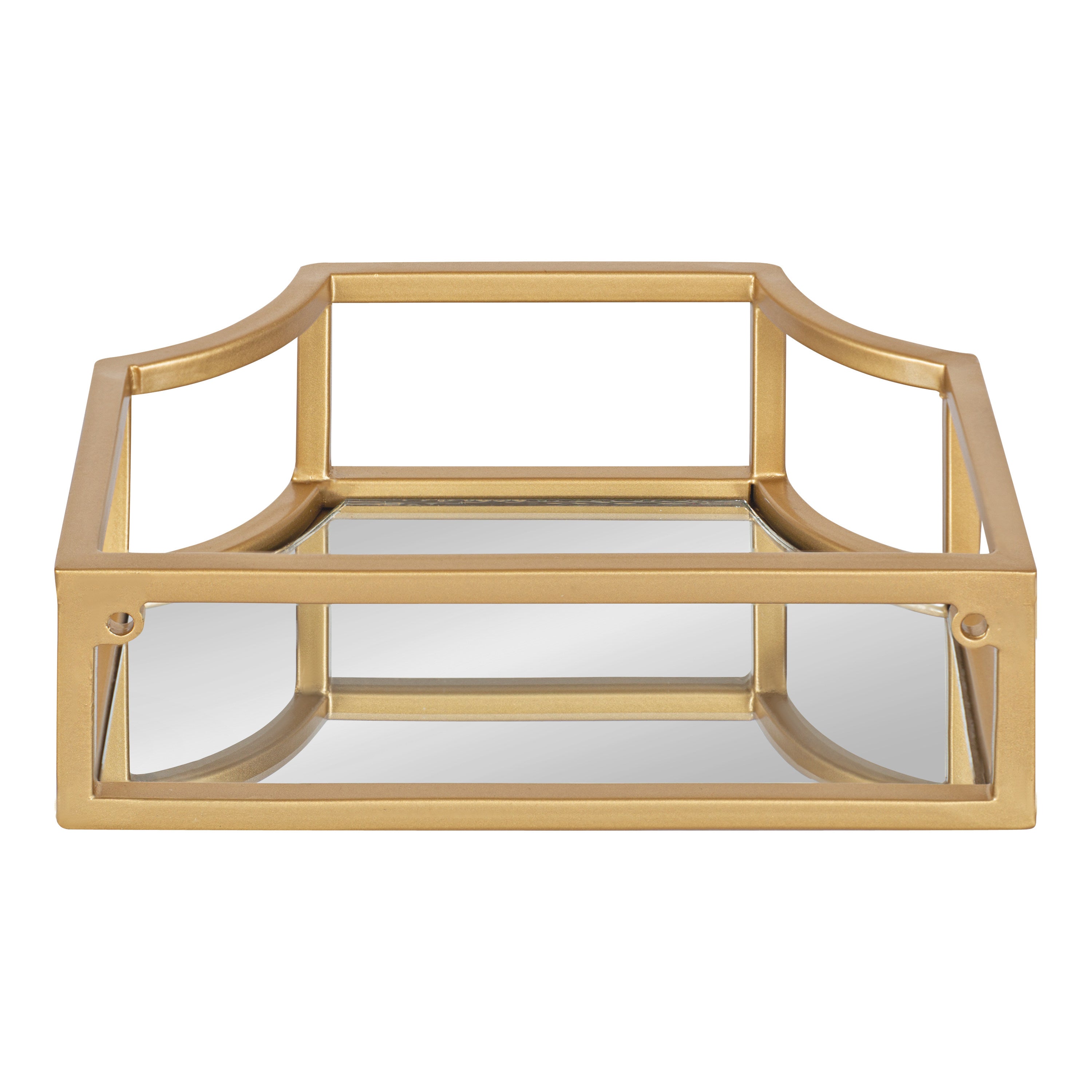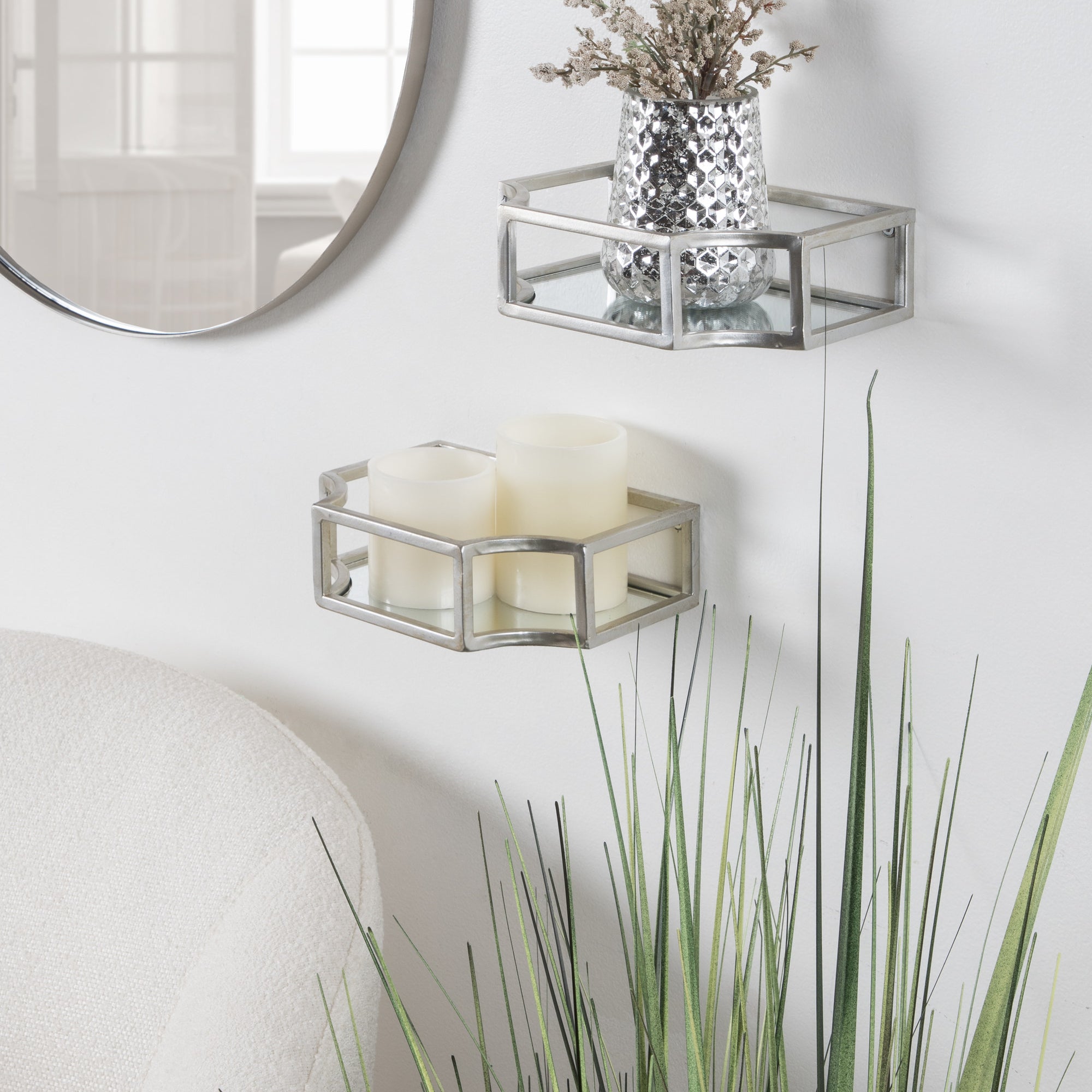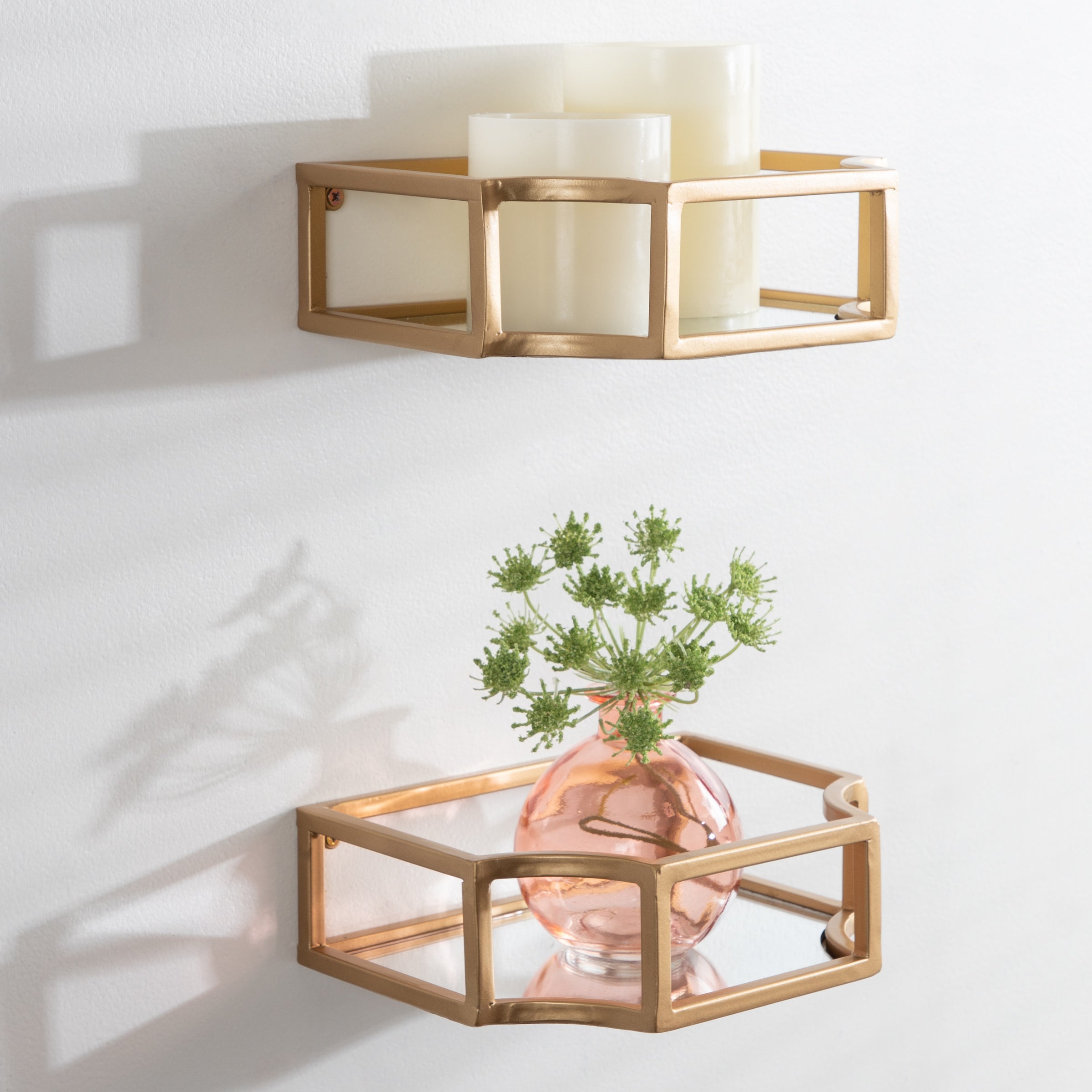 Showcase your glamorous style with a pair of floating wall shelves throughout your home. The Ciel shelf set features a geometric design with scalloped corners, emphasizing dramatic aesthetics, and clean lines. They have a metal frame with a glass bottom that's perfect for plants, candles, keys, and more.