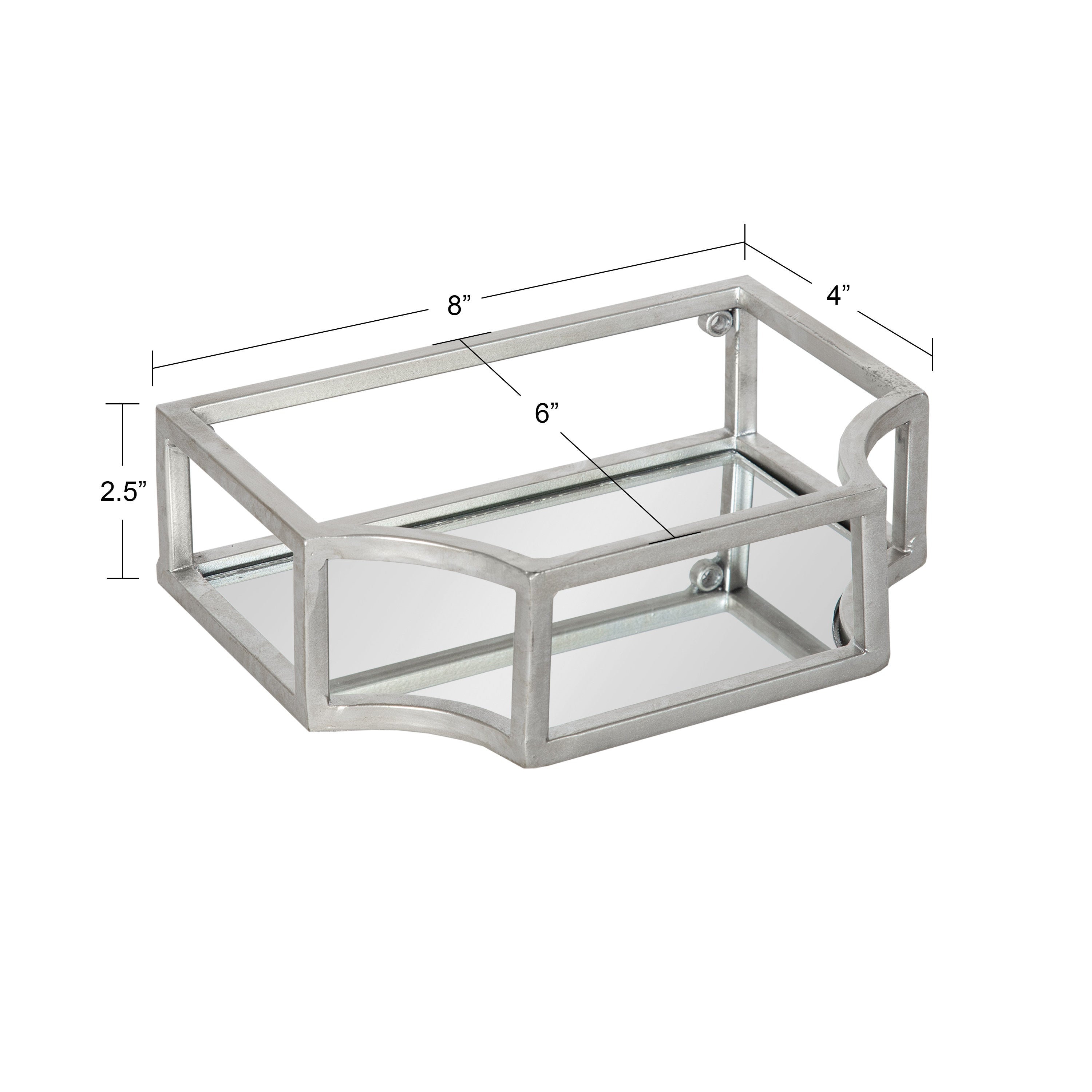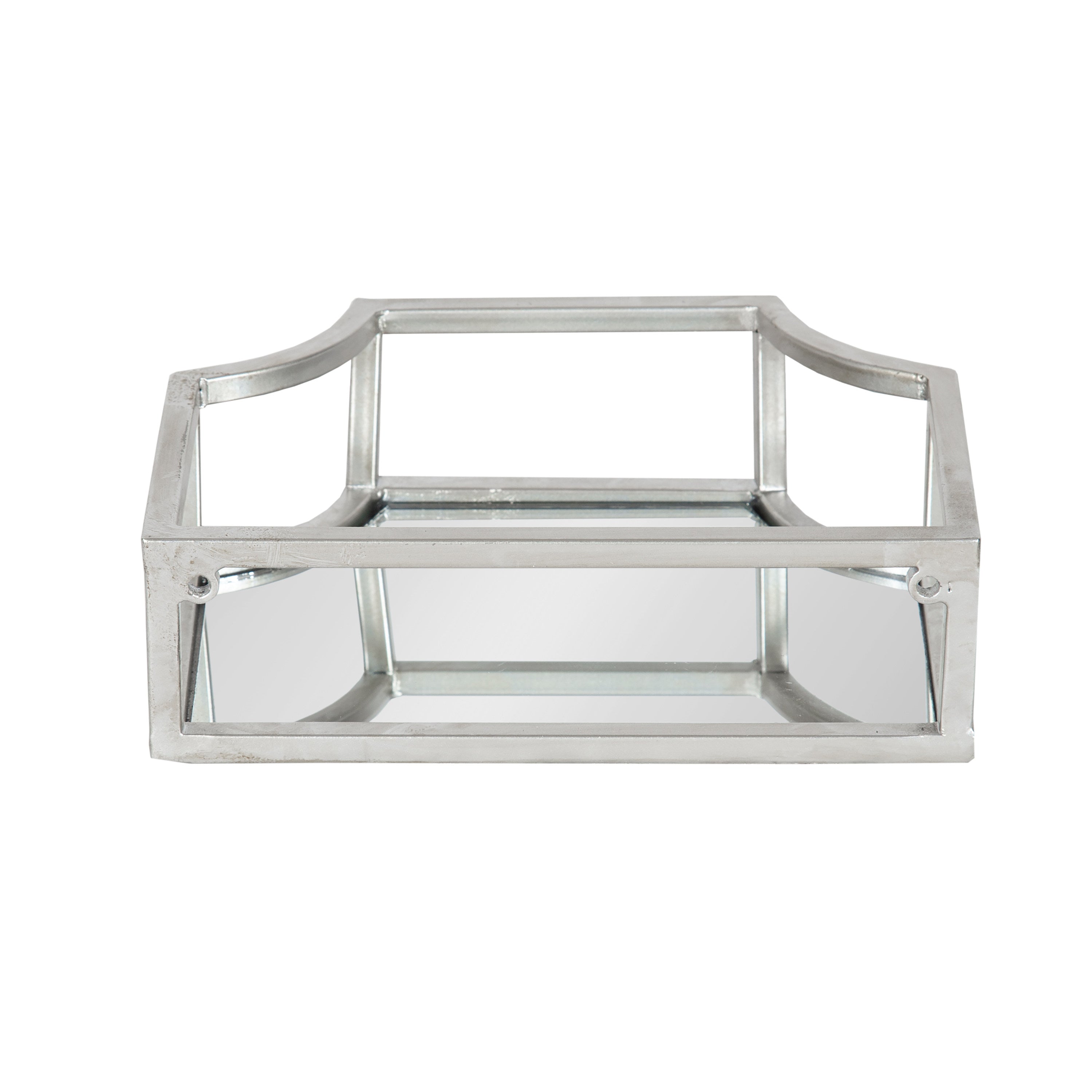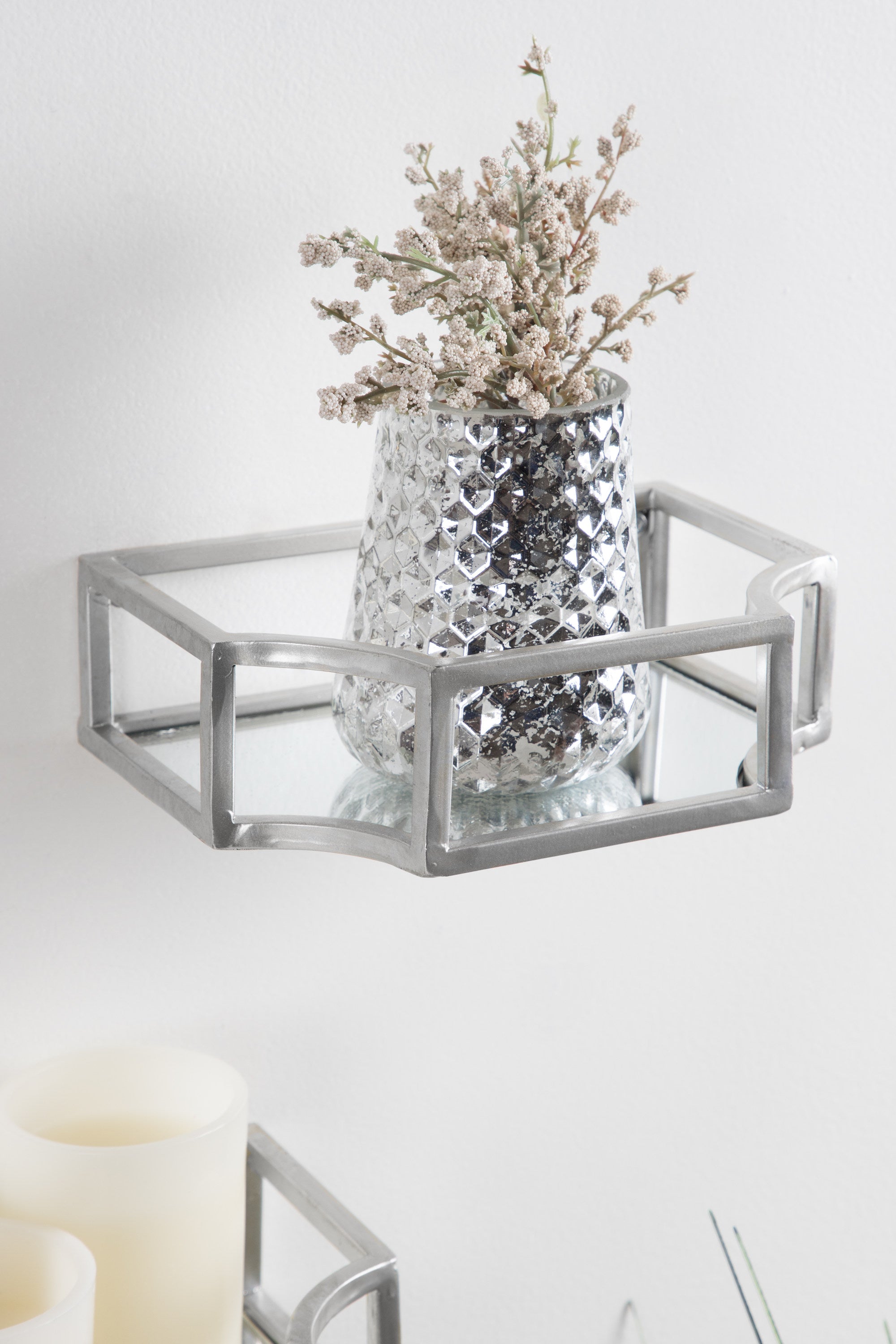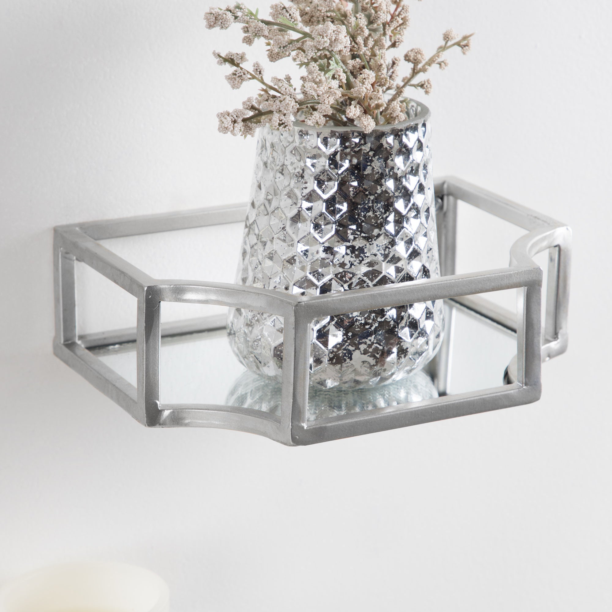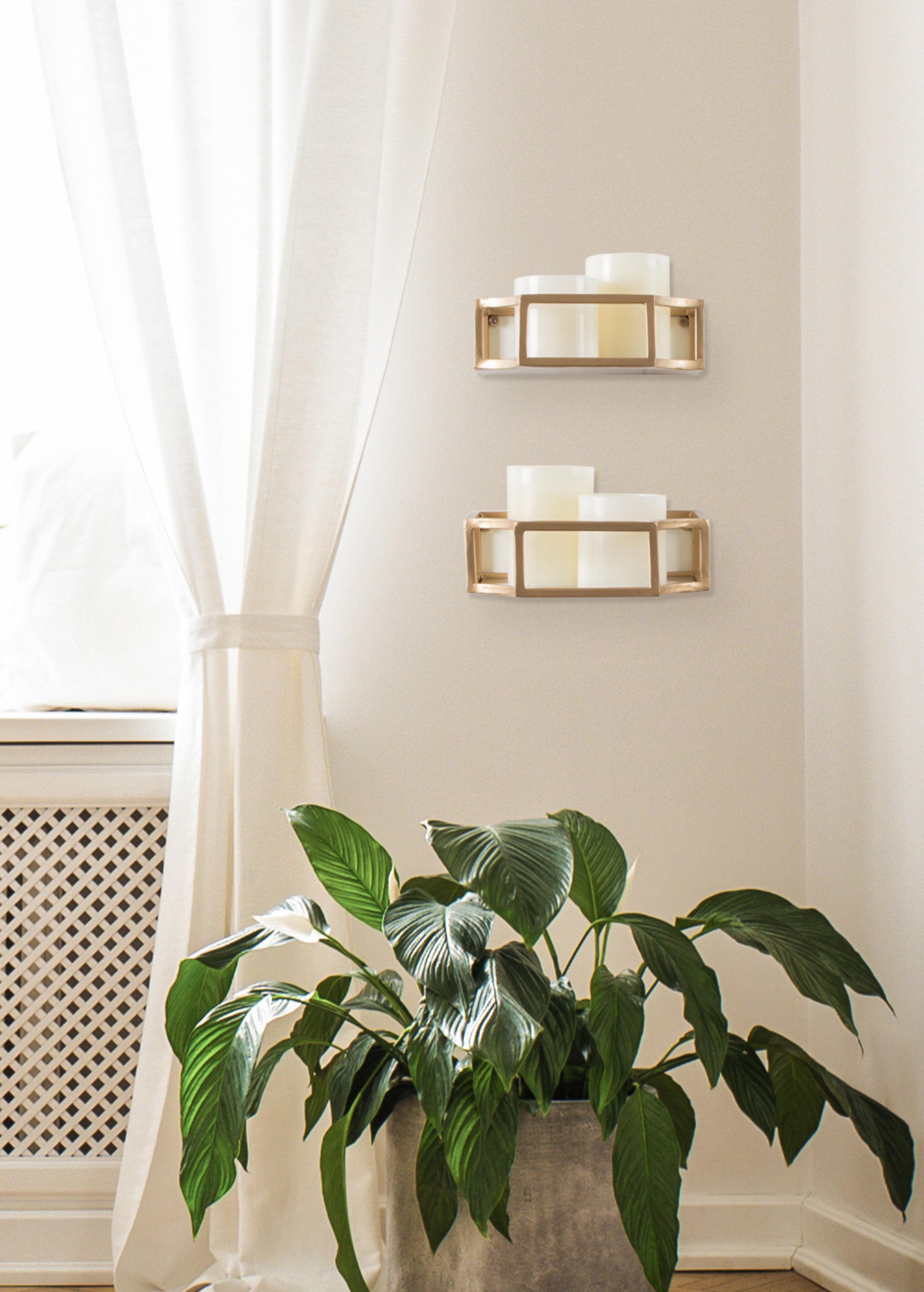 Showcase your glamorous style with a pair of floating wall shelves throughout your home. The Ciel shelf set features a geometric design with scalloped corners, emphasizing dramatic aesthetics, and clean lines. They have a metal frame with a glass bottom that's perfect for plants, candles, keys, and more.