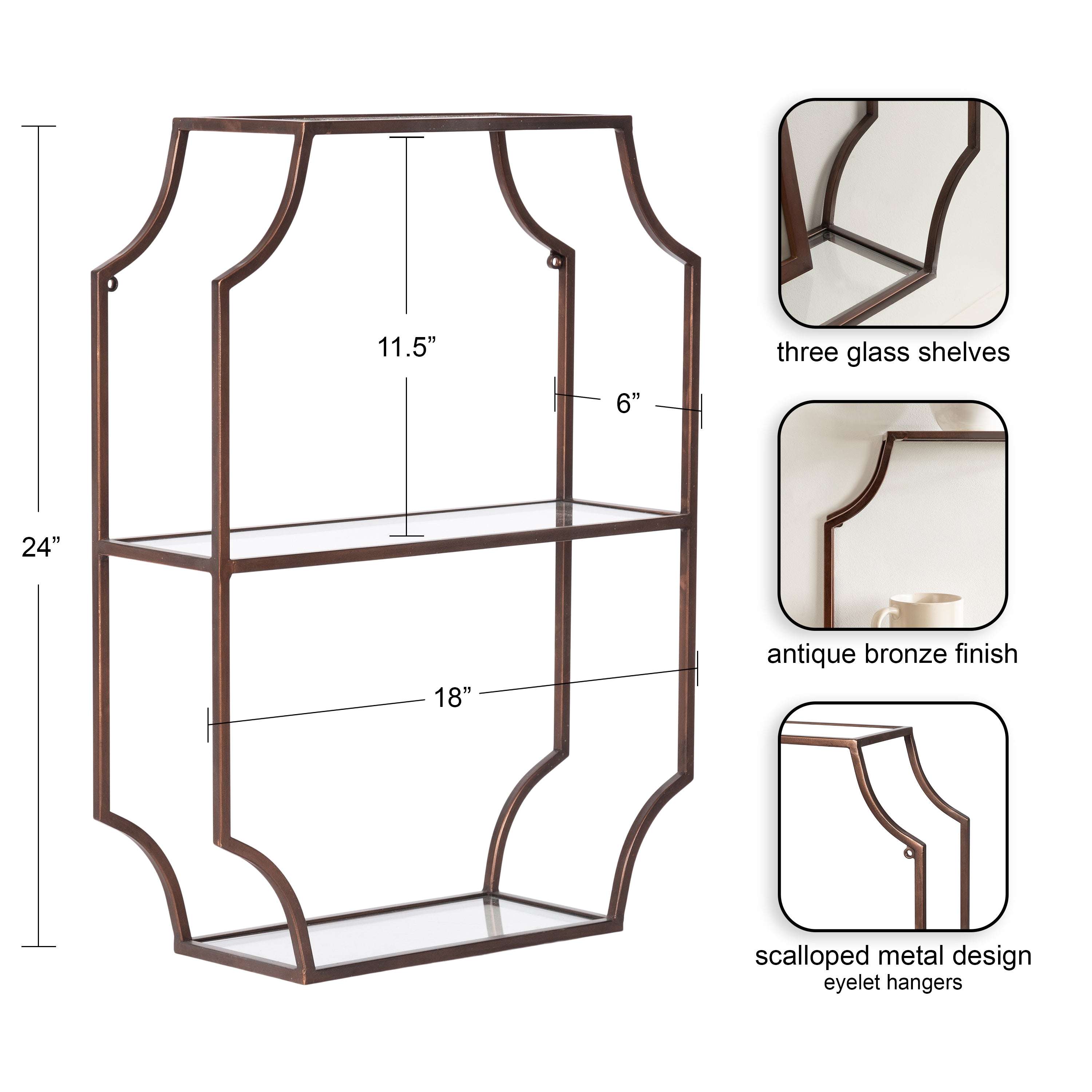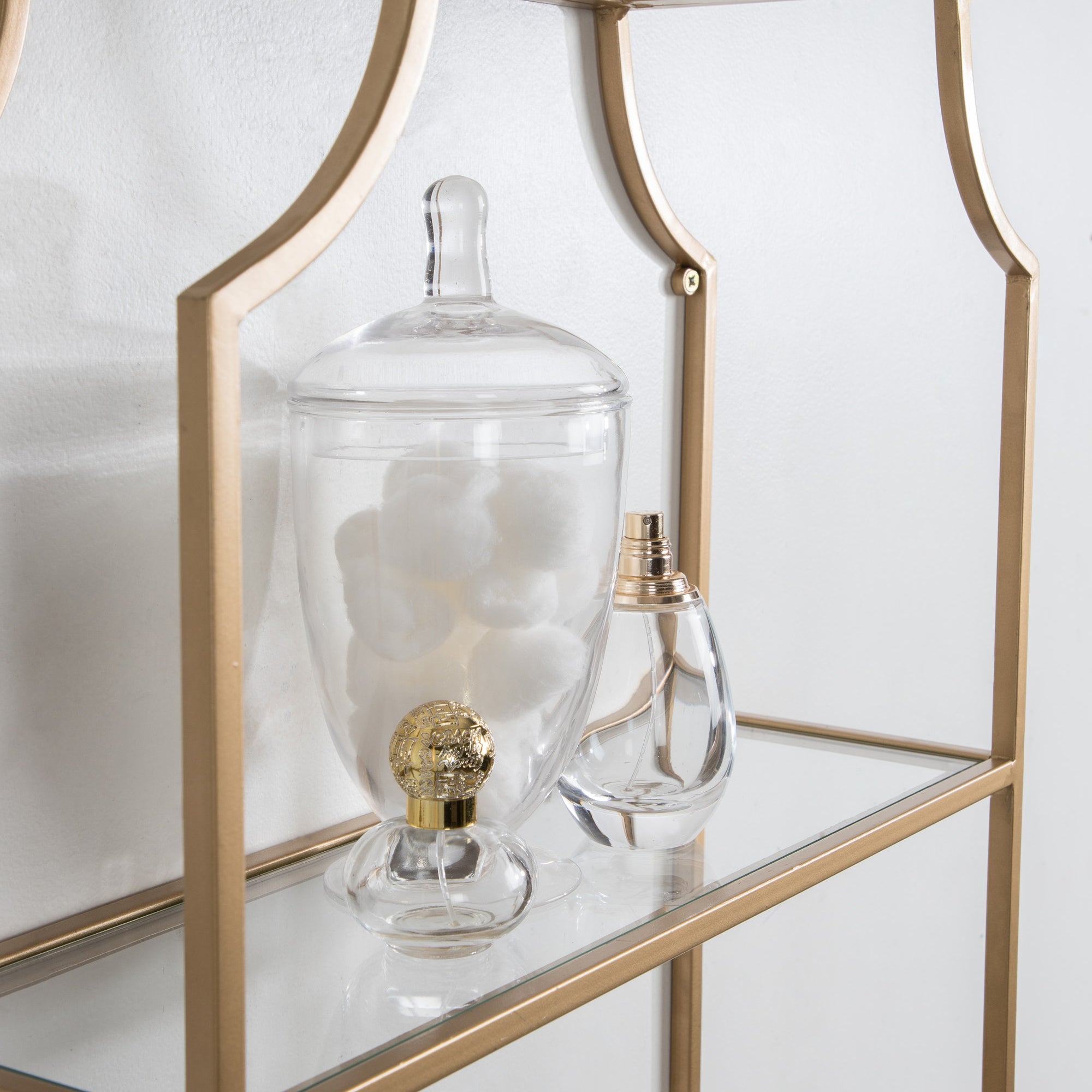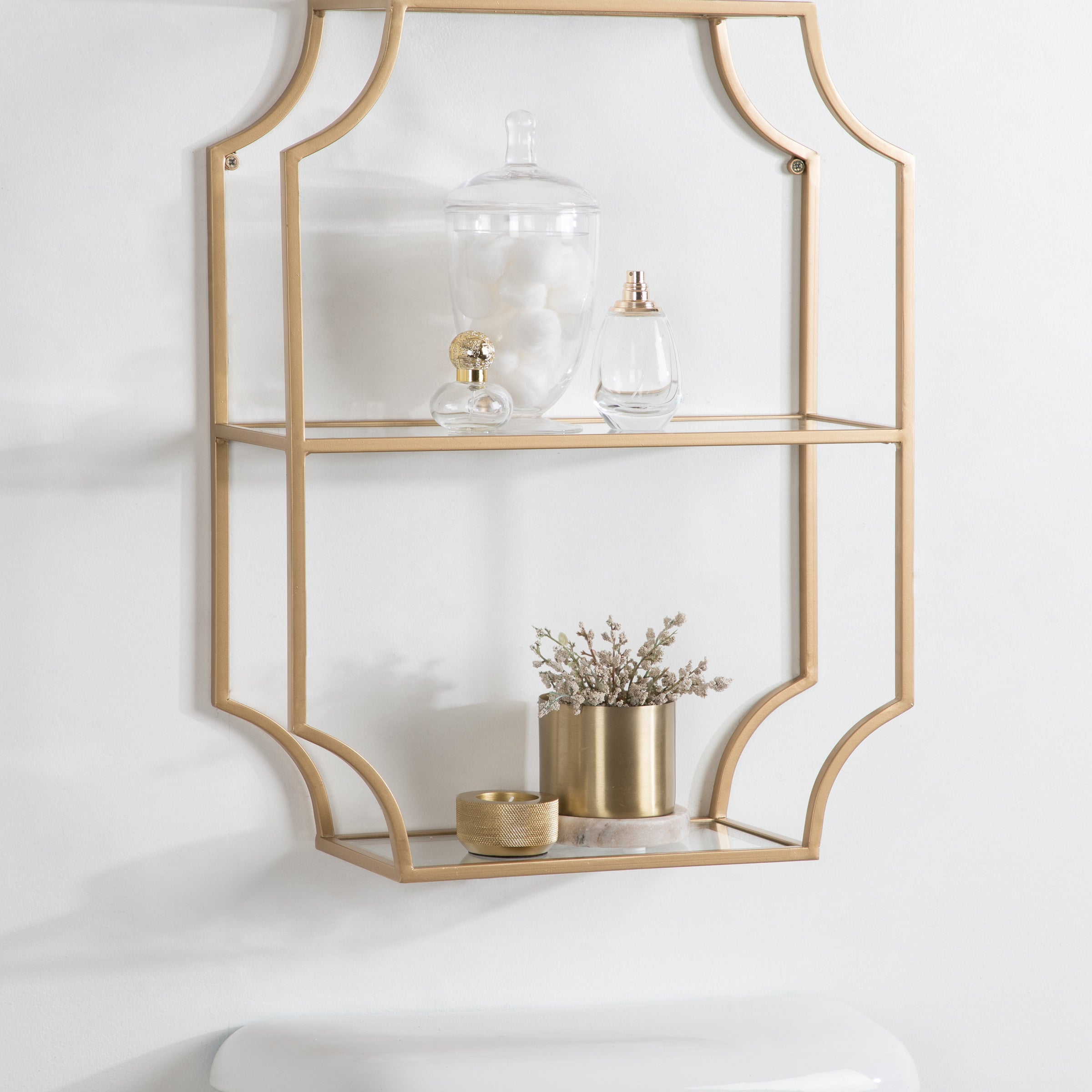 Store household necessities or display your favorite decorative accents with the ultra-glamorous Ciel shelf. This vertical wall shelf unit was constructed with resilient metal material and features scalloped corners for a sophisticated look. Each of the three shelf tiers is made from glass to give them an uncomplicated, sophisticated look. This shelf is perfect for storing office and art supplies, decorating with succulents or photos, or acting as a makeshift medicine or makeup cabinet.