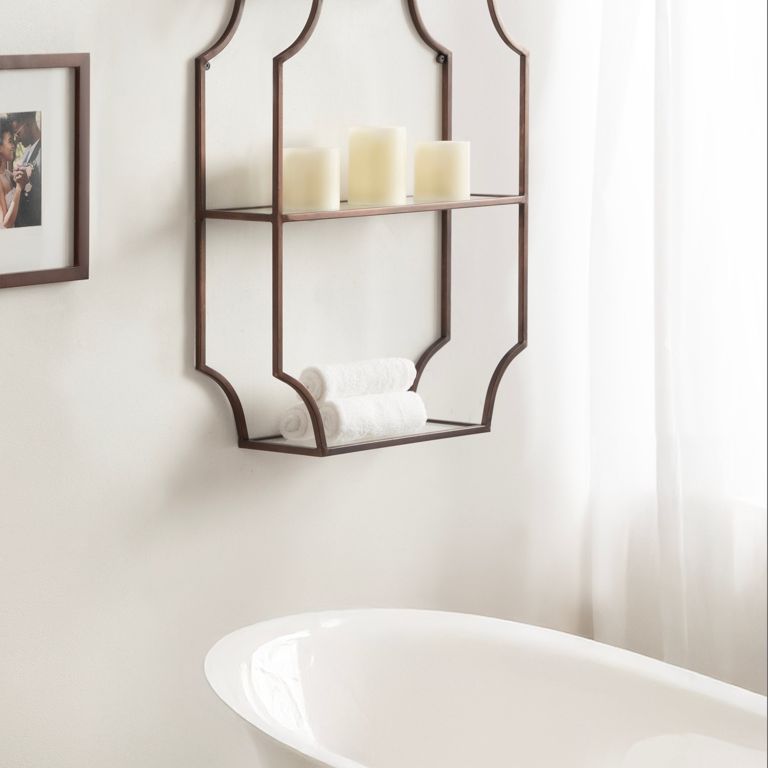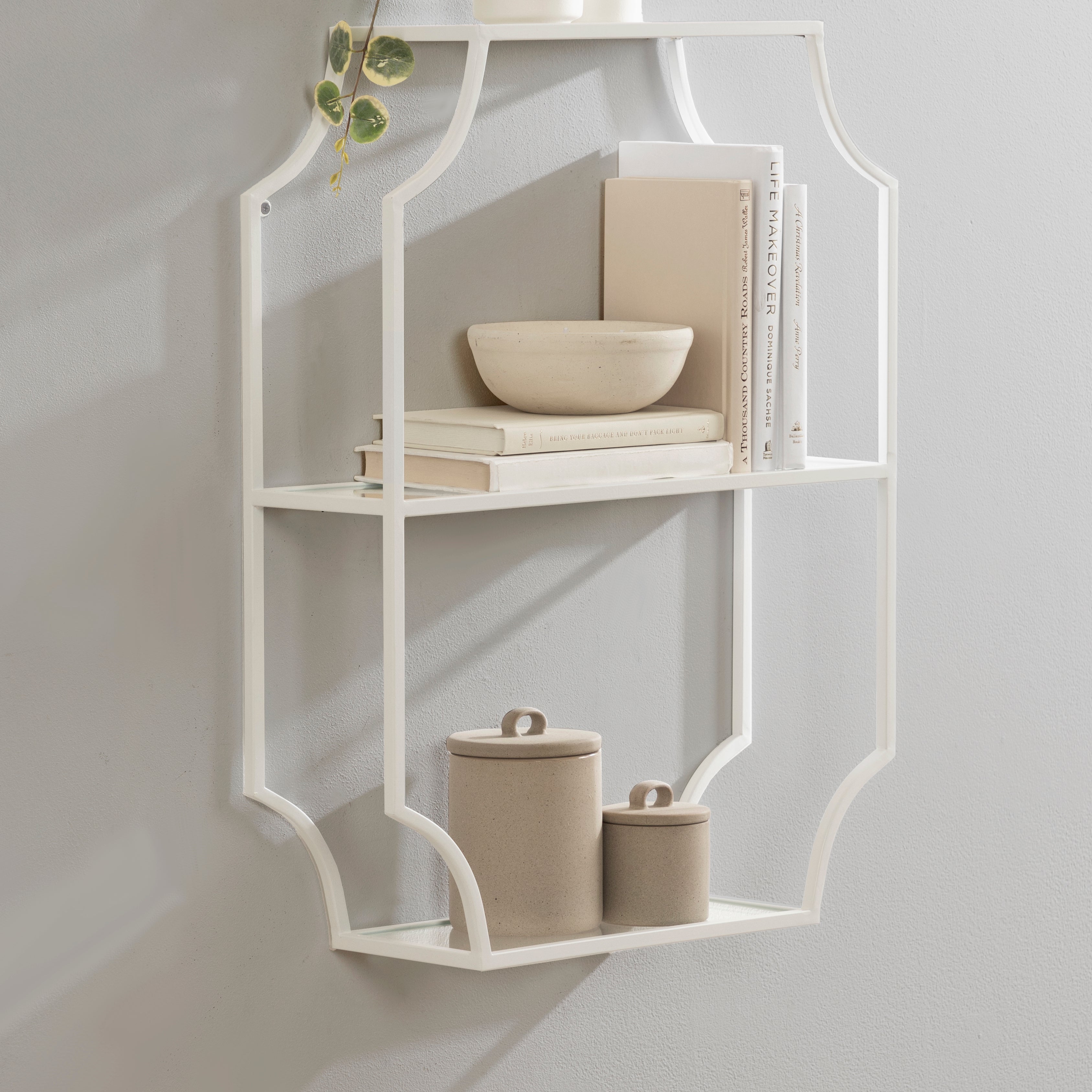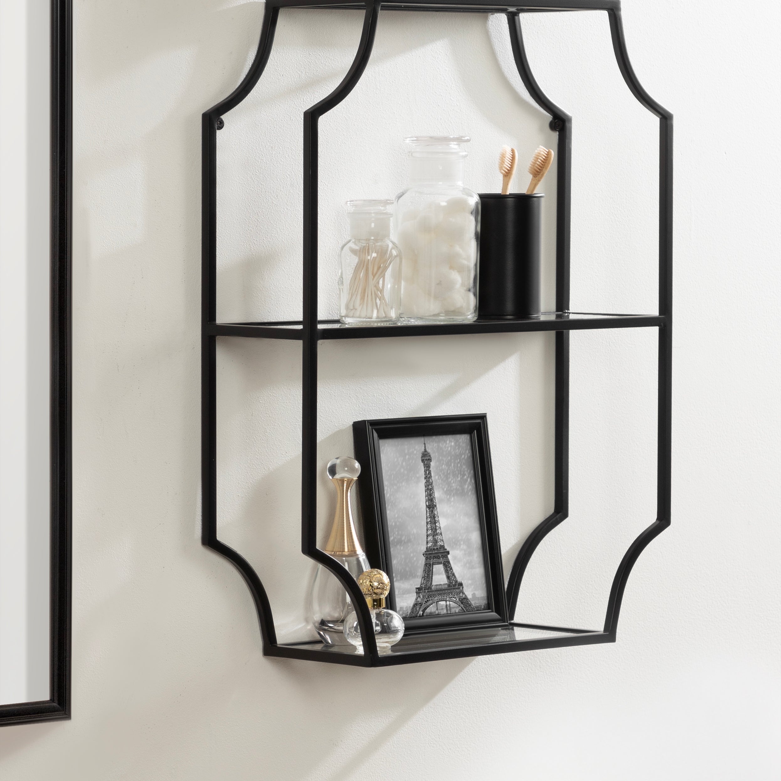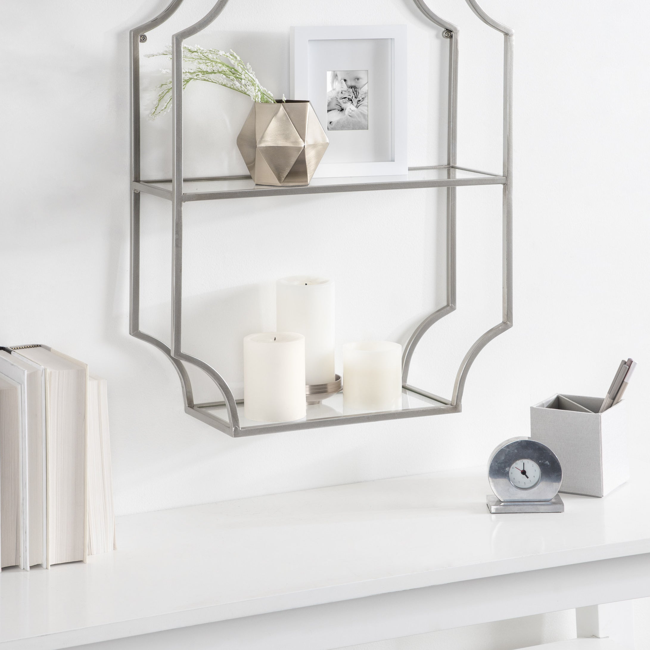 Store household necessities or display your favorite decorative accents with the ultra-glamorous Ciel shelf. This vertical wall shelf unit was constructed with resilient metal material and features scalloped corners for a sophisticated look. Each of the three shelf tiers is made from glass to give them an uncomplicated, sophisticated look. This shelf is perfect for storing office and art supplies, decorating with succulents or photos, or acting as a makeshift medicine or makeup cabinet.