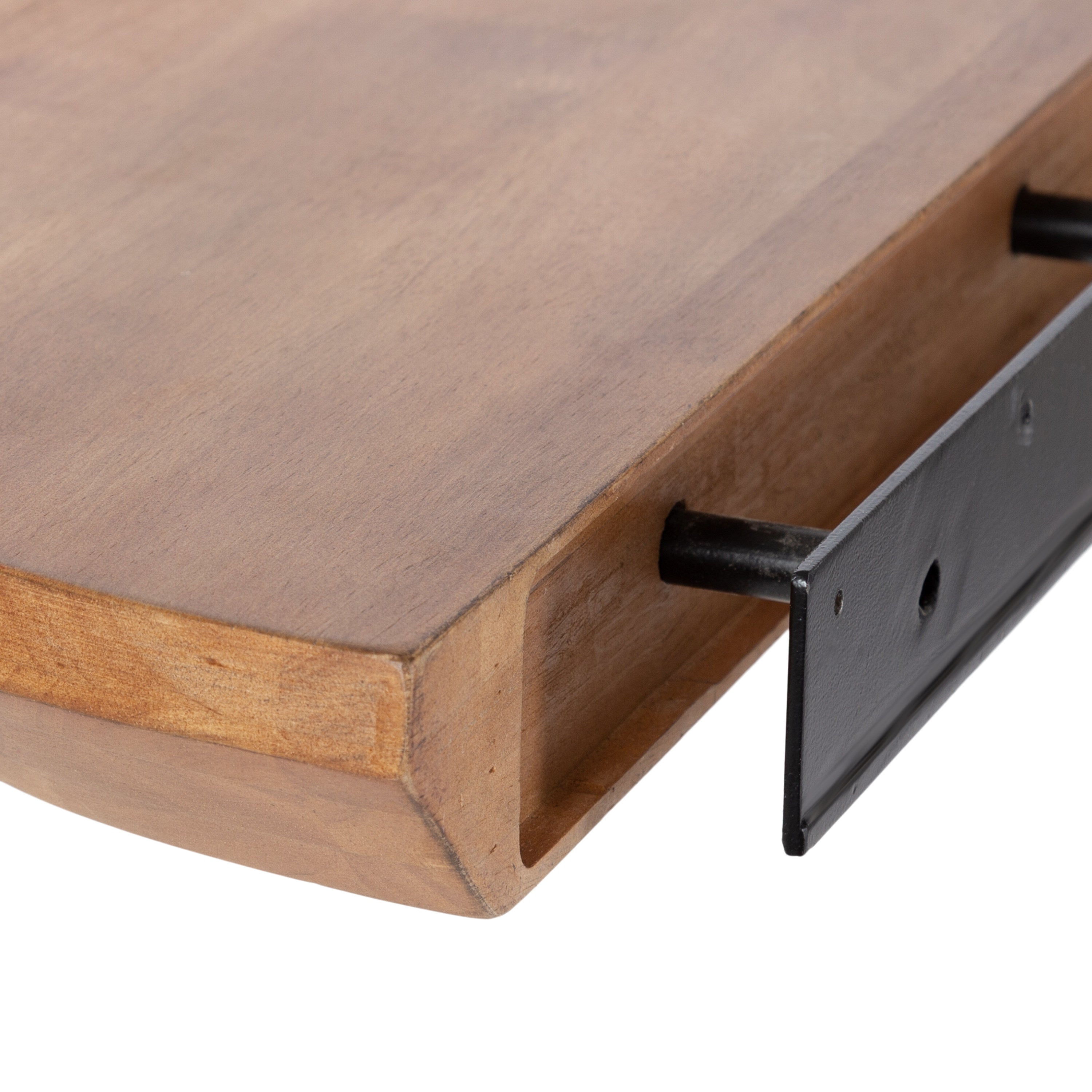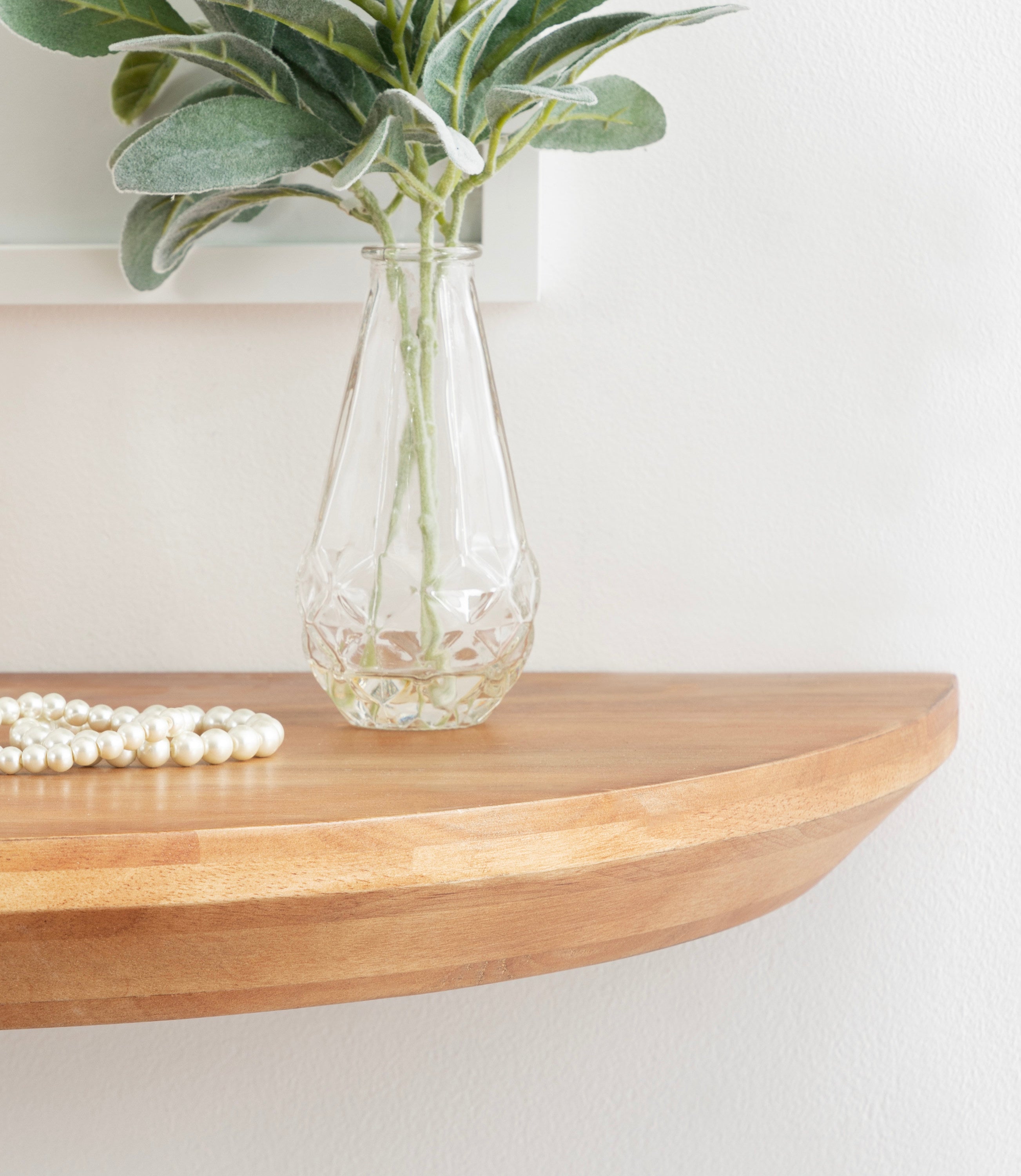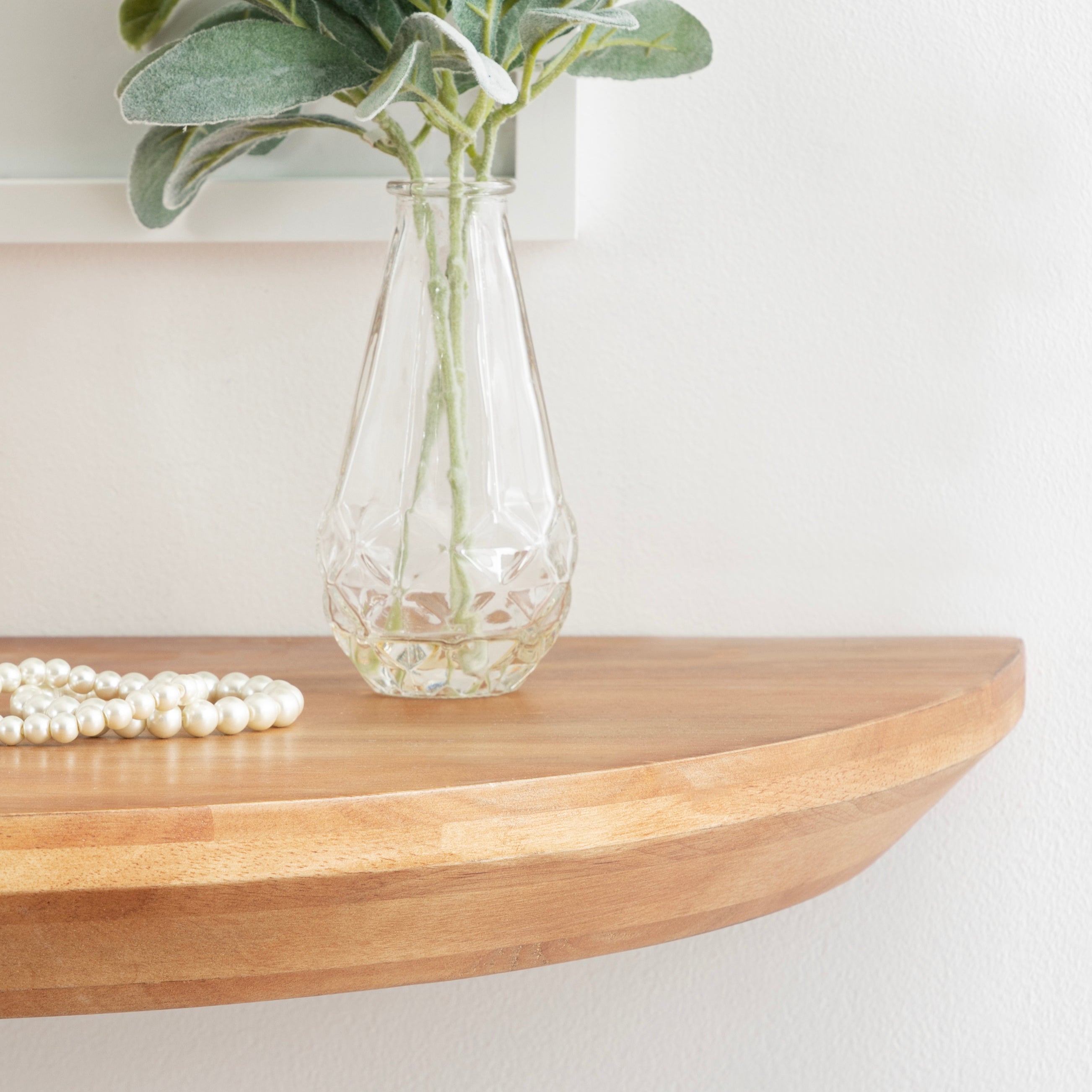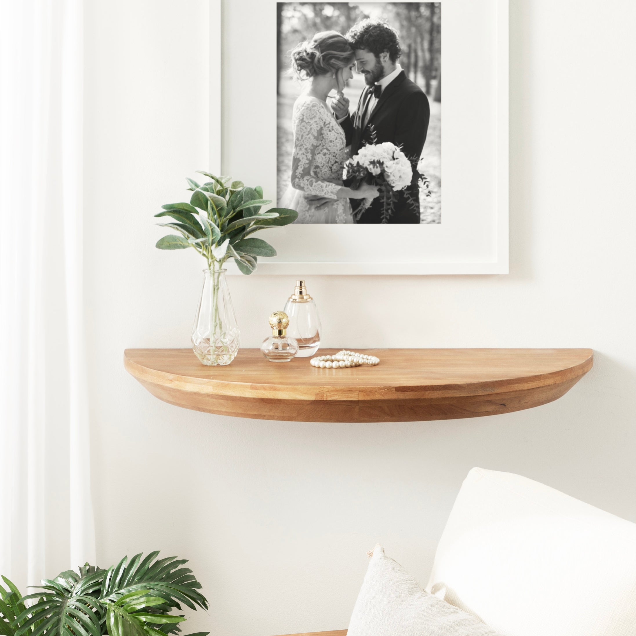 The Colter floating wood table shelf brings a transitional design with a modern twist to any room. This lovely floating console table shelf is crafted from solid wood, giving your space a flattering woodgrain to showcase. The floating design is perfect for saving floor space, while the size makes it fit well as bathroom decor or next to a bed, sofa, or entryway. This charming, simple design is great for displaying your favorite decorative elements like a plant or flameless candles.