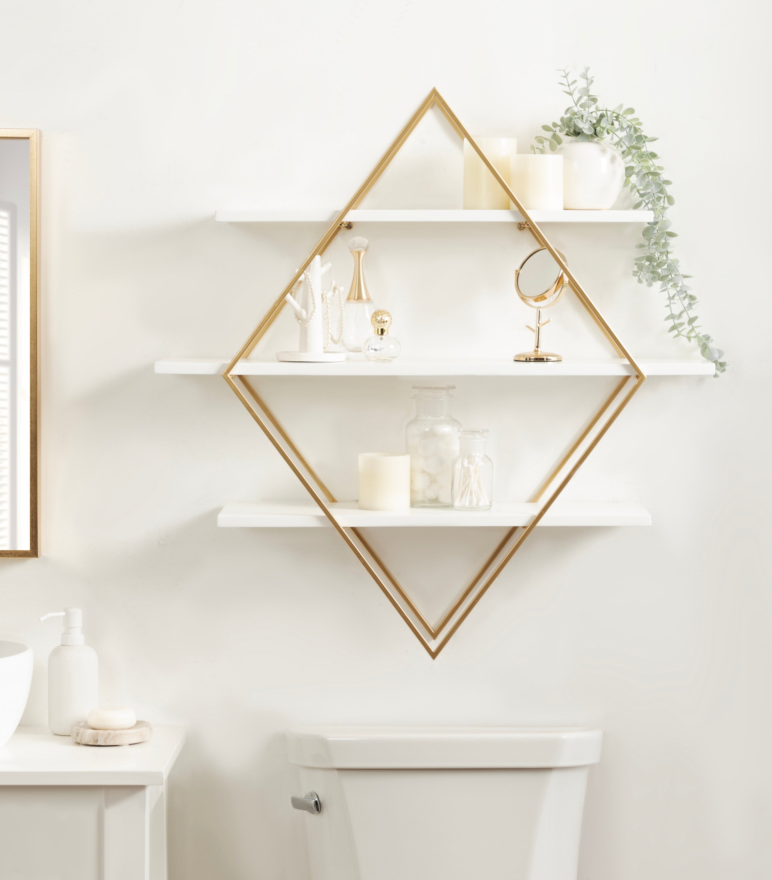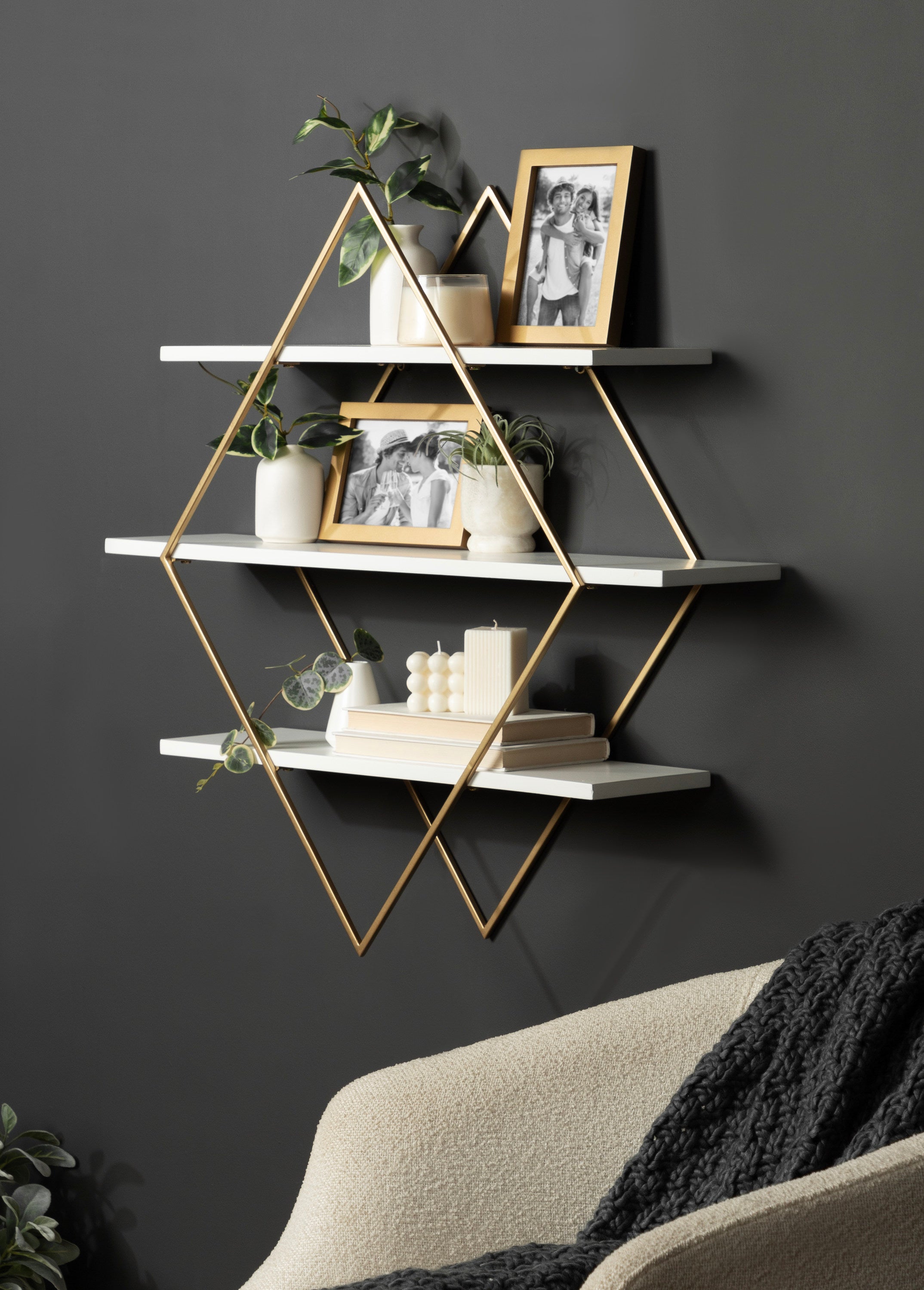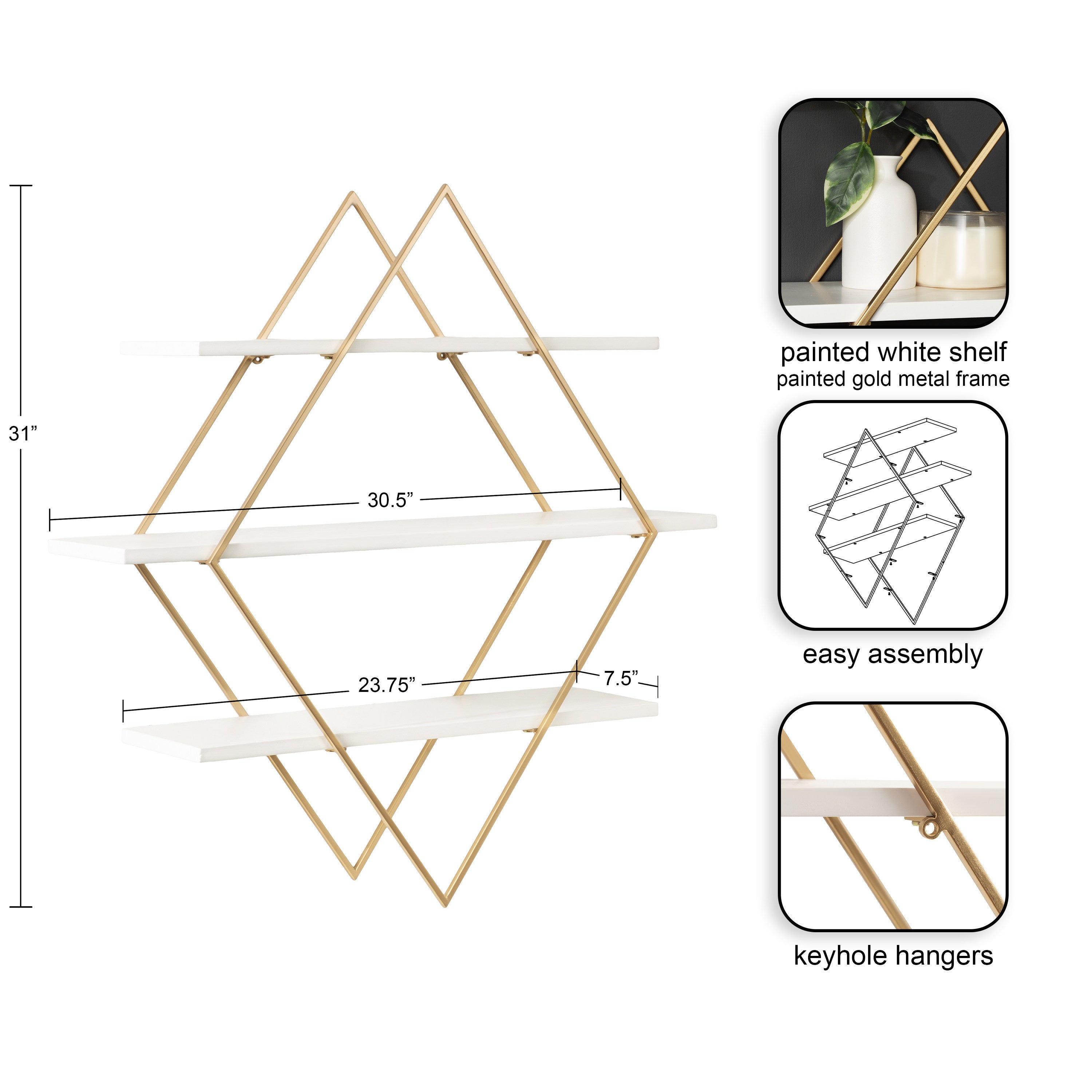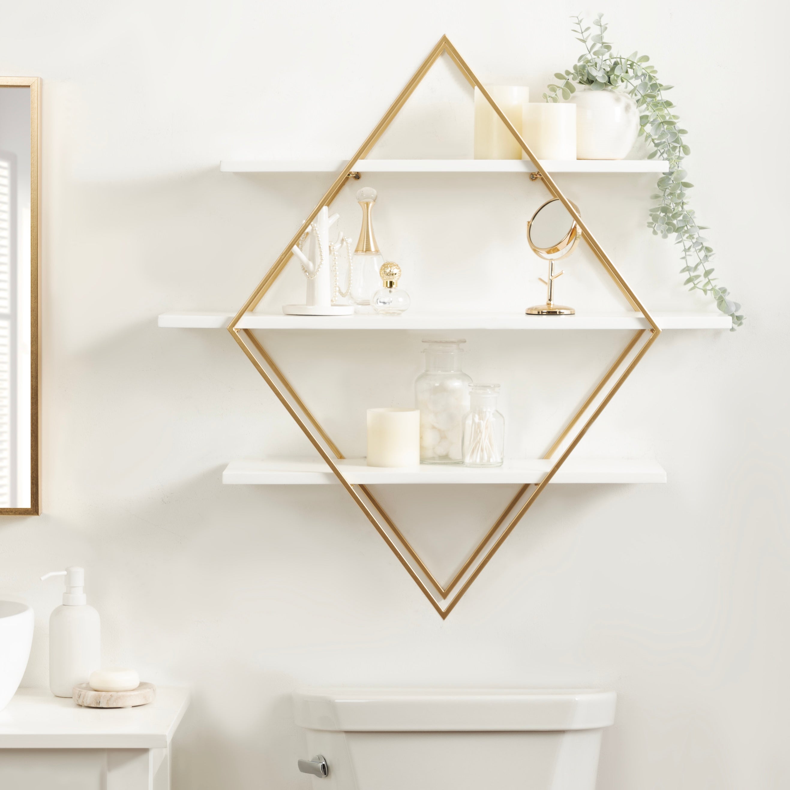 Create an unforgettable wall decor solution while also providing your home with space-saving storage with the Daxton diamond wall shelf. Inspired by sleek, elegant glamour, the Daxton wall shelf features sturdy wooden shelves, nestled in a sturdy metal frame with an elegant finish. Hang the chic wall shelf as a decorative, space-saving storage solution in your living room, bedroom, entryway, dining room, home office, or kitchen.