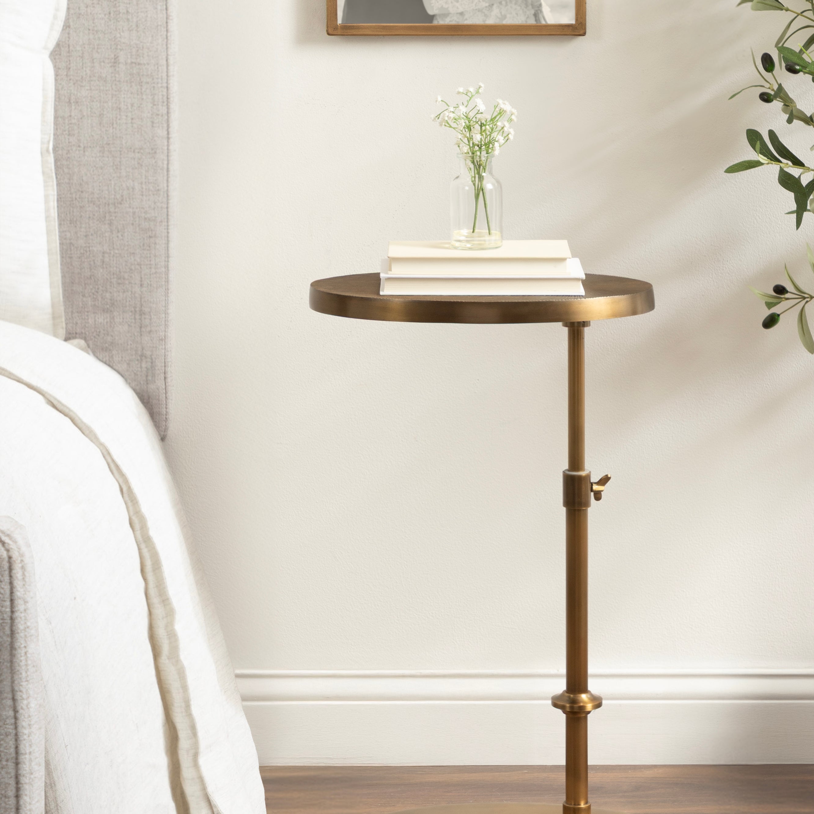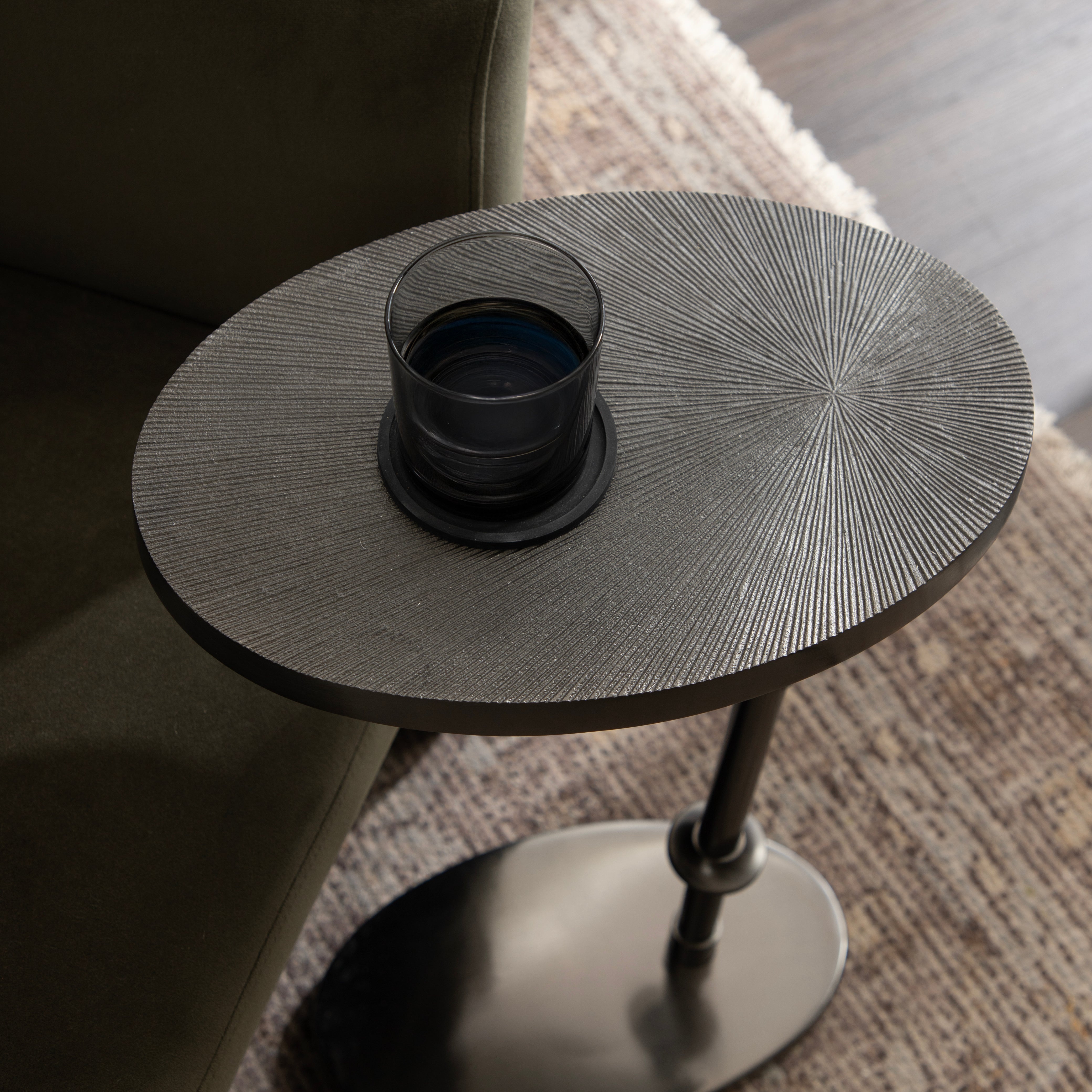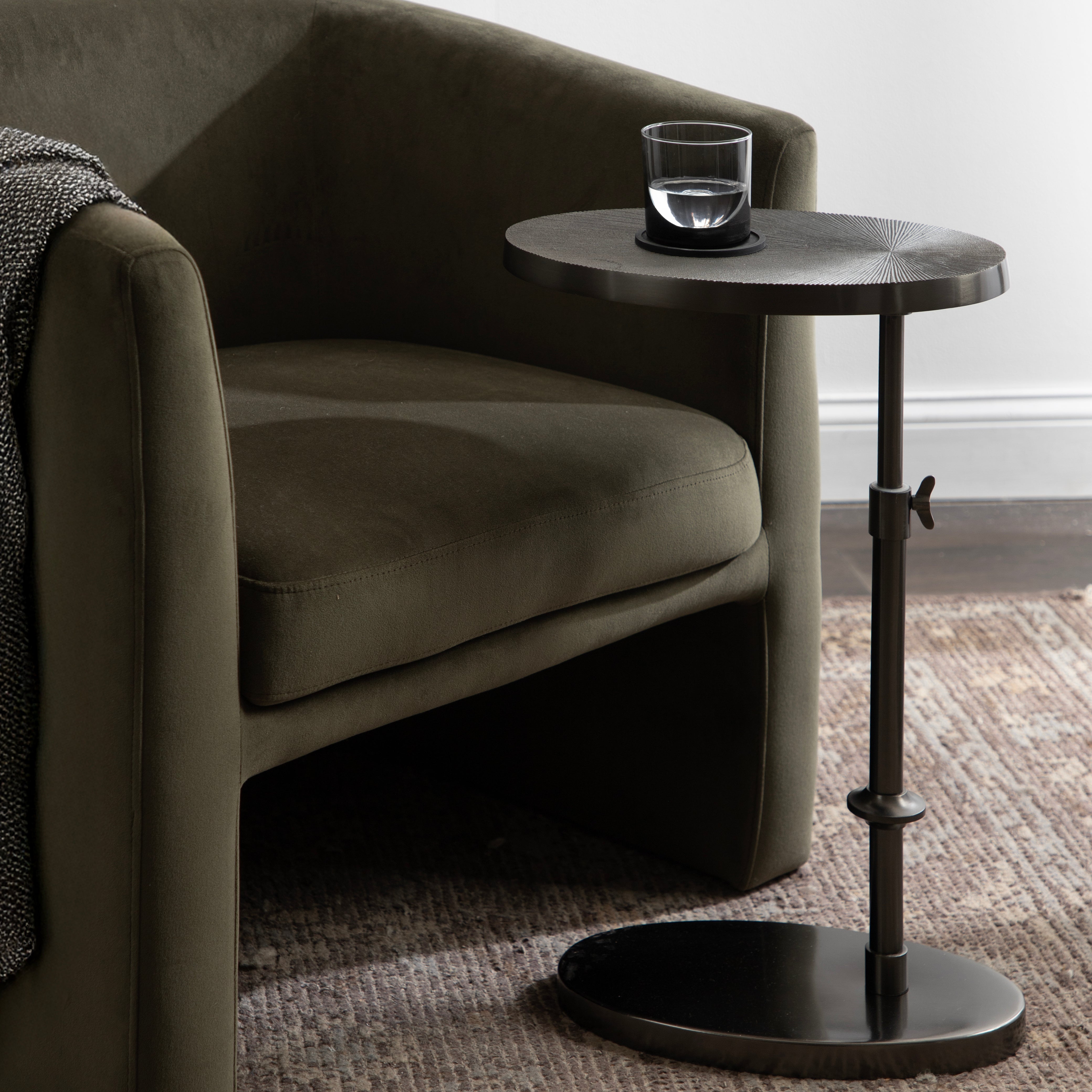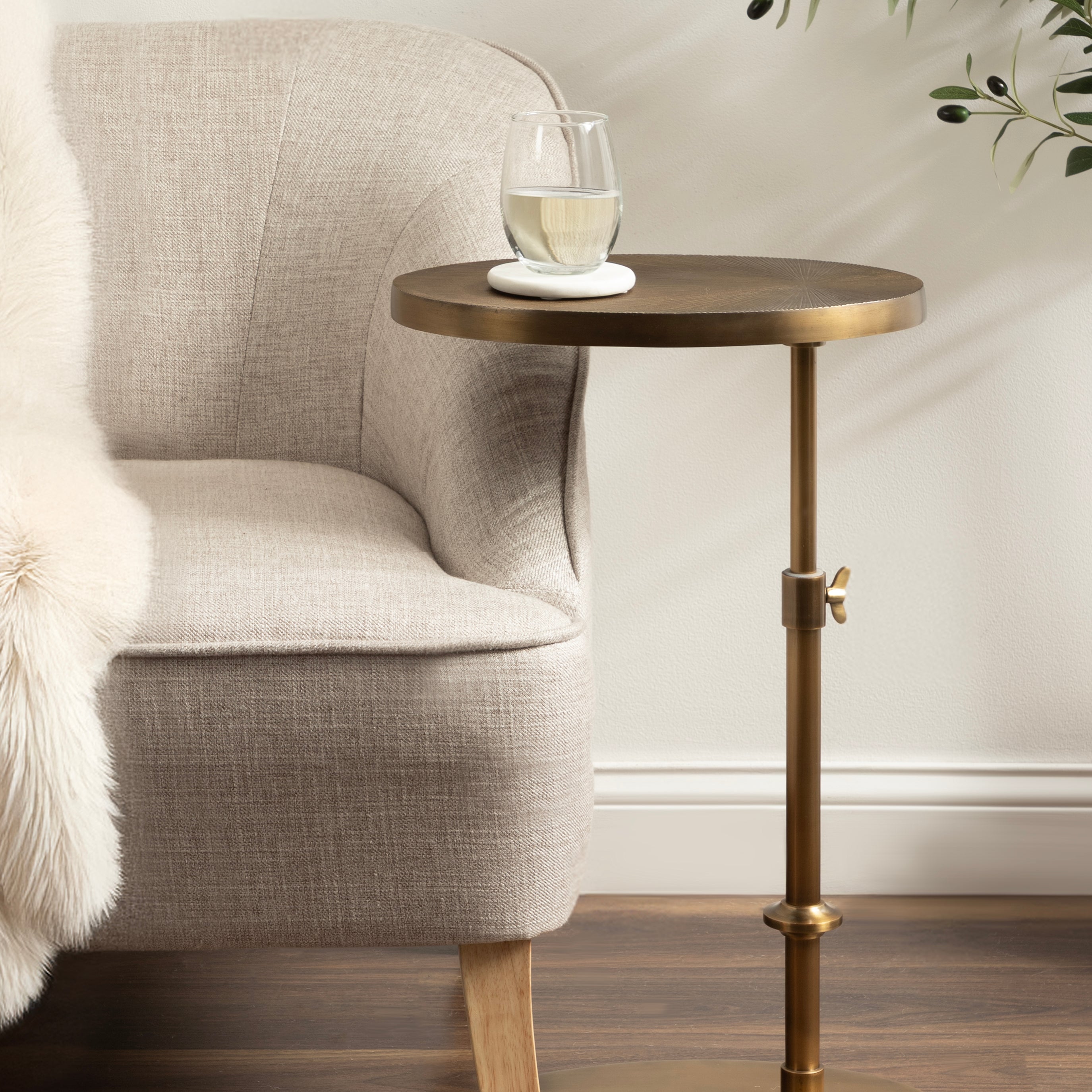 Introducing the Kate and Laurel Engles oval C-table, a stunning piece that combines elegance and functionality. This C-shaped side table is designed to elevate your living space with its sleek yet vintage style. The unique design of this C-table includes an adjustable-height base to adequately meet the right height for your bedside or your couch. The embossed tabletop adds a touch of opulence, creating a focal point that catches the eye. Its oval shape adds a unique twist to the classic C-table design, making it a standout piece in any room. The C-shaped design allows you to slide the table effortlessly over your sofa or chair, providing a convenient surface to place your snacks, drinks, or electronic devices. The Engles is not only a stylish accent piece but also a functional addition to your home.