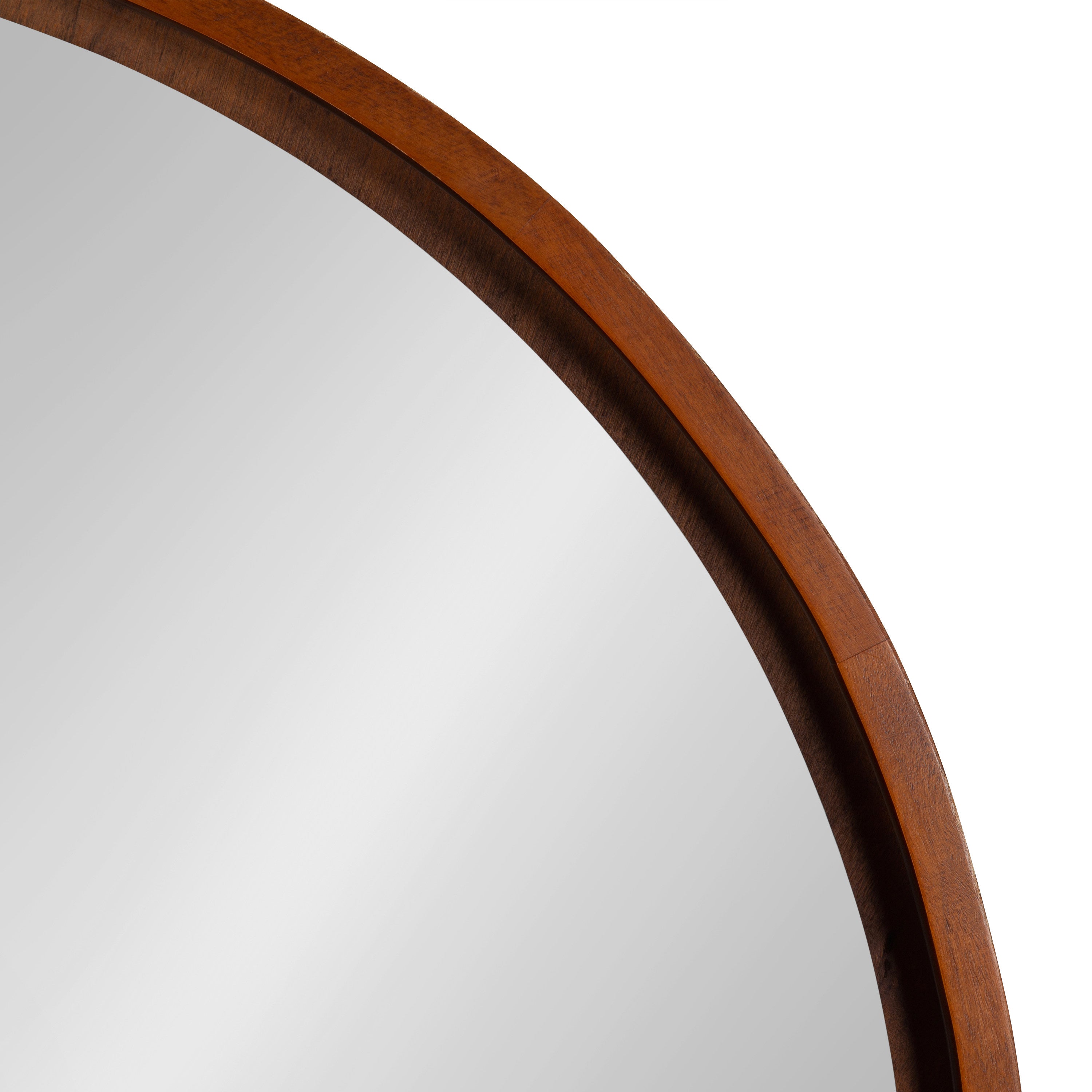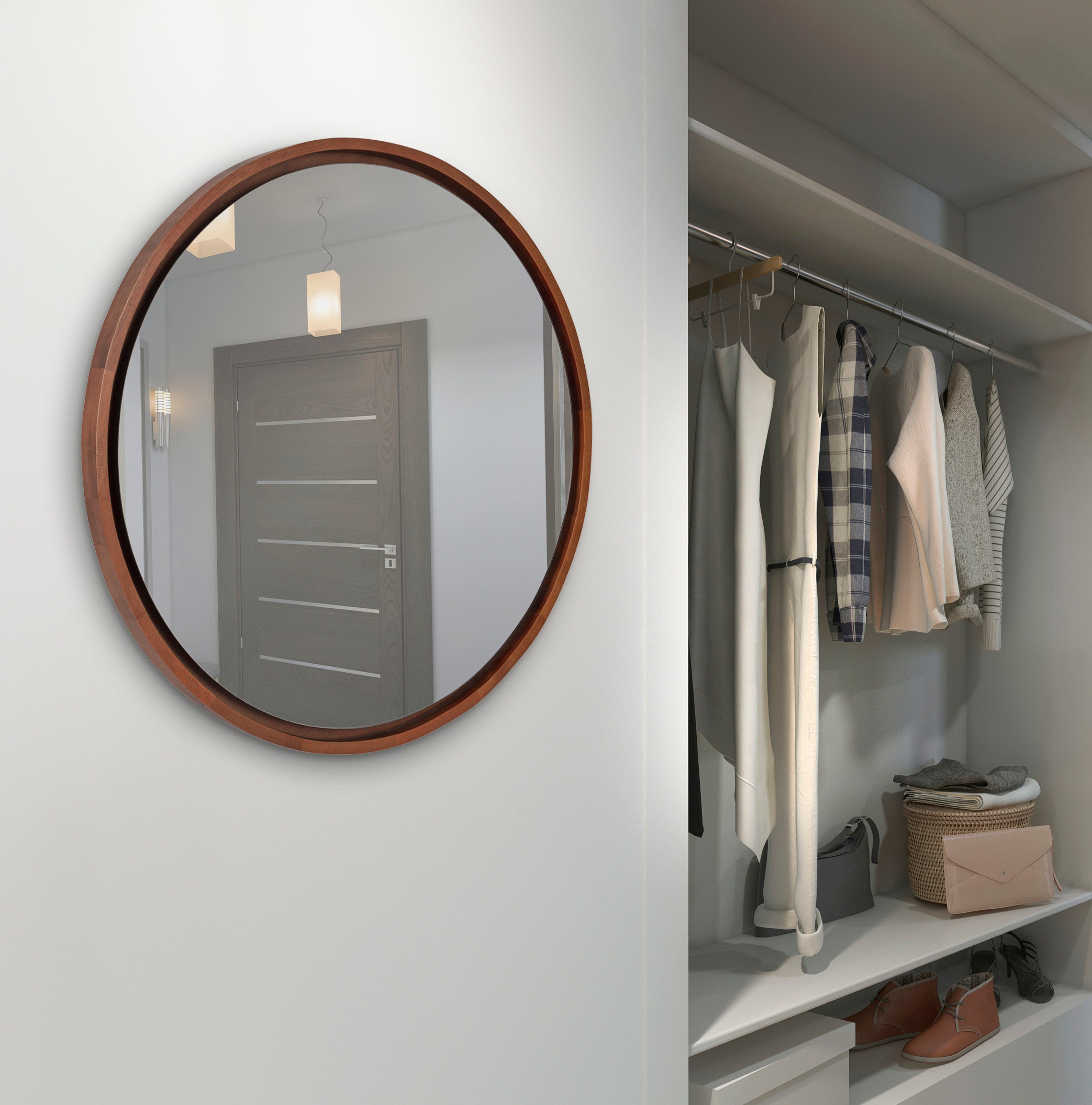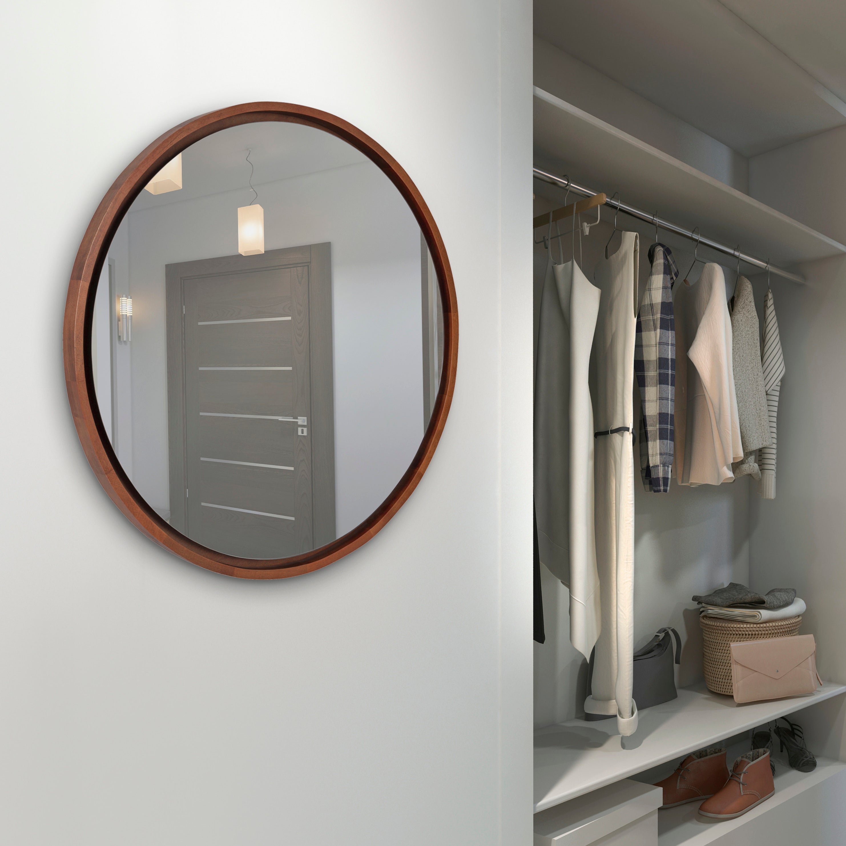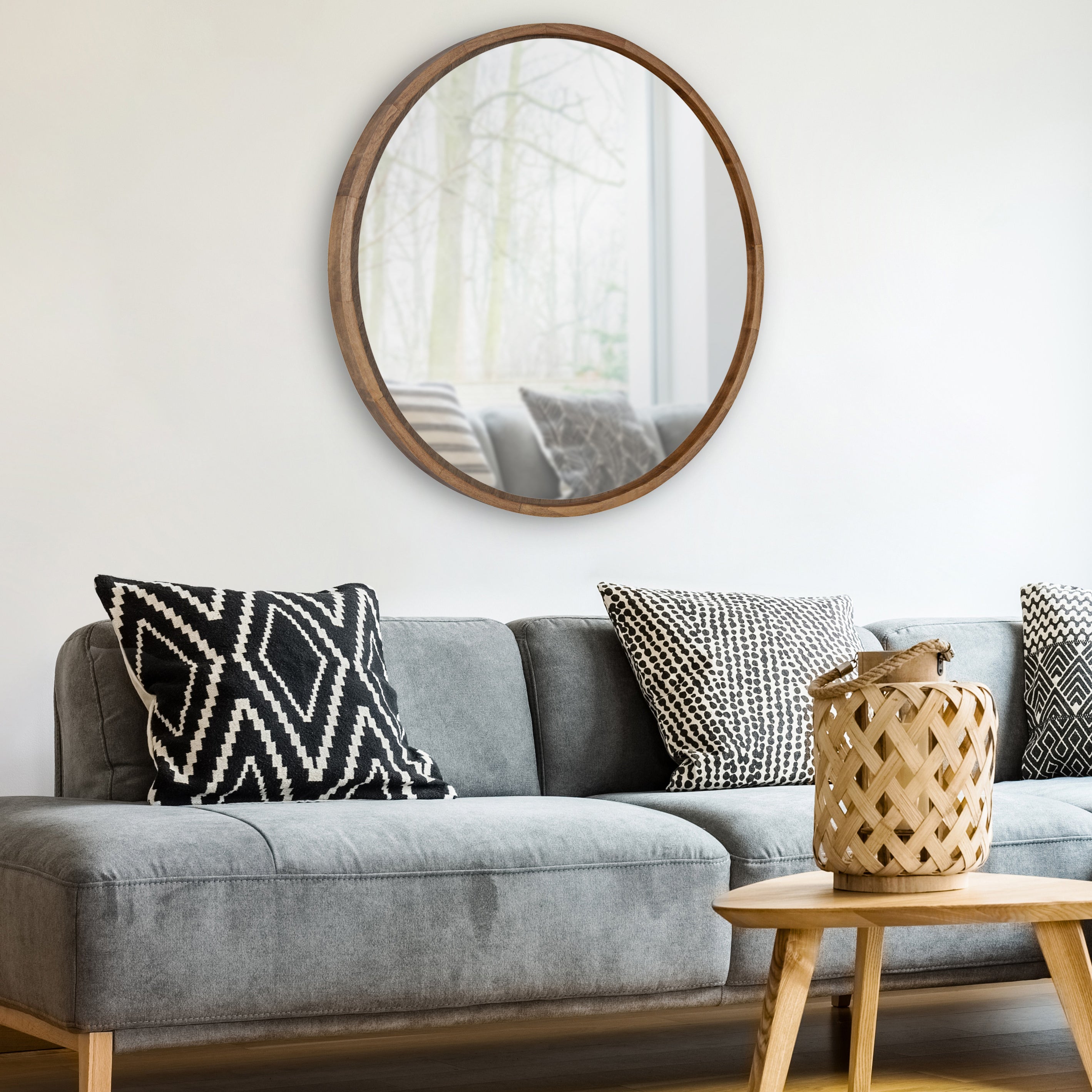 The Evans wall mirror offers your home or office a lovely, mid-century accent for functional display. This boho-chic, modern mirror has a round frame with a wood construction for extra resiliency. The interior glass floats within this solid frame, providing an eye-catching statement for any room of the home.