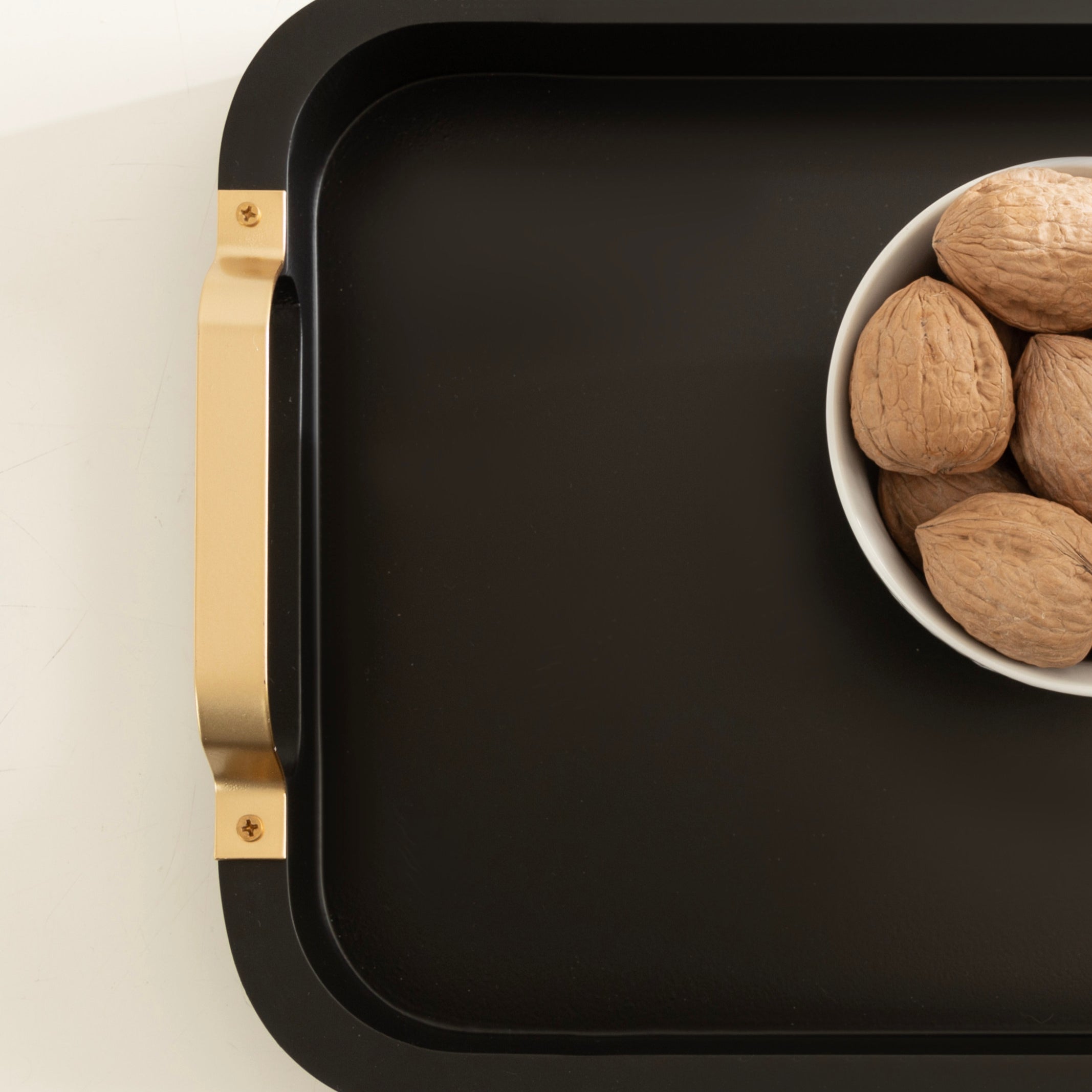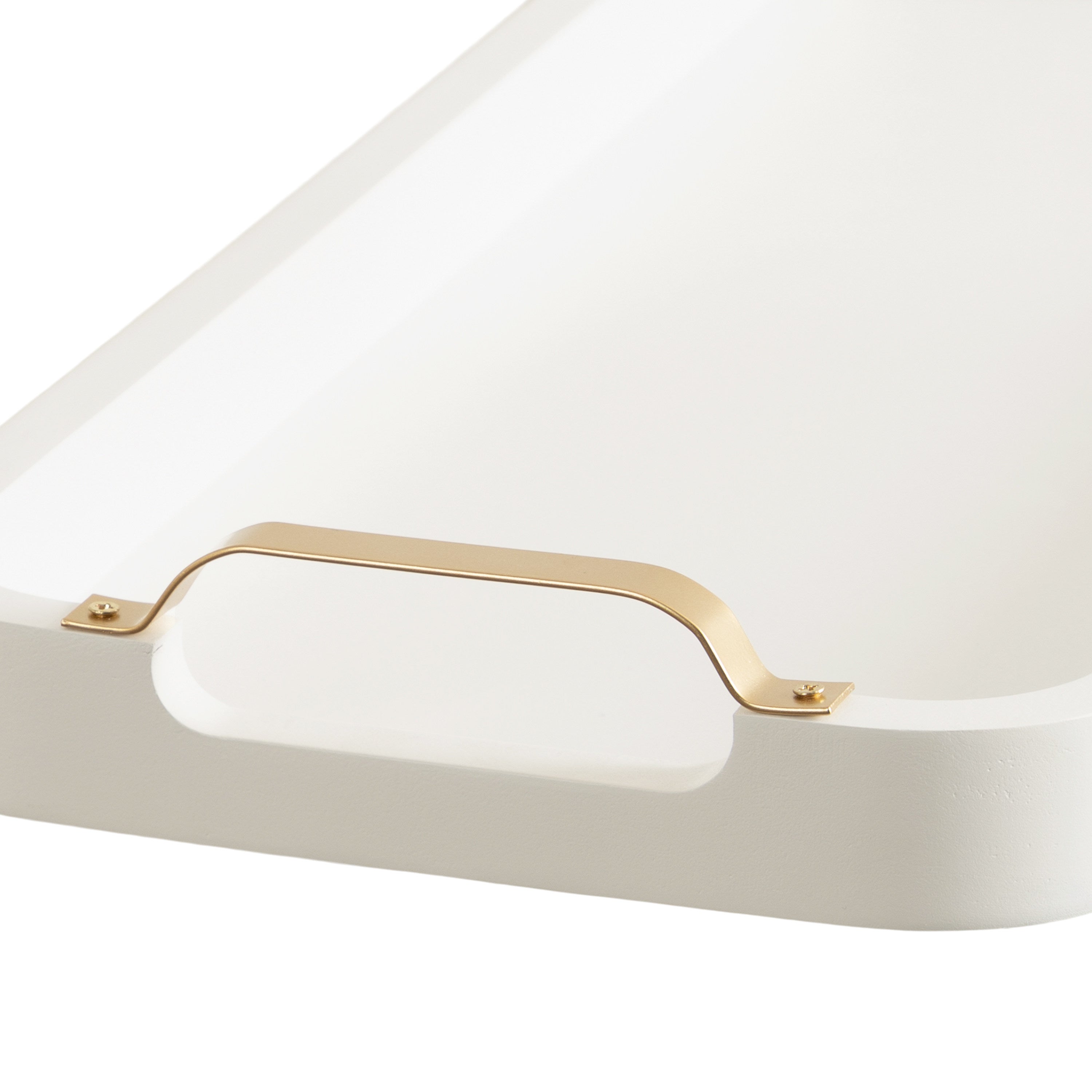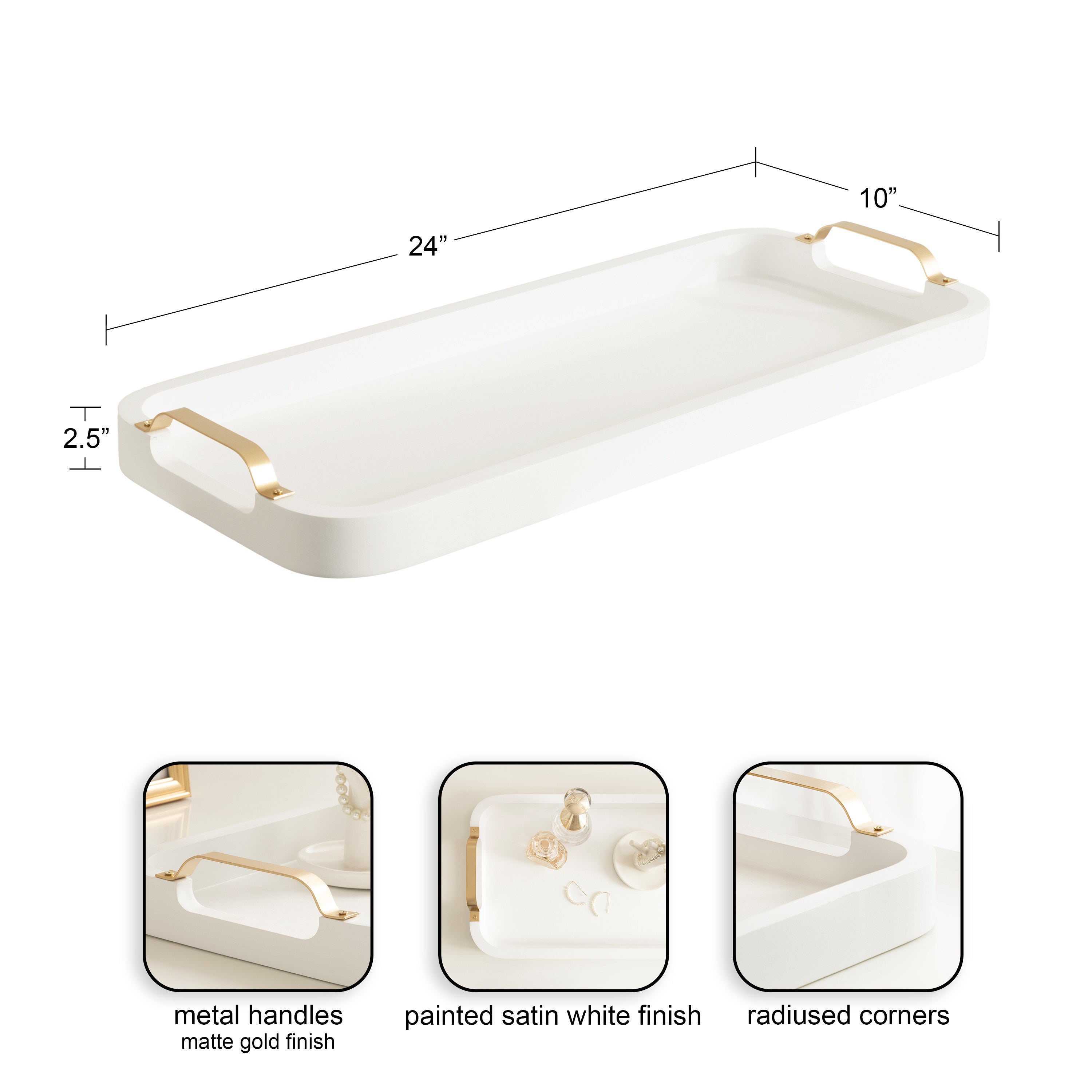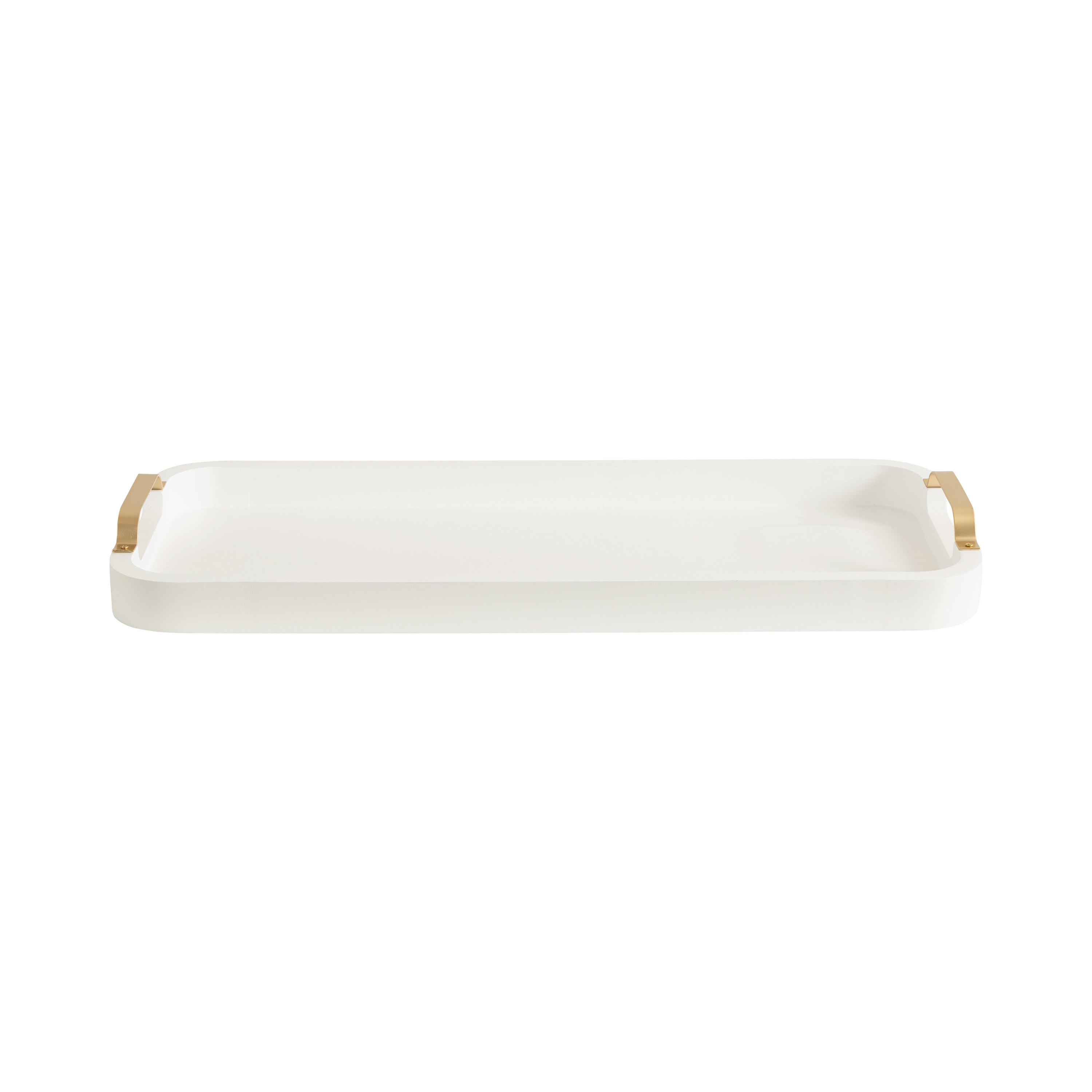 Bring transitional style into your home with this charming narrow wooden tray with metal handles. Place this narrow tray on your entrance console table as an accent tray to hold your keys and change as you come and go. This rectangle tray can also be used as a decorative accent on an ottoman to hold your beverages or on your vanity for makeup organization. Constructed of resilient wooden material and sturdy metal handles, this tray is dependable to carry your cocktails from room to room! An update to the classic accent tray, the base has a raised edge to keep your items more secure when transporting them. From a dining room table to a living room ottoman, this narrow tray brings tremendous versatility anywhere throughout your home. Its skinny size makes it great for serving snacks on little plates or as a decorative display option. The useful tray also includes protective padding on the bottom to prevent scuffs or damage to your hard surfaces.