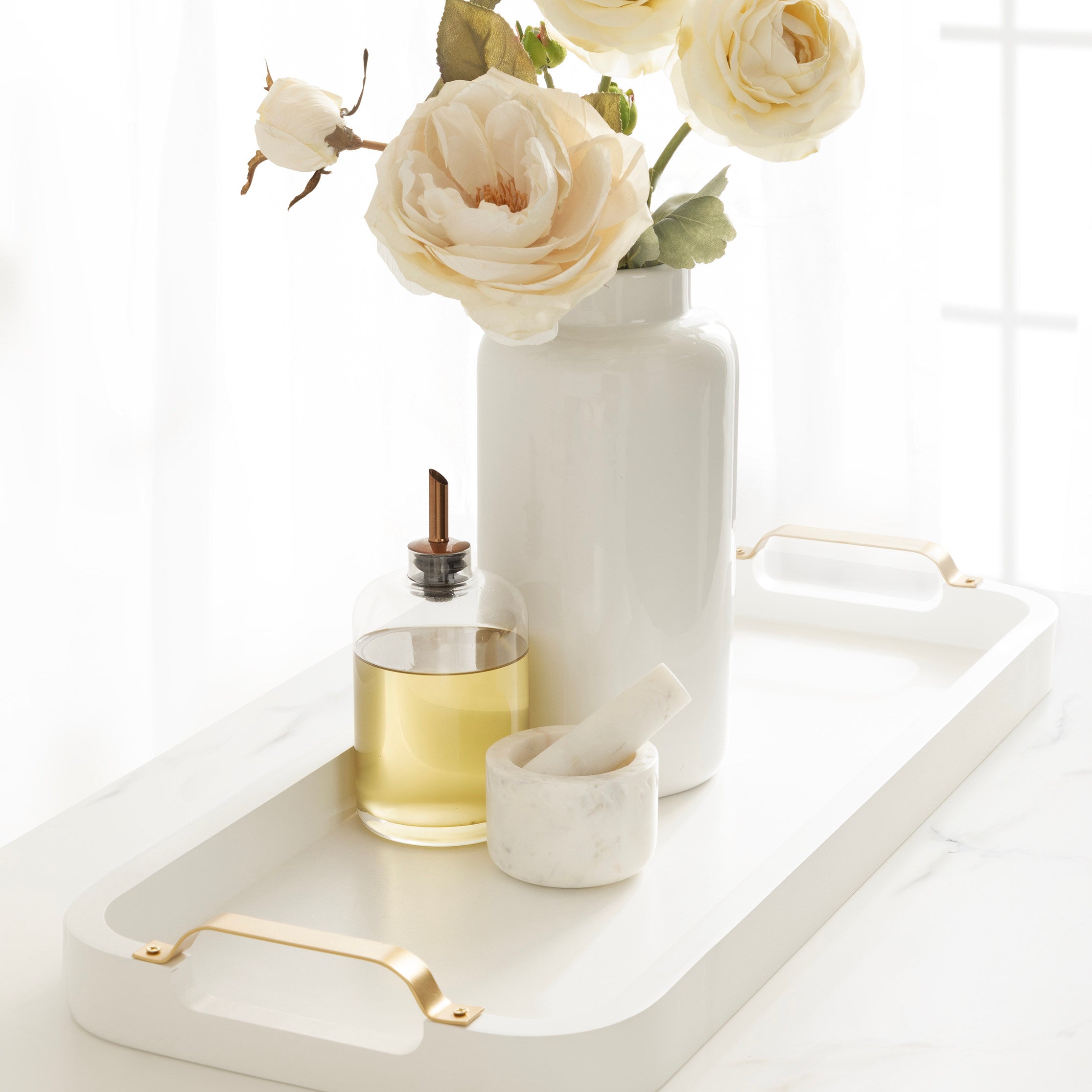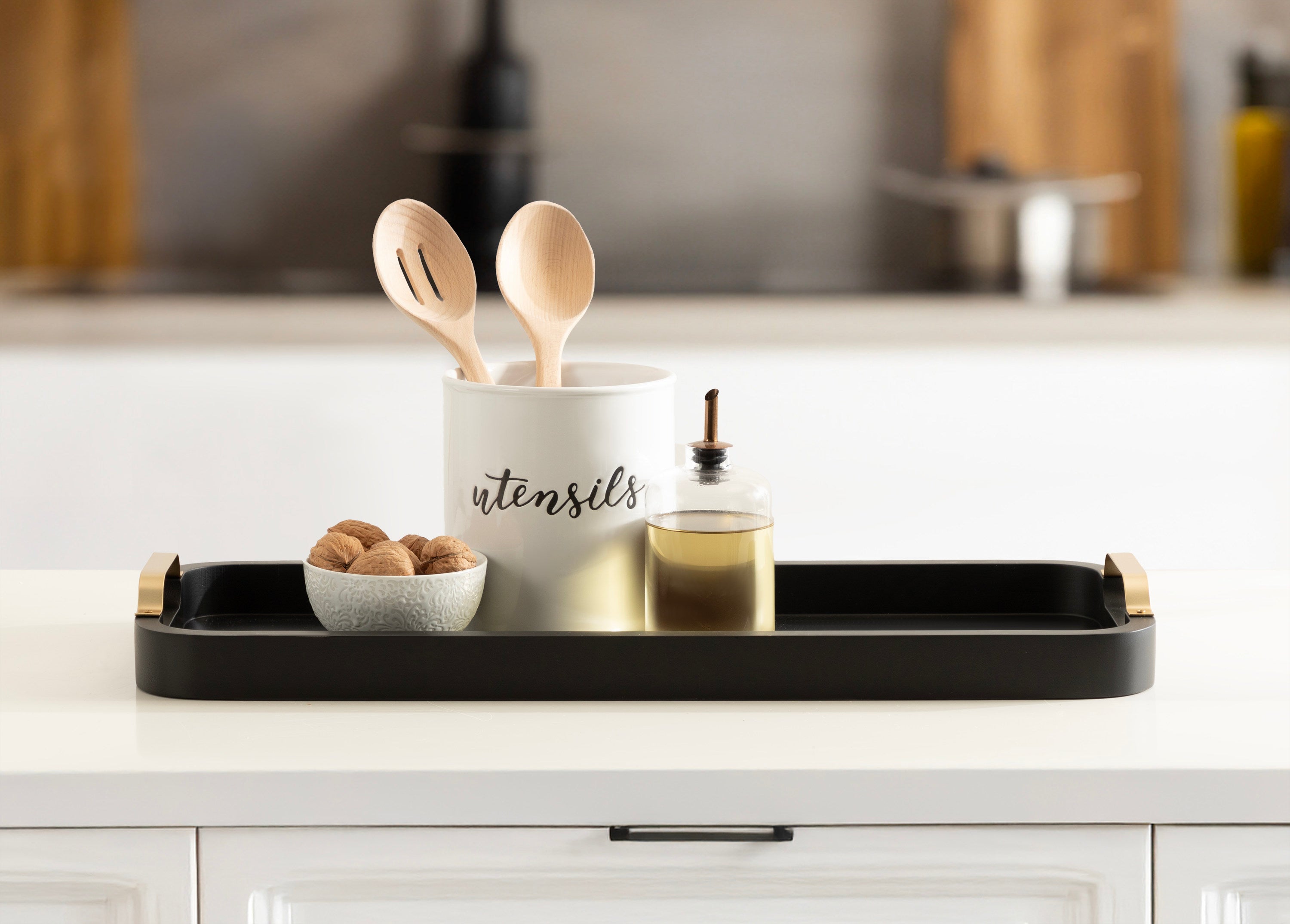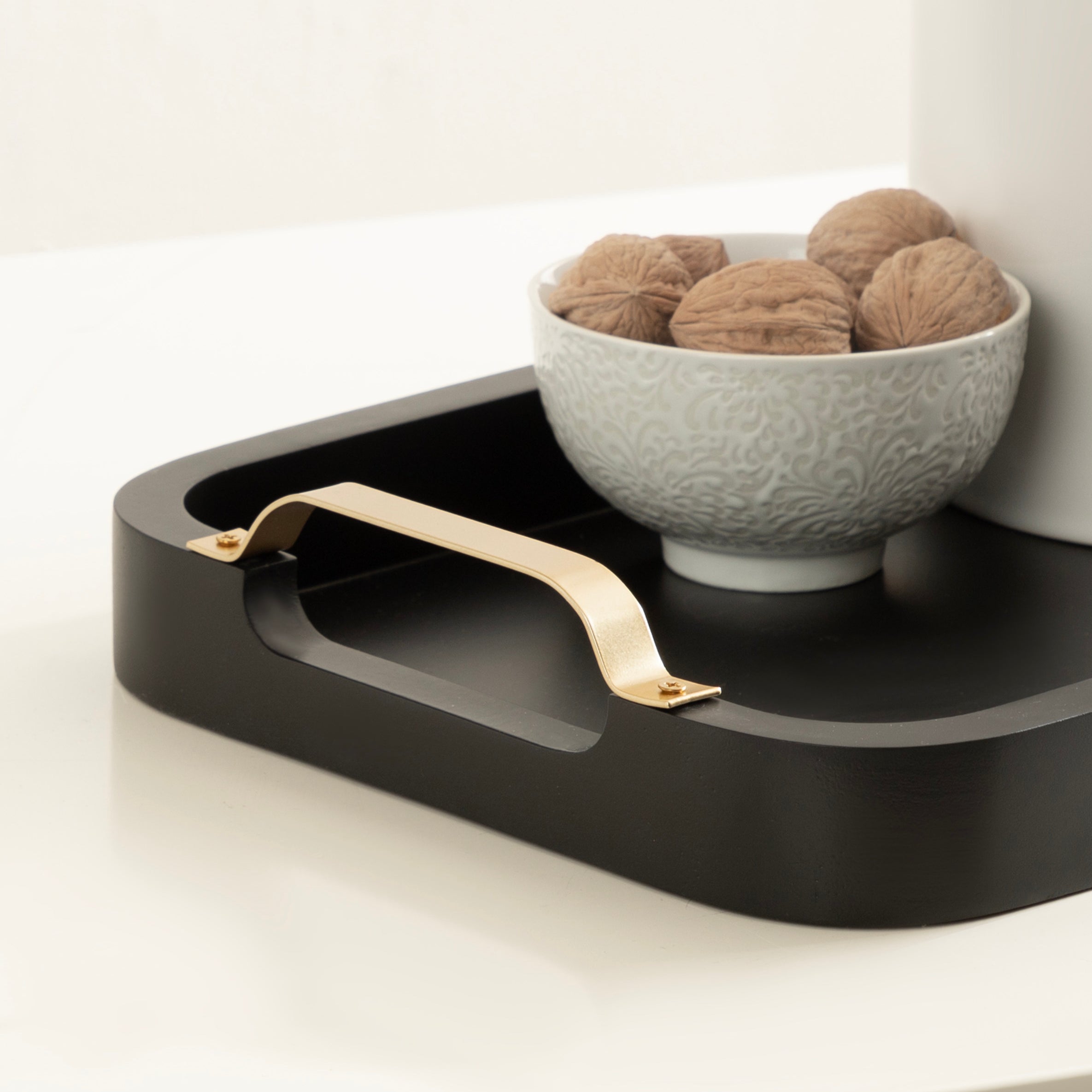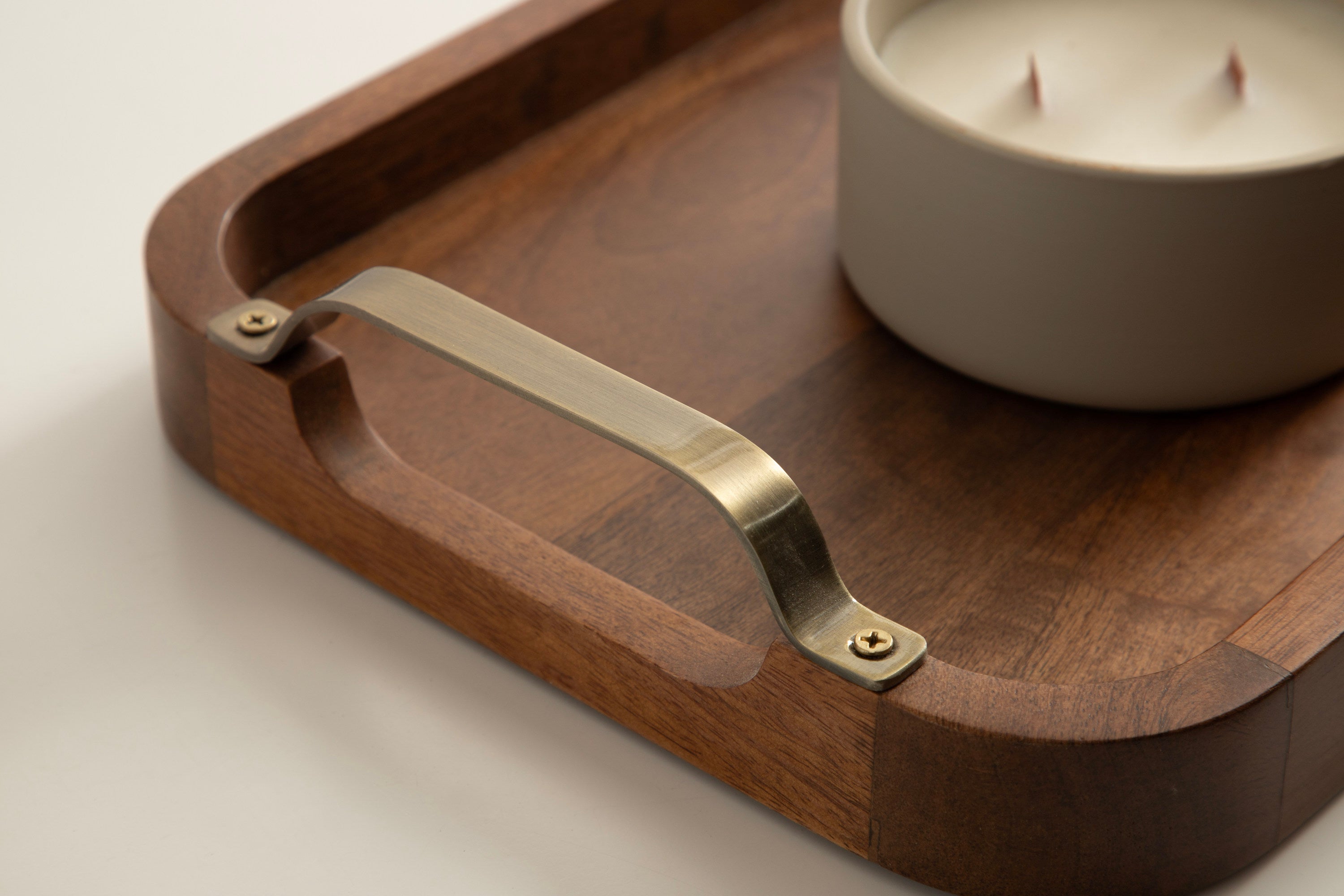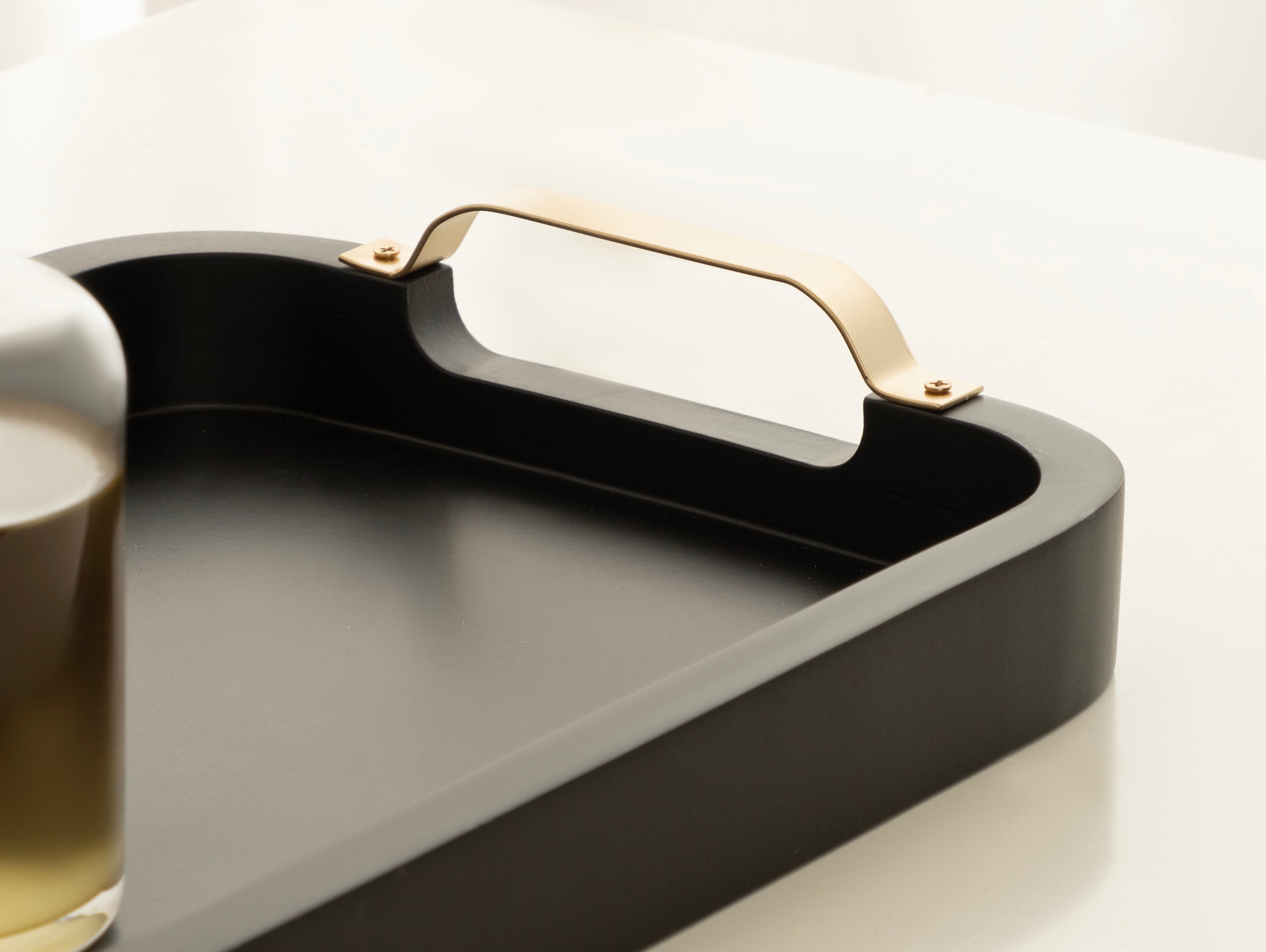 Bring transitional style into your home with this charming narrow wooden tray with metal handles. Place this narrow tray on your entrance console table as an accent tray to hold your keys and change as you come and go. This rectangle tray can also be used as a decorative accent on an ottoman to hold your beverages or on your vanity for makeup organization. Constructed of resilient wooden material and sturdy metal handles, this tray is dependable to carry your cocktails from room to room! An update to the classic accent tray, the base has a raised edge to keep your items more secure when transporting them. From a dining room table to a living room ottoman, this narrow tray brings tremendous versatility anywhere throughout your home. Its skinny size makes it great for serving snacks on little plates or as a decorative display option. The useful tray also includes protective padding on the bottom to prevent scuffs or damage to your hard surfaces.