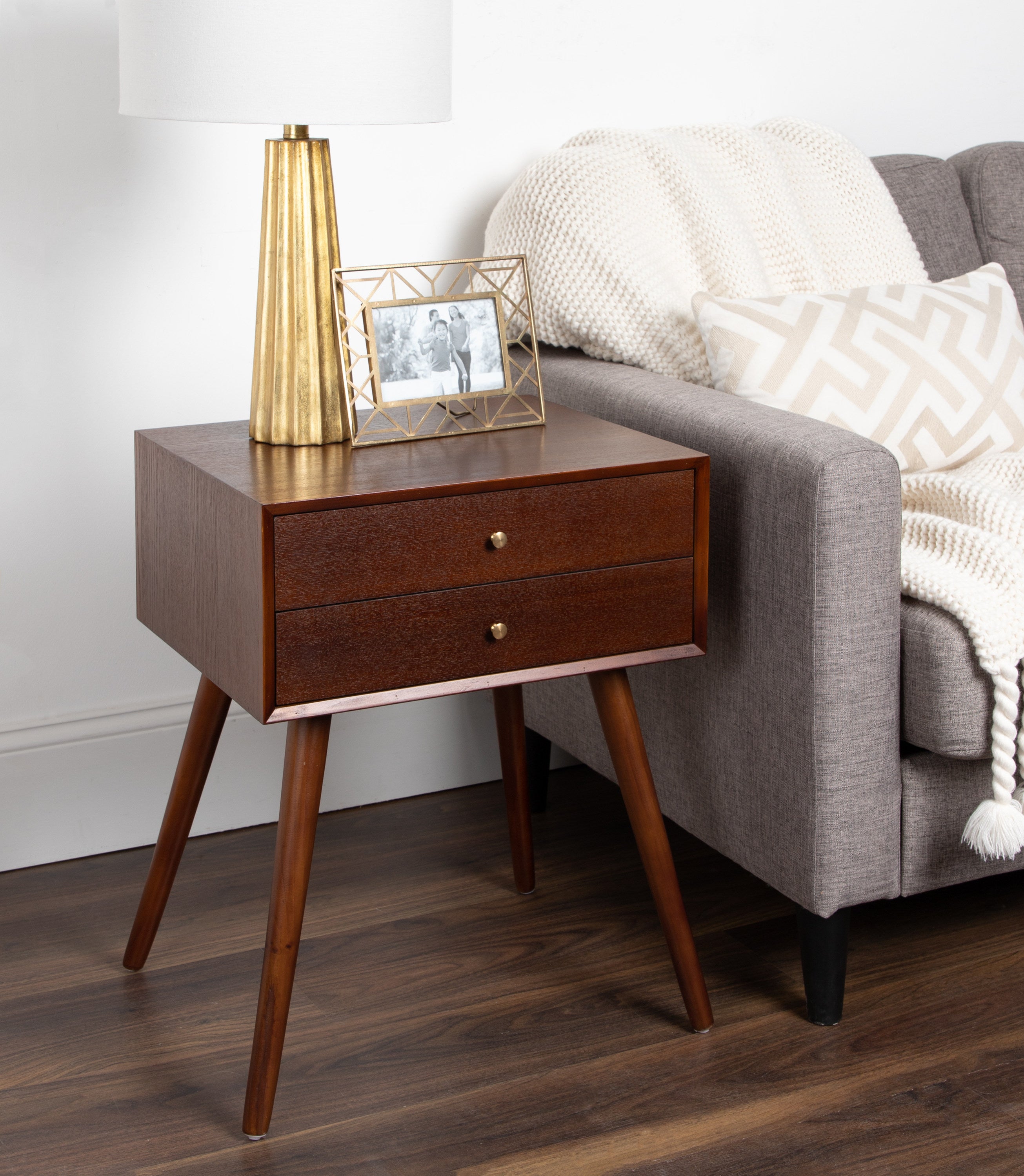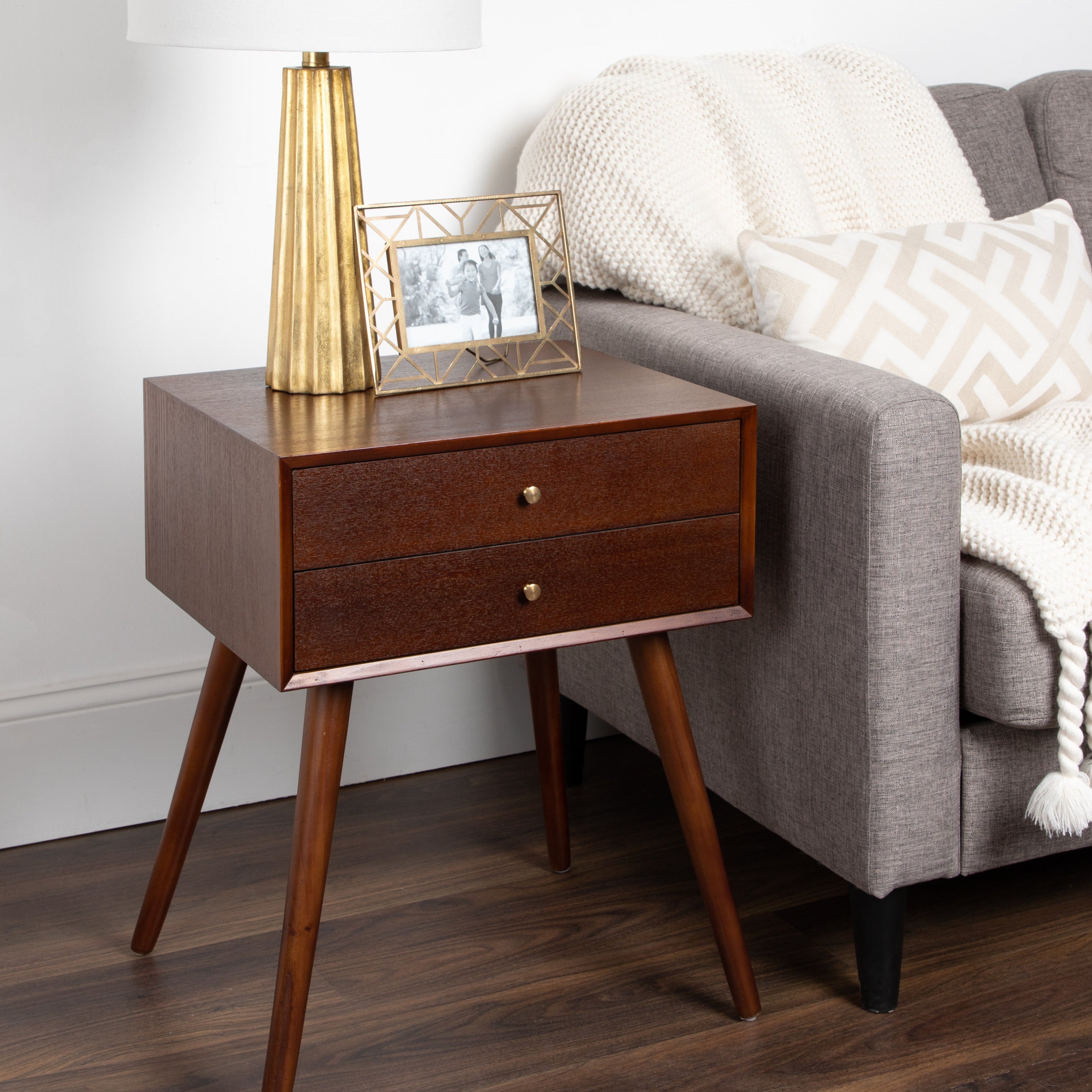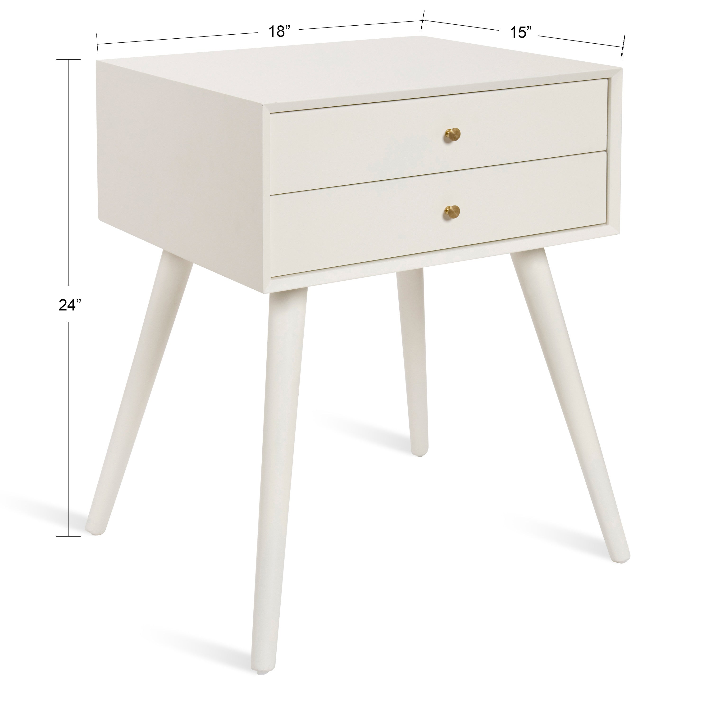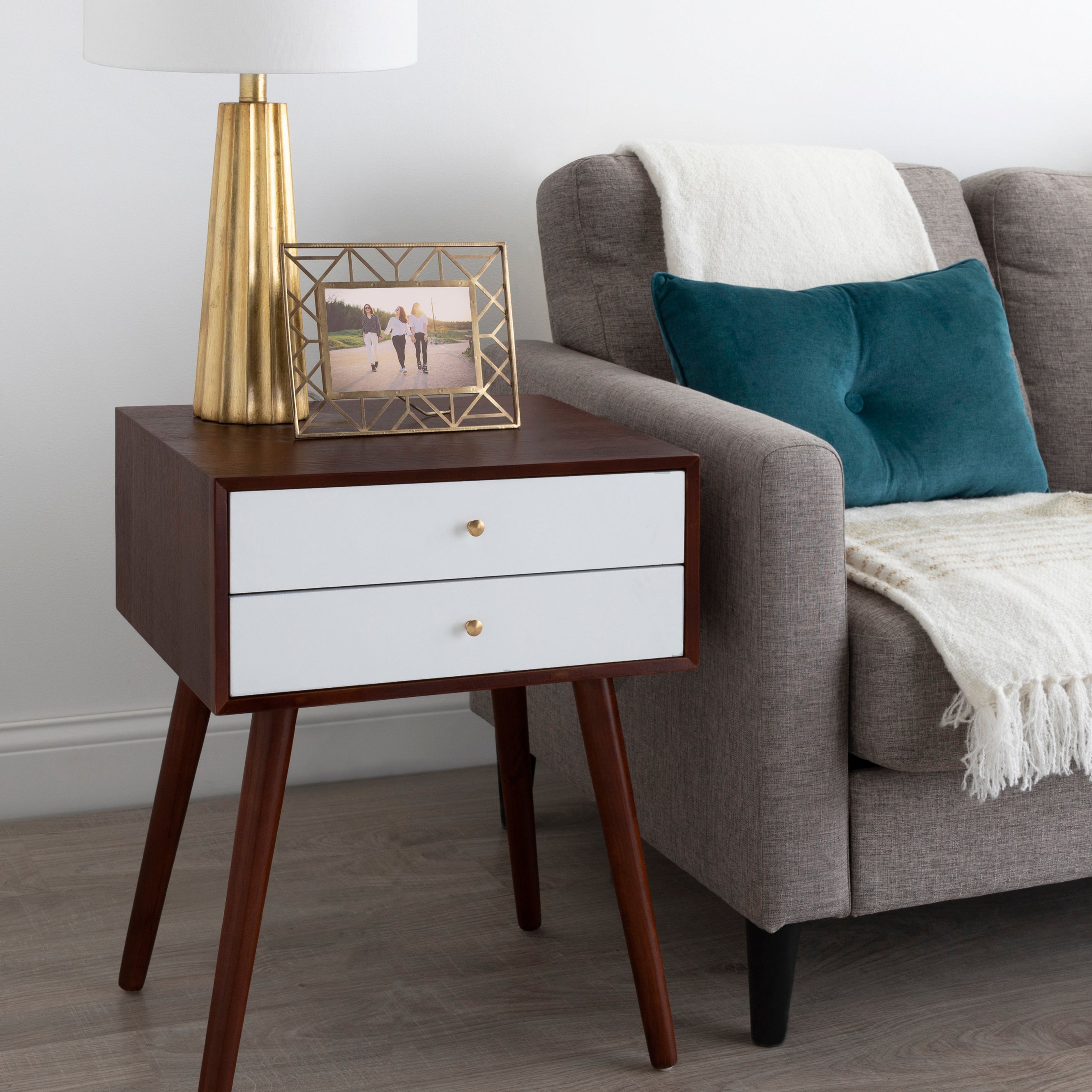 Mid-century modern style with a chic retro vibe makes the Finco side table the perfect addition to your home. It's clean, simple design fits in easily with any of your existing decor. This solidly built wooden table has two drawers for additional storage and is designed at a height that'll fit next to a bed as a nightstand or alongside a sofa or chair as a great looking end table.