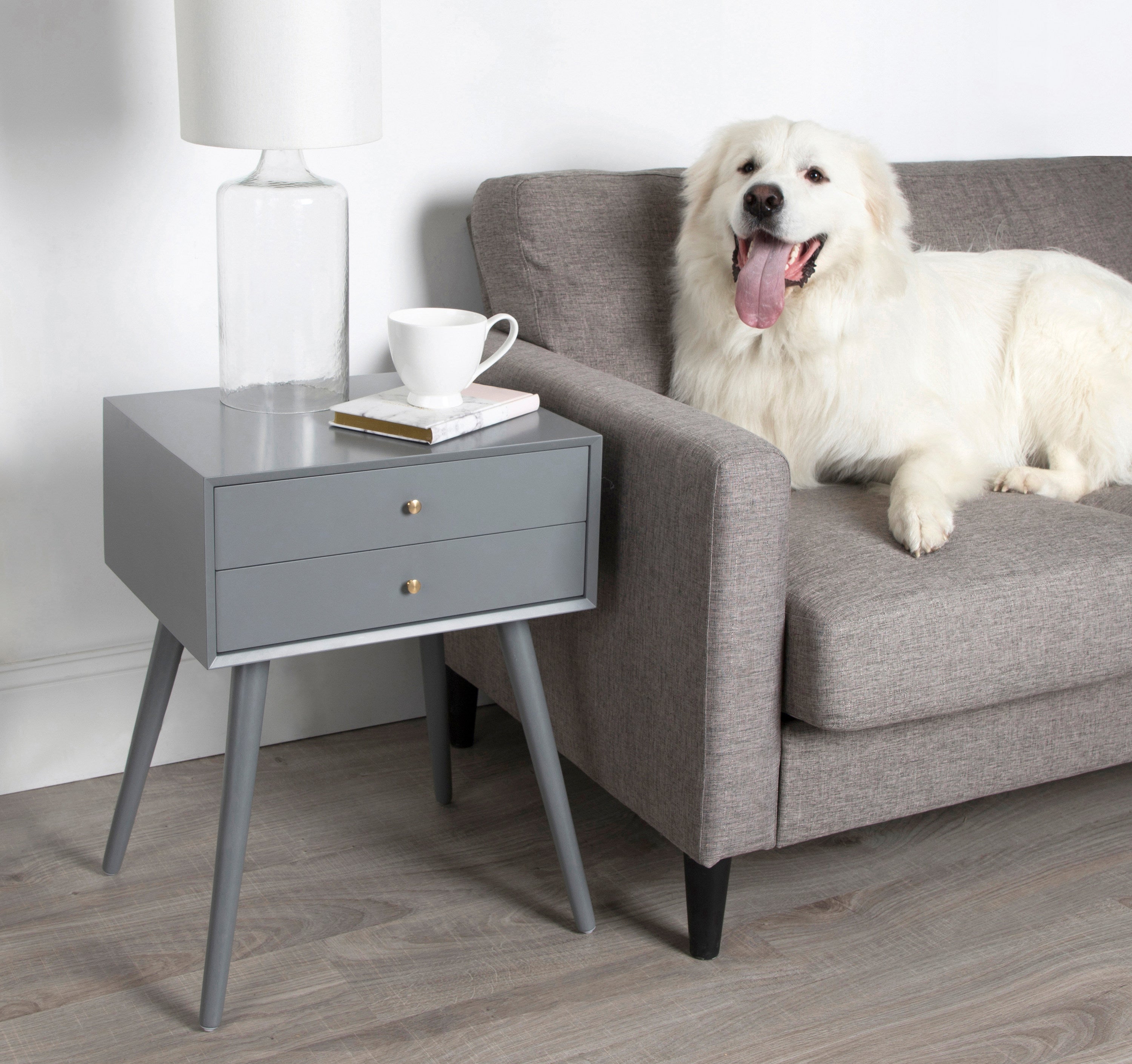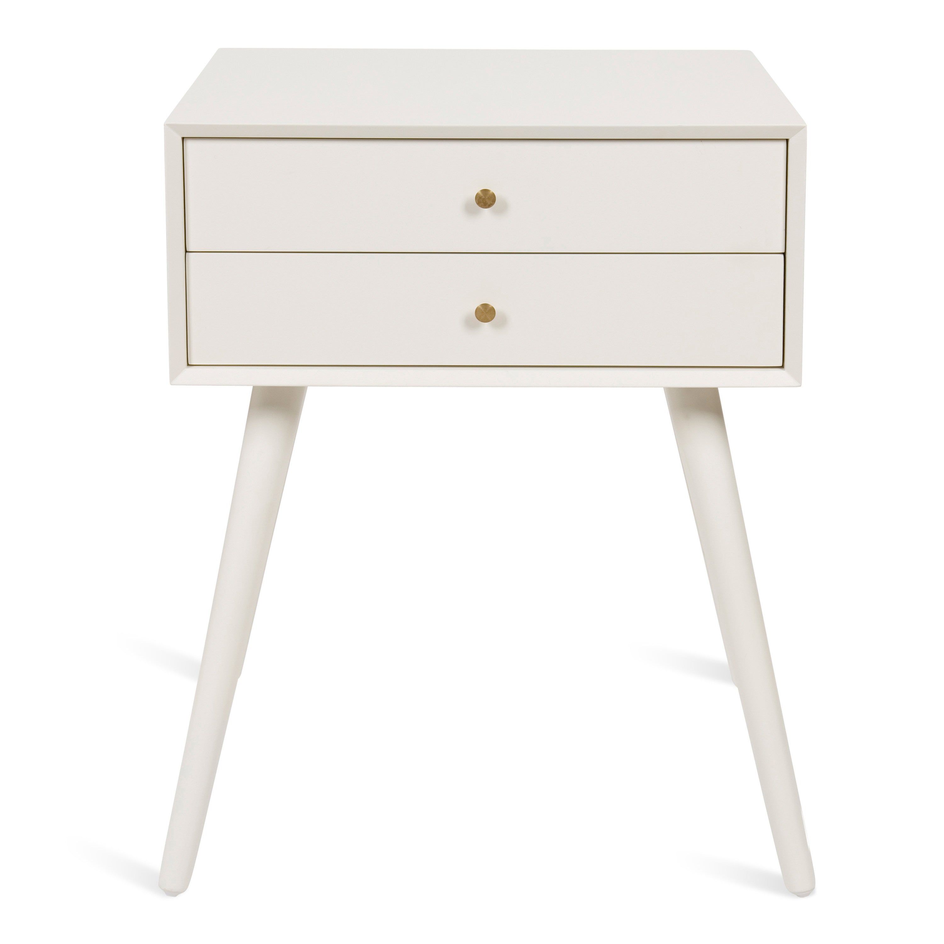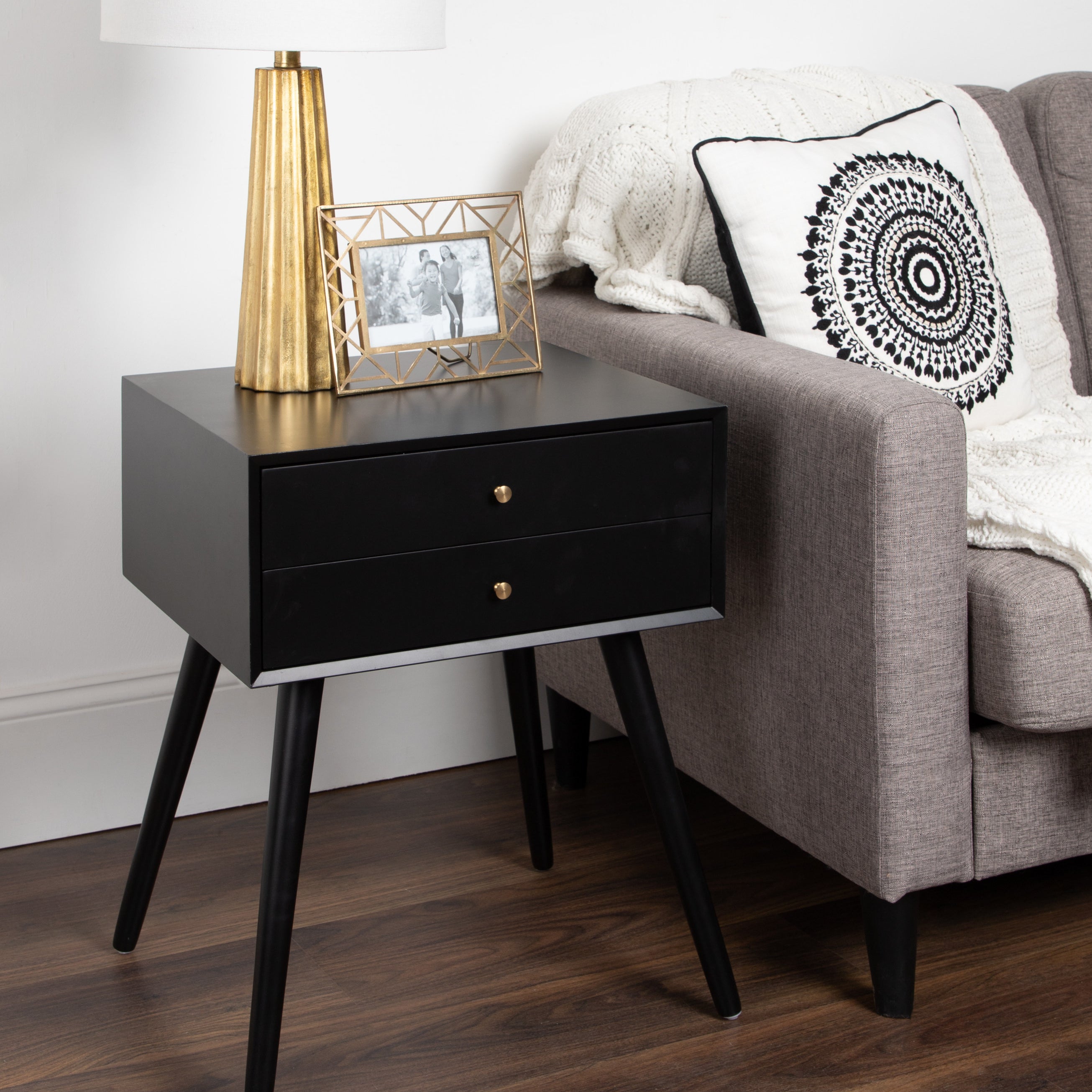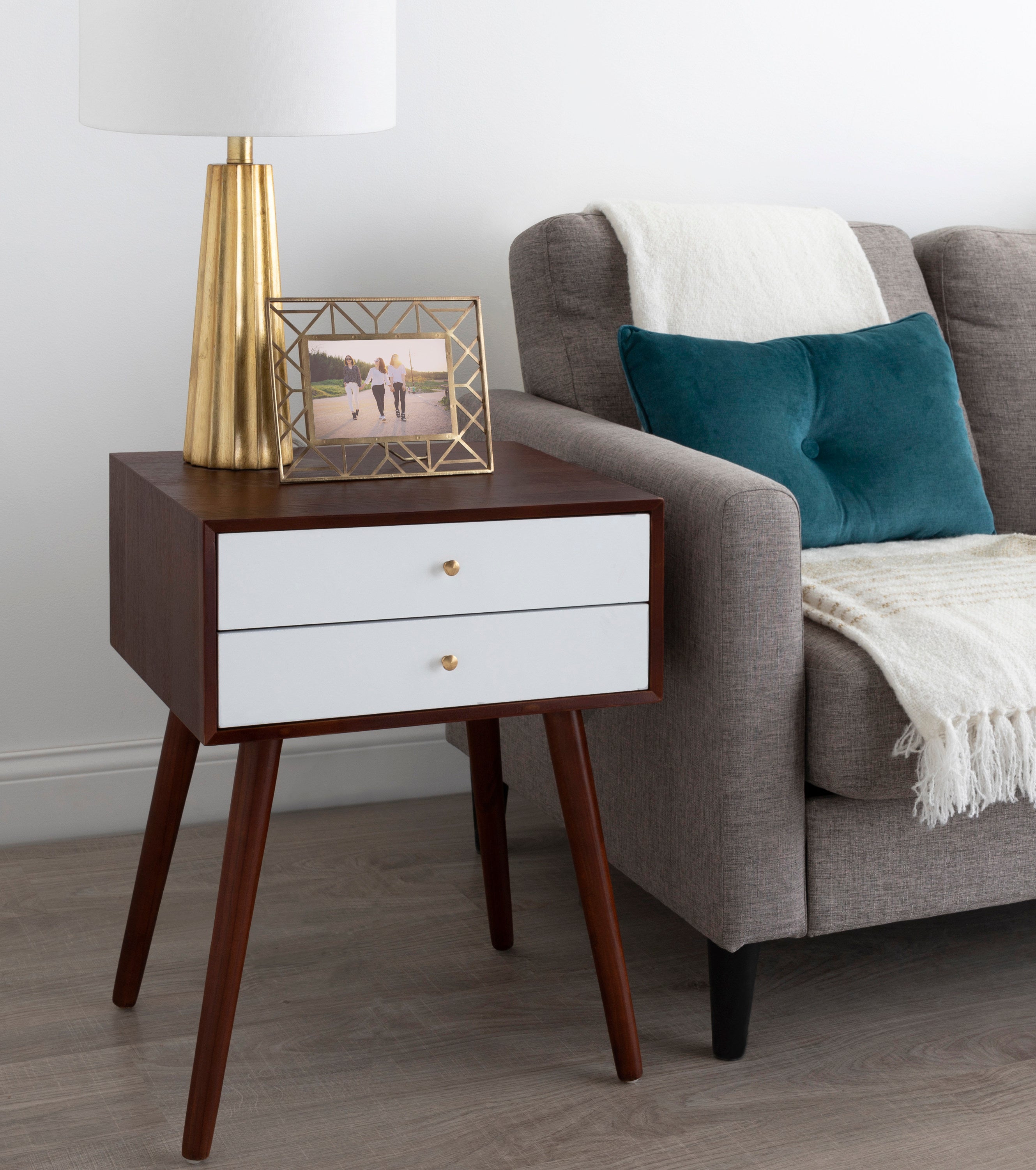 Mid-century modern style with a chic retro vibe makes the Finco side table the perfect addition to your home. It's clean, simple design fits in easily with any of your existing decor. This solidly built wooden table has two drawers for additional storage and is designed at a height that'll fit next to a bed as a nightstand or alongside a sofa or chair as a great looking end table.