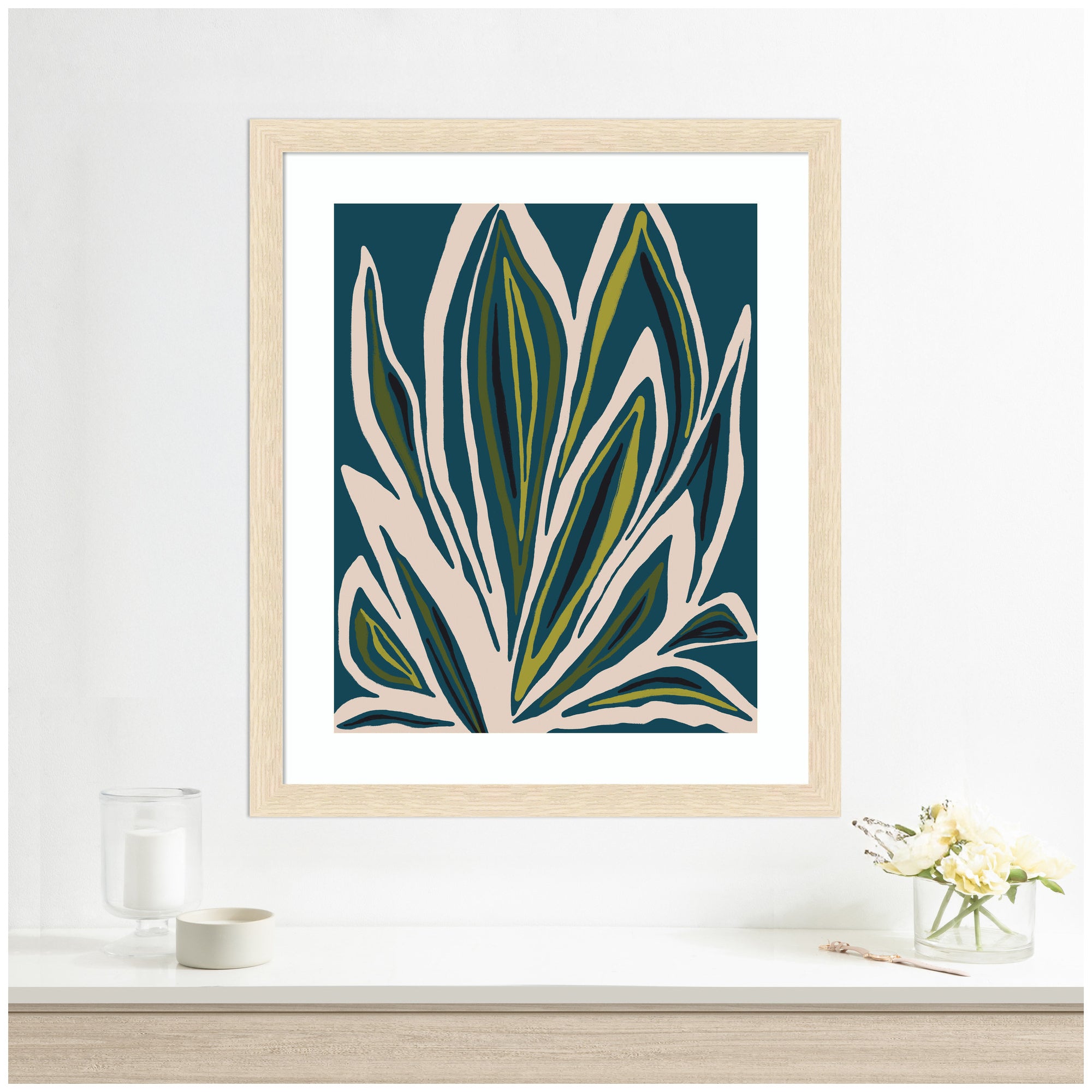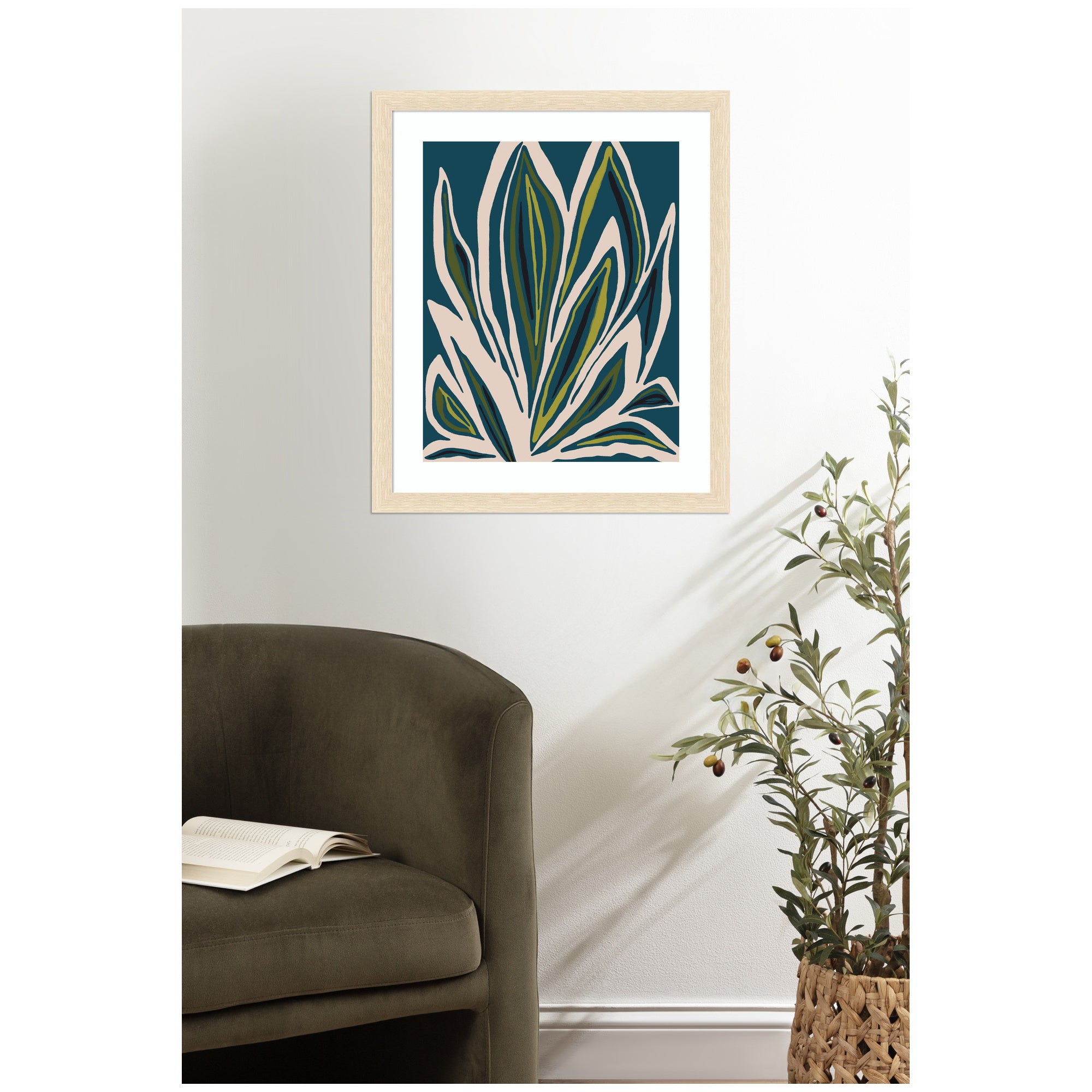 - Authentic Artist Collaboration: 'Blue Flora 1' is an officially licensed work by independent artist Alicia Bock, thoughtfully presented in our Woodgrain Stripe Blonde molding. The finished piece measures 22 x 26, offering a sophisticated statement for your space. Visual Story: The artwork features an abstract depiction of leaves emanating in a dynamic, organic pattern. The use of teal and olive green hues gives it a vibrant and lively appearance. The minimalist design highlights the fluidity and elegance of natural forms. Alicia Bock's