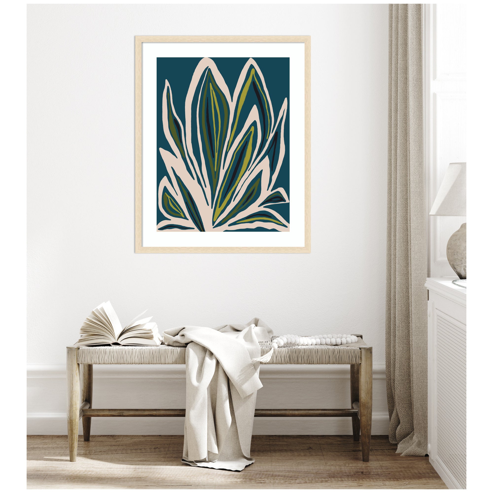 Elevate your space through thoughtfully curated style with this stunning piece designed by independent artist Alicia Bock and beautifully framed by hand in Madison, WI. The image is giclee printed using fade-resistant inks, ensuring every detail comes to life in rich, lasting color. Set in designer moulding, its a Modern Contemporary accent crafted to make a statement. Visual Story: The artwork features an abstract depiction of leaves emanating in a dynamic, organic pattern. The use of teal and olive green hues gives it a vibrant and lively appearance. The minimalist design highlights the fluidity and elegance of natural forms.