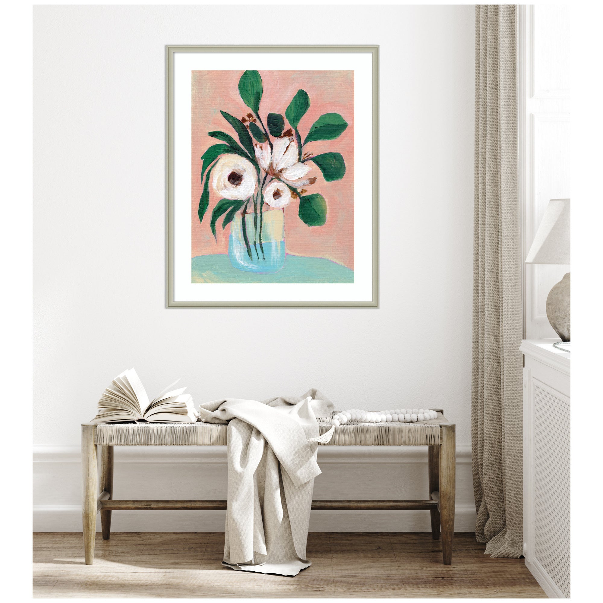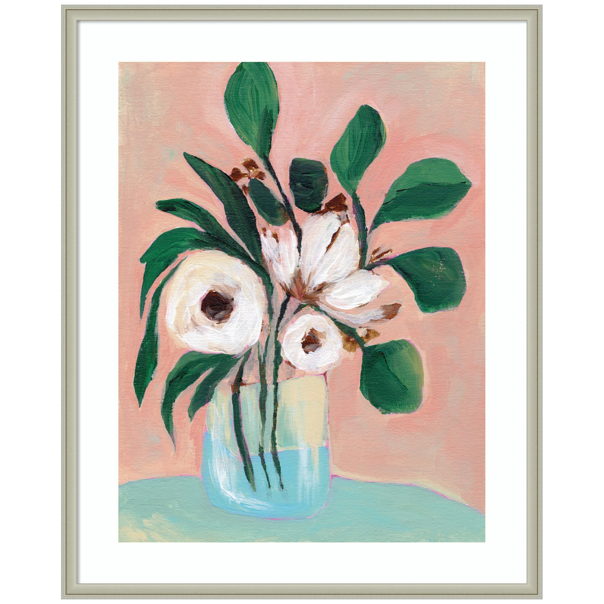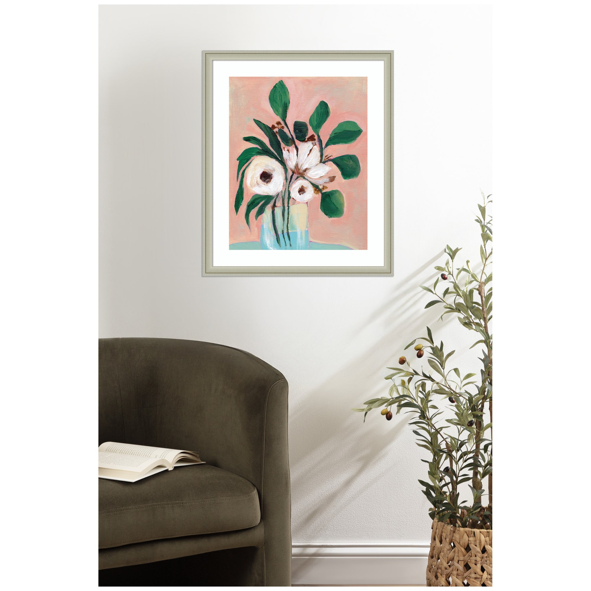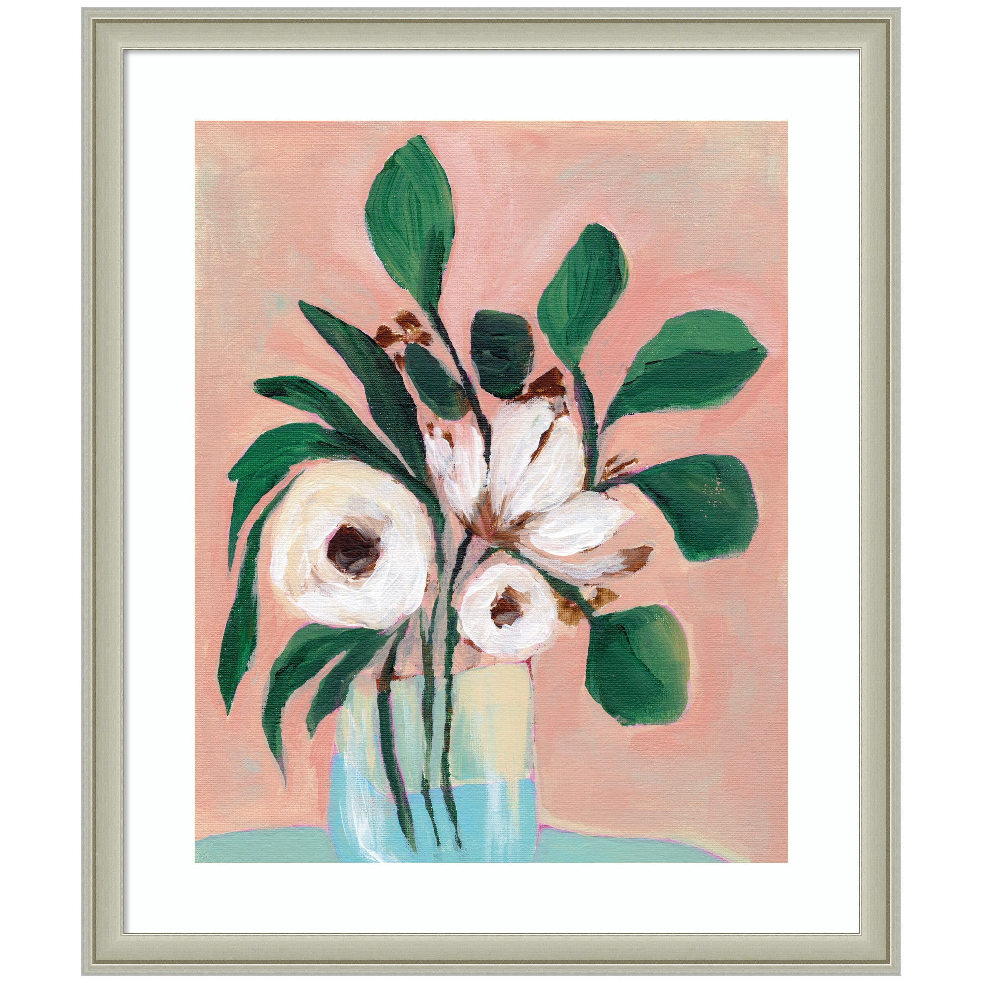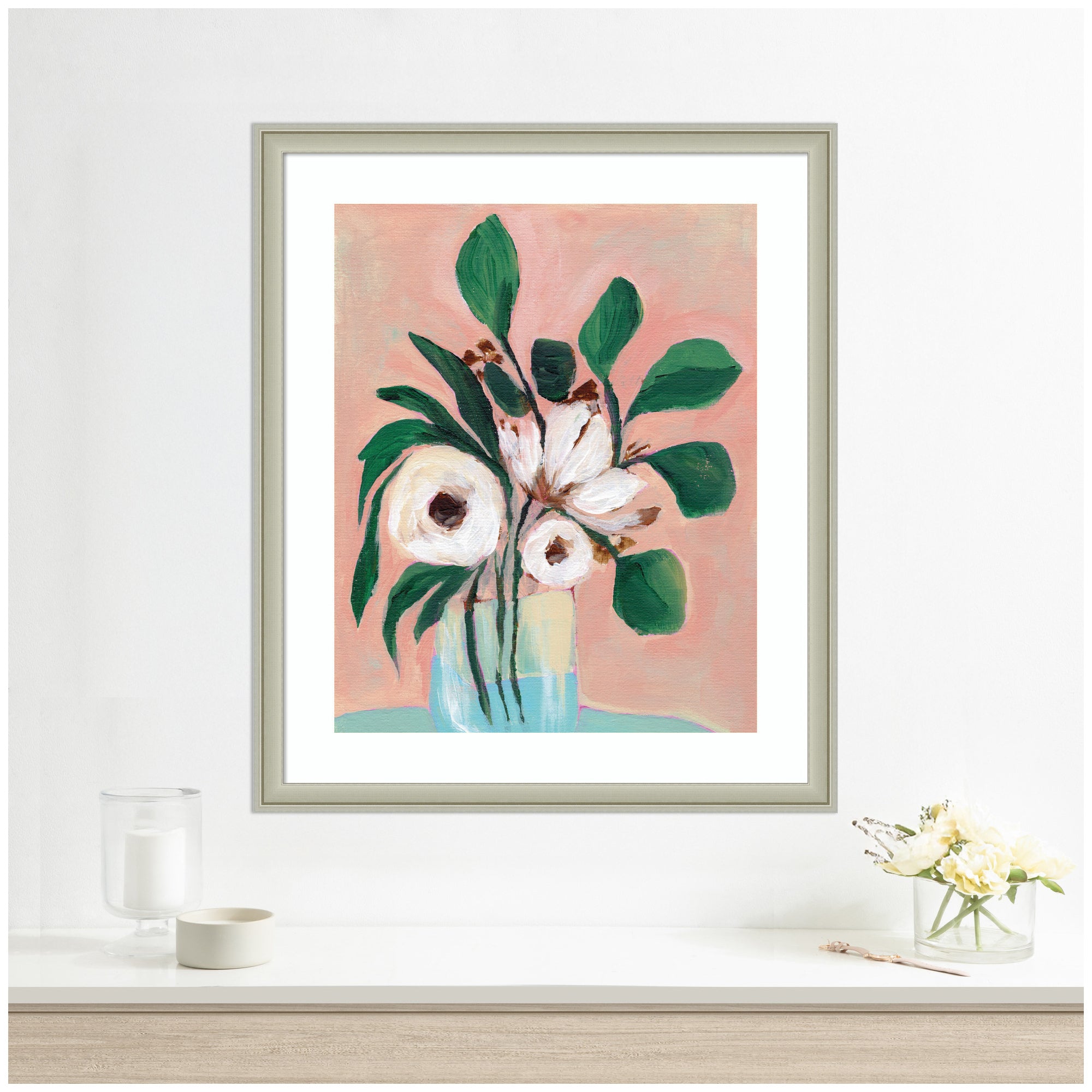 Elevate your space through thoughtfully curated style with this stunning piece designed by independent artist Nikita Jariwala and beautifully framed by hand in Madison, WI. The image is giclee printed using fade-resistant inks, ensuring every detail comes to life in rich, lasting color. Set in designer moulding, its a Modern Contemporary accent crafted to make a statement. Visual Story: The artwork features a bouquet of white flowers with dark centers and lush green leaves, arranged in a transparent blue vase. The background is a soft, warm pink, creating a soothing and inviting atmosphere. The use of acrylic paints adds texture and depth to the composition.