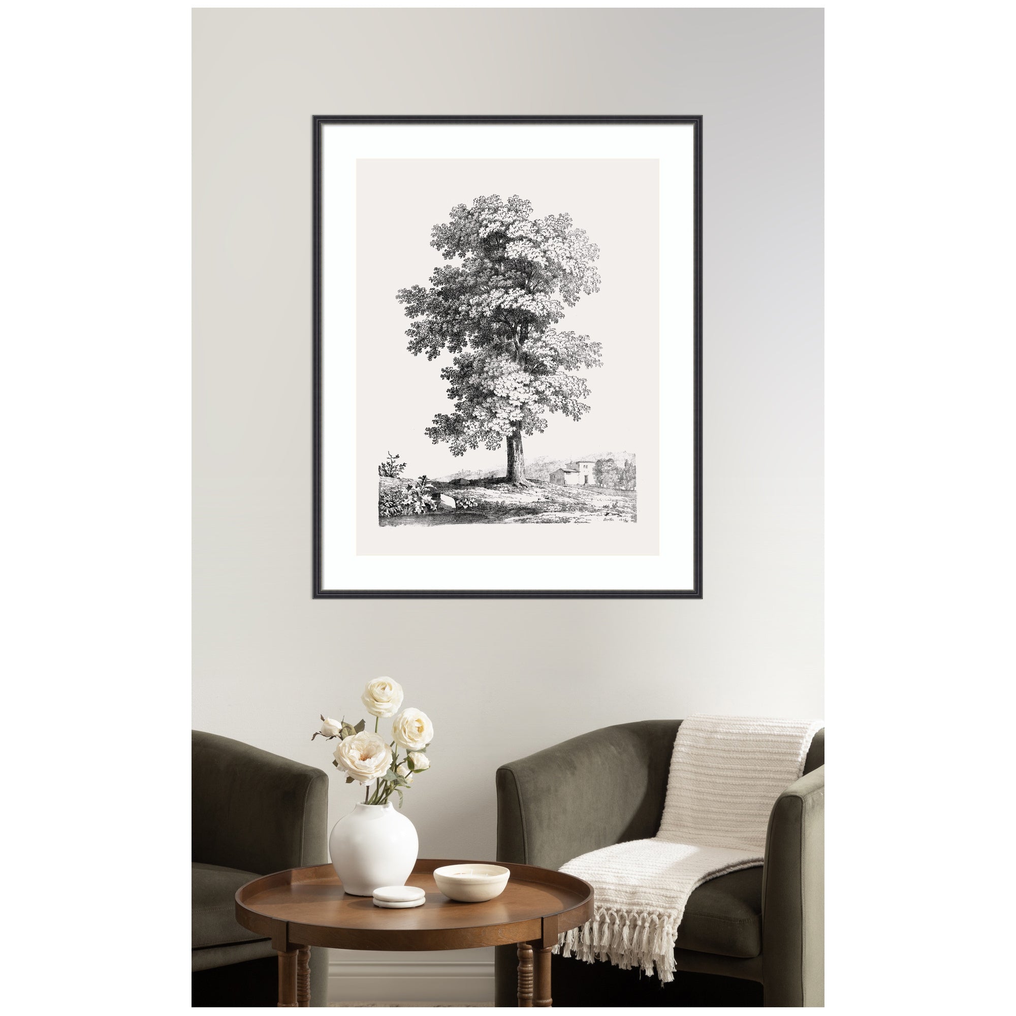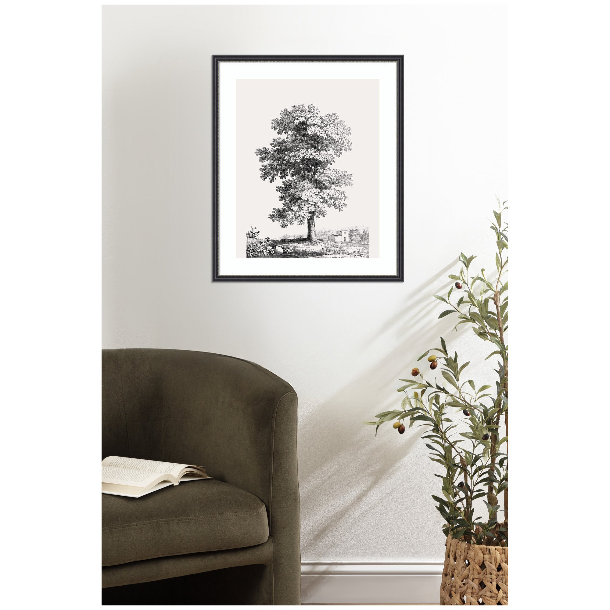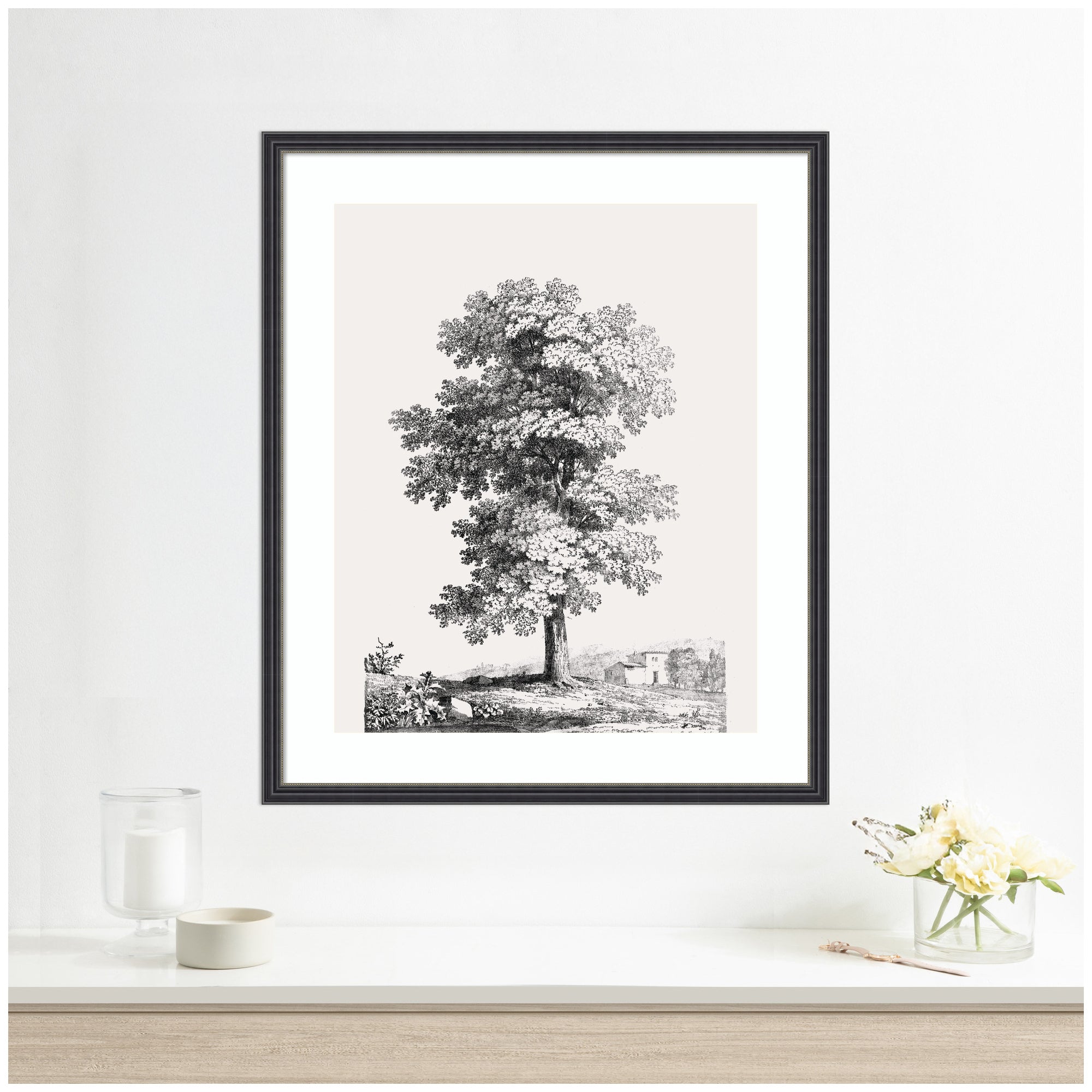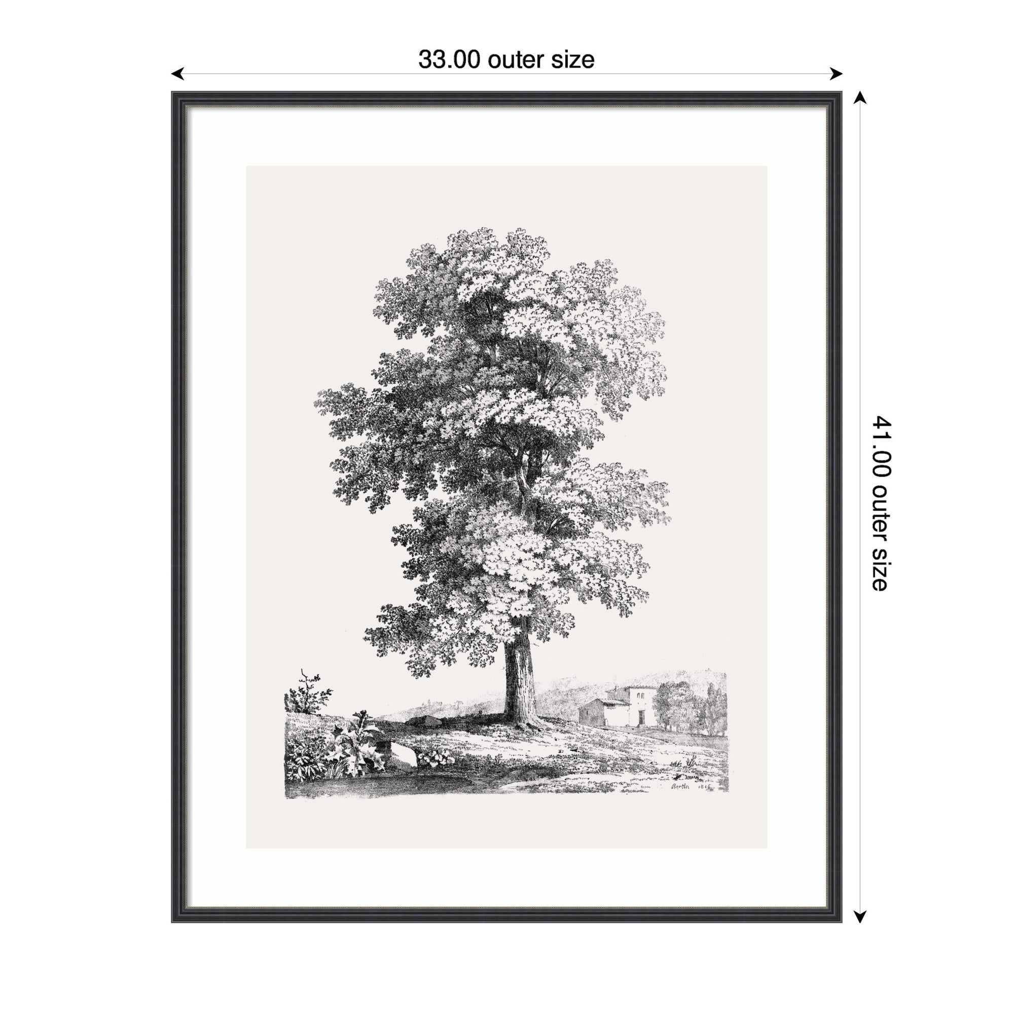 Elevate your space through thoughtfully curated style with this stunning piece designed by independent artist The Art Institute of Chicago and beautifully framed by hand in Madison, WI. The image is giclee printed using fade-resistant inks, ensuring every detail comes to life in rich, lasting color. Set in designer moulding, its a Vintage accent crafted to make a statement. Visual Story: This artwork is a detailed ink drawing of a large tree dominating the center of the composition. In the background, there is a quaint countryside scene with buildings and gentle hills. The monochrome palette enhances the vintage feel of the piece, and the intricate detailing emphasizes the natural beauty of the landscape.