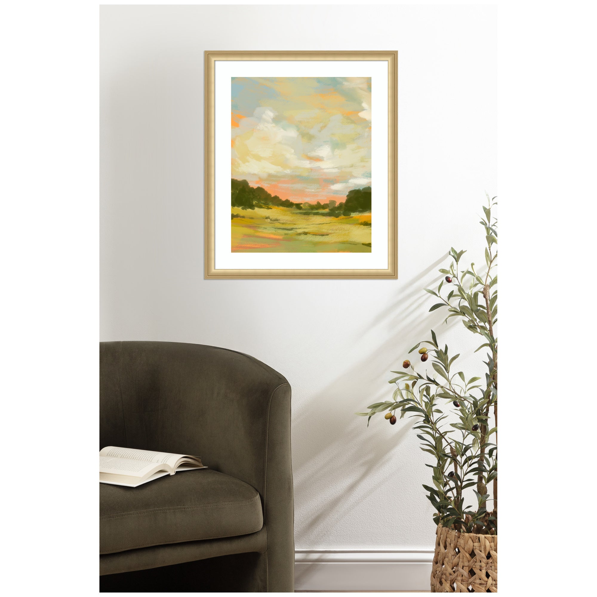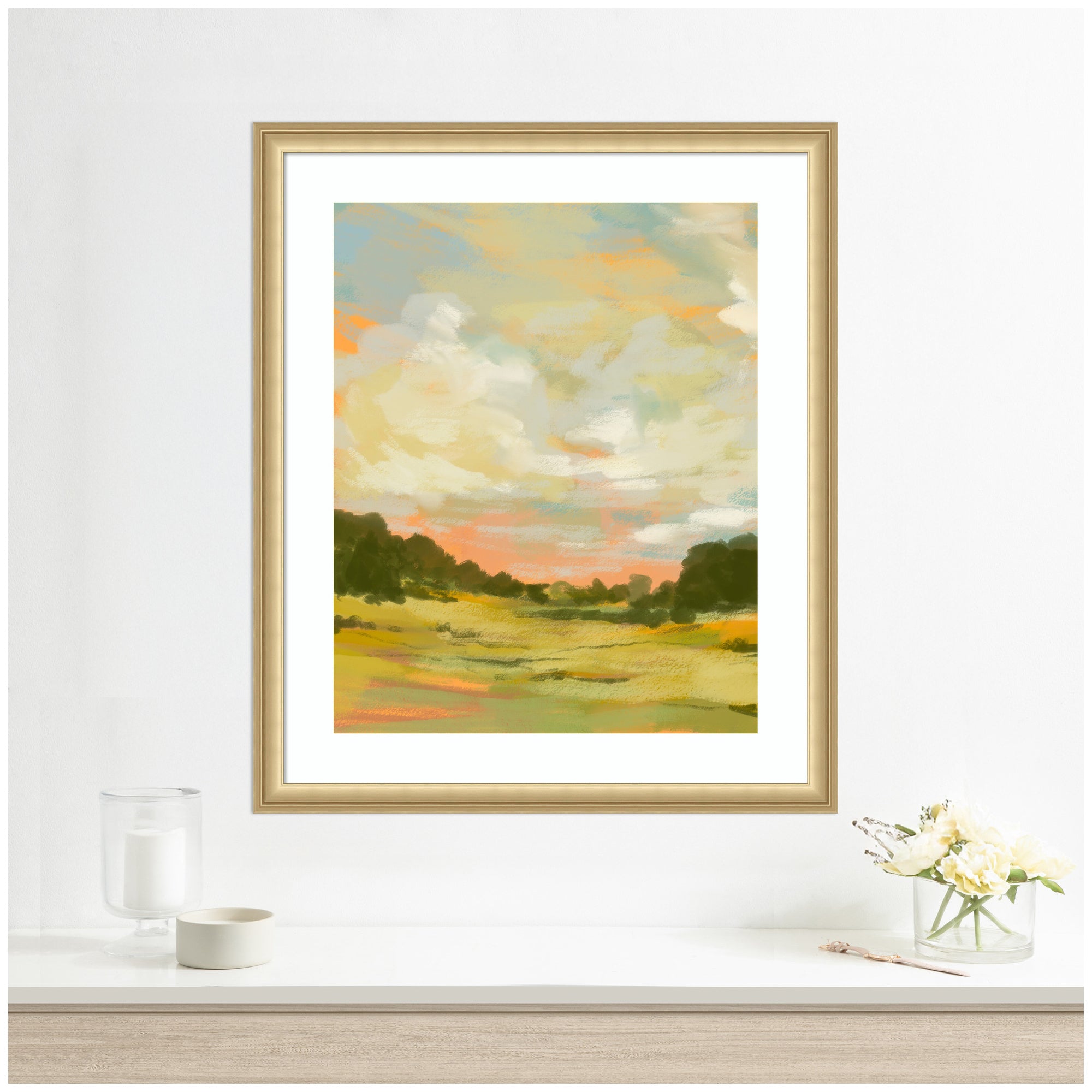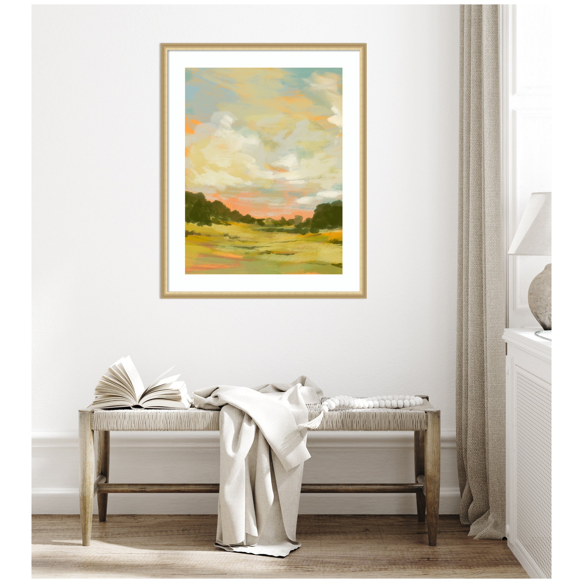 Elevate your space through thoughtfully curated style with this stunning piece designed by independent artist Annie Quigley and beautifully framed by hand in Madison, WI. The image is giclee printed using fade-resistant inks, ensuring every detail comes to life in rich, lasting color. Set in designer moulding, its a Casual Transitional accent crafted to make a statement. Visual Story: The artwork depicts a serene landscape with expansive fields stretching towards a distant horizon. The sky is filled with soft, pastel colors of yellow, orange, and blue, blending with fluffy clouds. Patches of trees line the horizon, adding to the tranquil and calming atmosphere of the scene.
