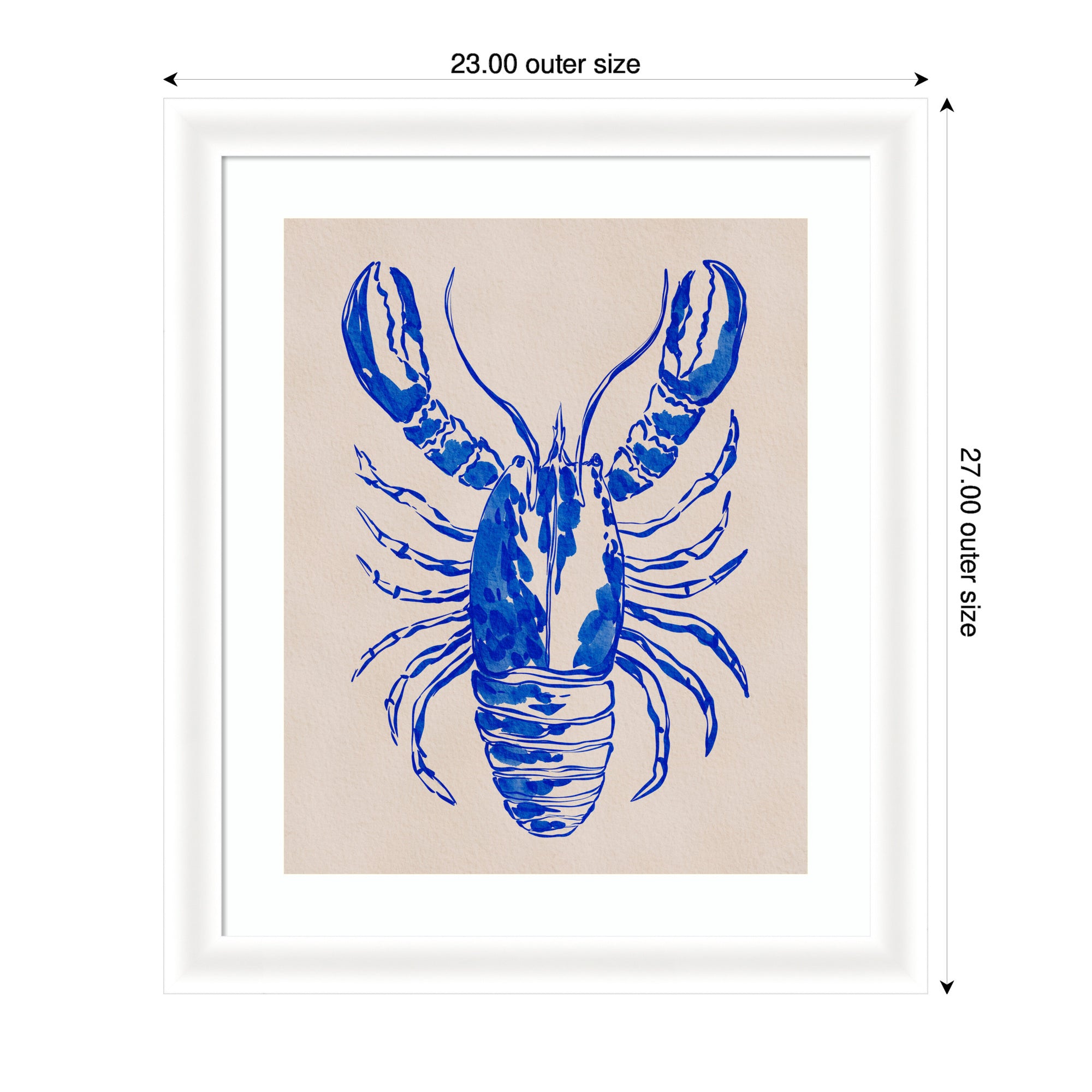 Elevate your space through thoughtfully curated style with this stunning piece designed by independent artist Nikita Jariwala and beautifully framed by hand in Madison, WI. The image is giclee printed using fade-resistant inks, ensuring every detail comes to life in rich, lasting color. Set in designer moulding, its a Coastal accent crafted to make a statement. Visual Story: This artwork features a striking blue lobster illustrated in a silhouette style, set against a neutral background. The use of watercolor adds a textured and fluid appearance to the lobster's form. The piece combines elements of minimalism and marine life, creating a visually appealing and stylish design.